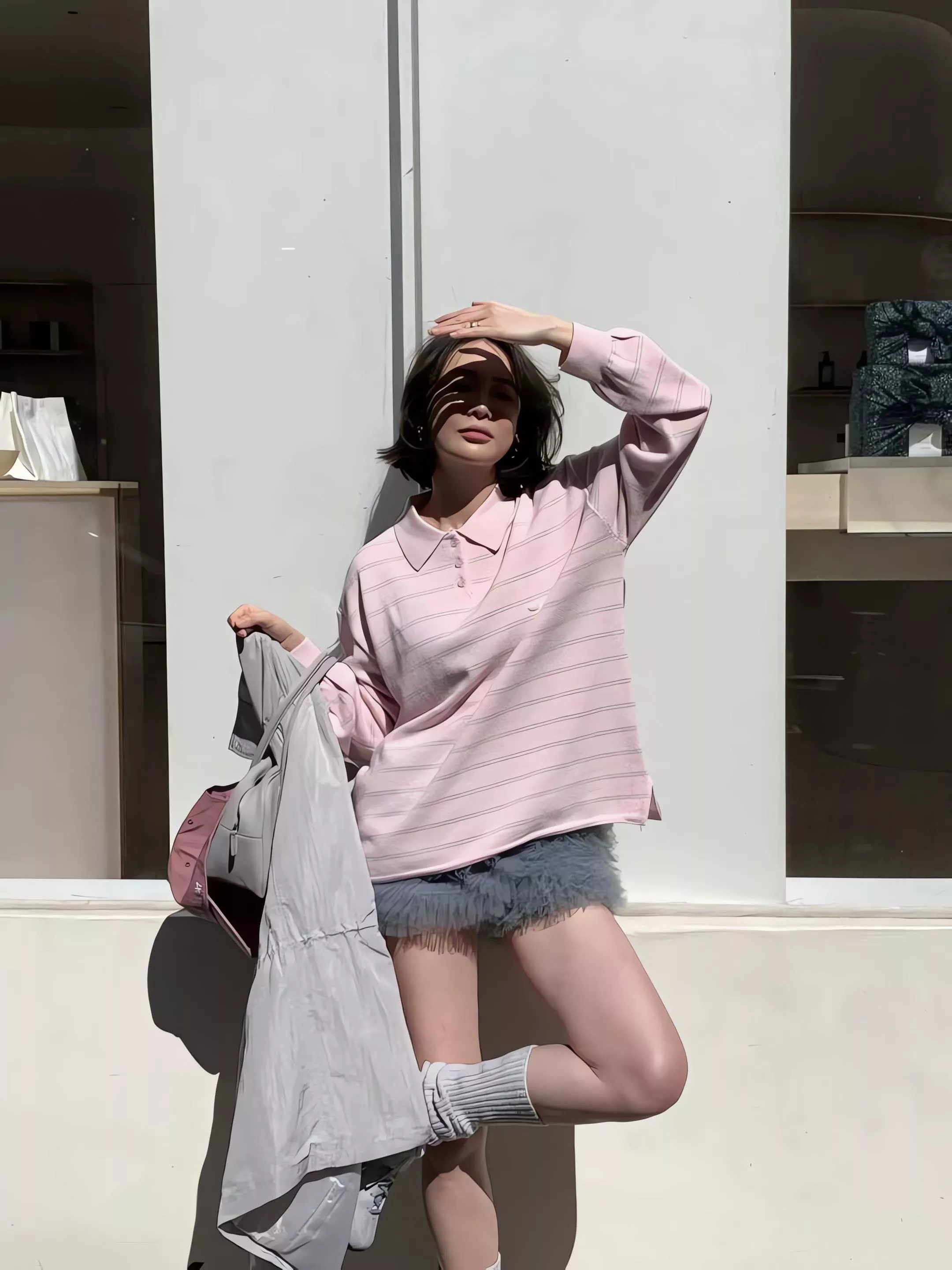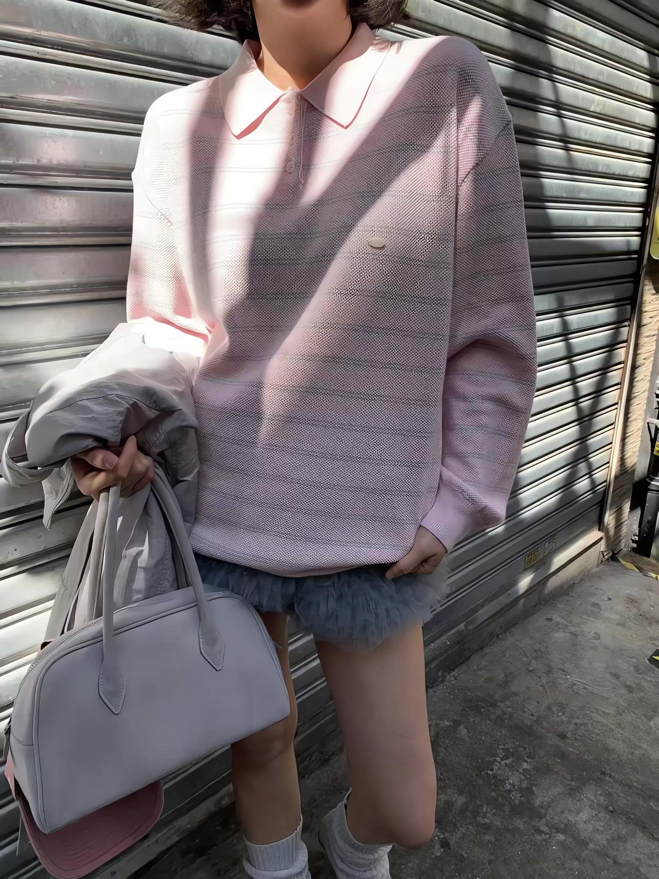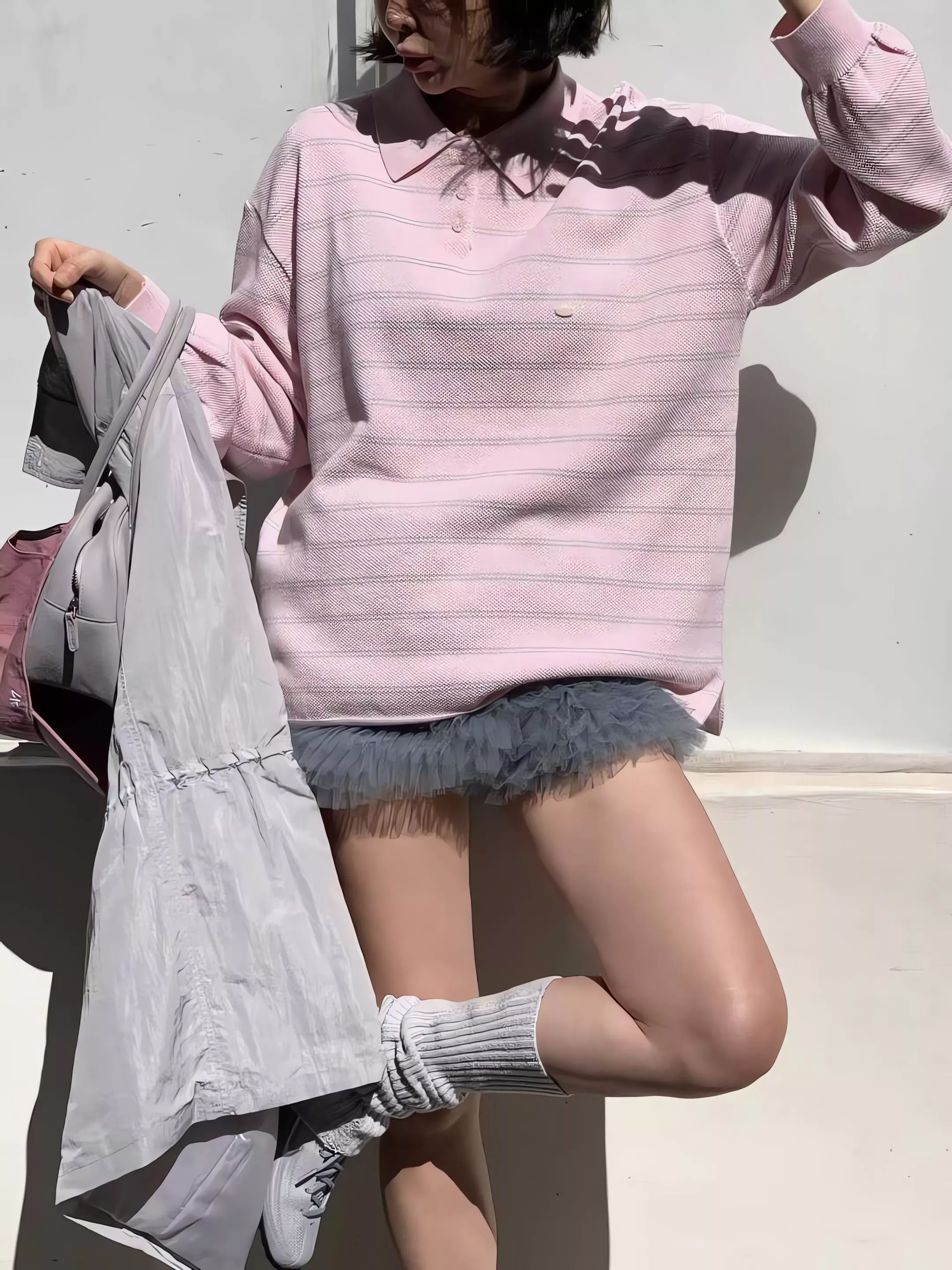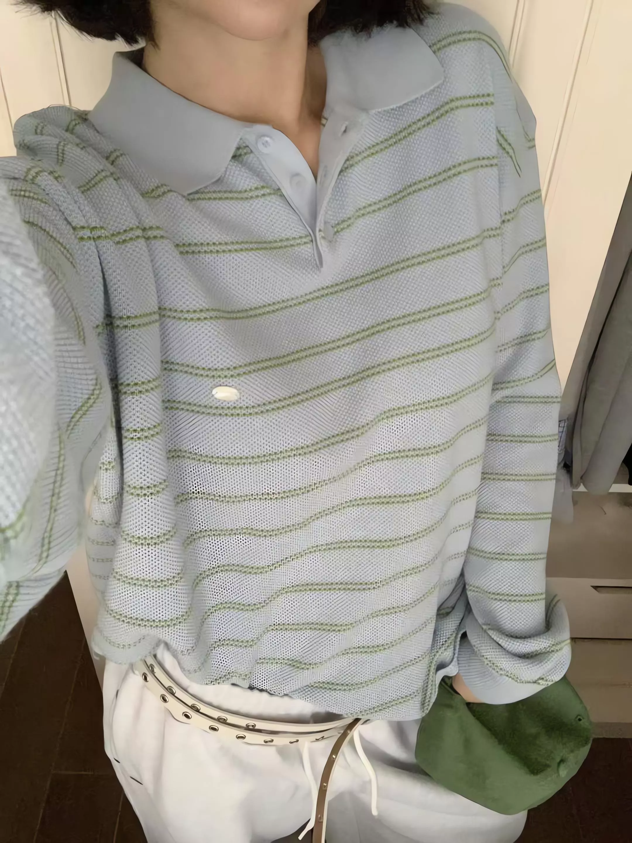 雖然外型是休閒的 Polo 領條紋衫,但完全不是一般硬挺或平價的棉布 T 恤。她是使用細緻的針織原紗編織而成,手感非常柔軟且帶有微垂墜感,穿上後的線條比普通 Polo 衫更顯慵懶與優雅。