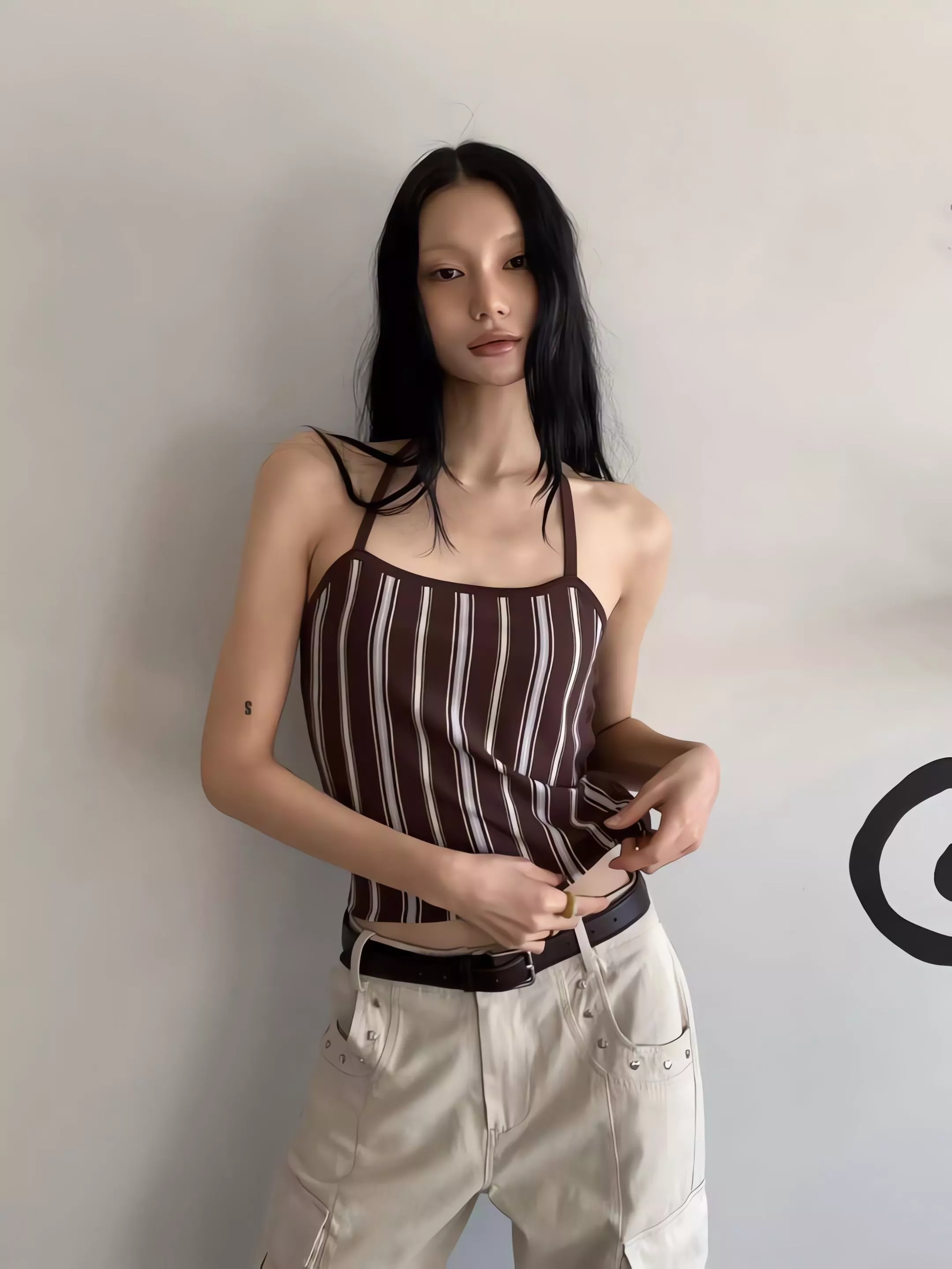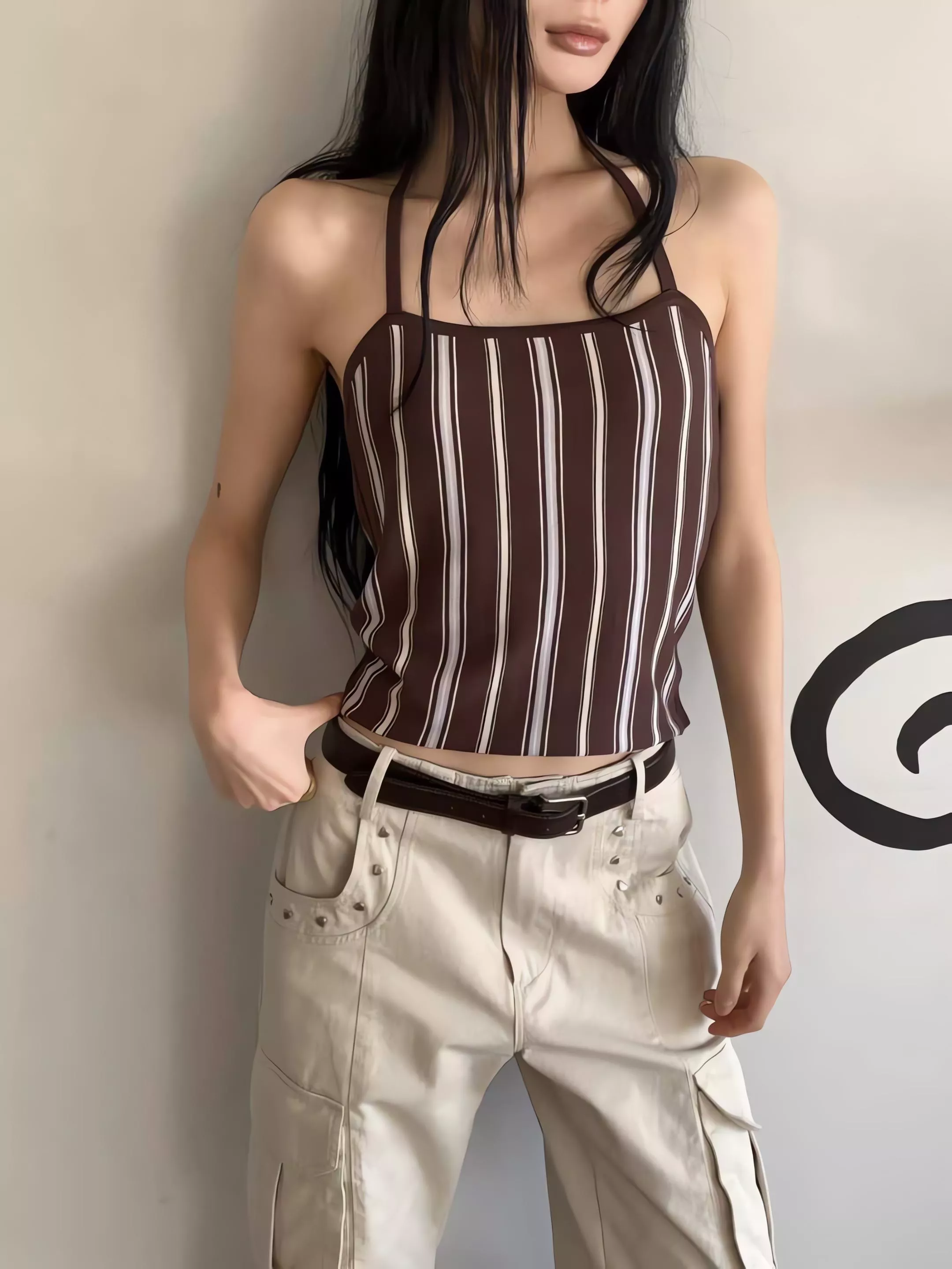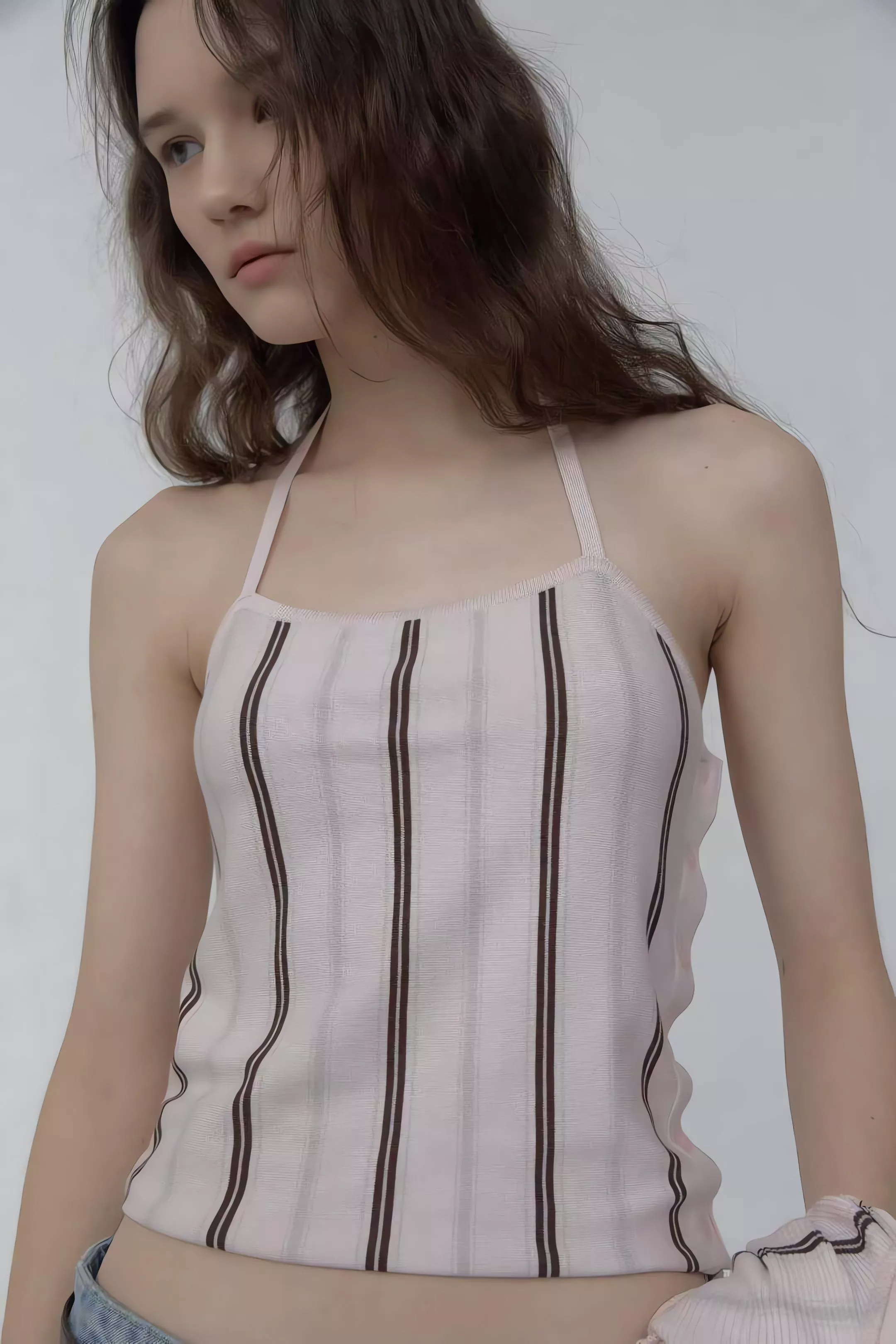 亮點就在那件繞頸綁帶背心,掛脖設計會把視覺重點帶到鎖骨,單穿很有那種微辣的小性感,套上外套後則是滿滿的溫柔濾鏡。