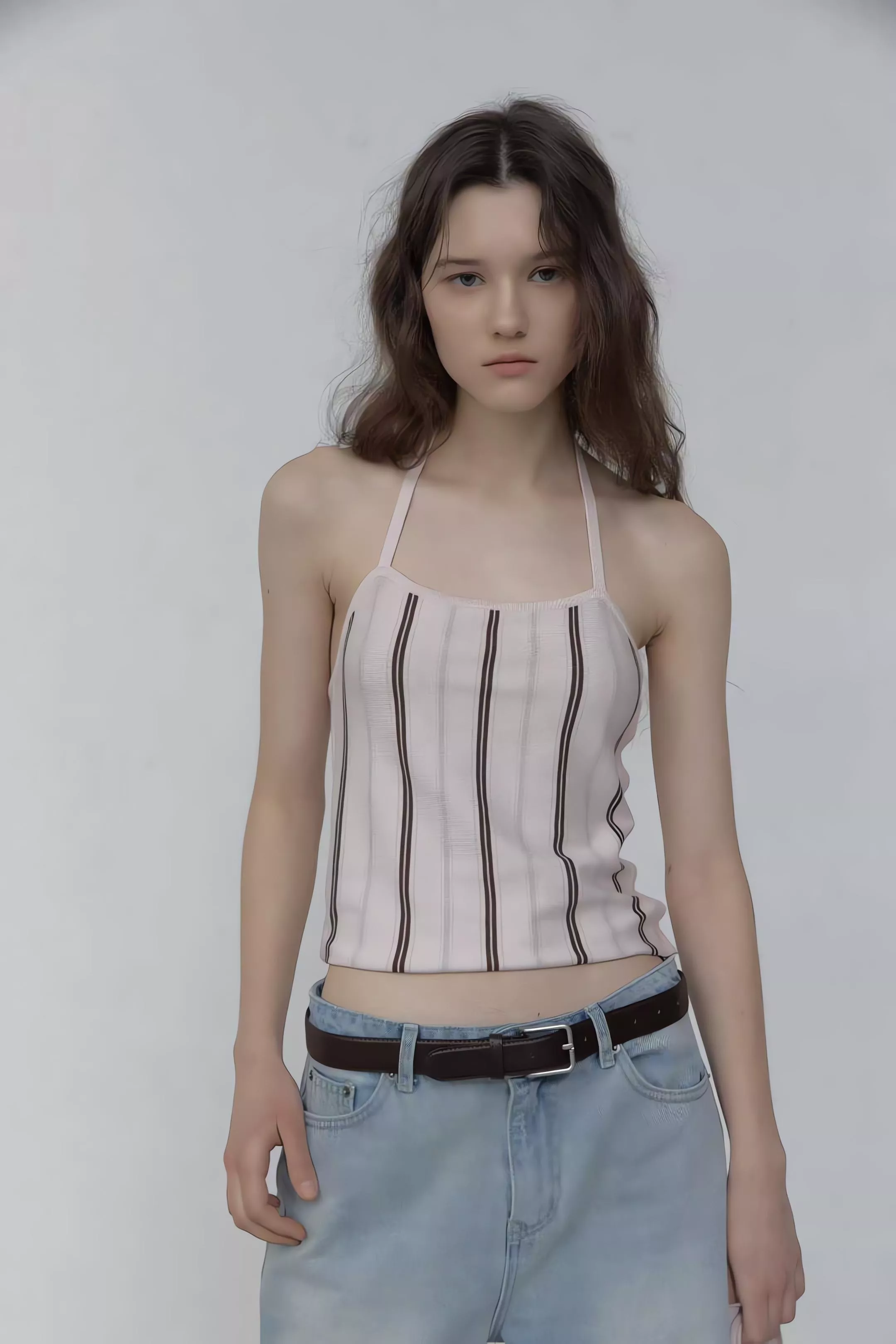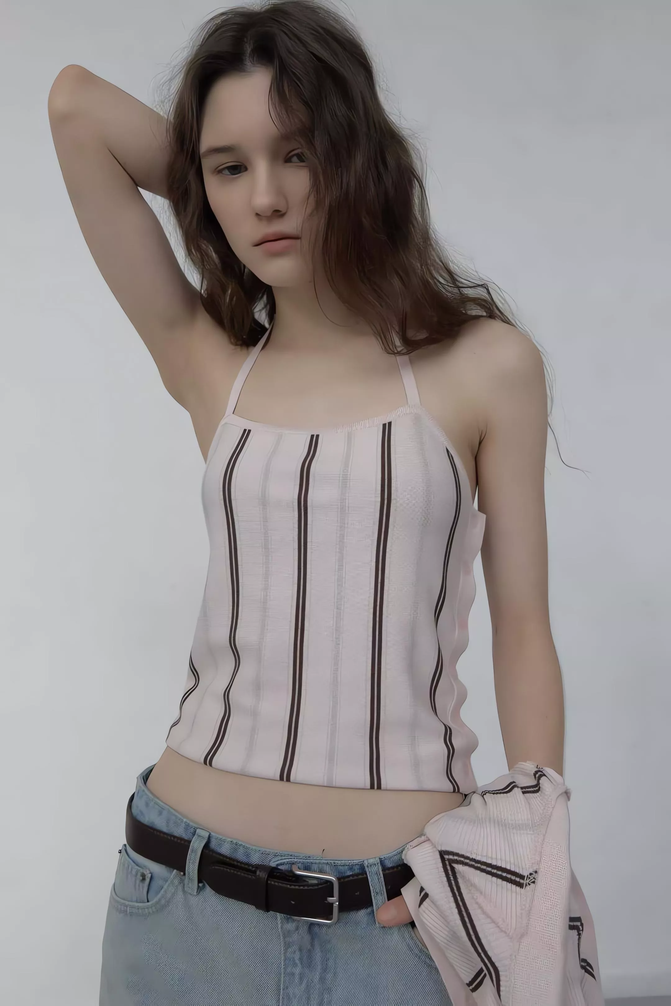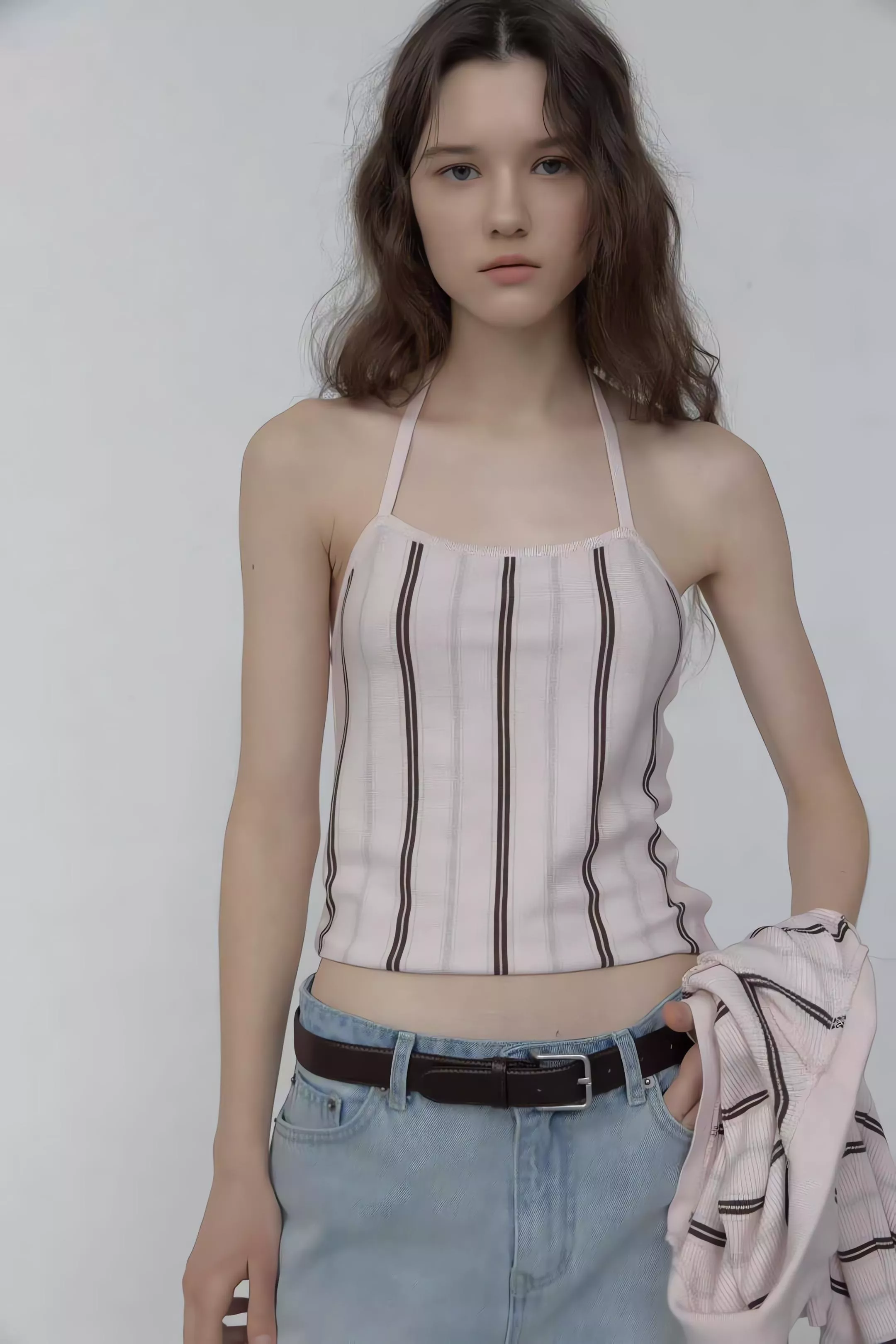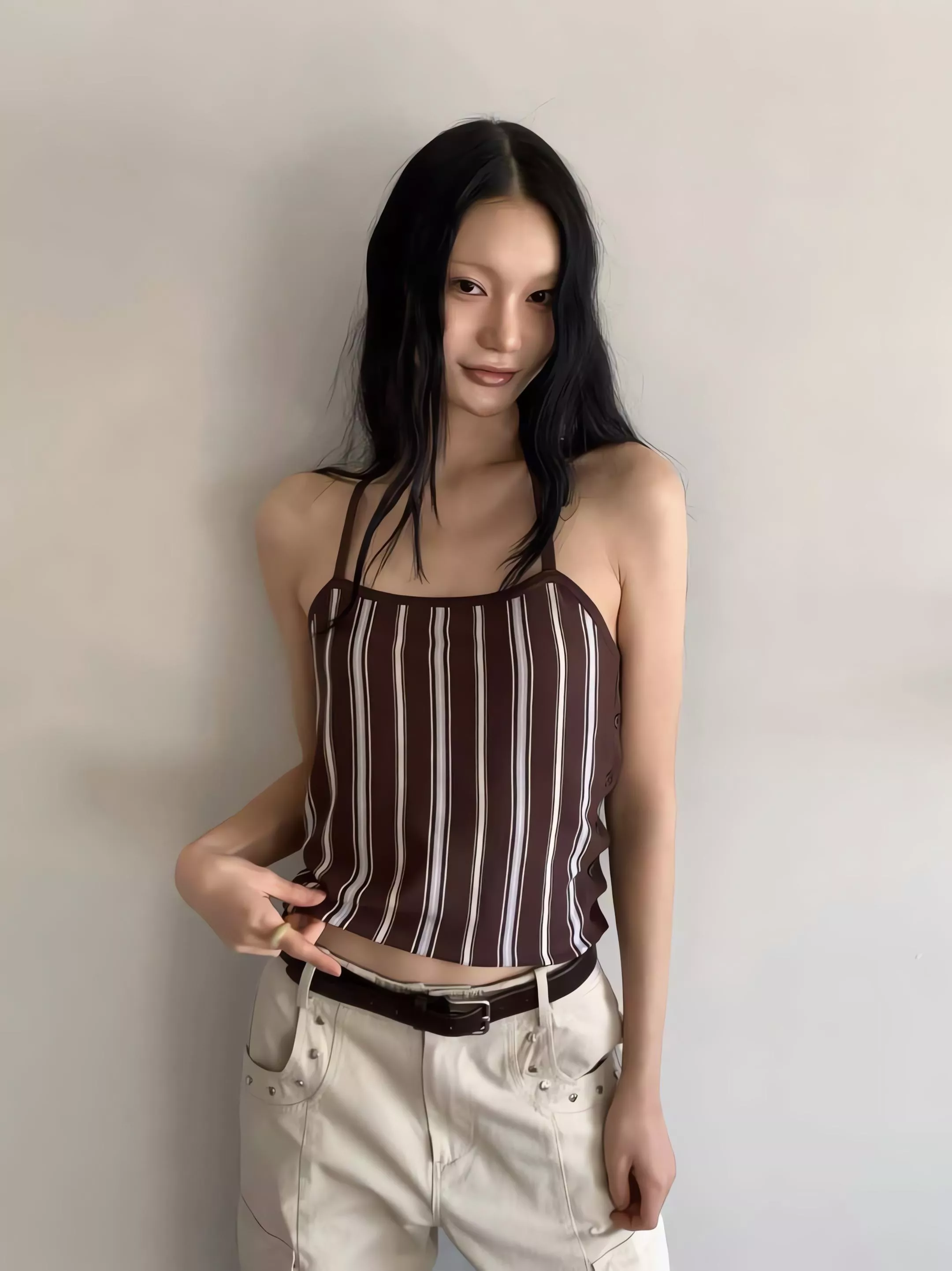 亮點就在那件繞頸綁帶背心,掛脖設計會把視覺重點帶到鎖骨,單穿很有那種微辣的小性感,套上外套後則是滿滿的溫柔濾鏡。