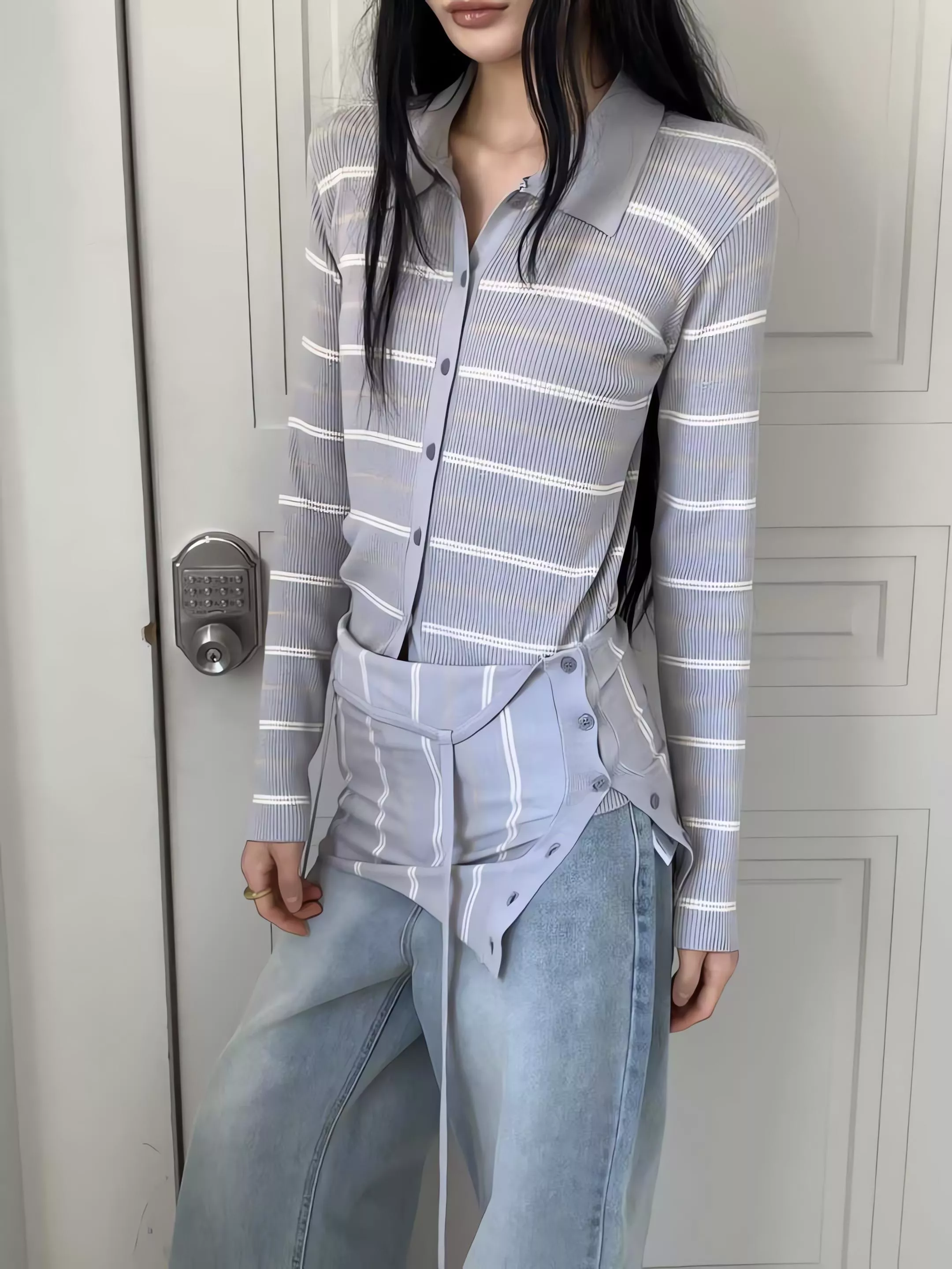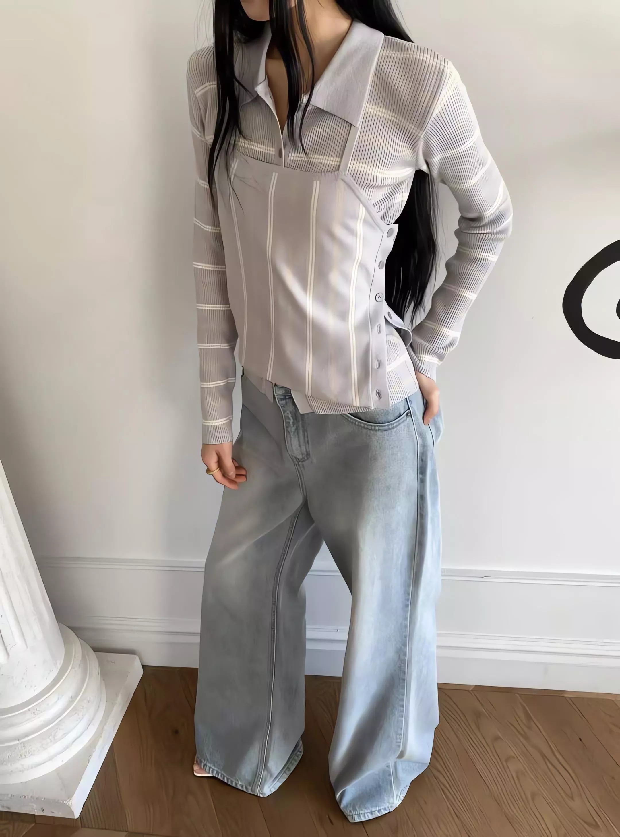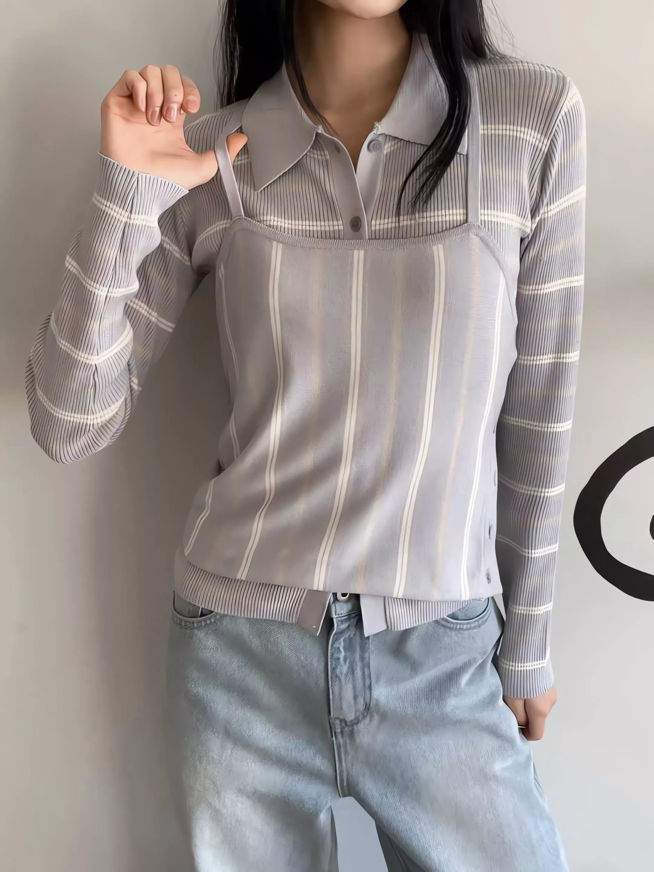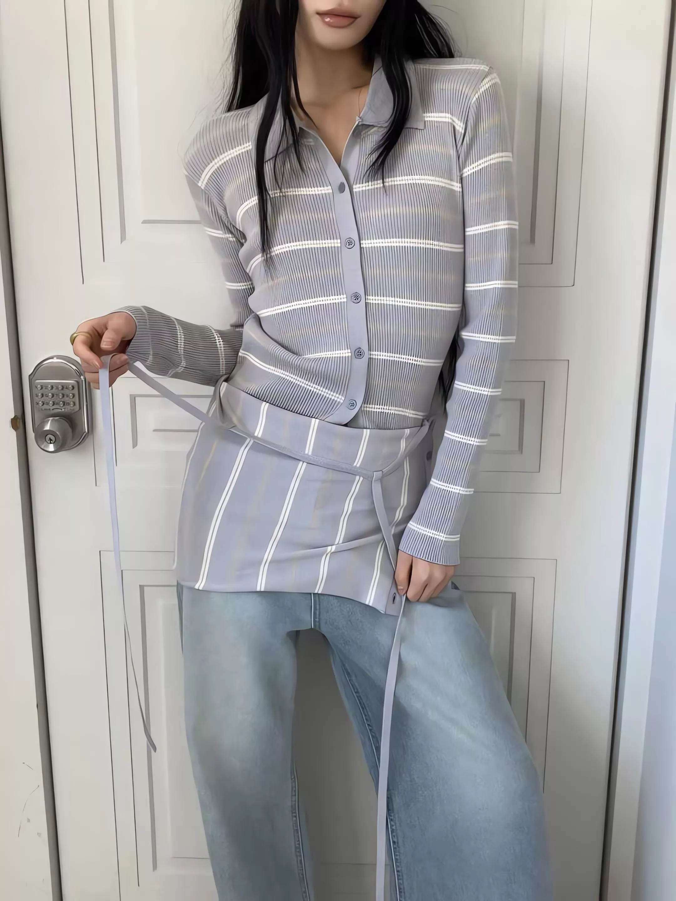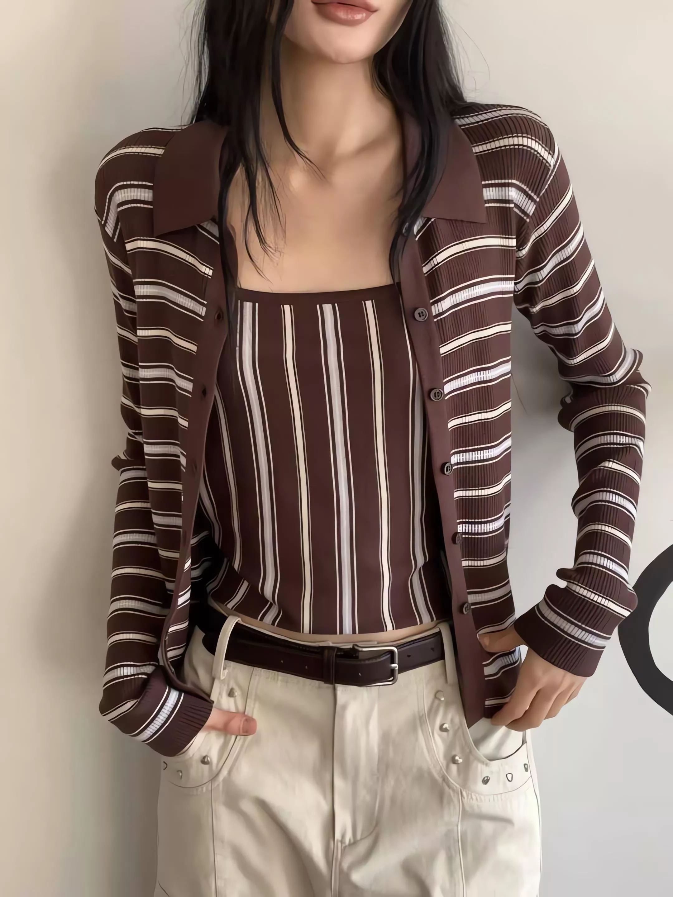 這套不是那種寬鬆遮肉的版型,而是讓你在簡約的細條紋中,穿出一種俐落、乾淨、不拖泥帶水的高級氛圍。