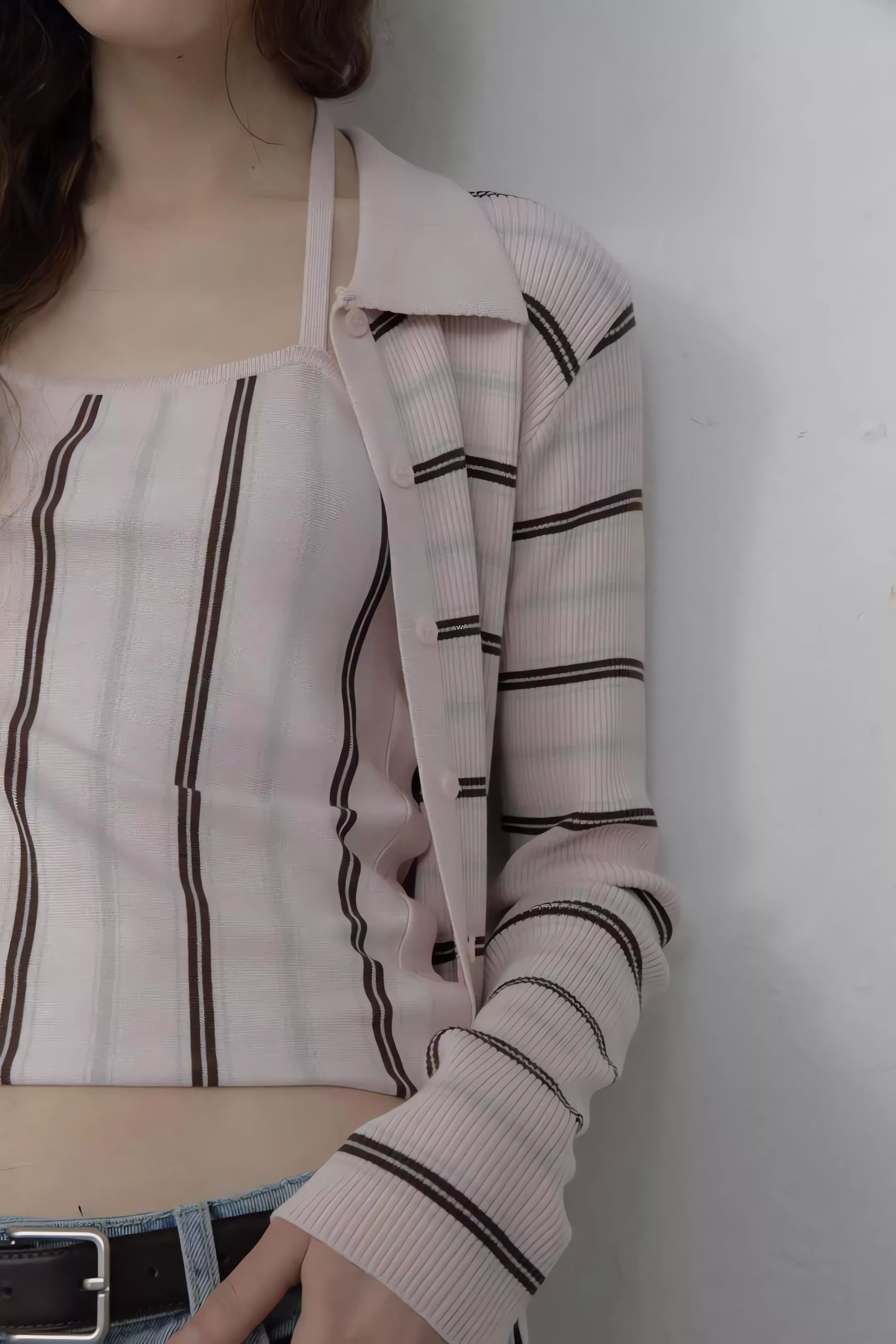 Foundation 韓系溫柔!細條紋針織外套 繞頸綁帶背心兩件套組