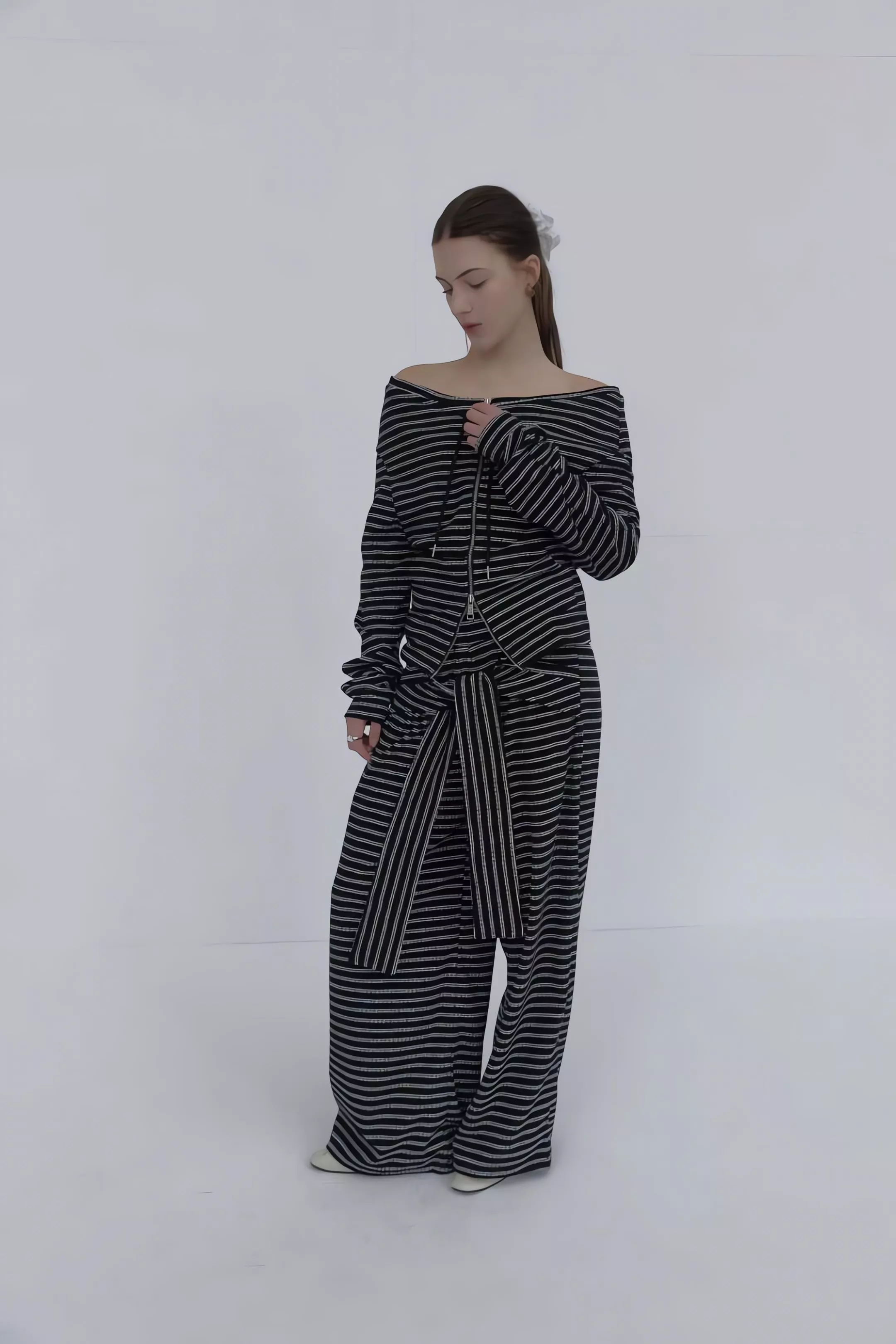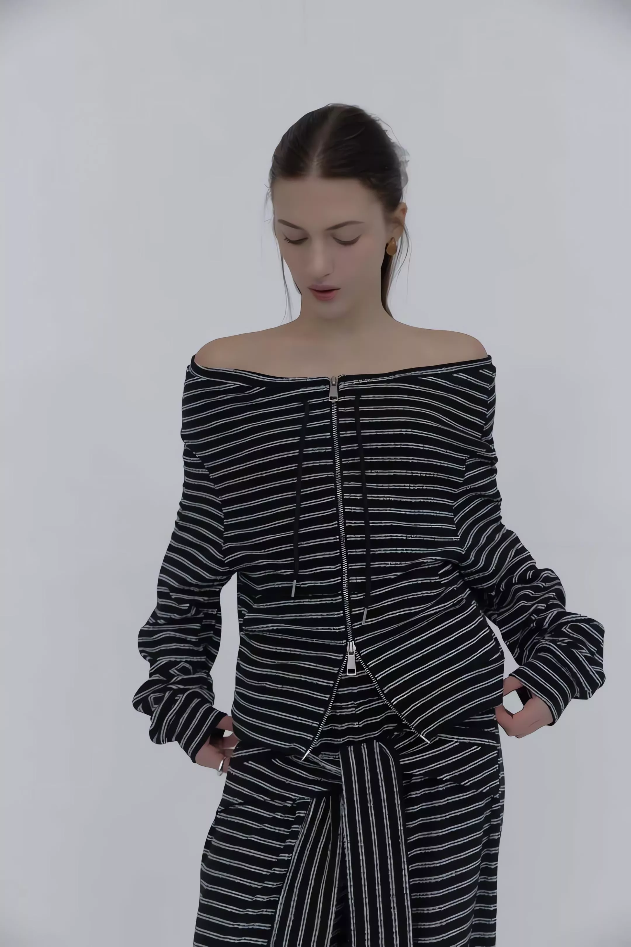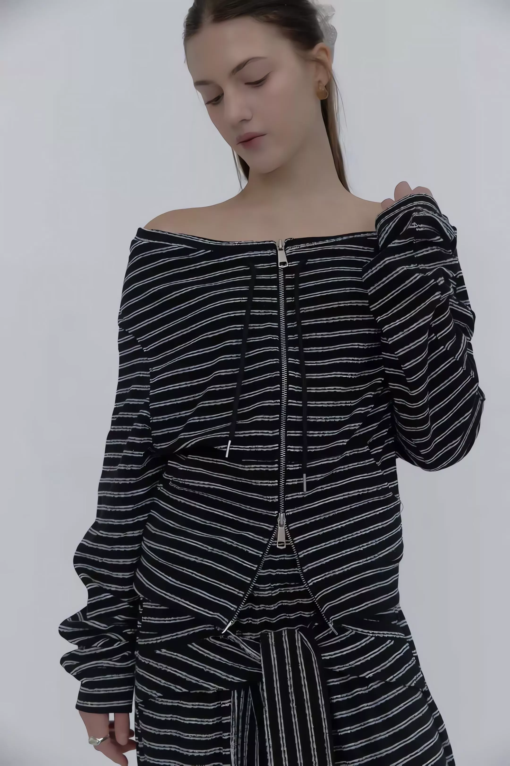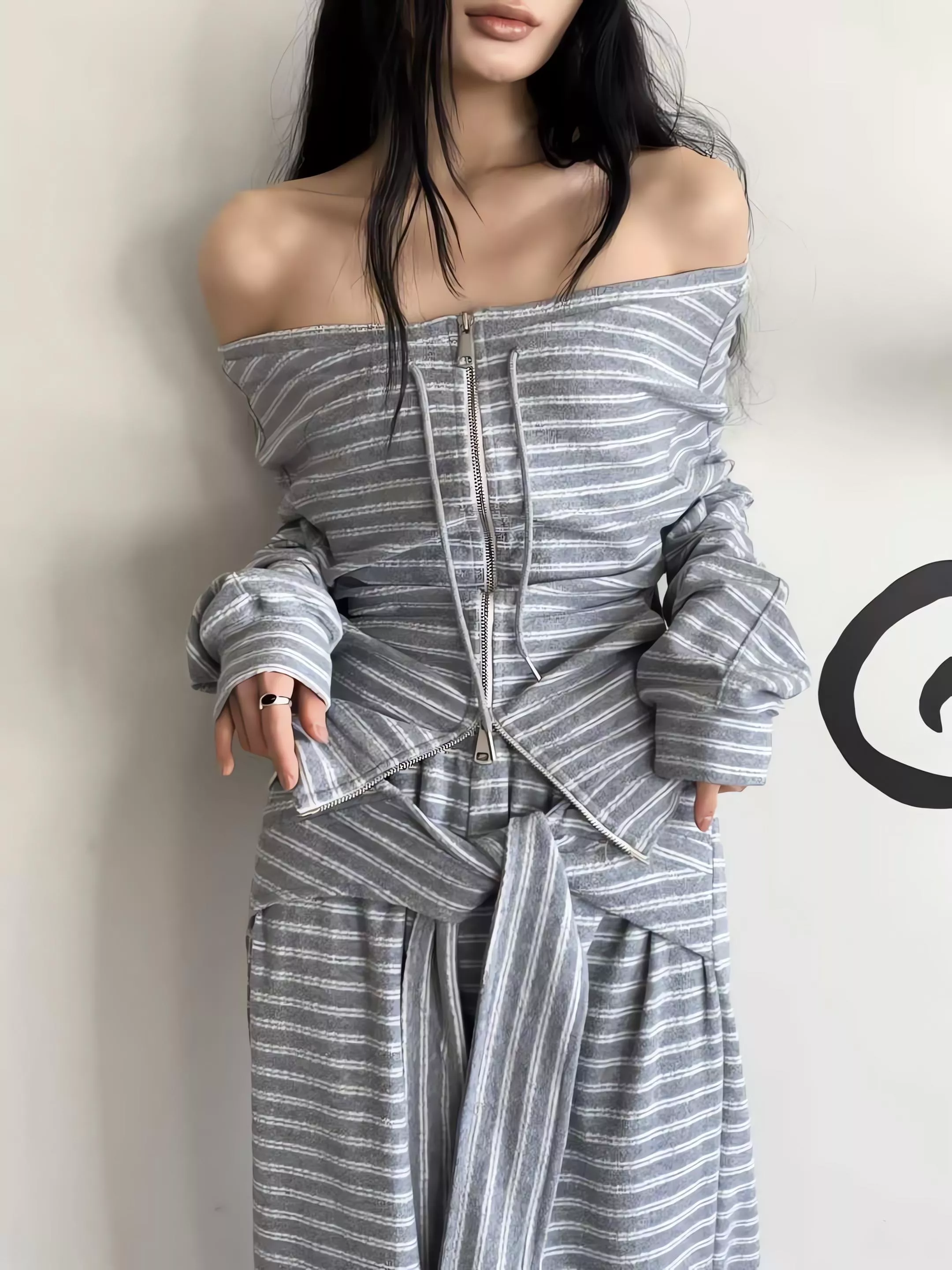 這不僅僅是一套條紋運動服,更是對細節與實穿性的極致追求。上衣採用的 「一字領抽繩」設計,可以自由調整領口寬度,隨性切換落肩或立領風格;特別是對於窄肩或小肩膀的女生來說,透過抽繩縮小領口,能有效解決一字領容易滑落的困擾,穿起來更有安全感。