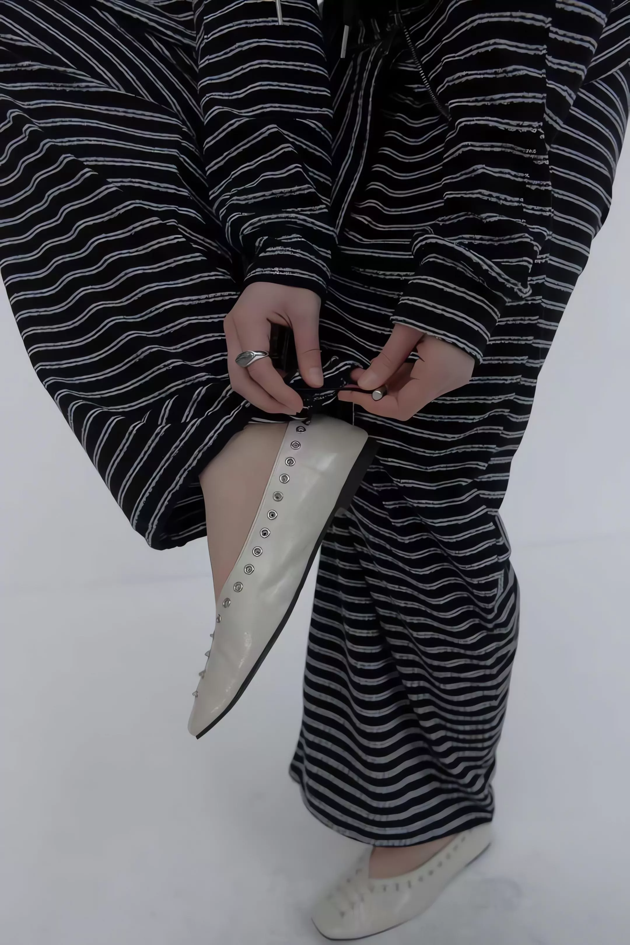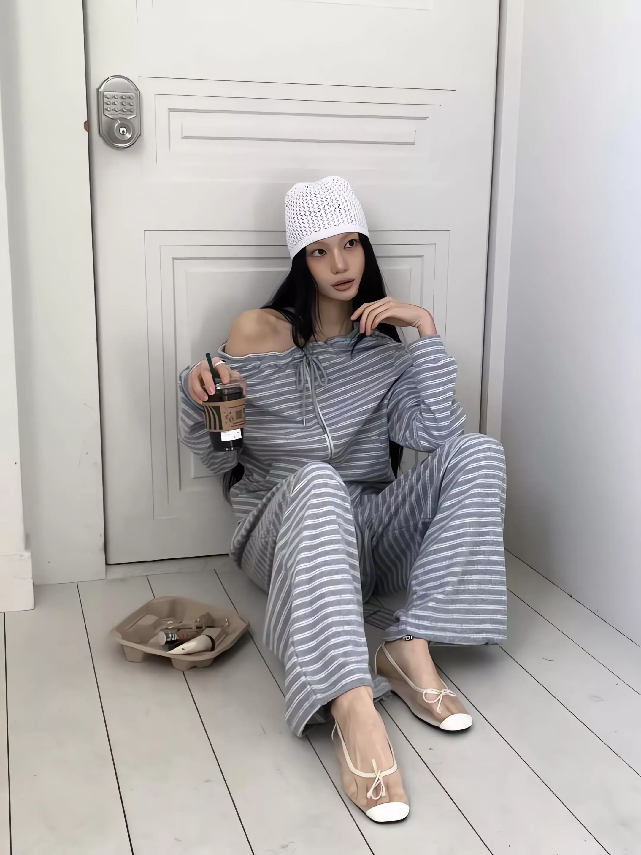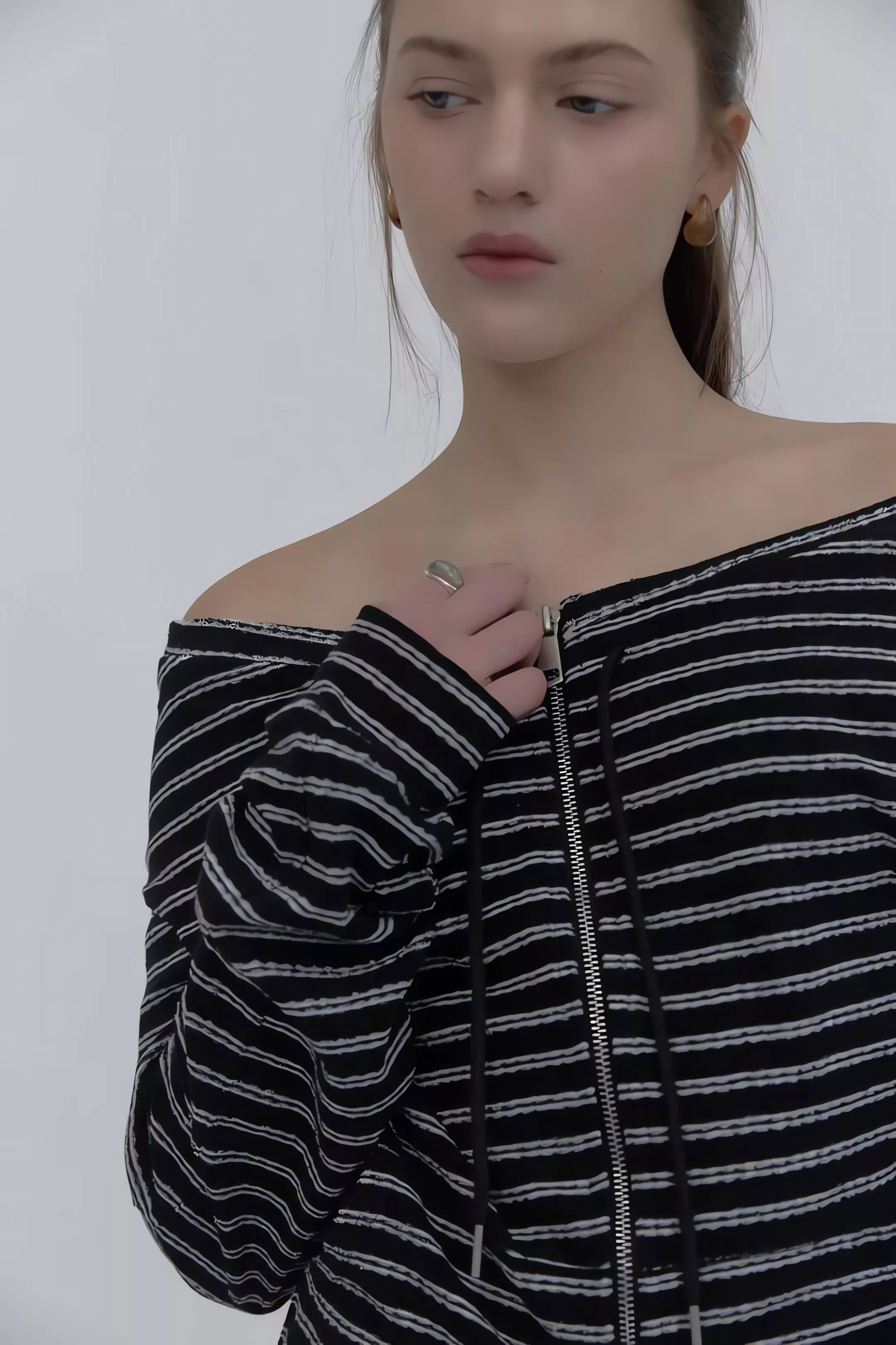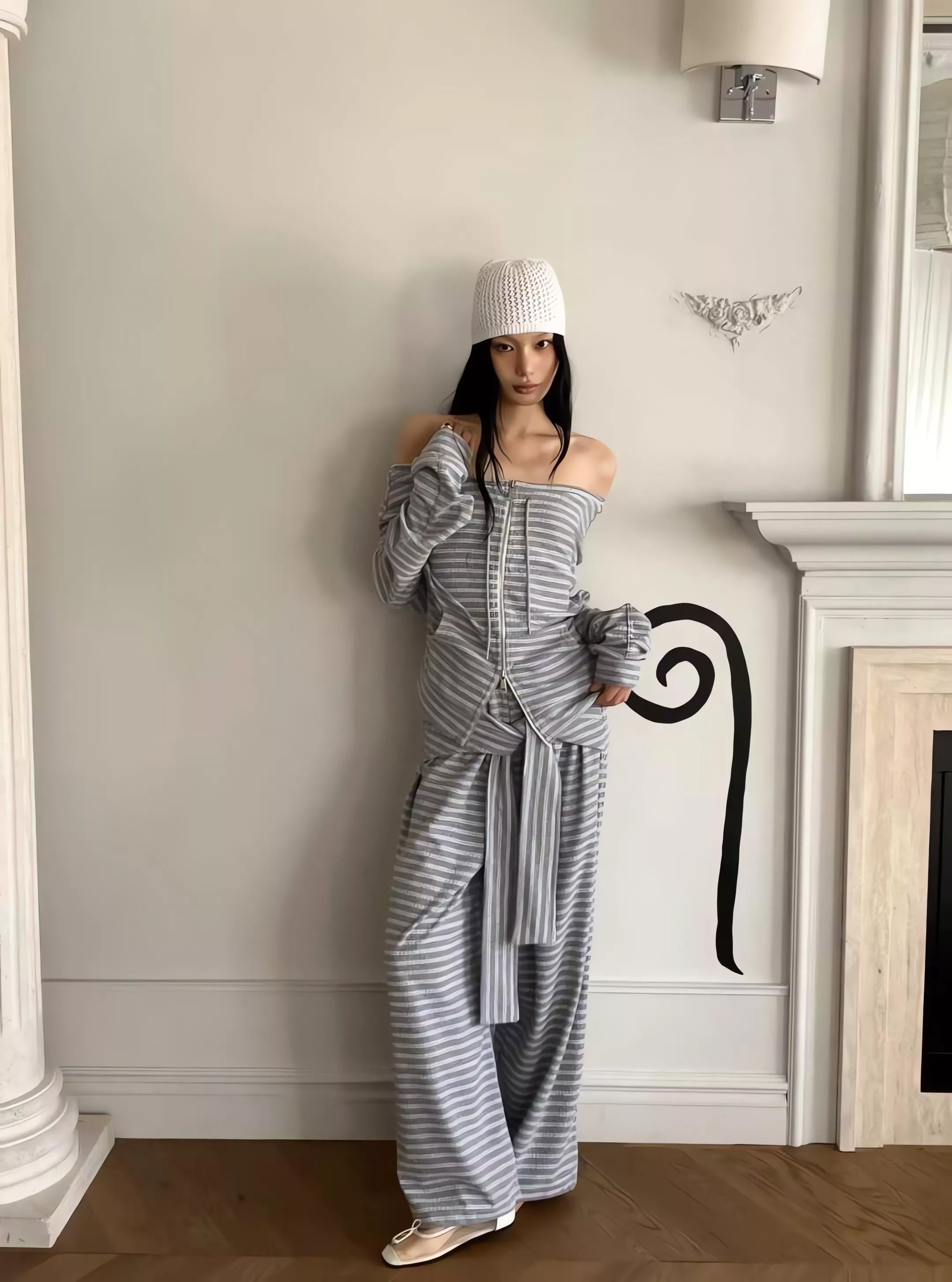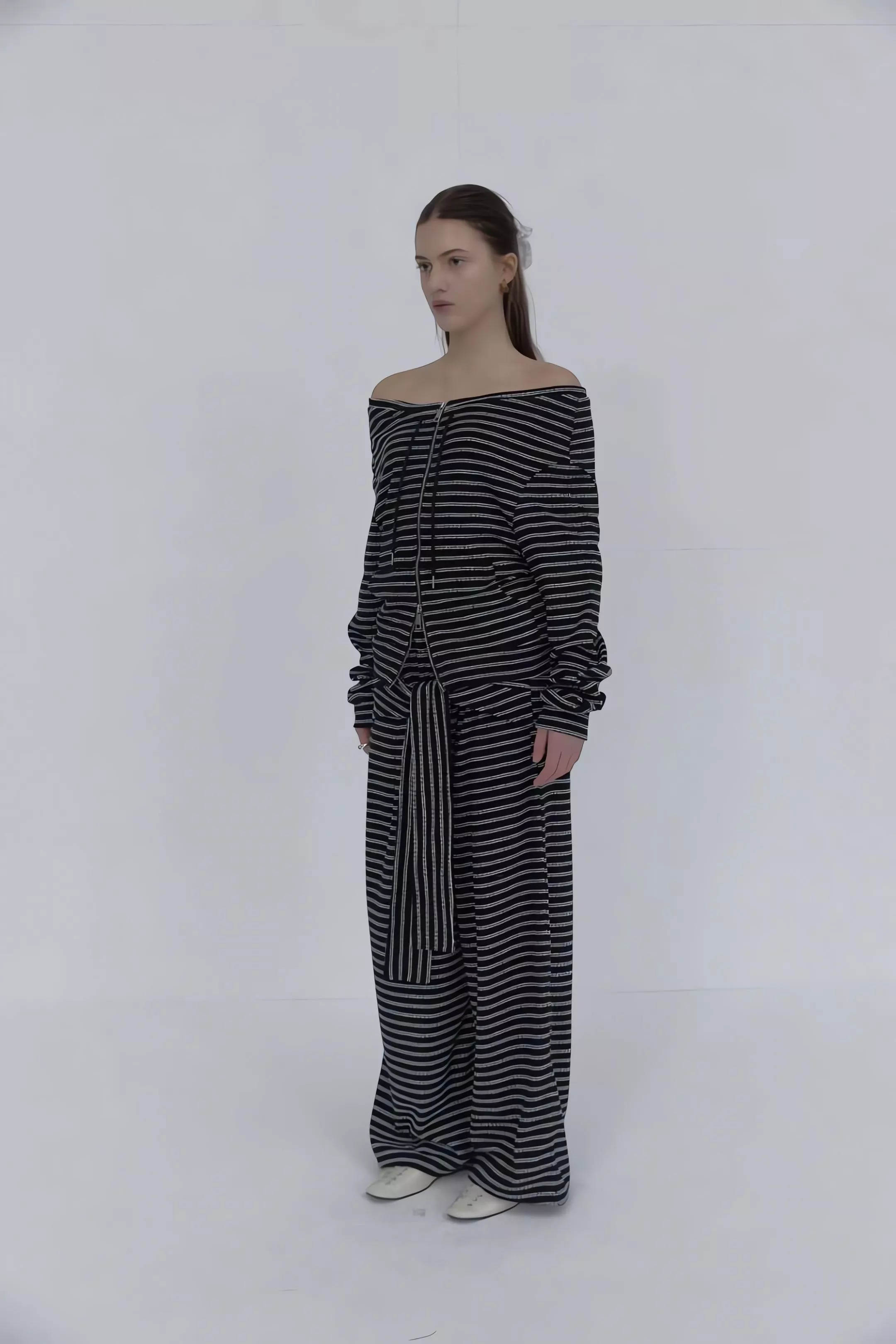 這不僅僅是一套條紋運動服,更是對細節與實穿性的極致追求。上衣採用的 「一字領抽繩」設計,可以自由調整領口寬度,隨性切換落肩或立領風格;特別是對於窄肩或小肩膀的女生來說,透過抽繩縮小領口,能有效解決一字領容易滑落的困擾,穿起來更有安全感。