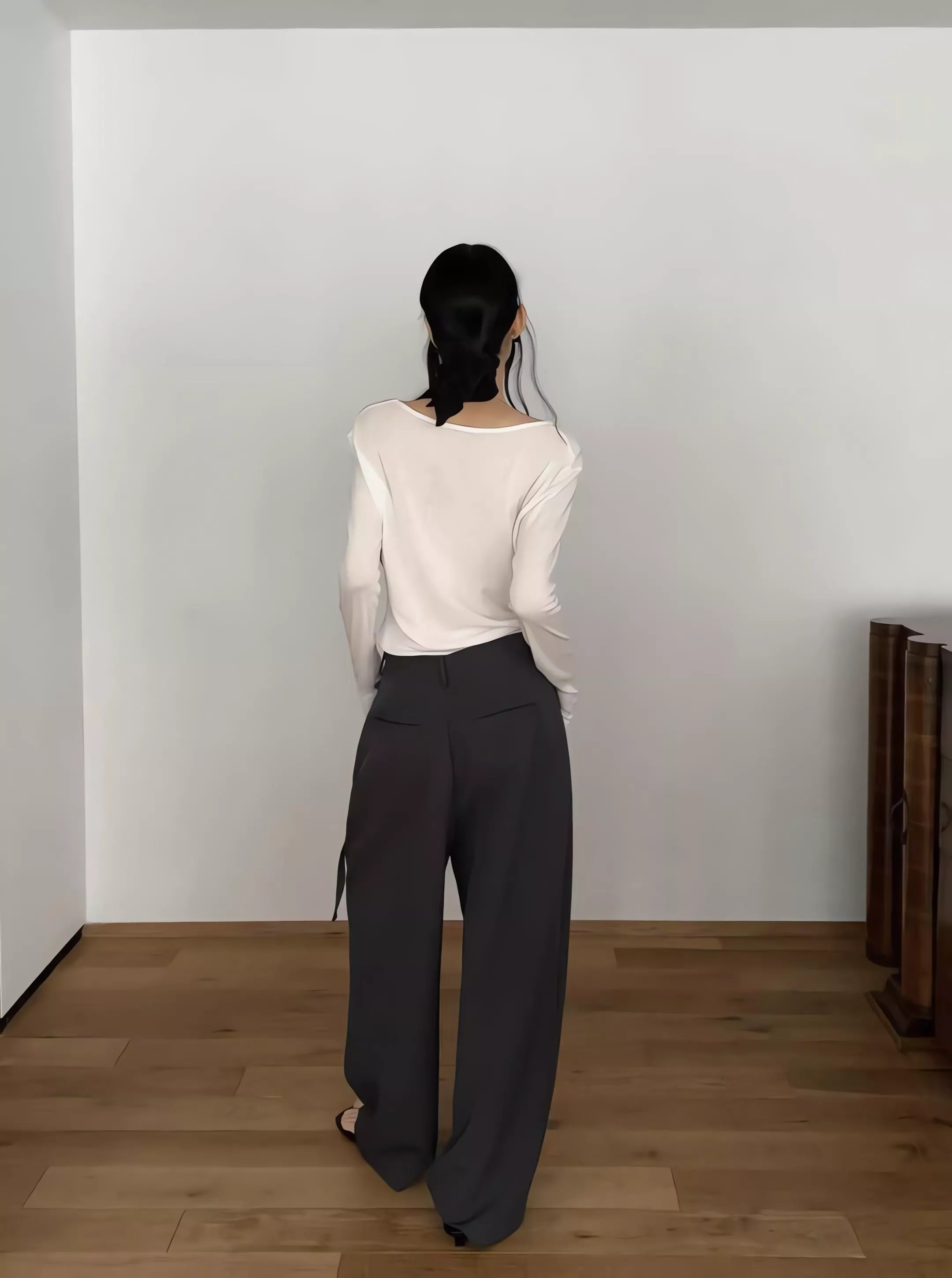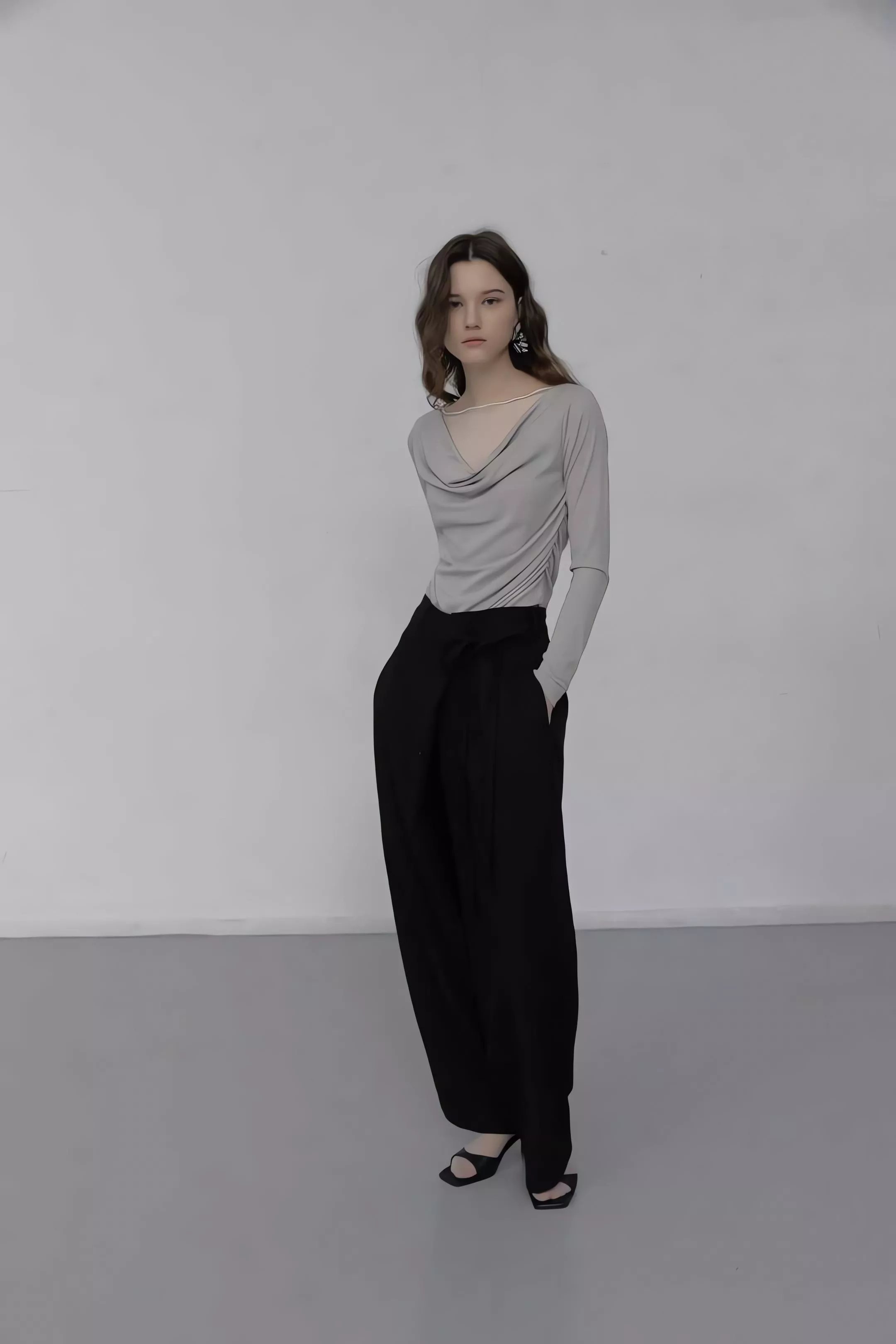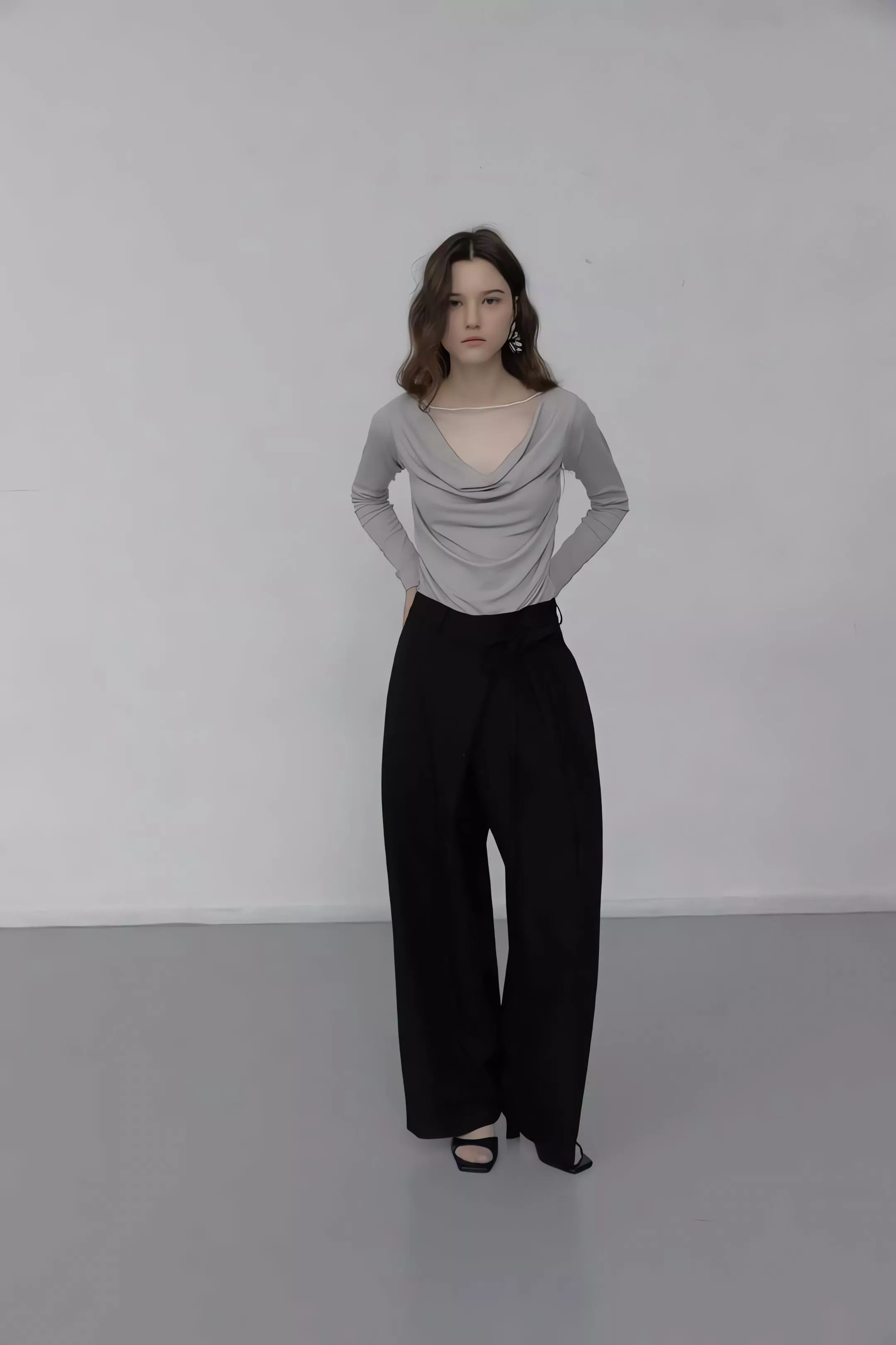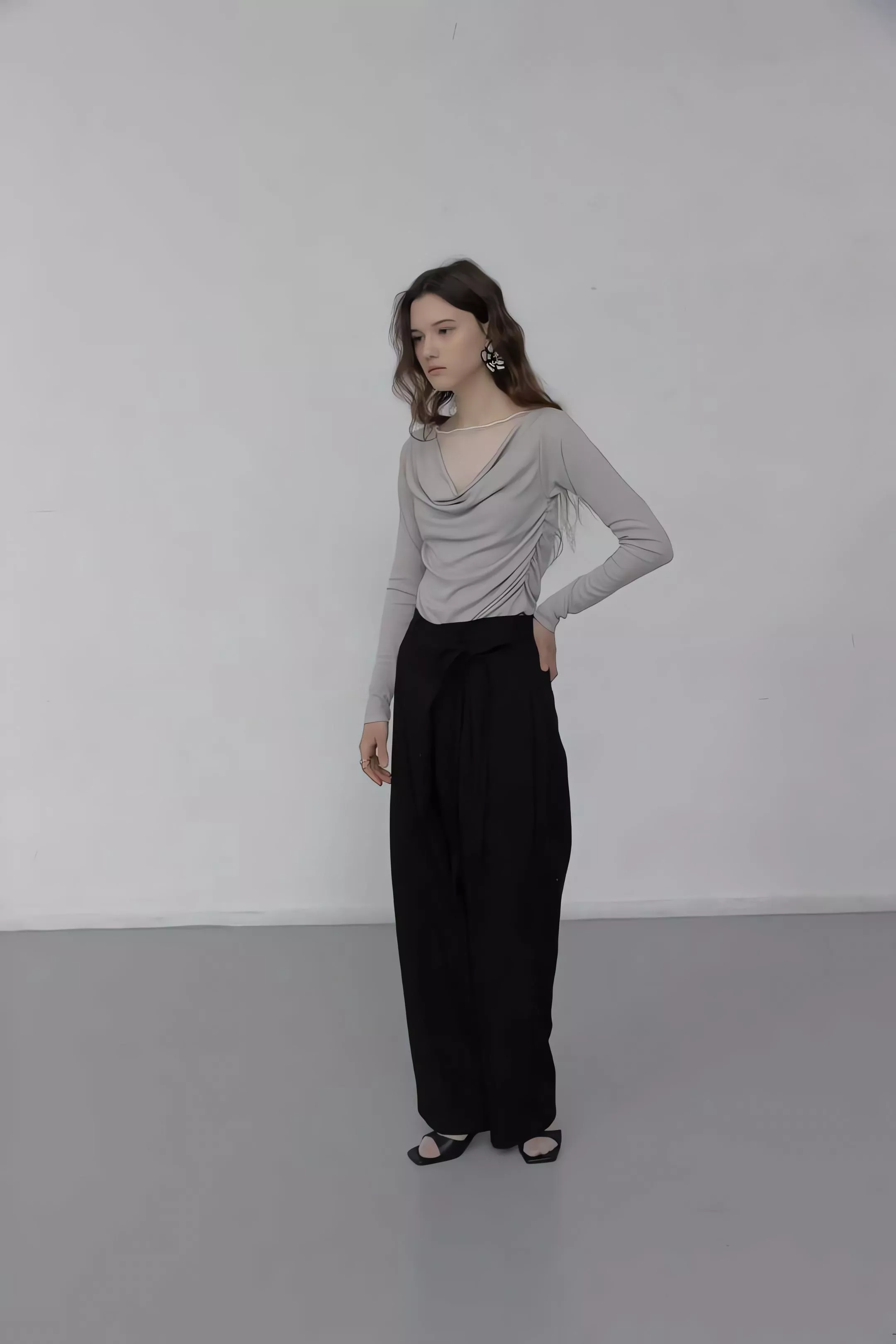 重點在於面料極致的垂墜感,能順著身型垂直延伸,確保寬鬆褲管保持筆直。不論是搭配尖頭鞋拉長線條,或是穿著平底鞋散發自在氣息,都能展現這款褲子特有的流動感。