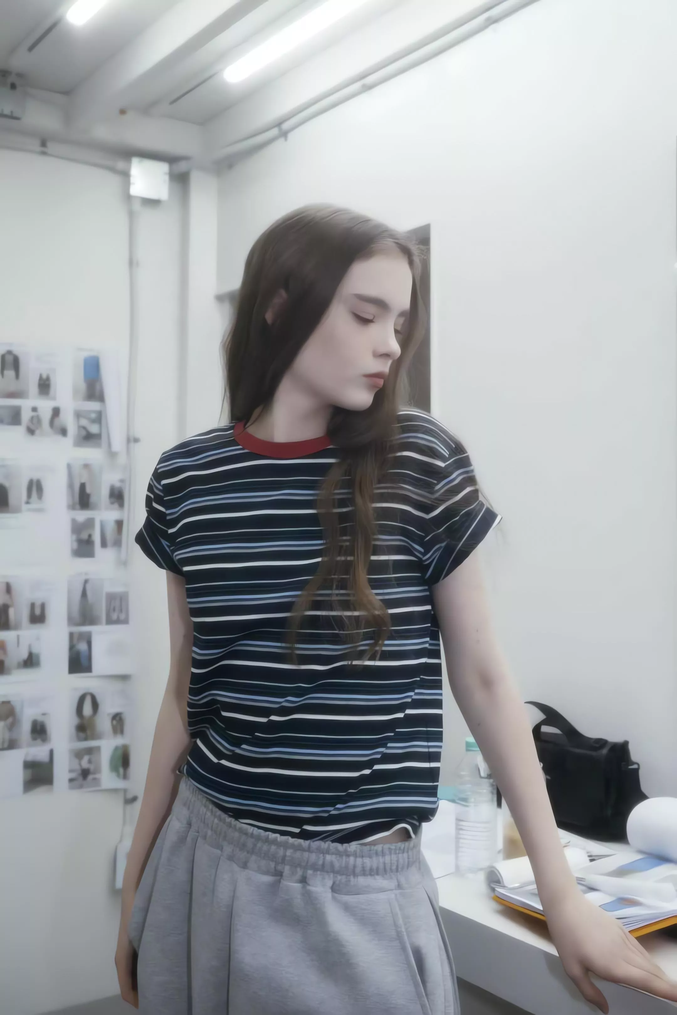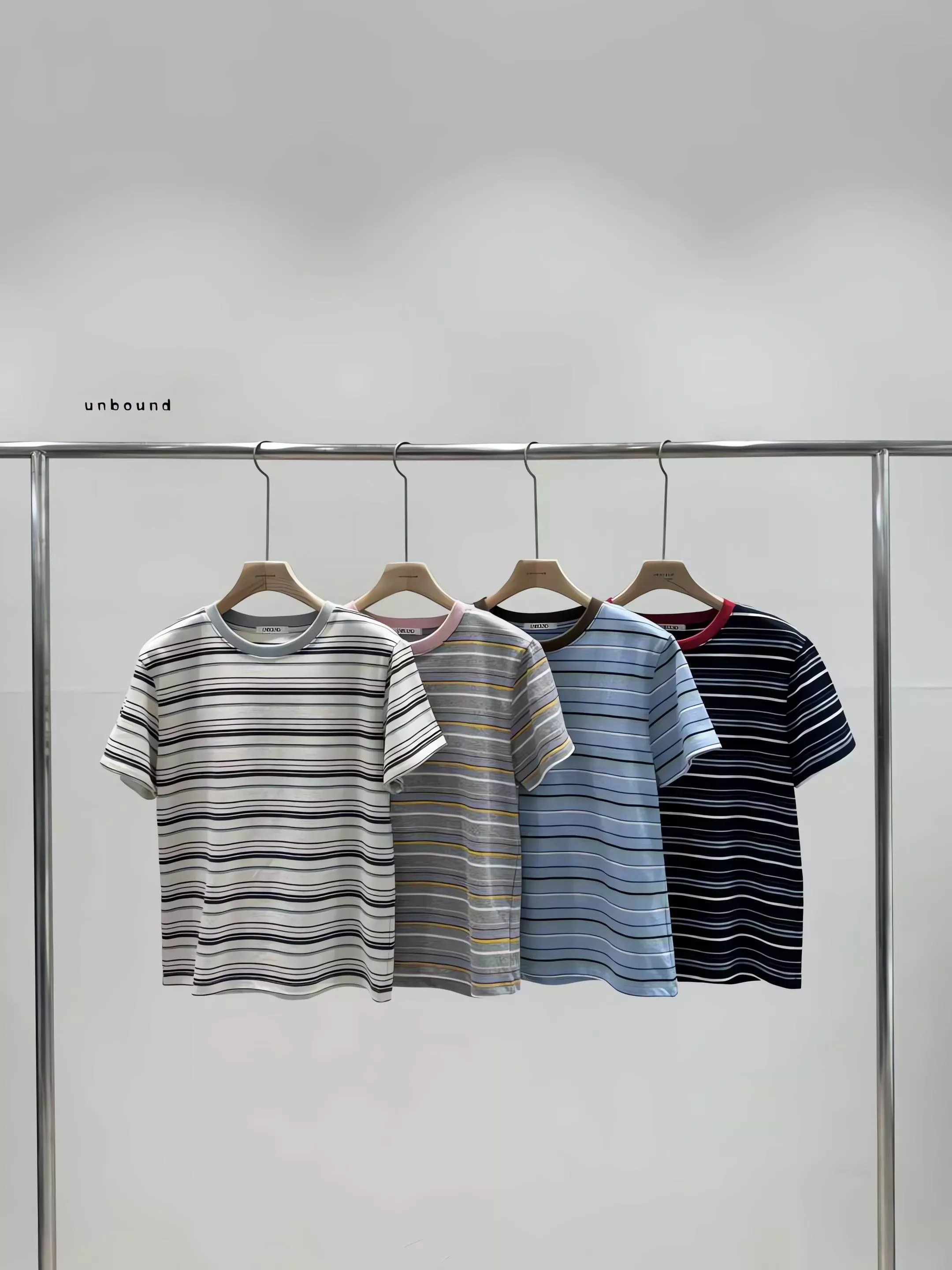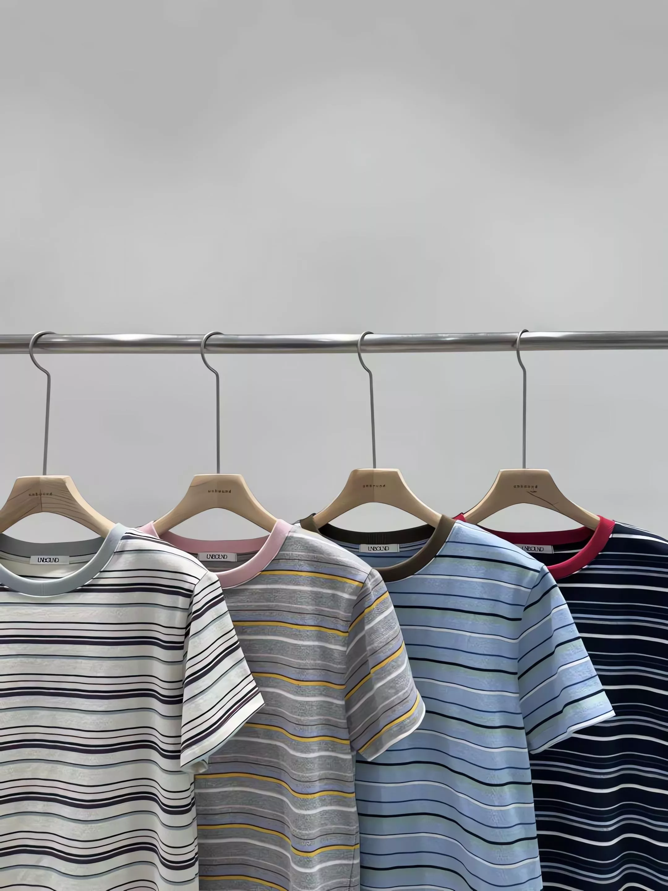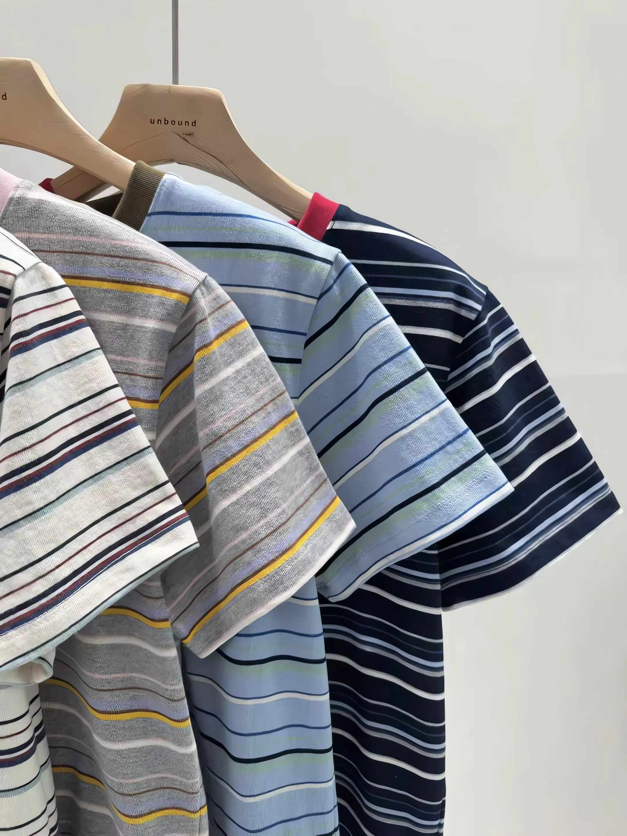 條紋的間距與撞色,決定了一件 T-shirt 是普通還是出色。這次的四個色調,從沈穩的深藍到清爽的淺米,精準拿捏了視覺上的重量感。