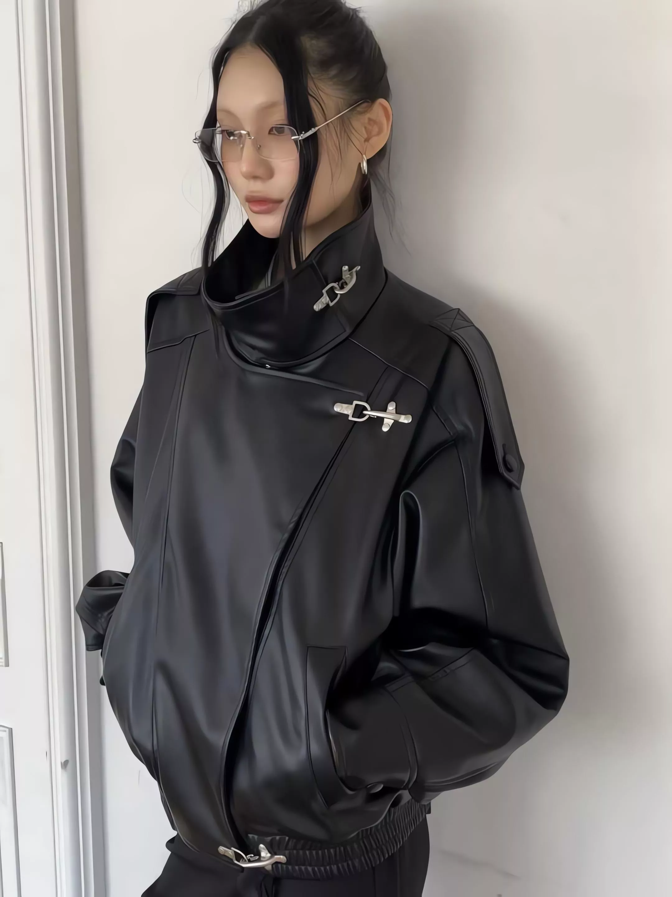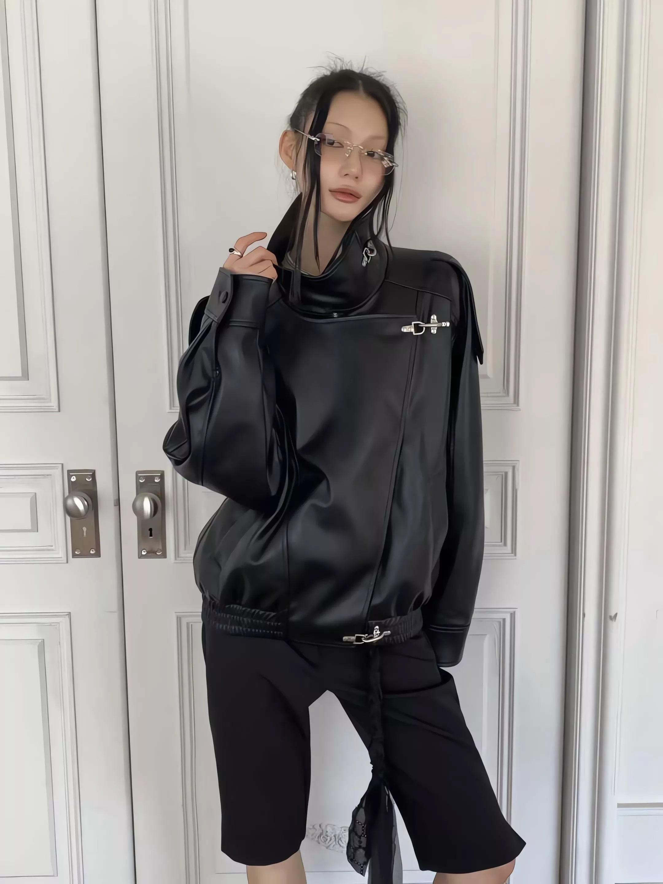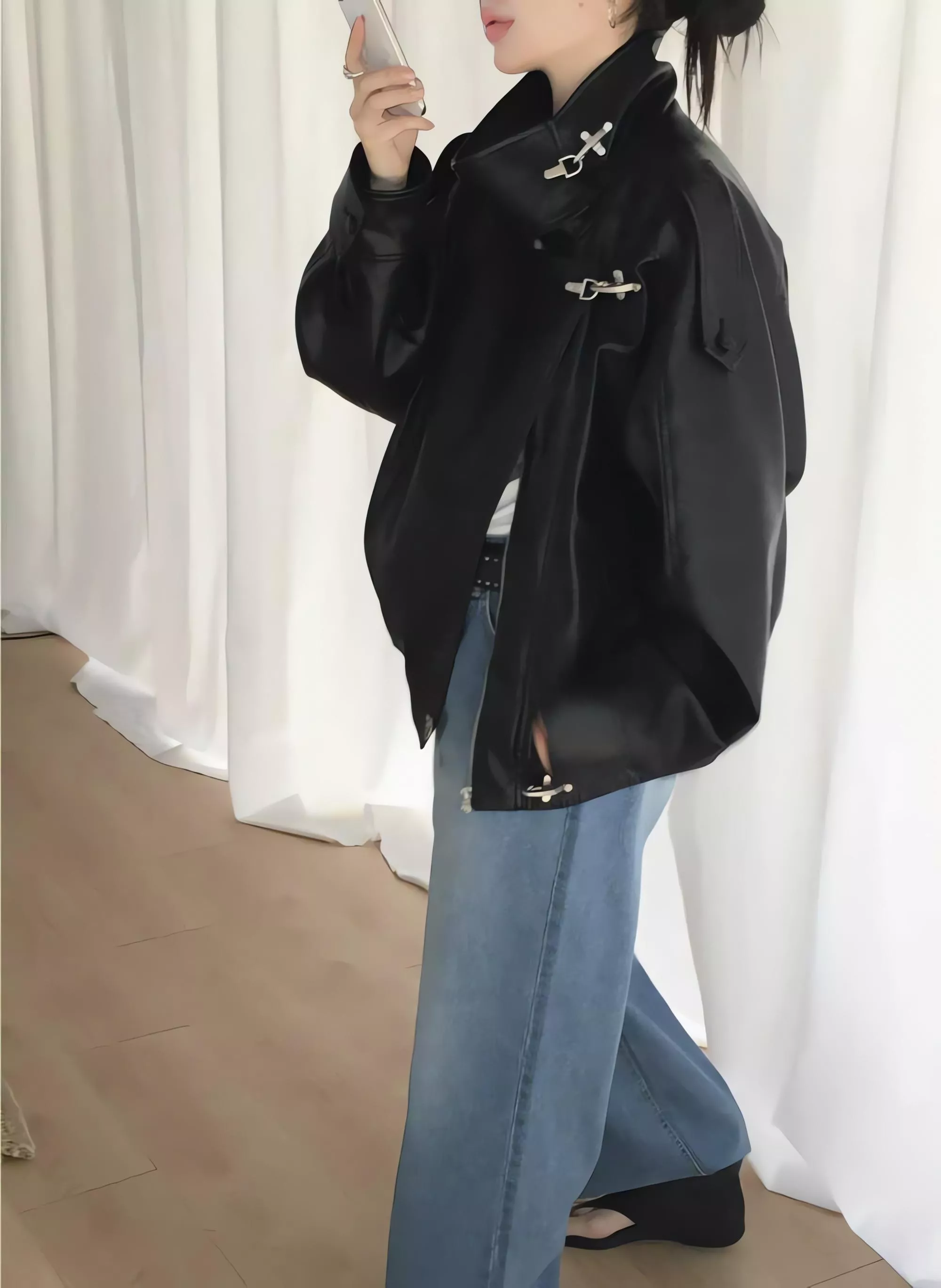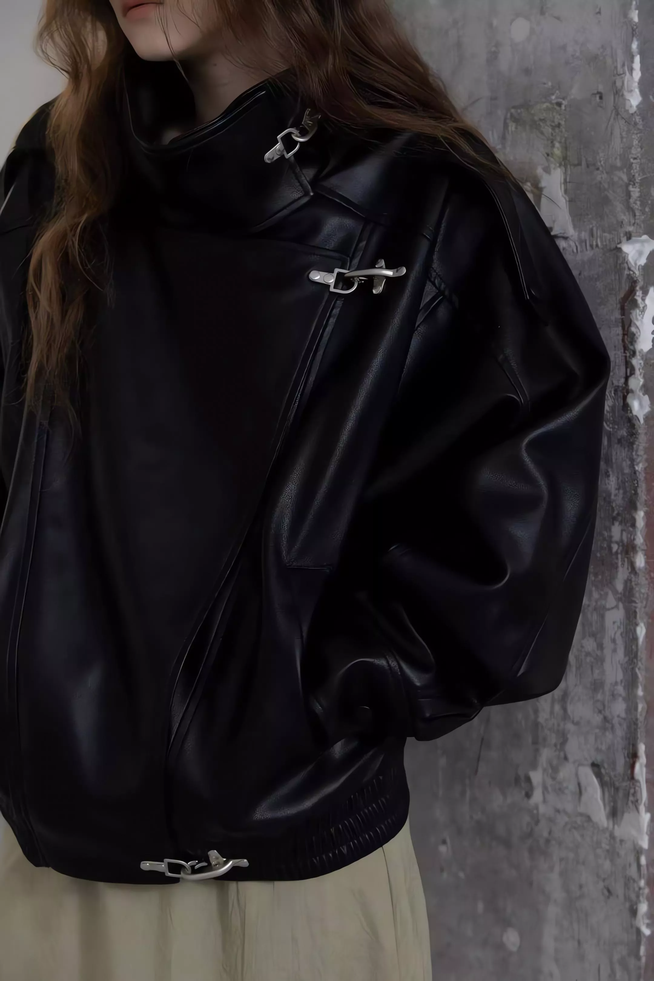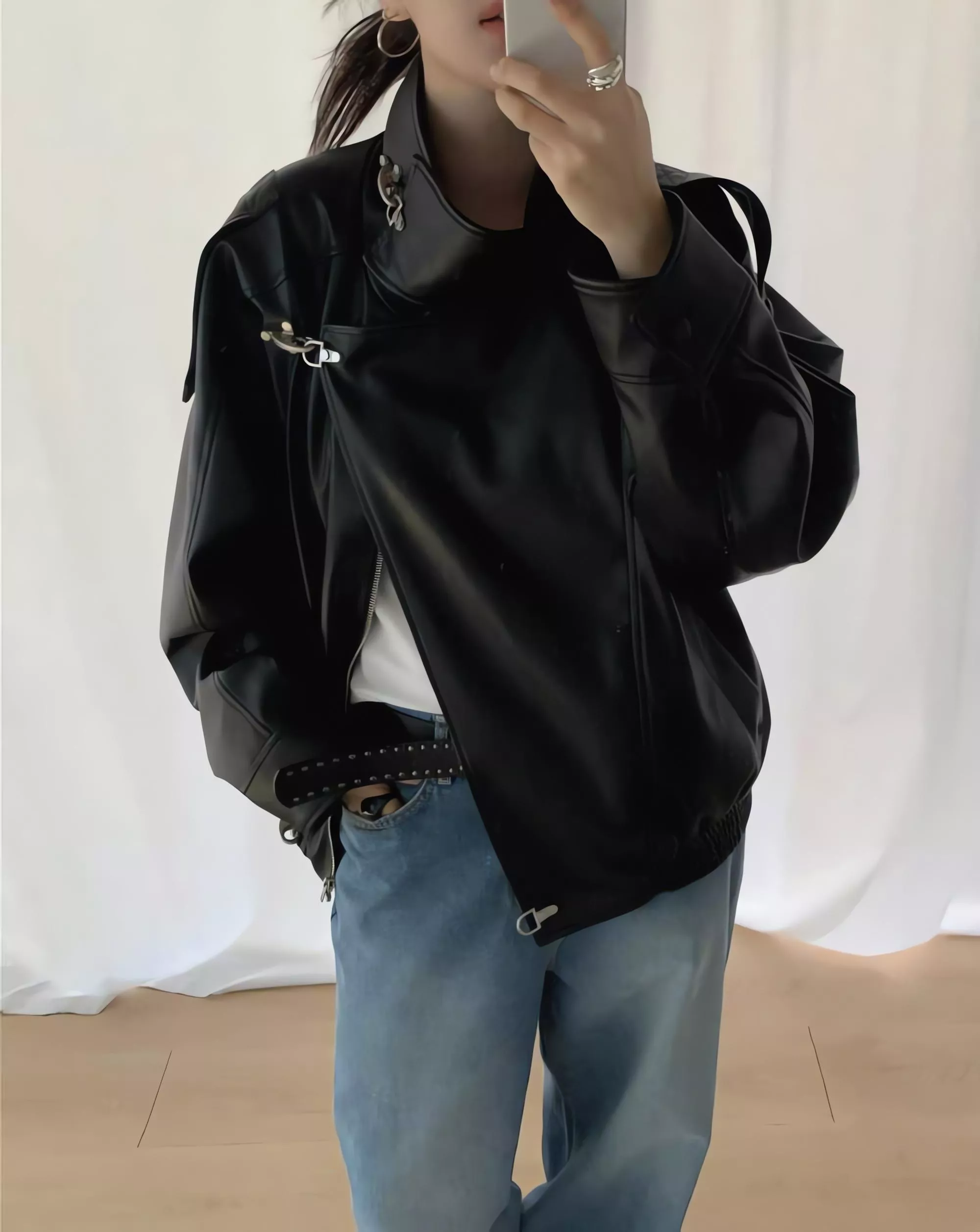 版型略寬鬆、長度偏短,不論搭洋裝或牛仔褲都很好看。胸前與下擺的金屬扣環,是整件外套很有記憶點的小細節。就算是很休閒的穿搭,套上這件外套,整體造型也會變得很俐落。