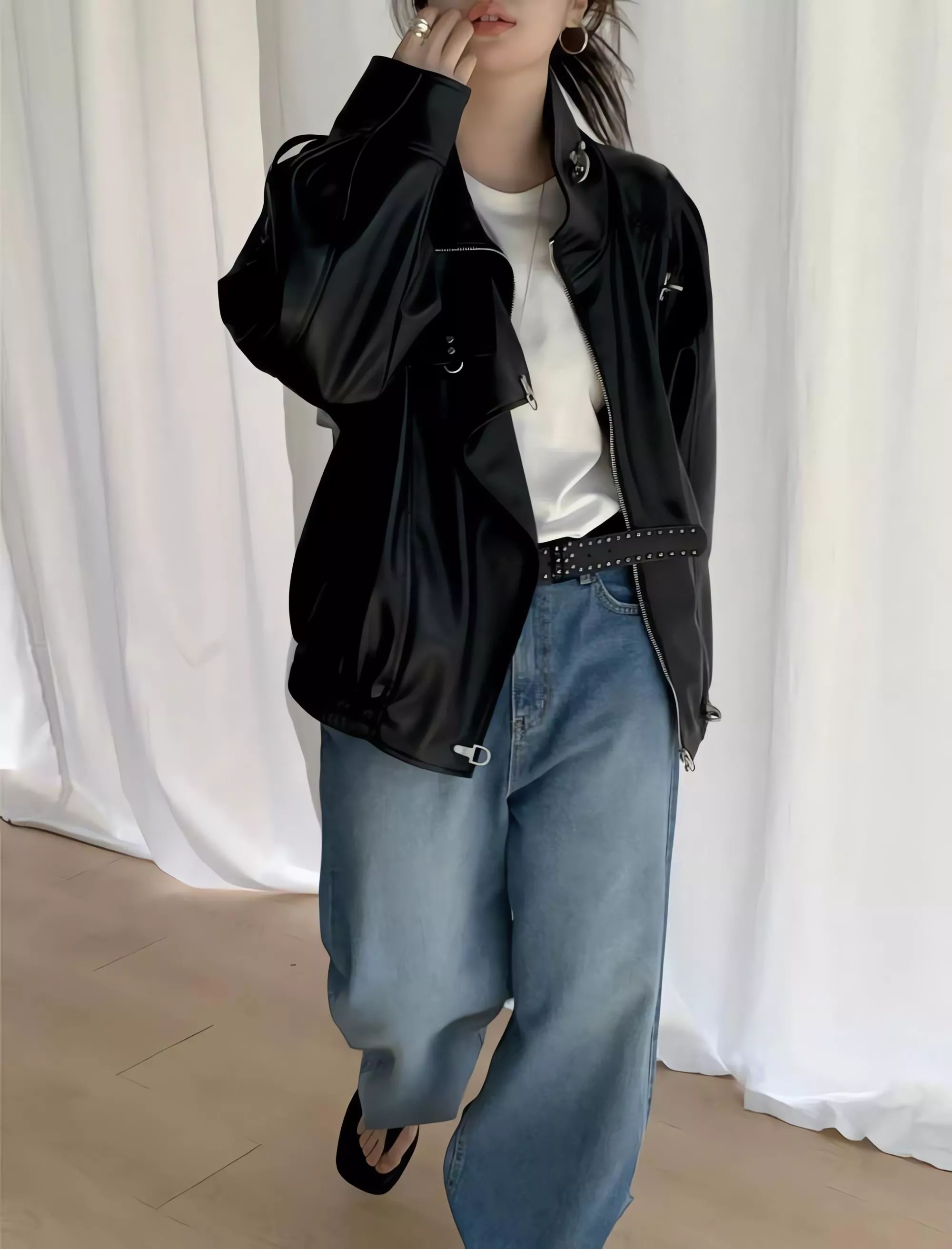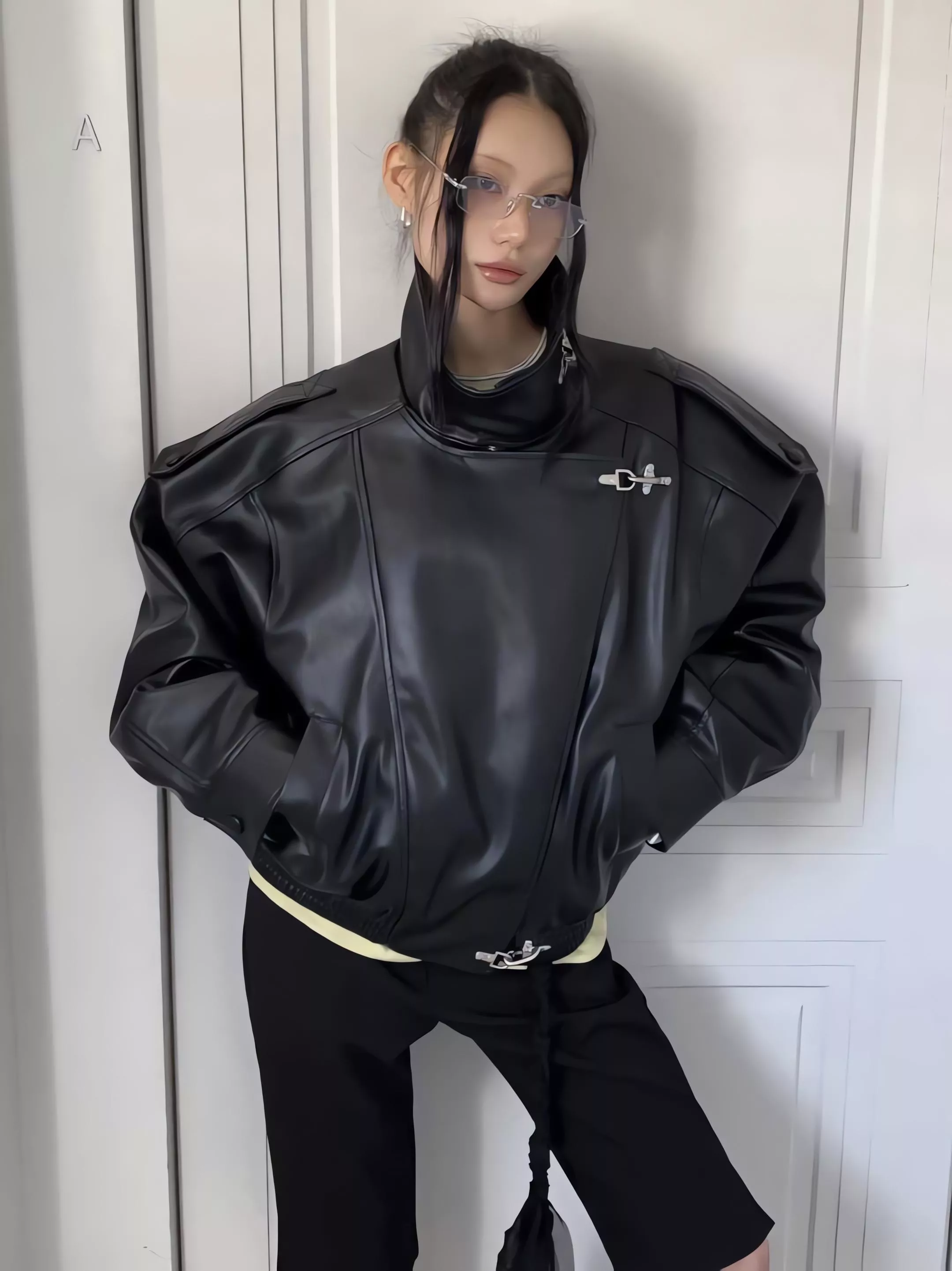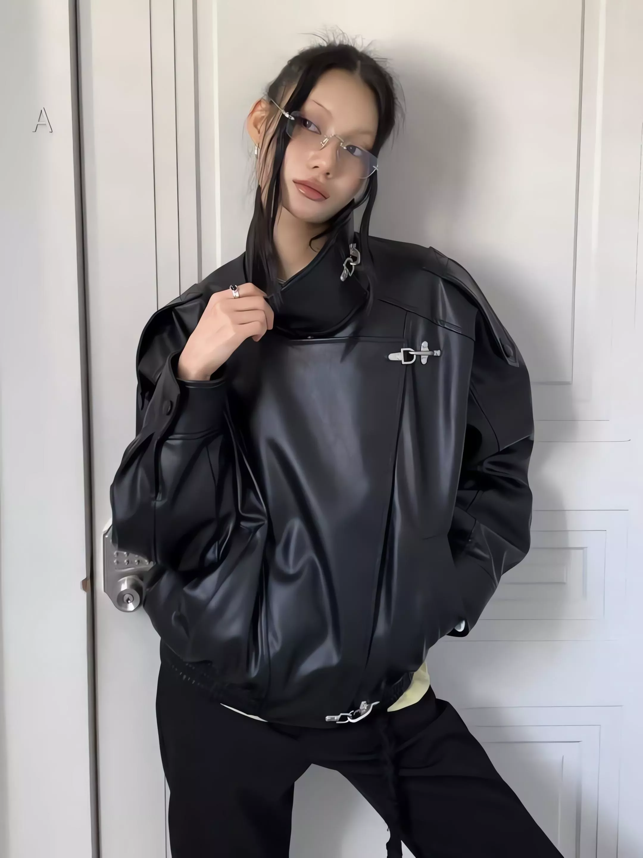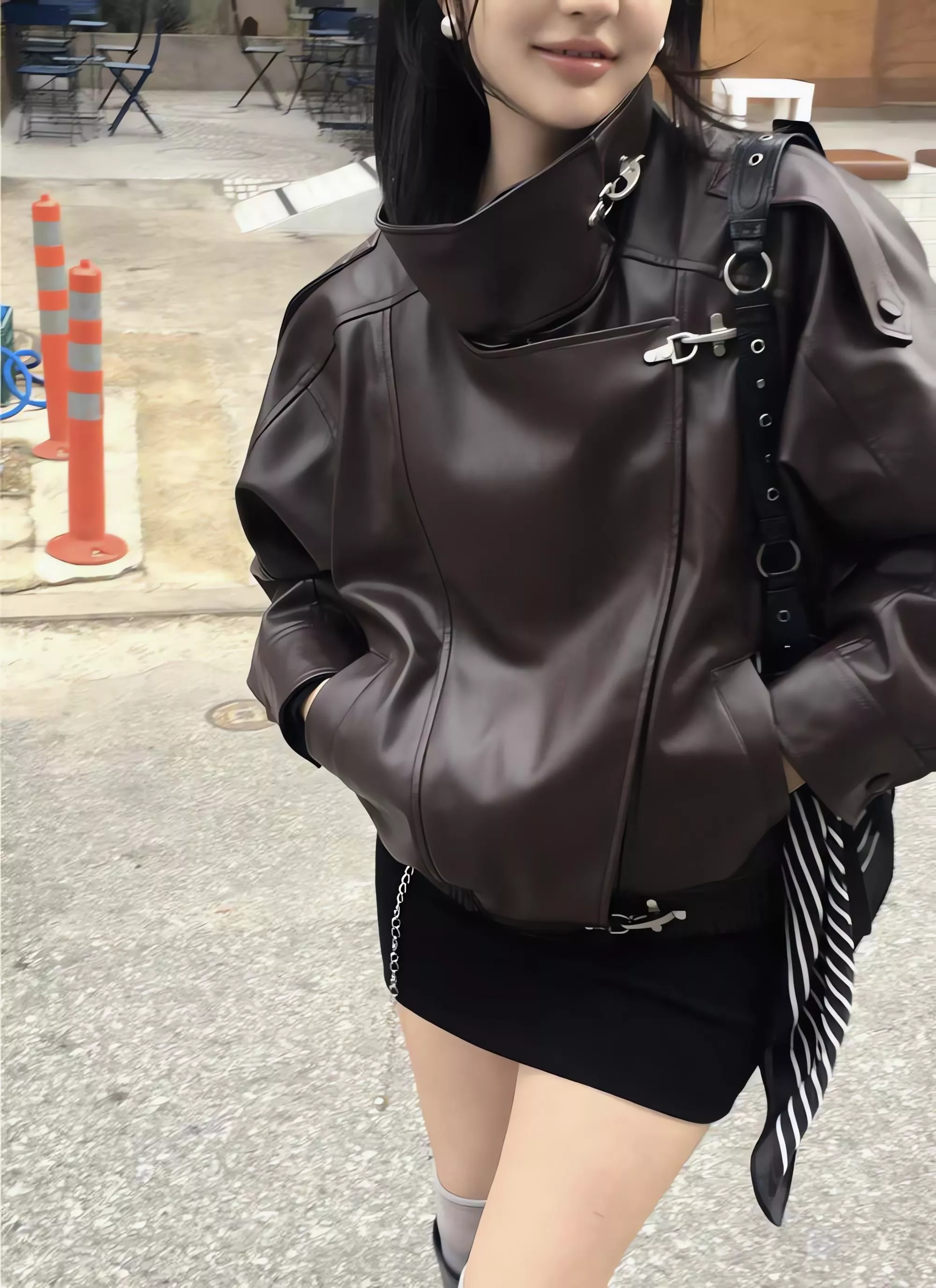 版型略寬鬆、長度偏短,不論搭洋裝或牛仔褲都很好看。胸前與下擺的金屬扣環,是整件外套很有記憶點的小細節。就算是很休閒的穿搭,套上這件外套,整體造型也會變得很俐落。