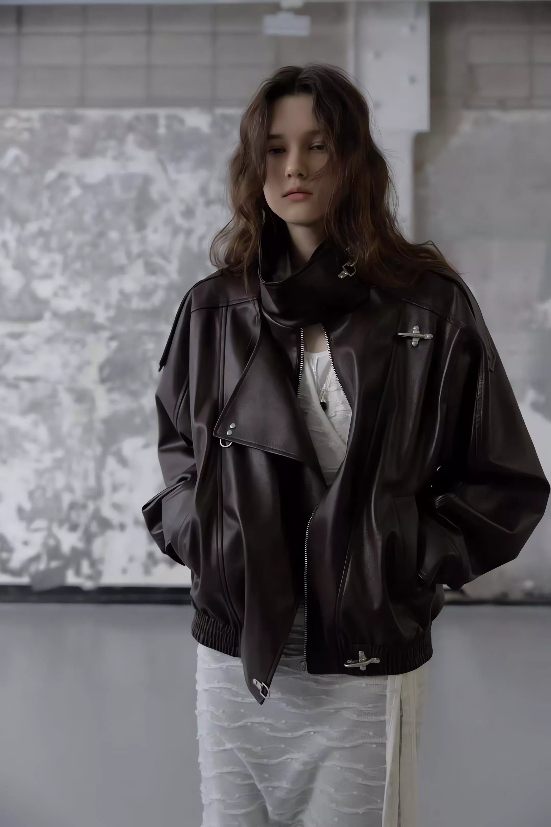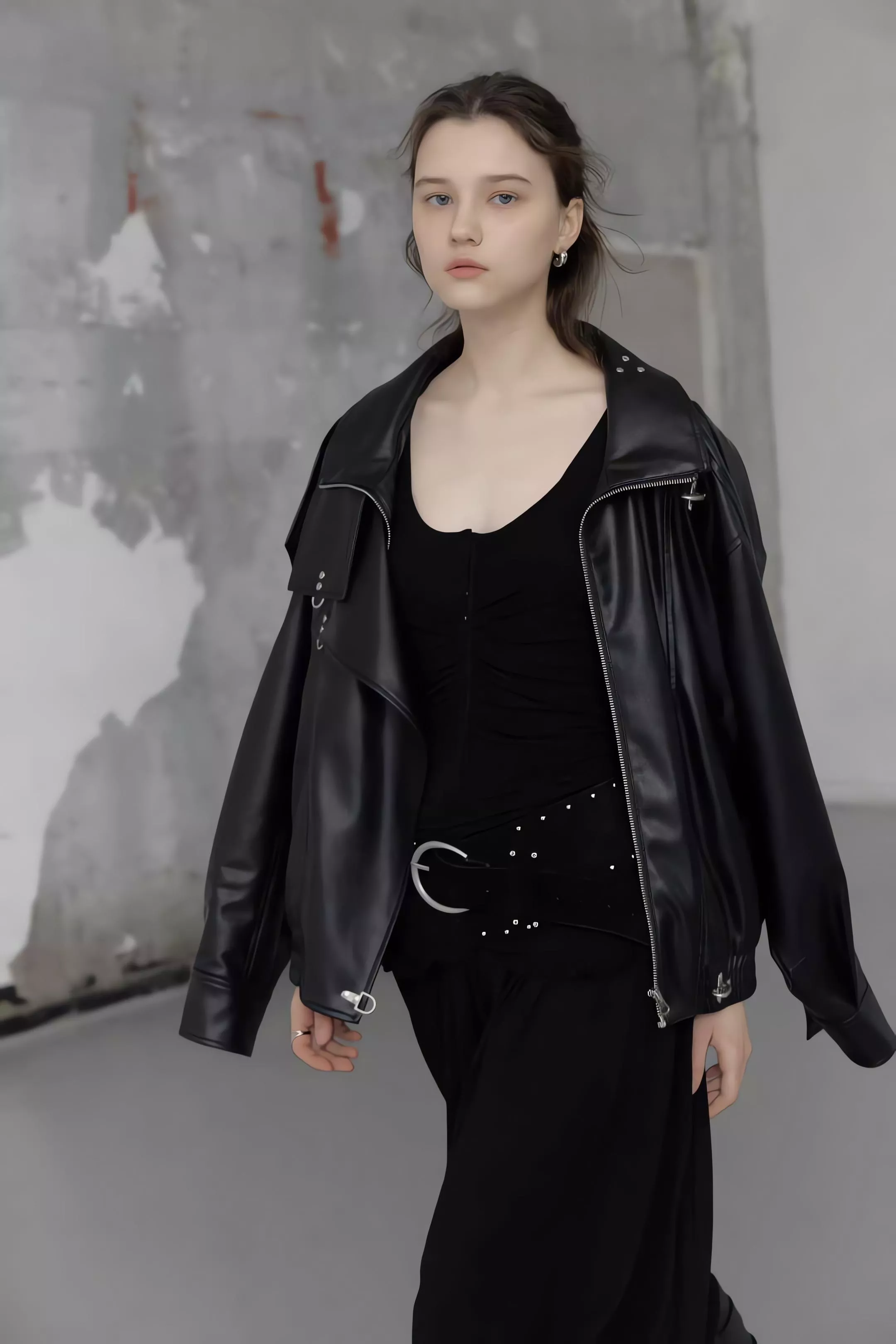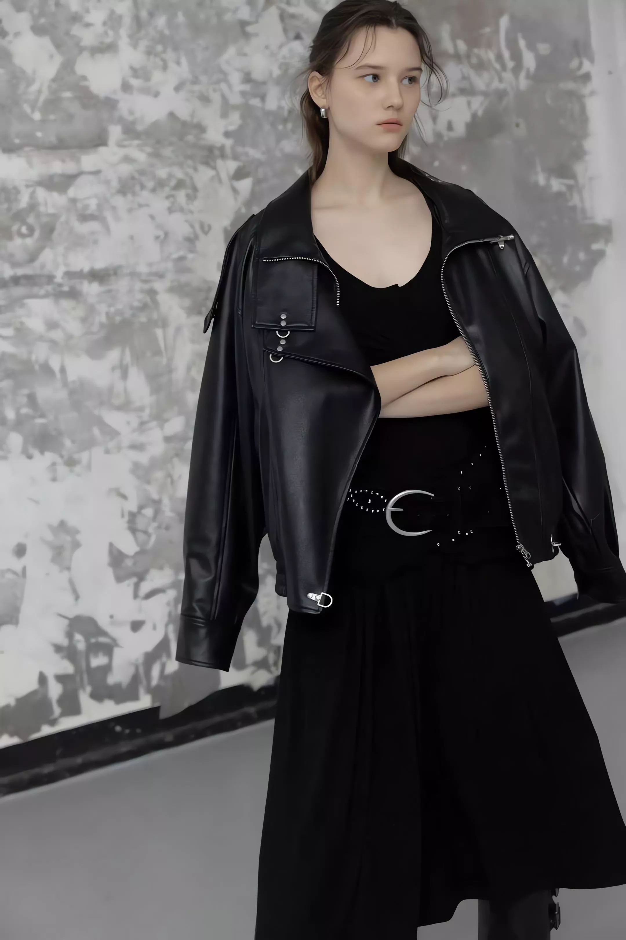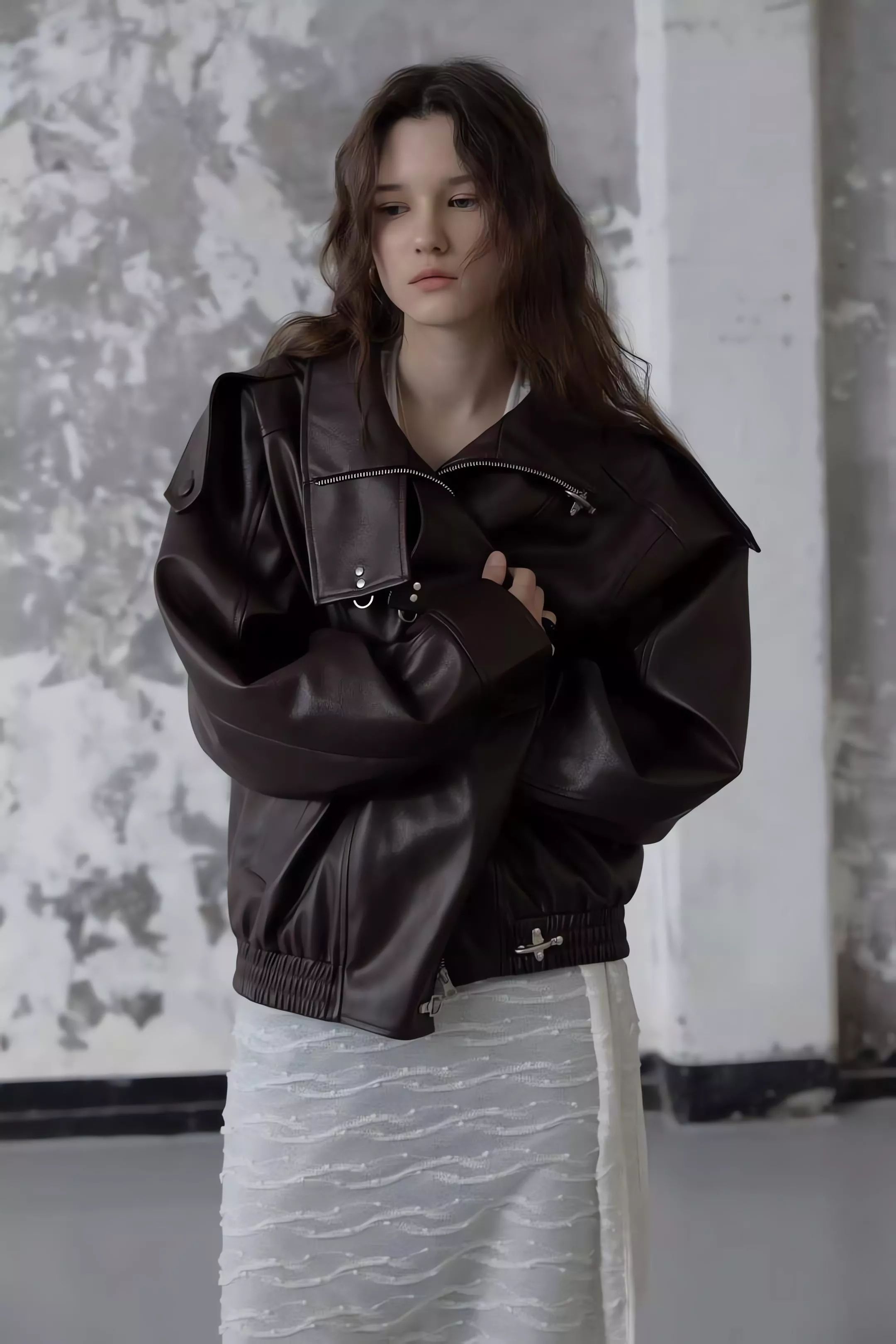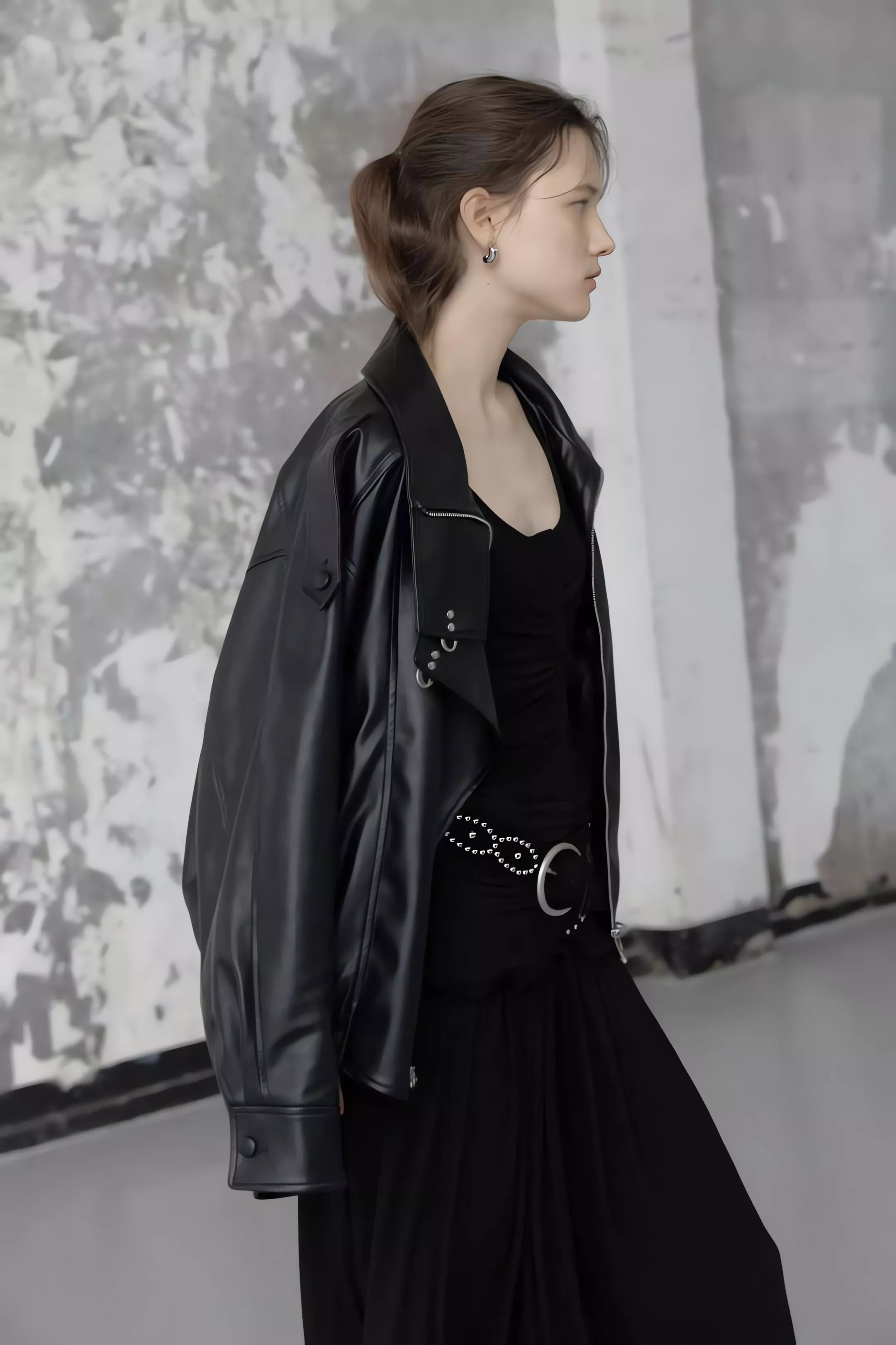 版型略寬鬆、長度偏短,不論搭洋裝或牛仔褲都很好看。胸前與下擺的金屬扣環,是整件外套很有記憶點的小細節。就算是很休閒的穿搭,套上這件外套,整體造型也會變得很俐落。