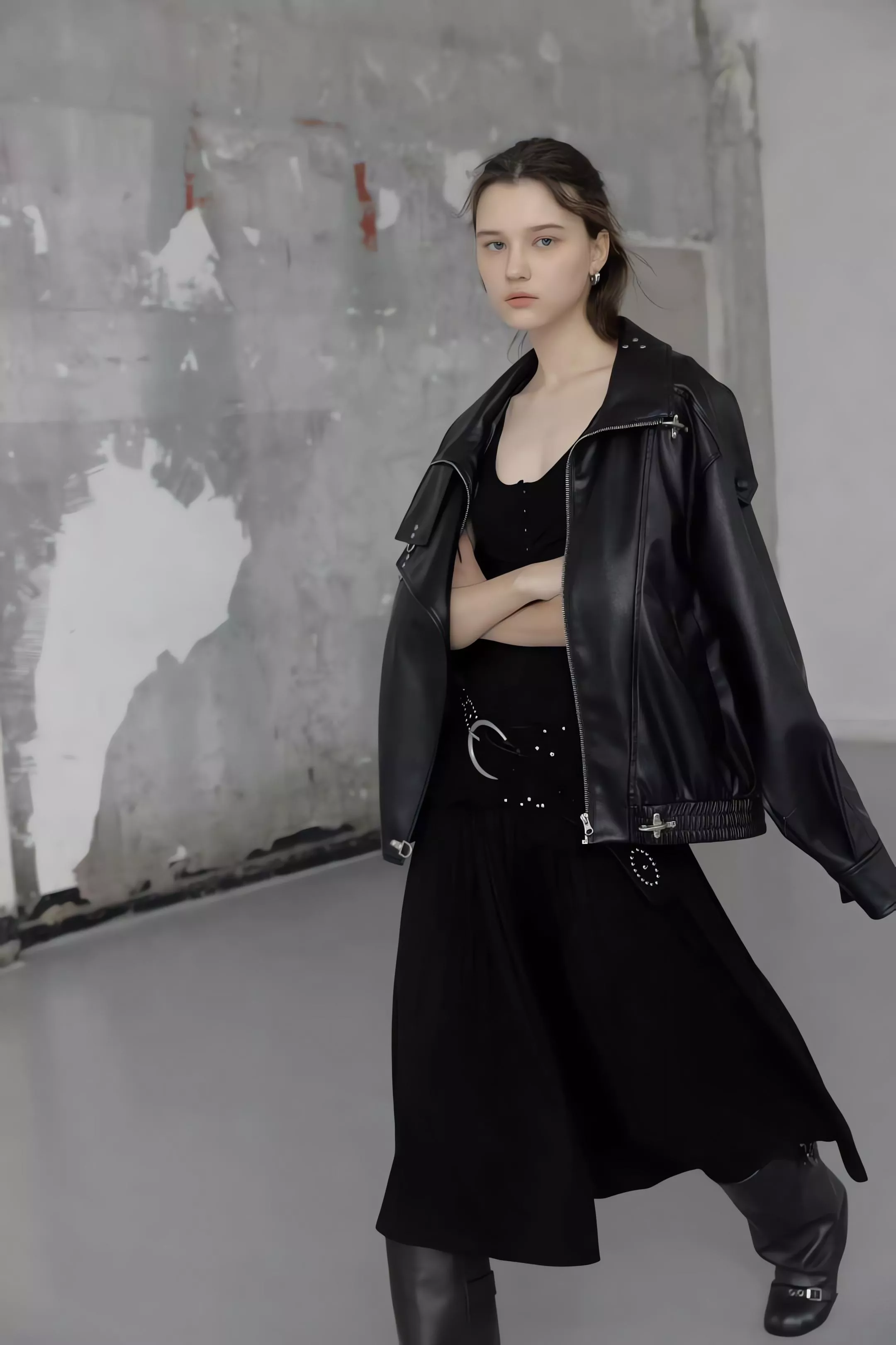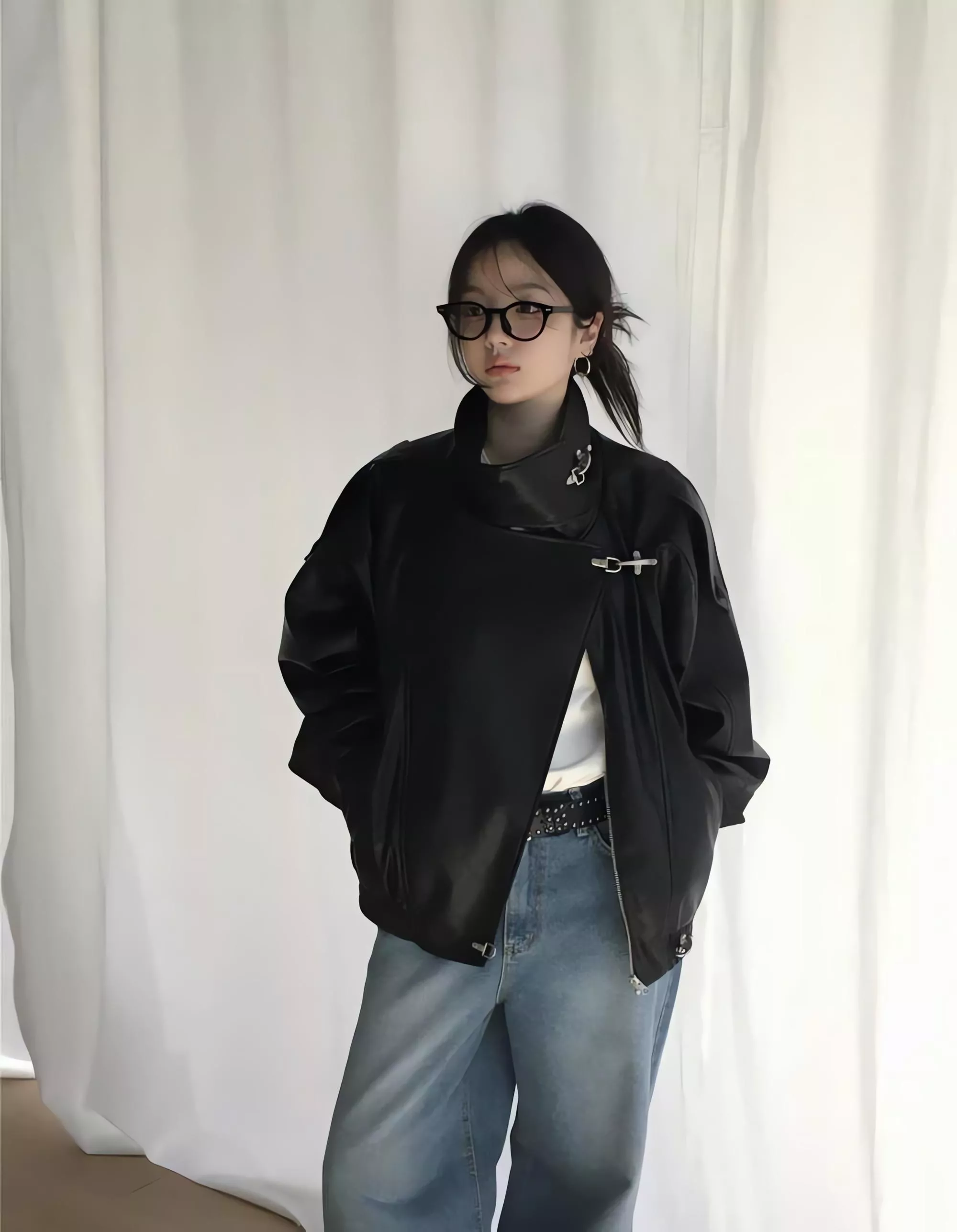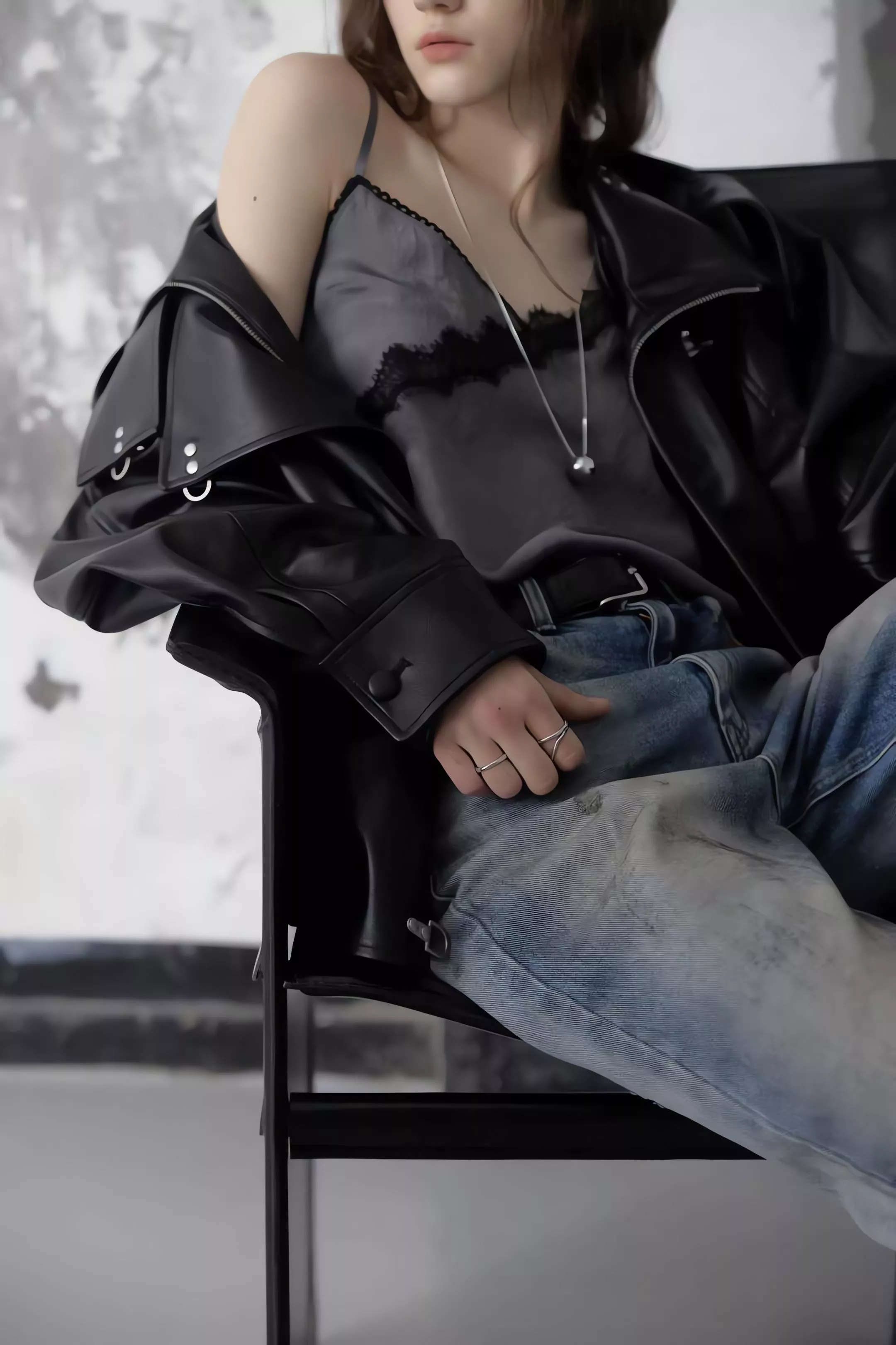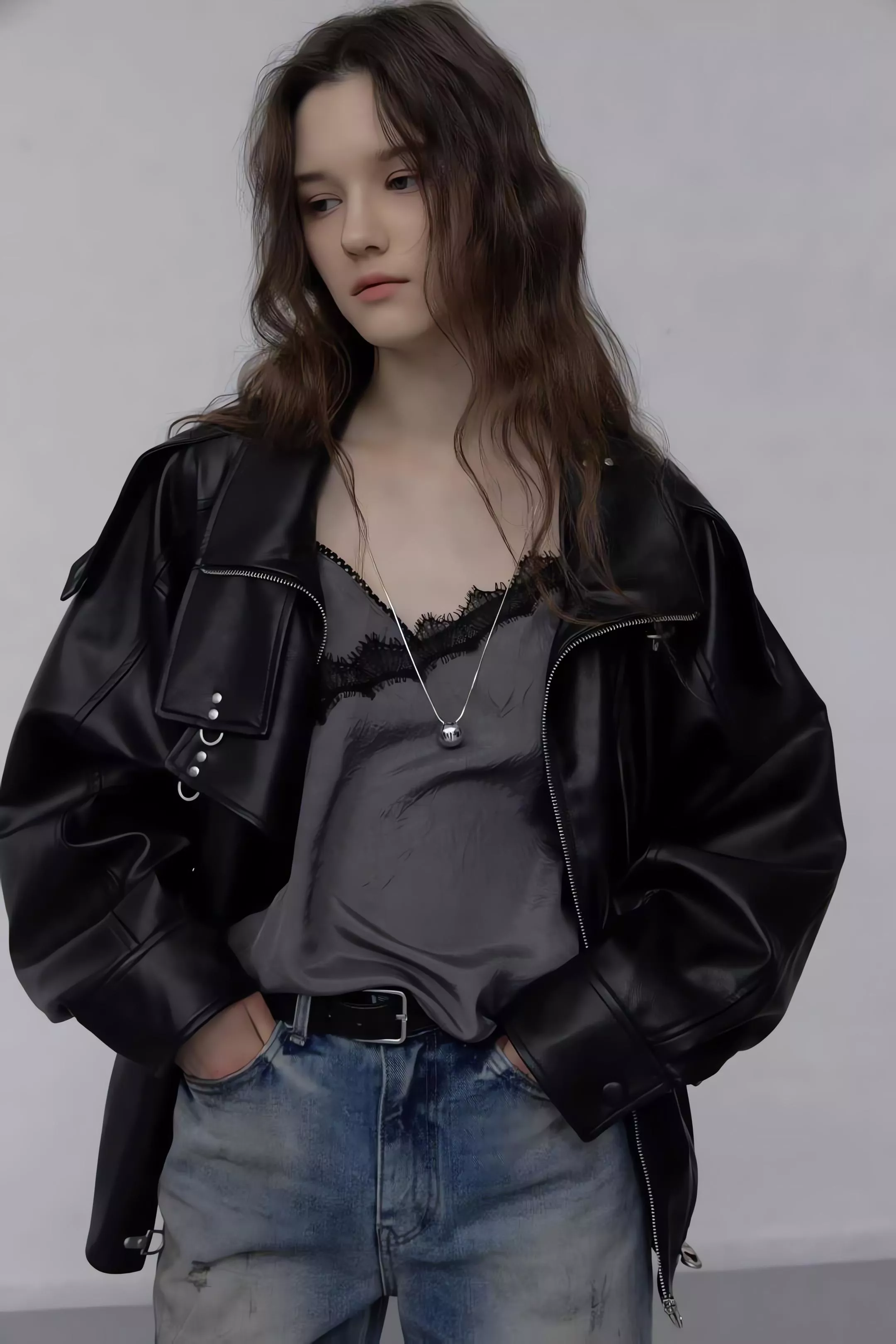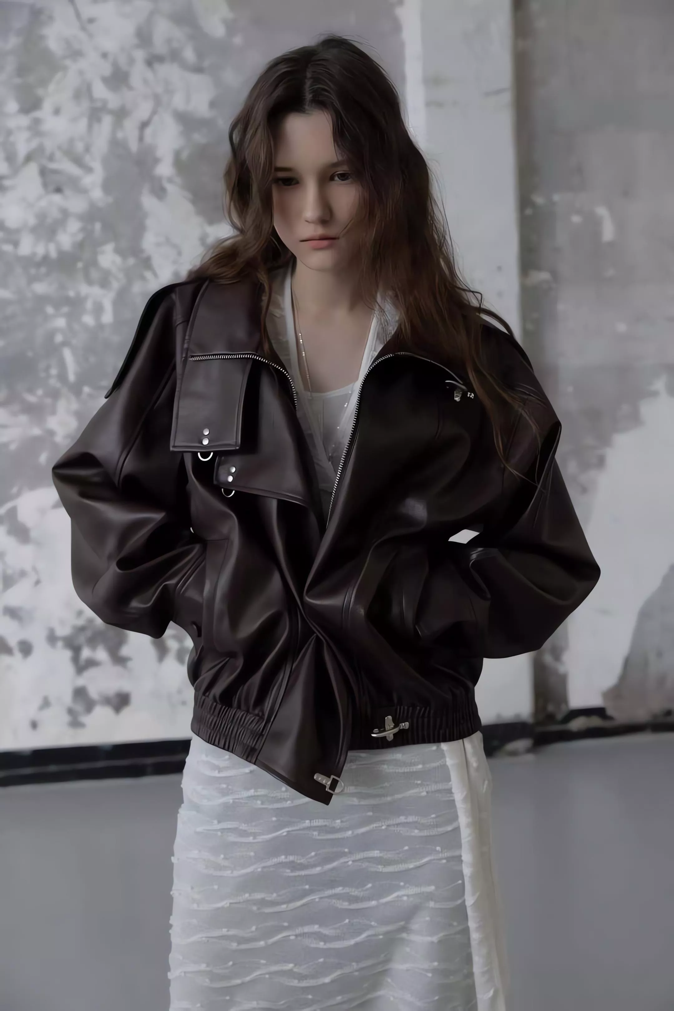 版型略寬鬆、長度偏短,不論搭洋裝或牛仔褲都很好看。胸前與下擺的金屬扣環,是整件外套很有記憶點的小細節。就算是很休閒的穿搭,套上這件外套,整體造型也會變得很俐落。
