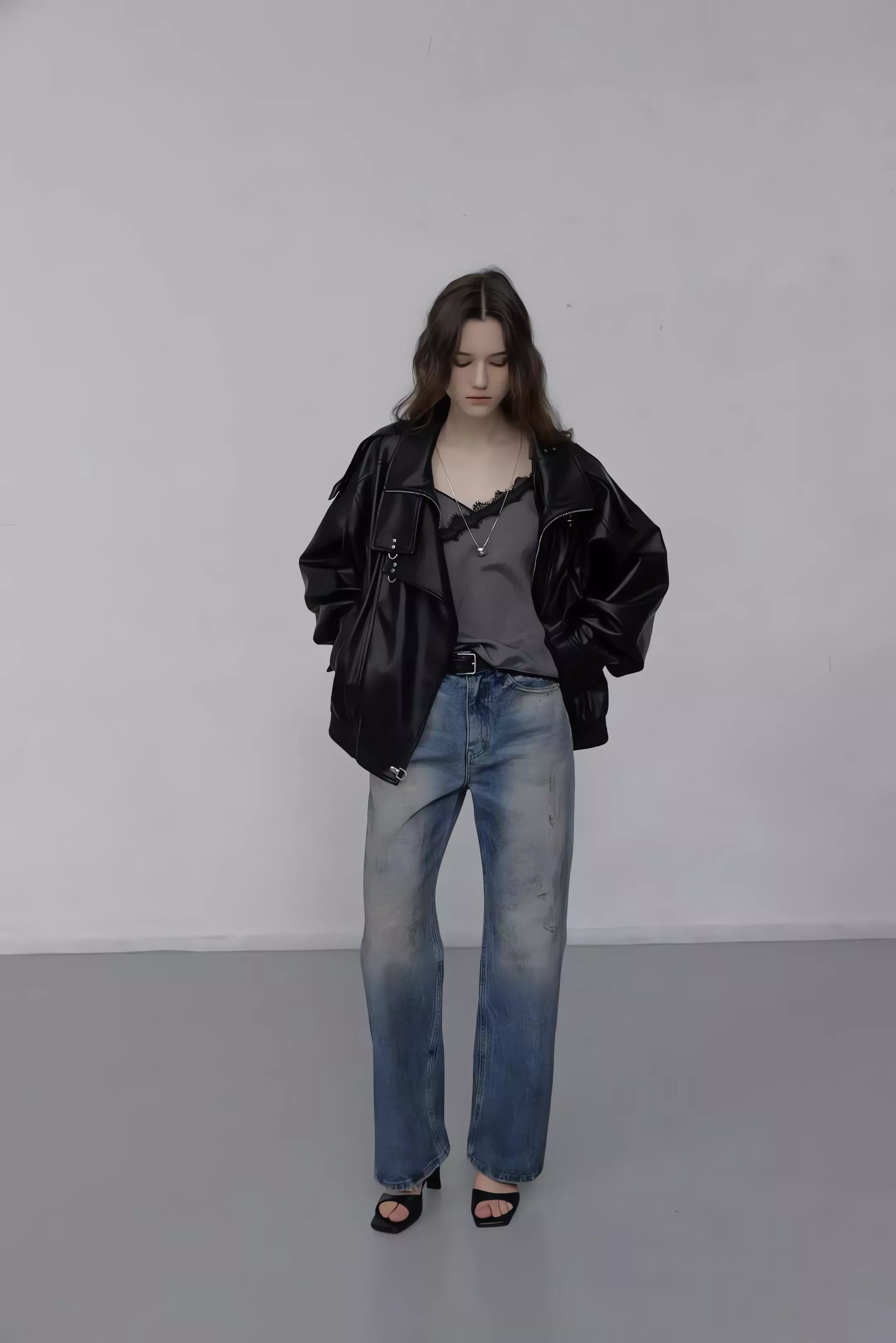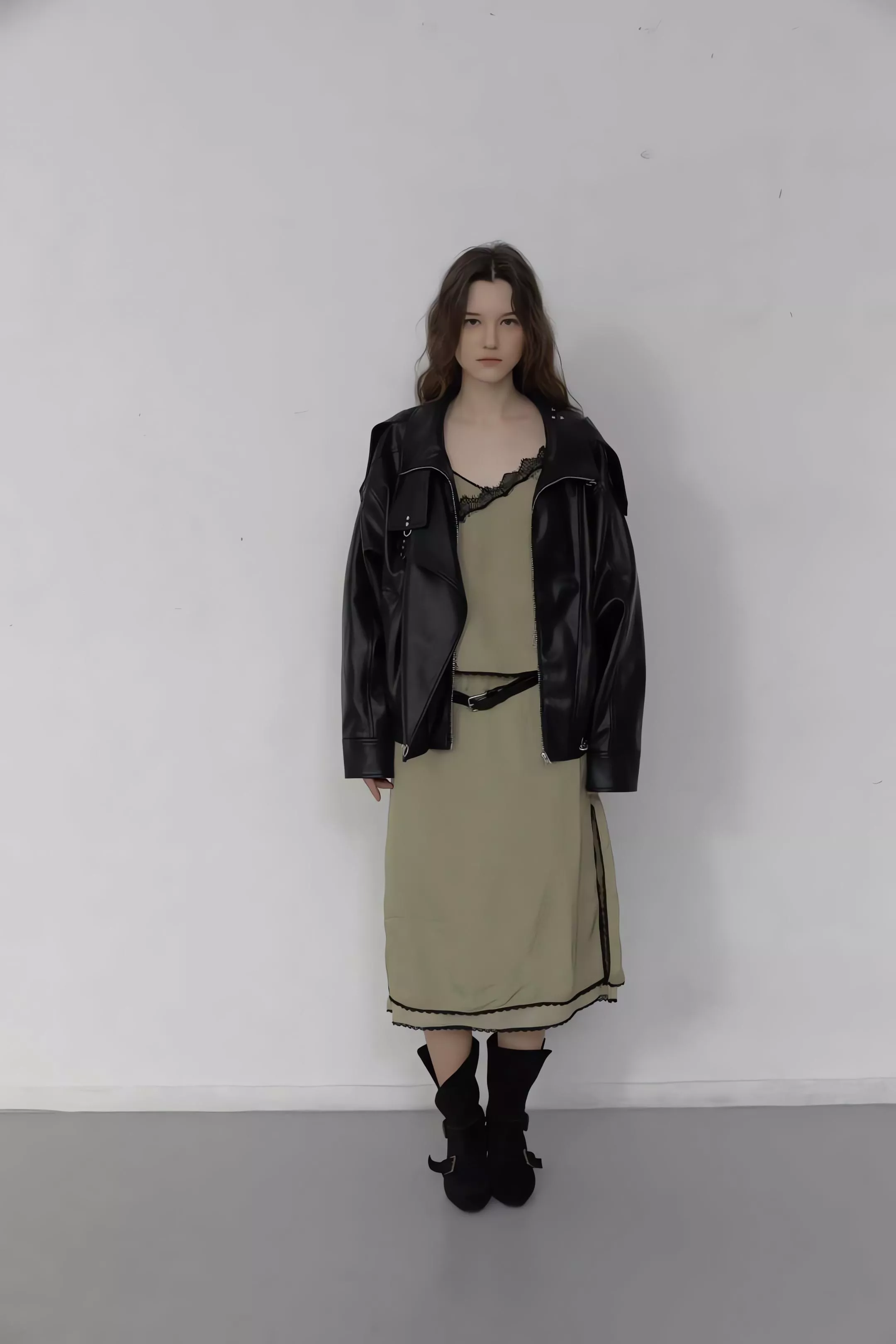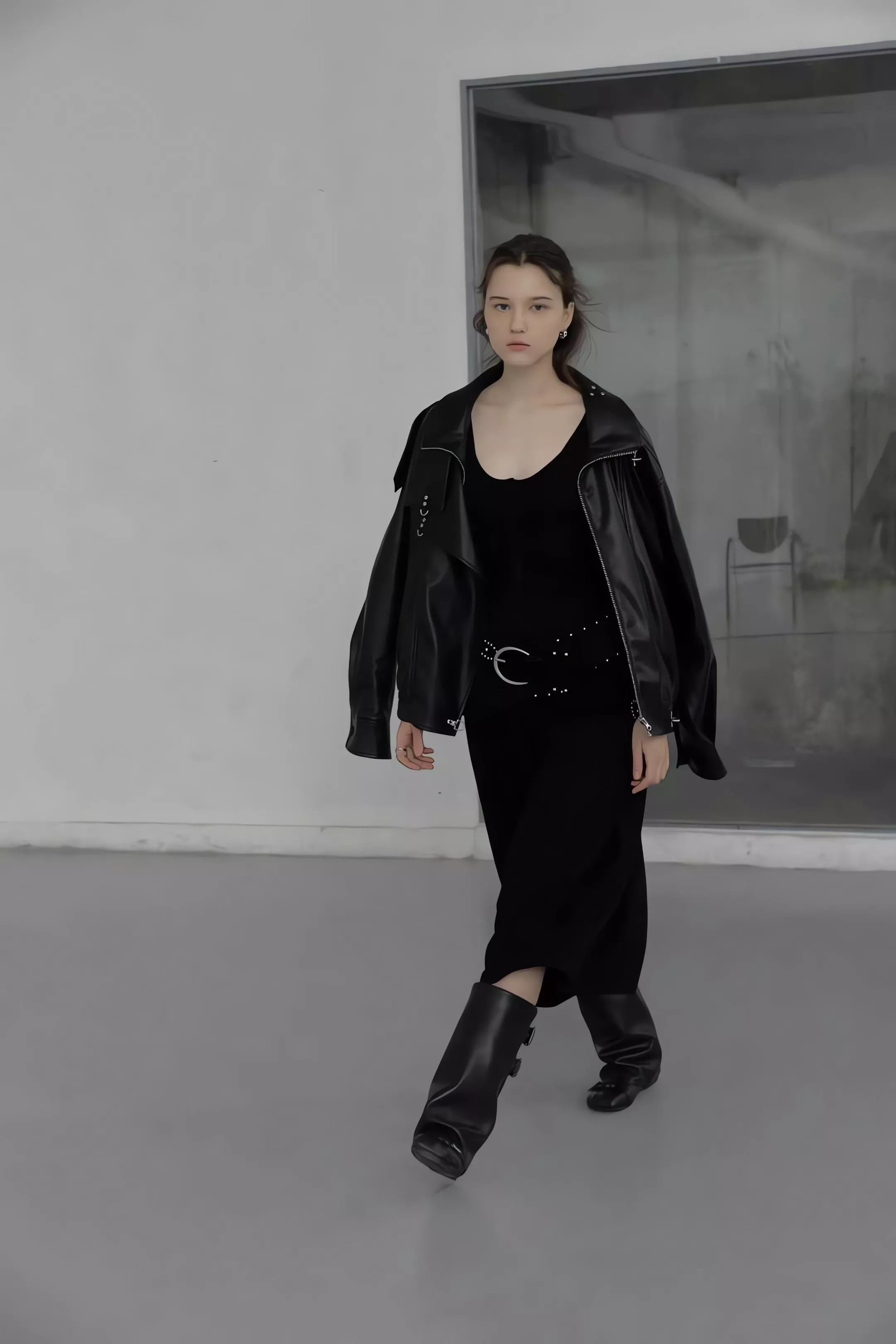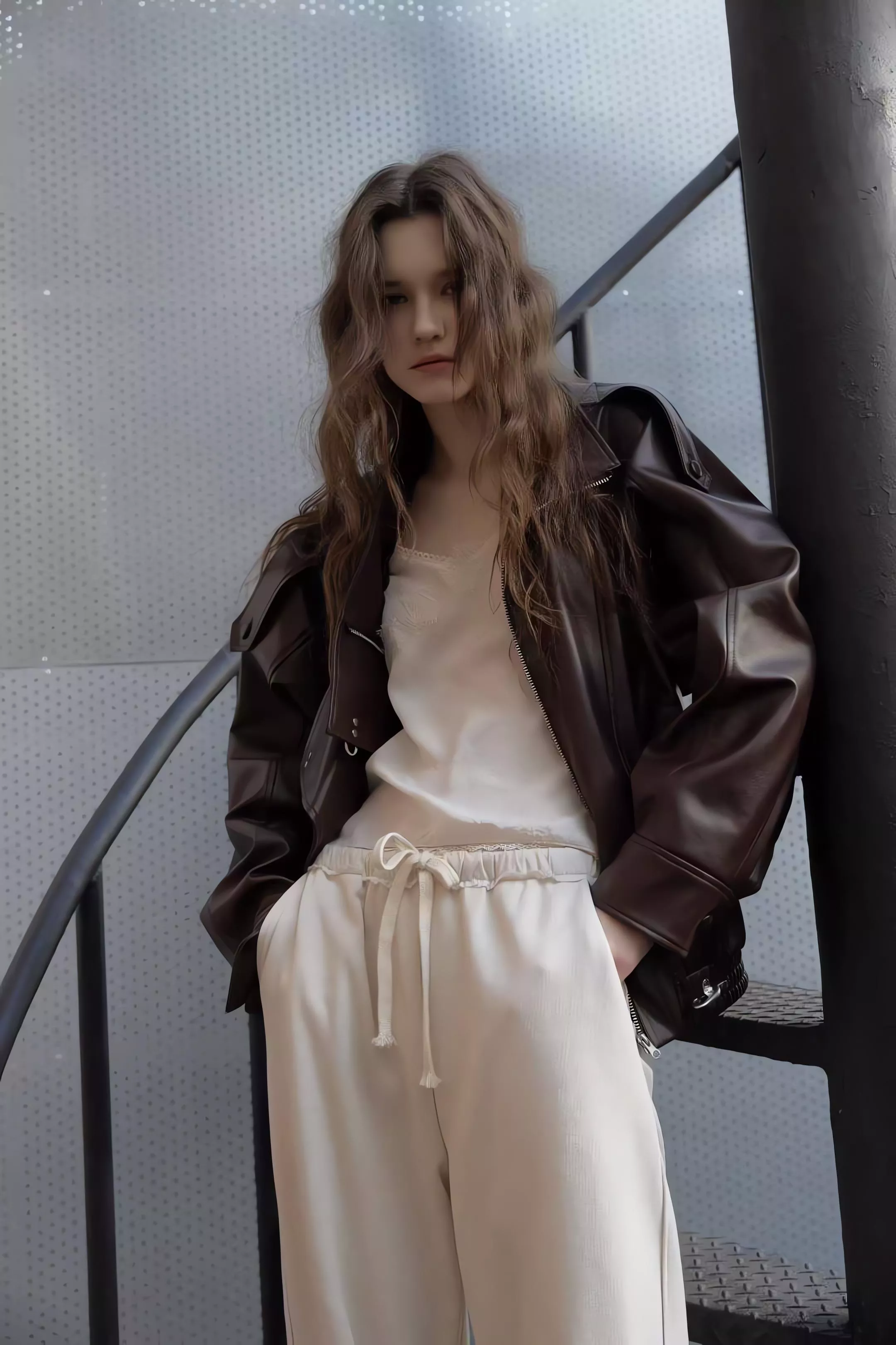 版型略寬鬆、長度偏短,不論搭洋裝或牛仔褲都很好看。胸前與下擺的金屬扣環,是整件外套很有記憶點的小細節。就算是很休閒的穿搭,套上這件外套,整體造型也會變得很俐落。