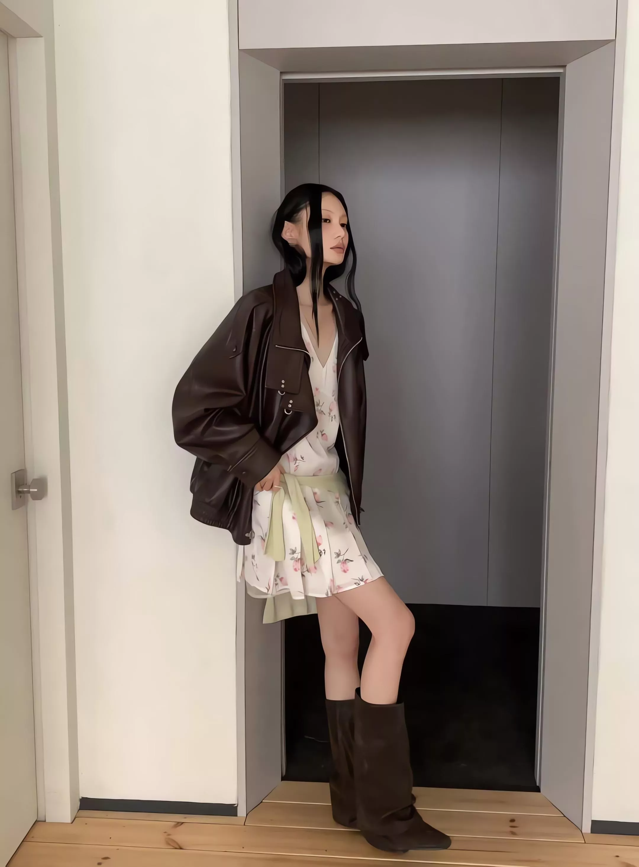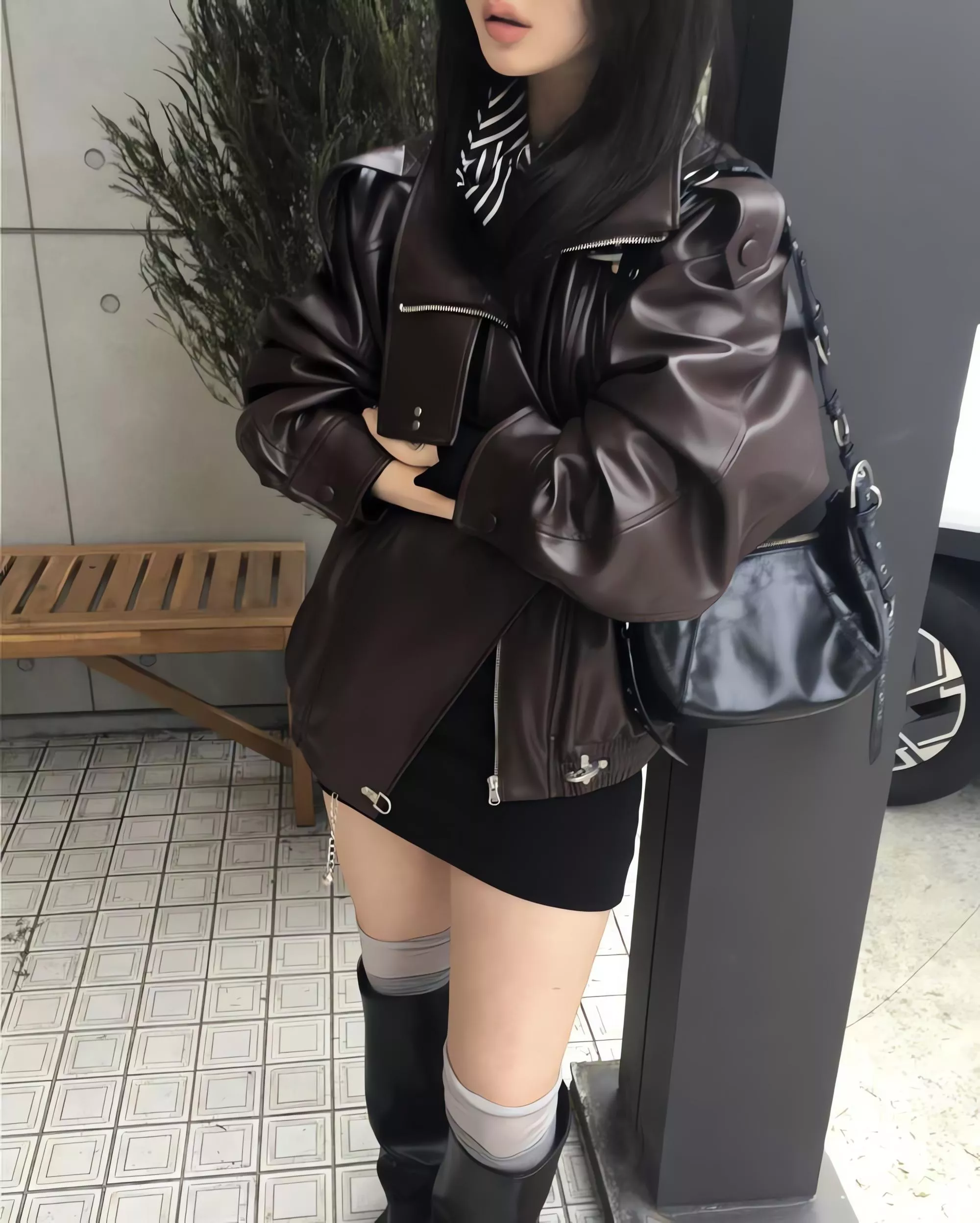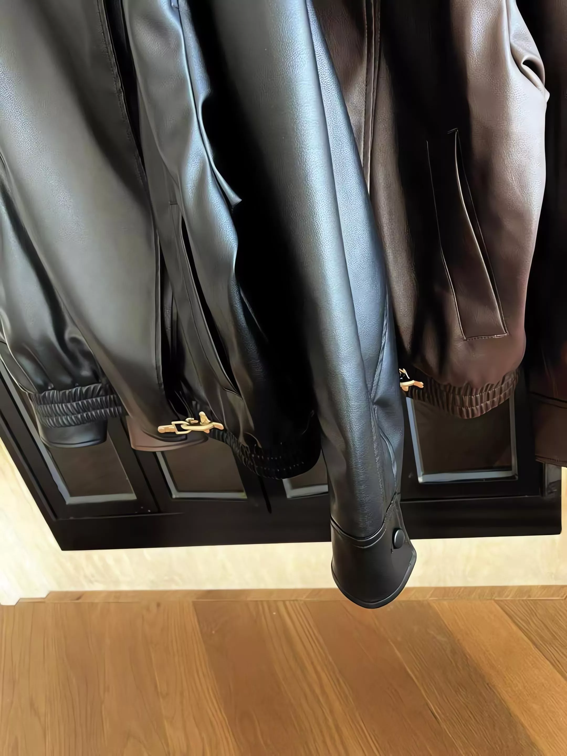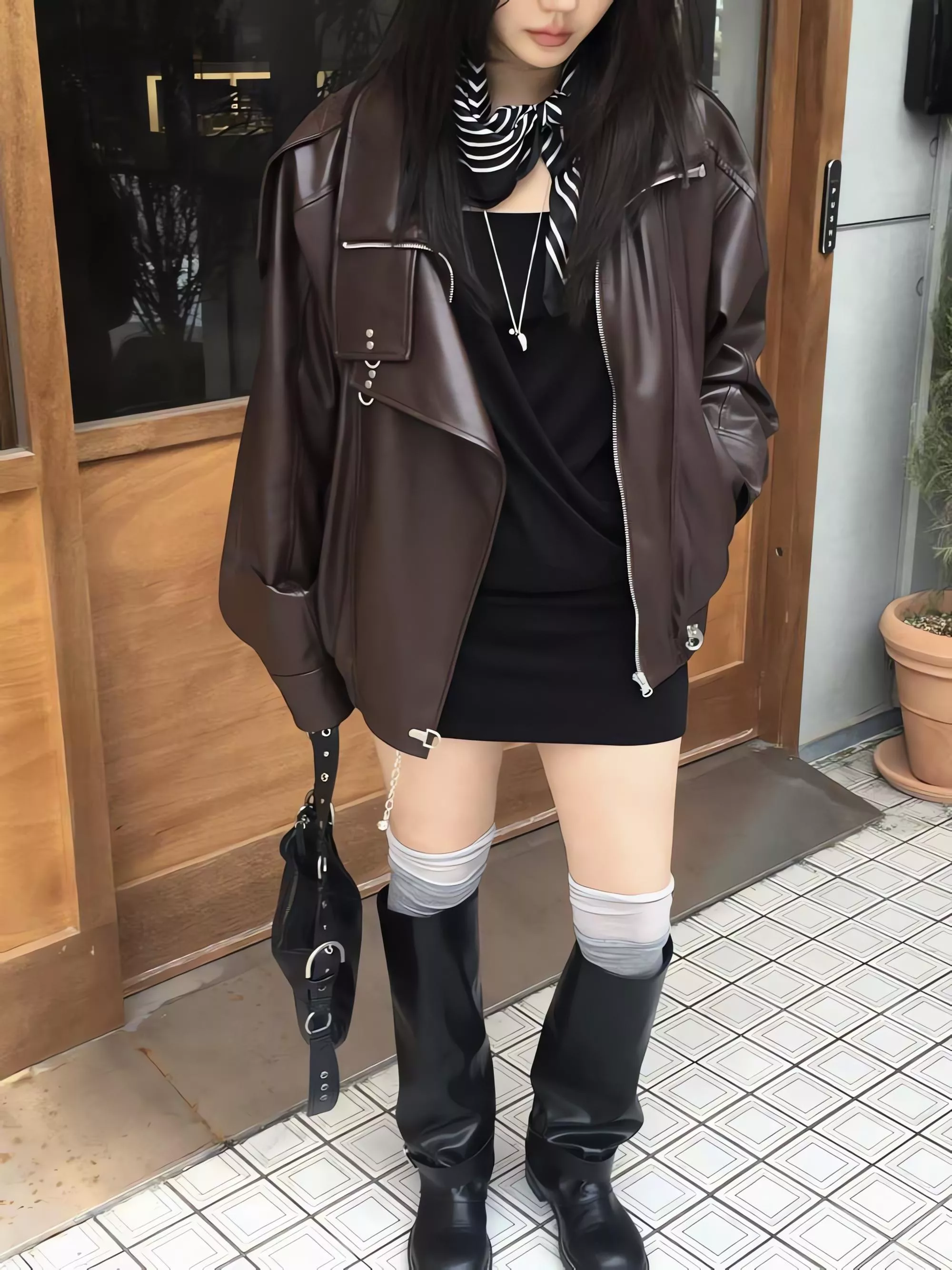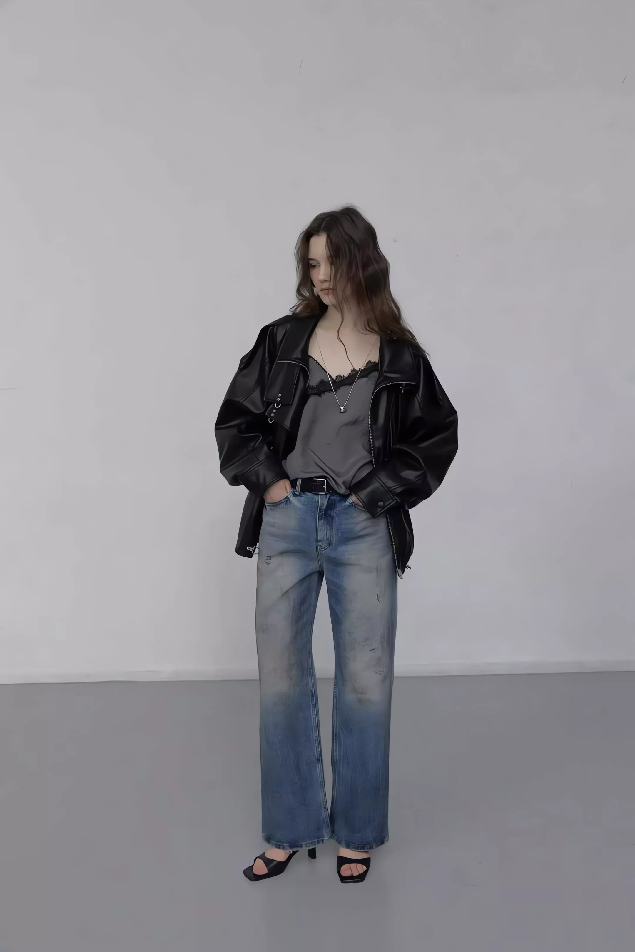 版型略寬鬆、長度偏短,不論搭洋裝或牛仔褲都很好看。胸前與下擺的金屬扣環,是整件外套很有記憶點的小細節。就算是很休閒的穿搭,套上這件外套,整體造型也會變得很俐落。