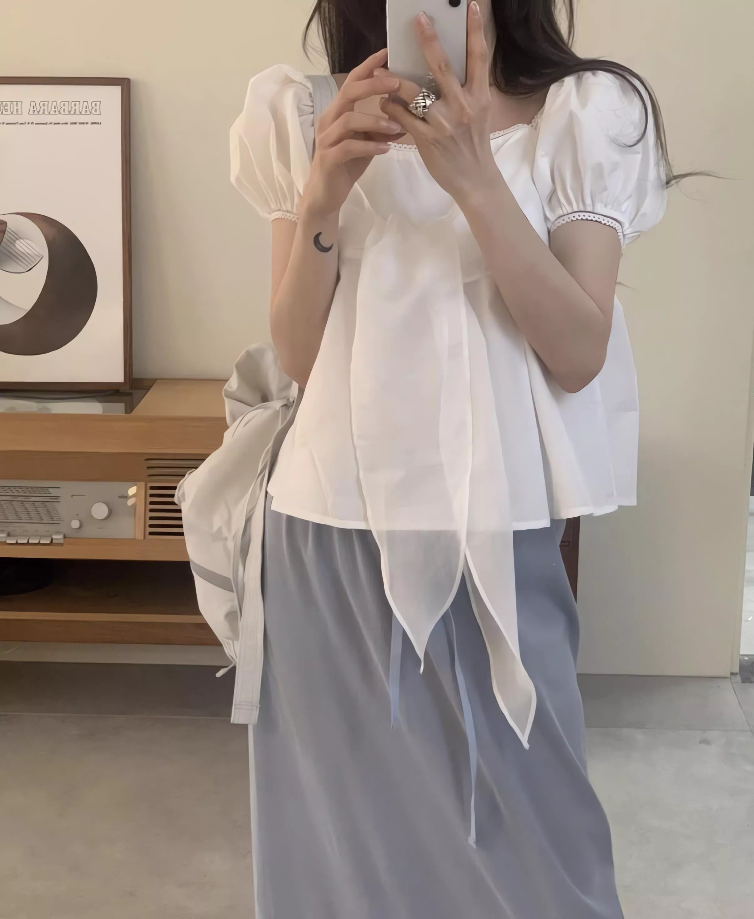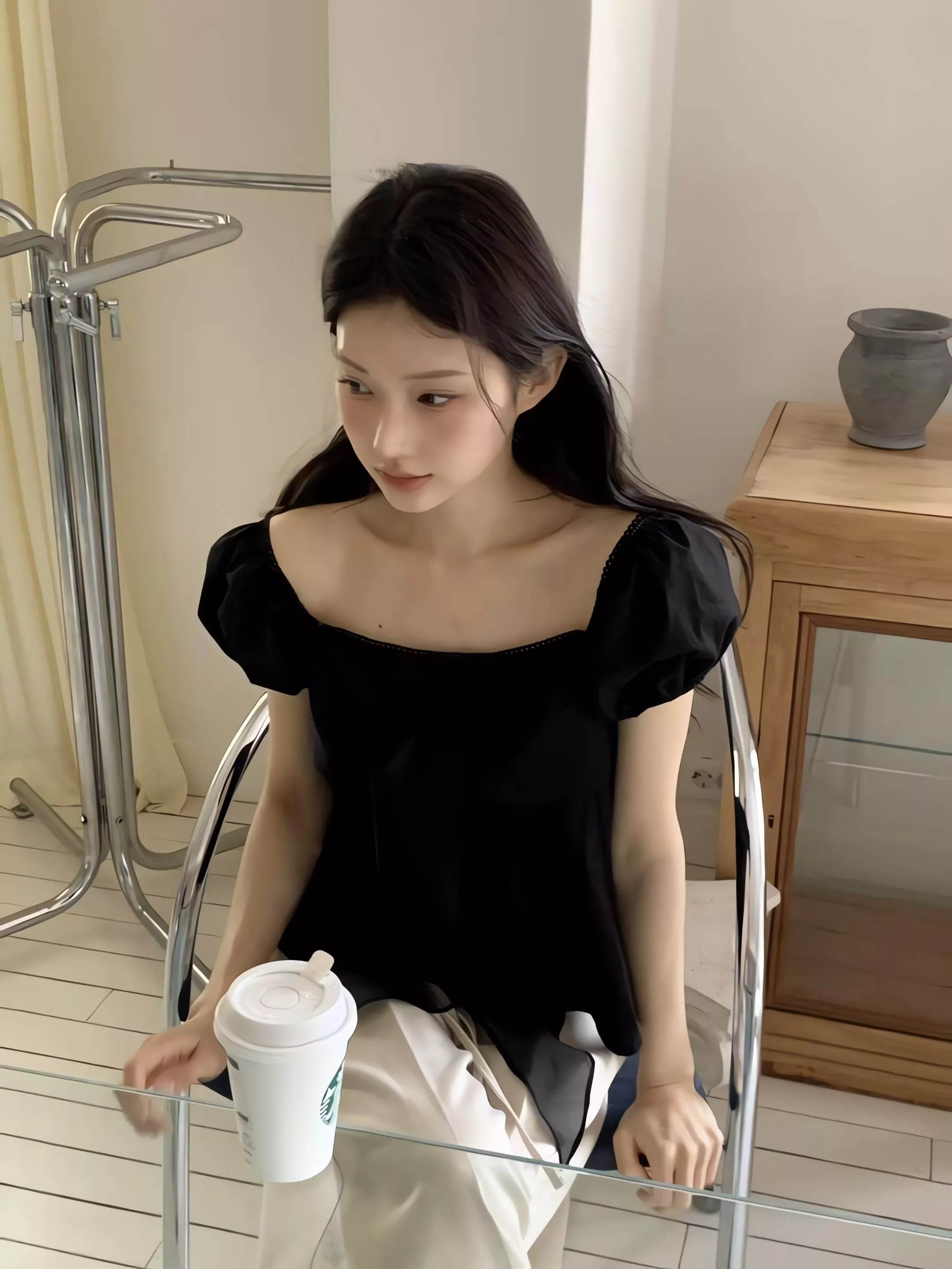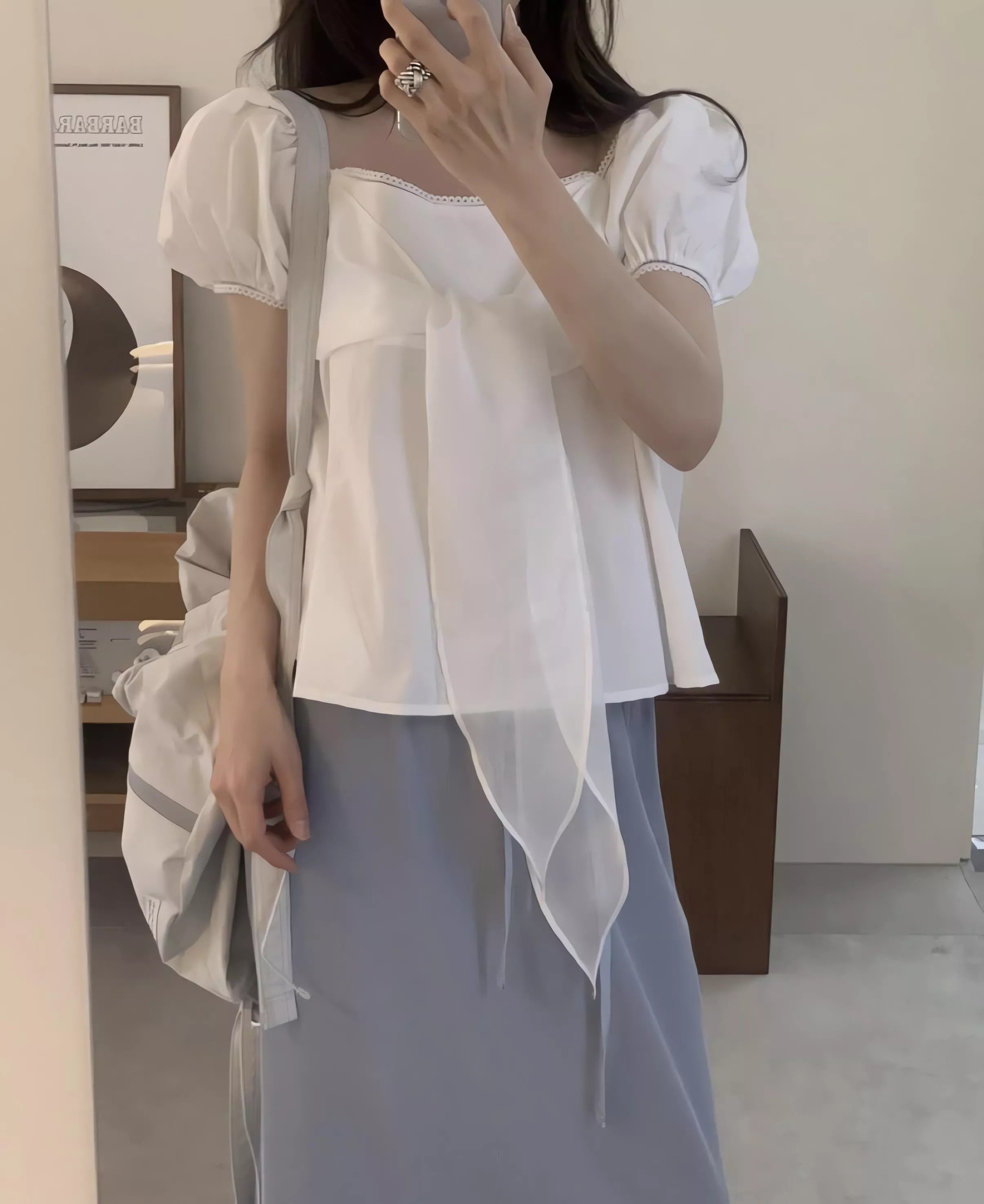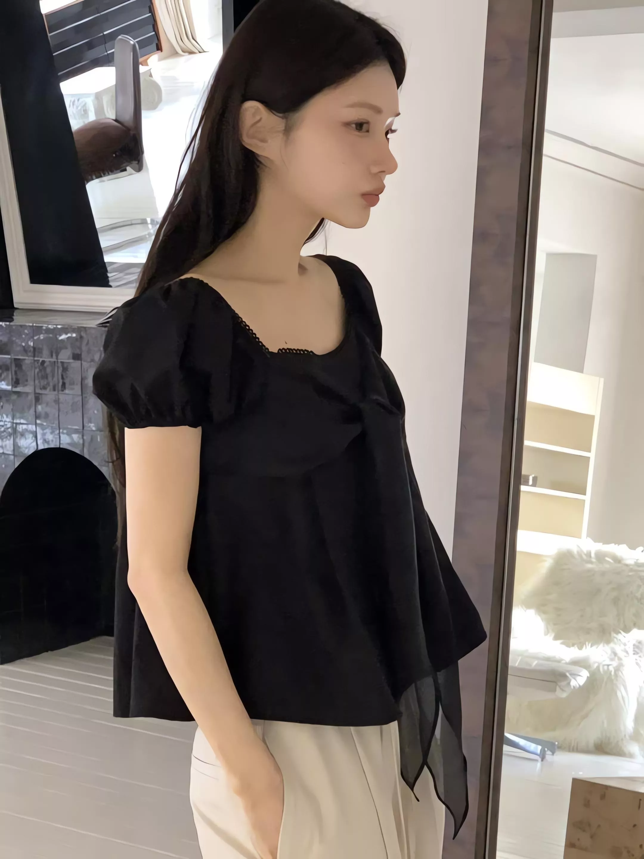 方領剪裁把鎖骨線條自然帶出來,視覺乾淨,也讓整體多了一點輕柔的女人味。領口可以正常穿,也可以微微往下拉成露肩造型,依照當天的狀態去調整,氛圍會完全不一樣。