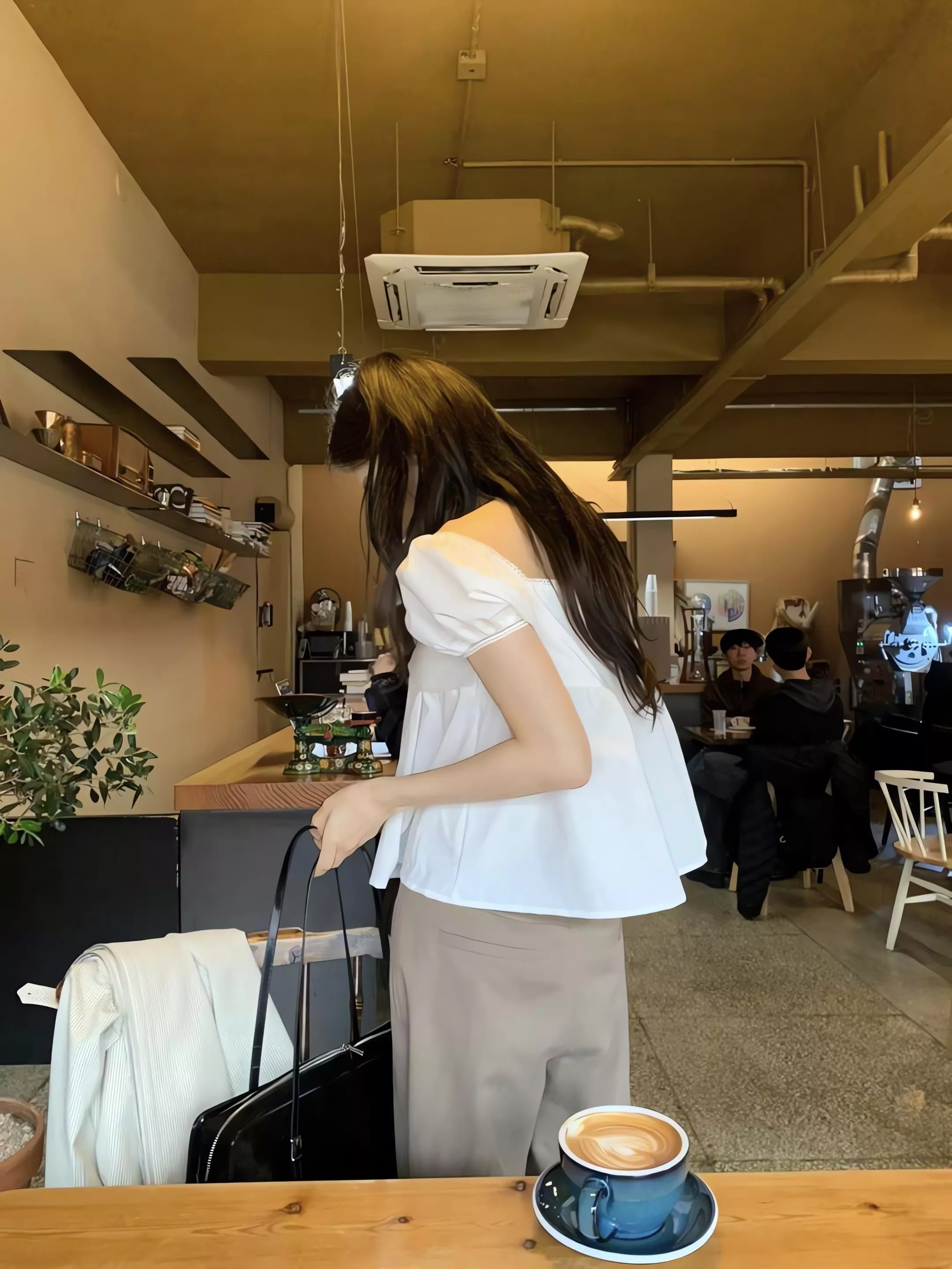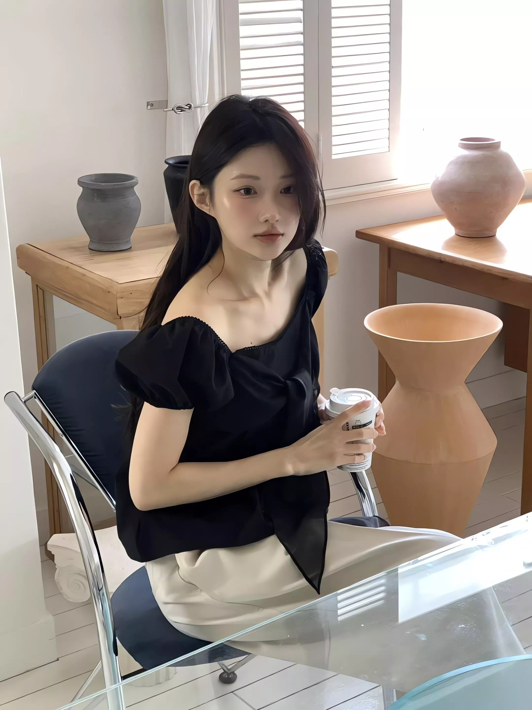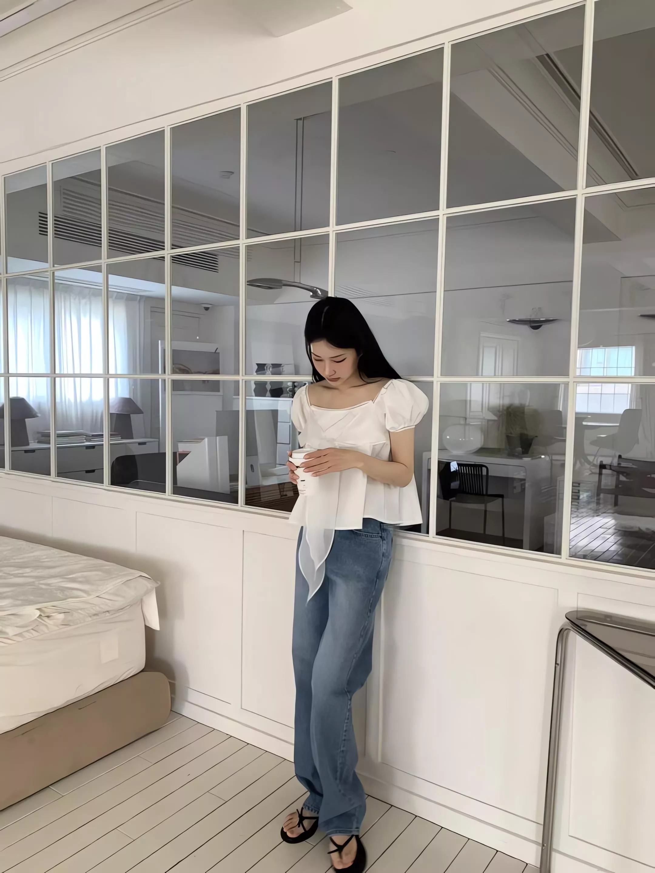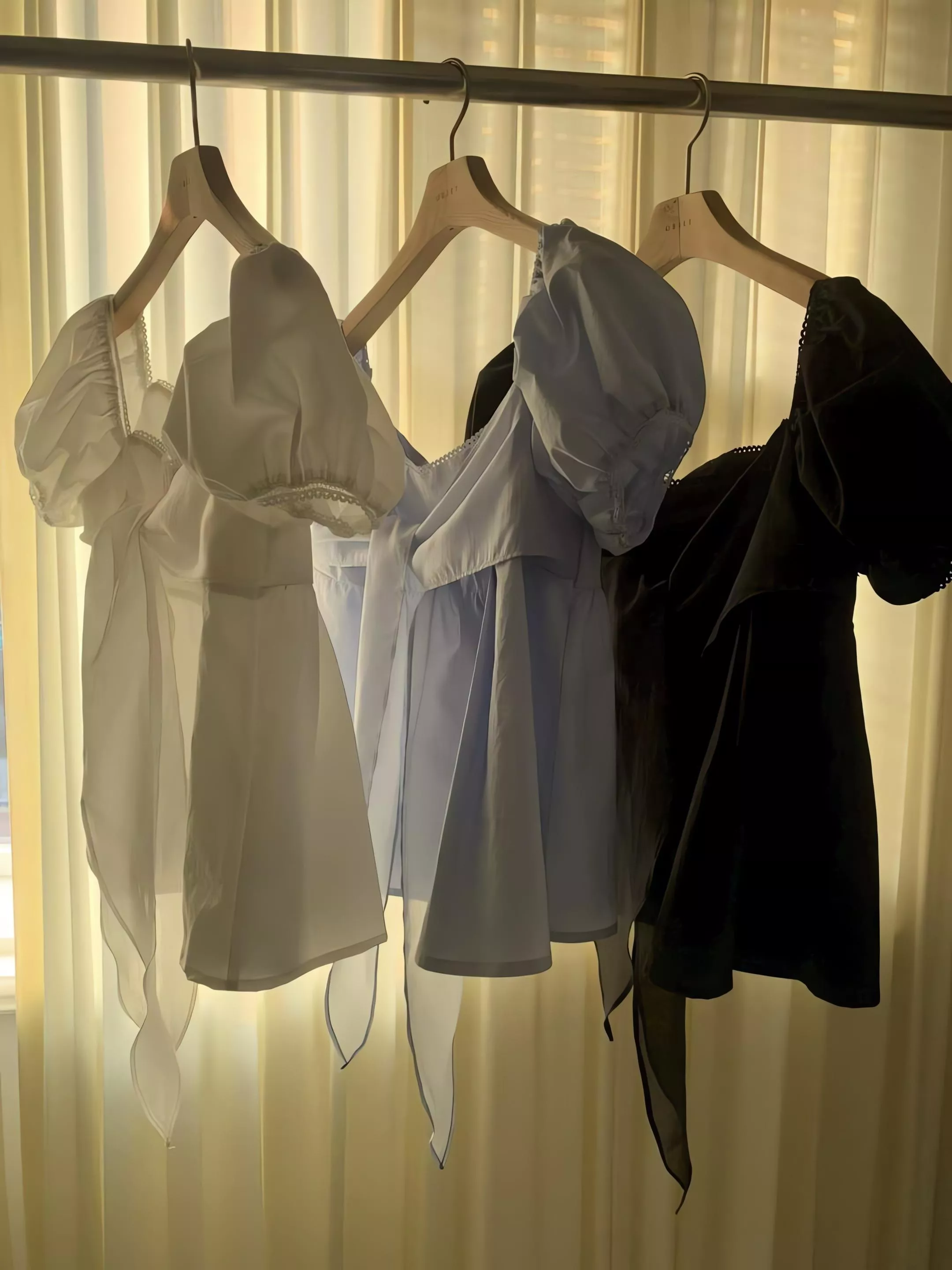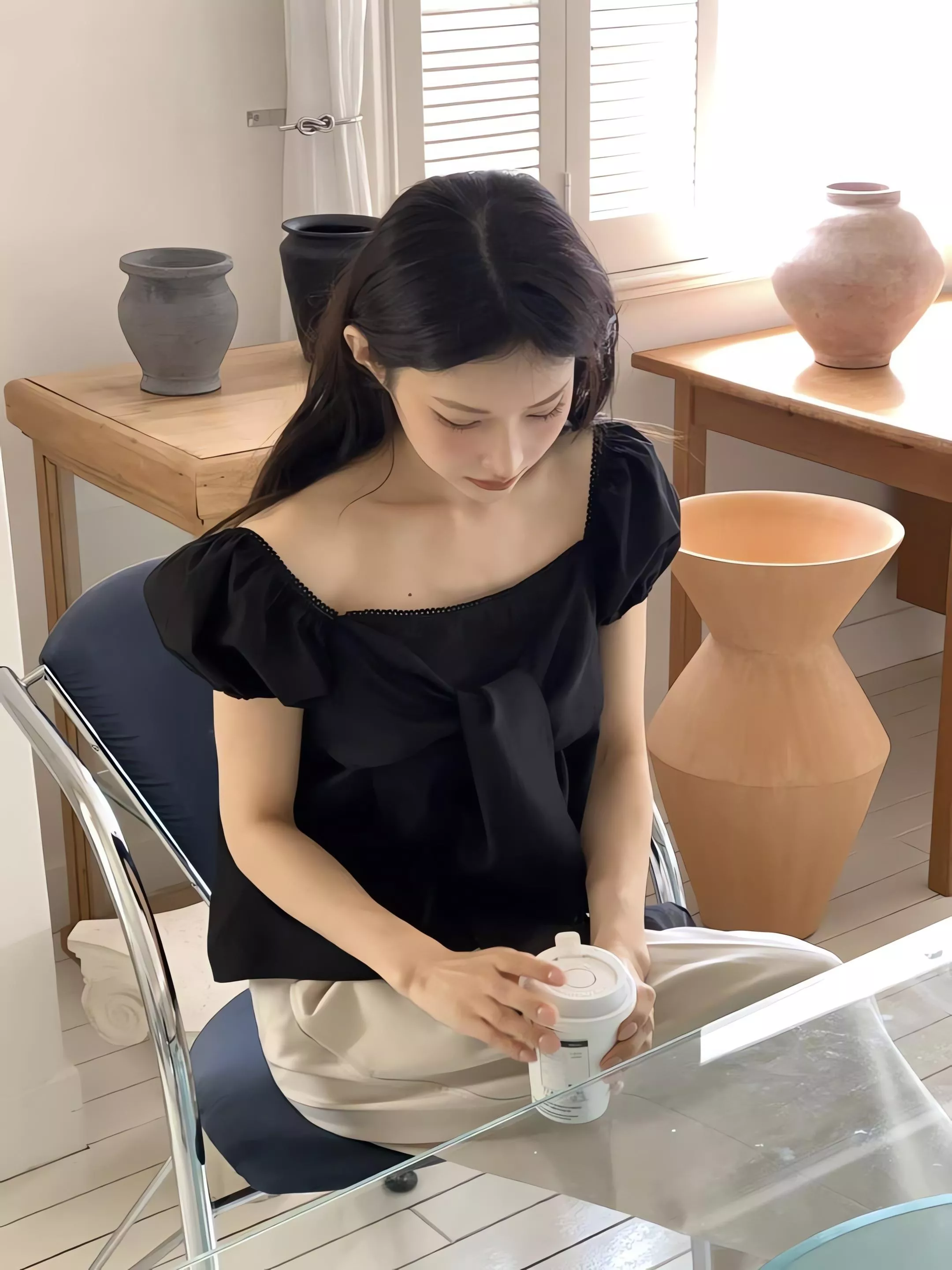 方領剪裁把鎖骨線條自然帶出來,視覺乾淨,也讓整體多了一點輕柔的女人味。領口可以正常穿,也可以微微往下拉成露肩造型,依照當天的狀態去調整,氛圍會完全不一樣。