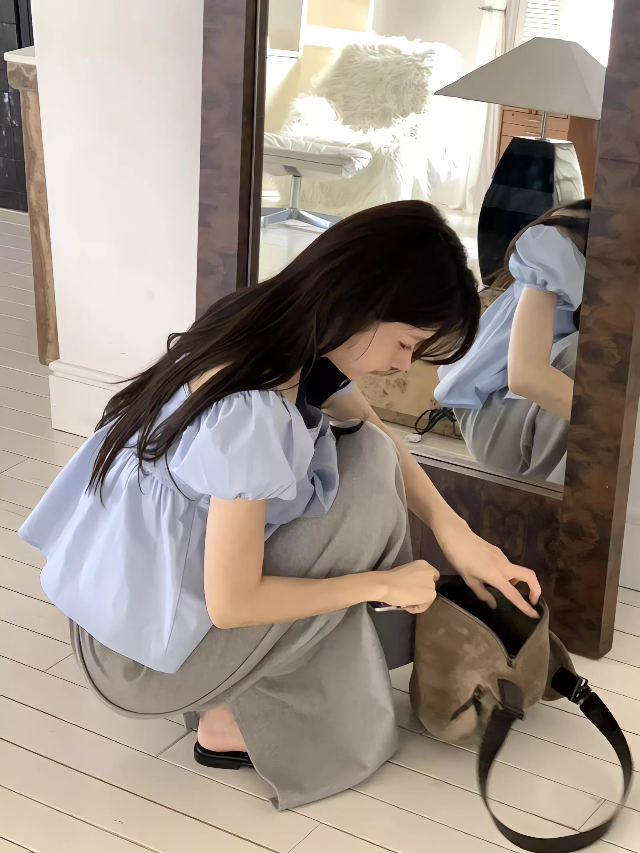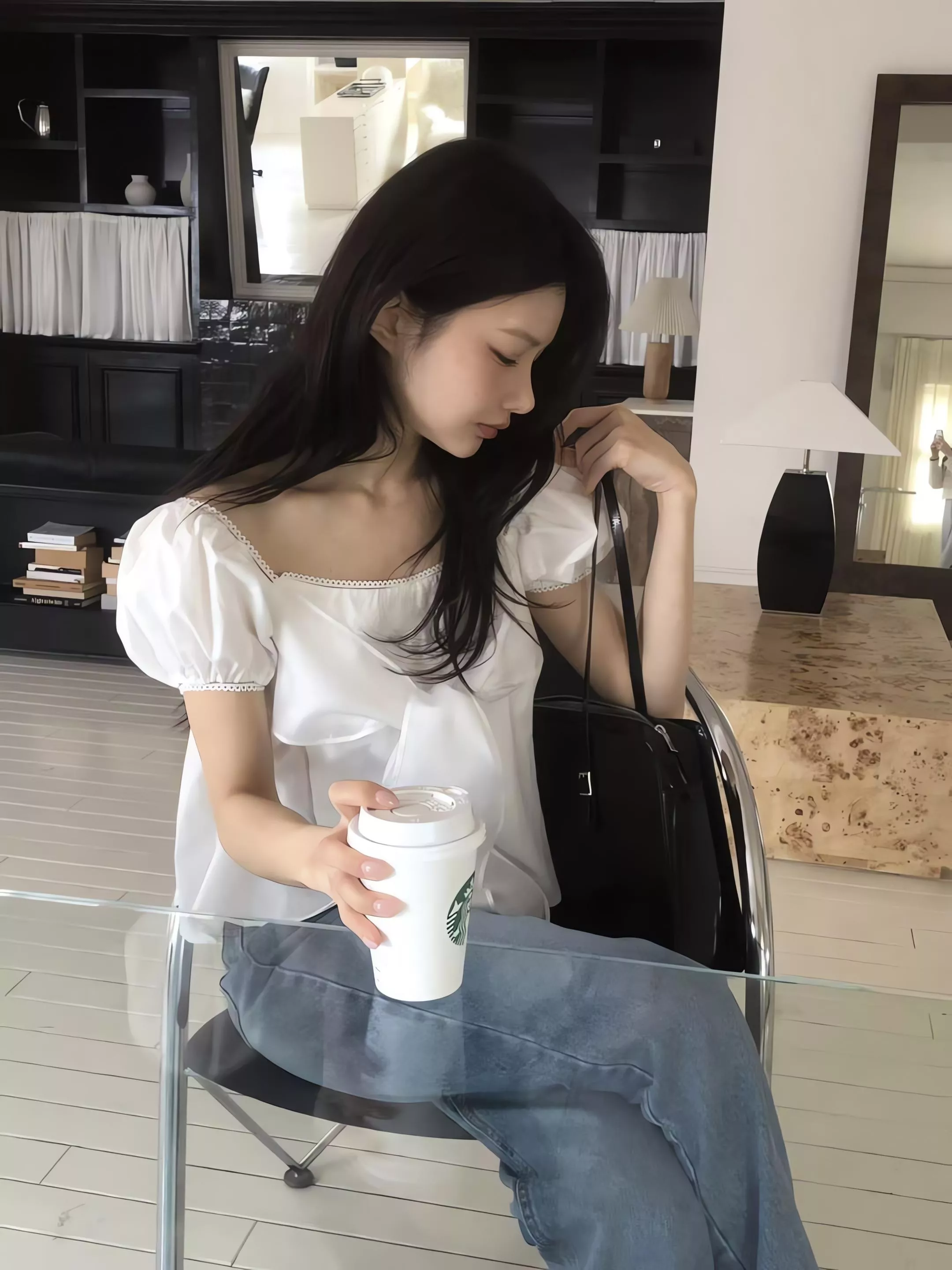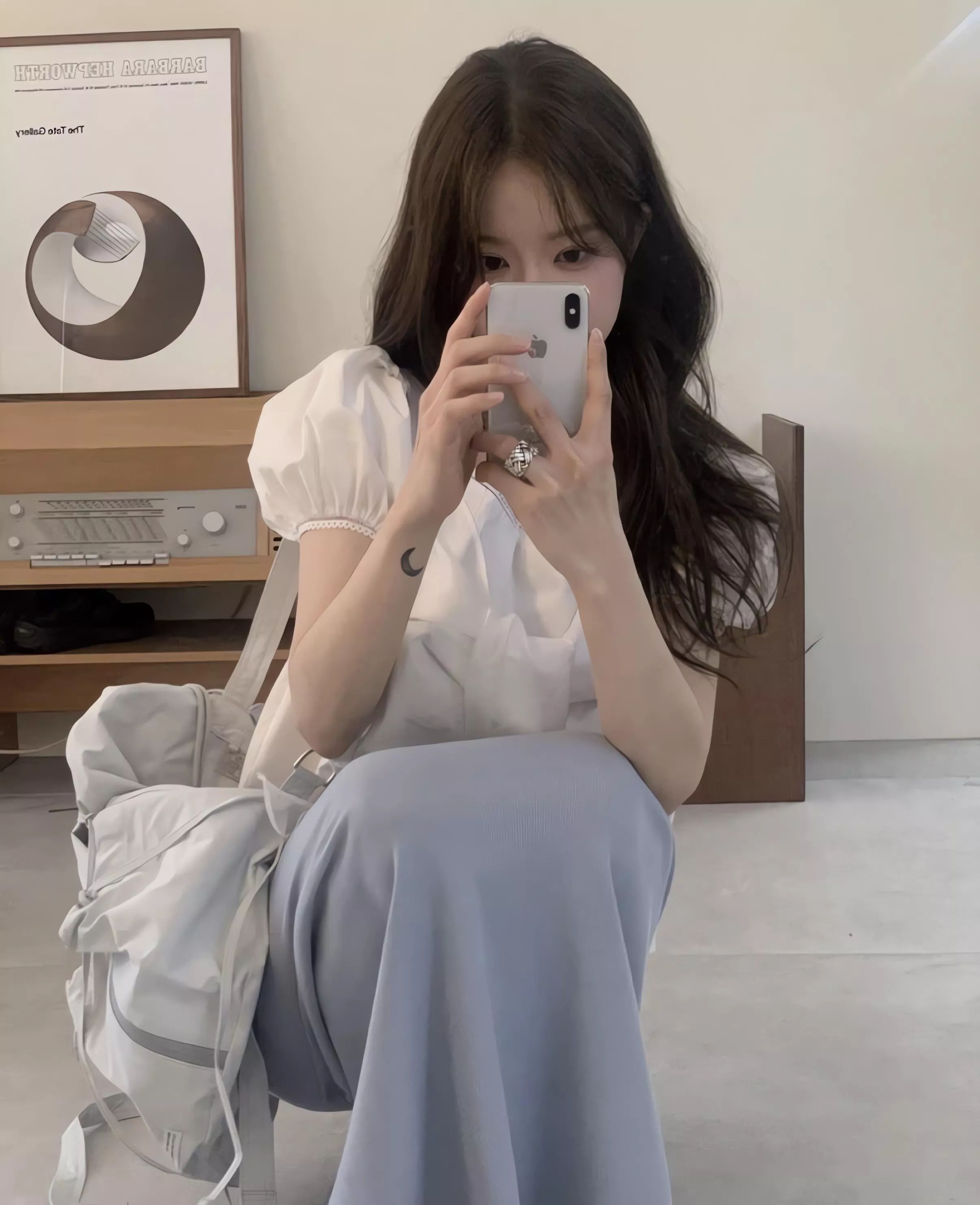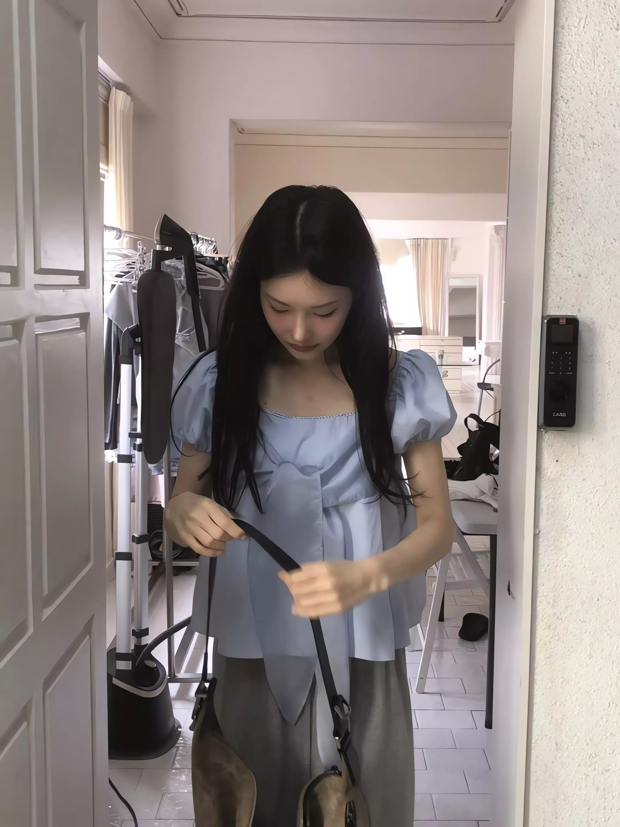 方領剪裁把鎖骨線條自然帶出來,視覺乾淨,也讓整體多了一點輕柔的女人味。領口可以正常穿,也可以微微往下拉成露肩造型,依照當天的狀態去調整,氛圍會完全不一樣。