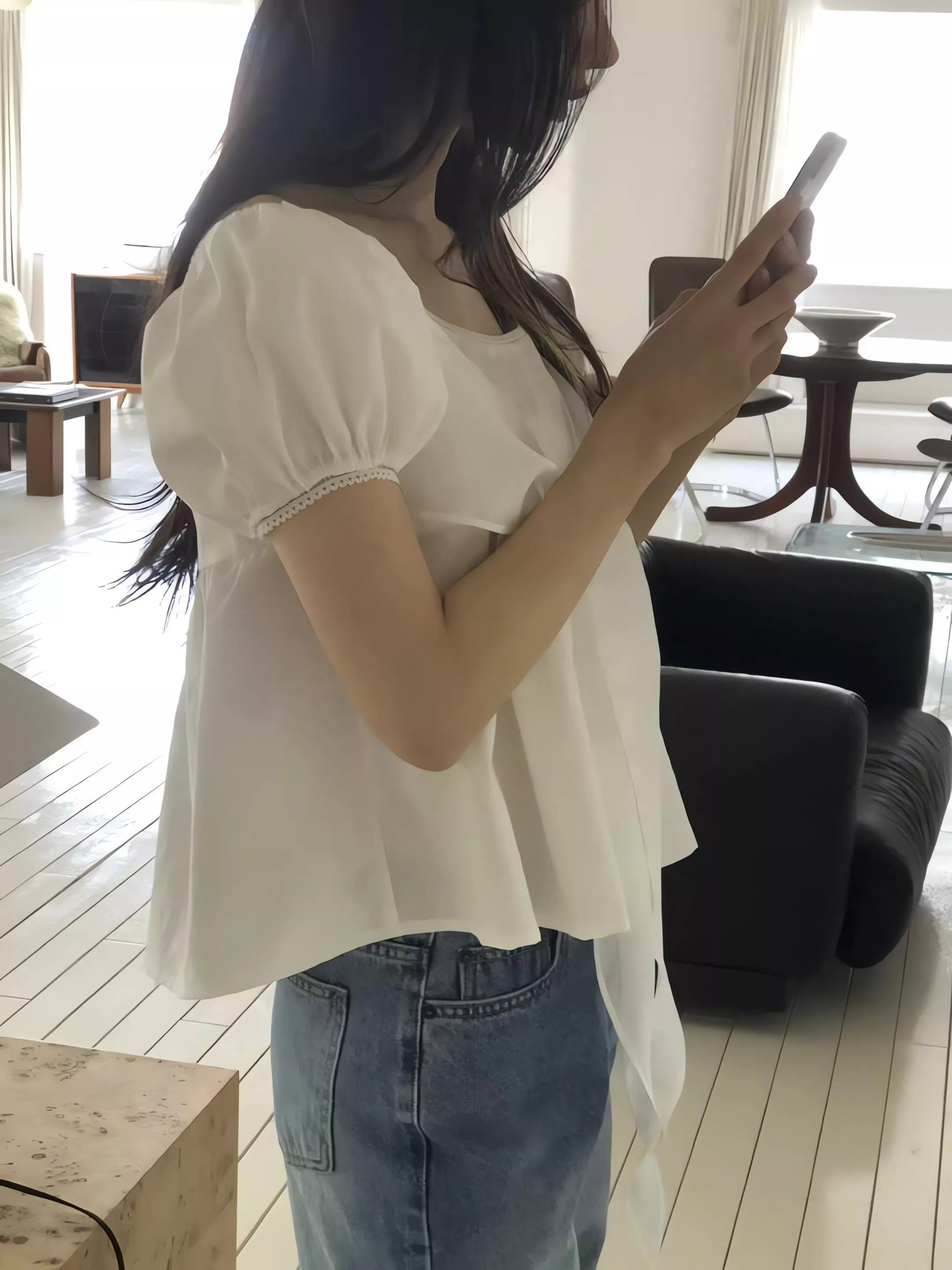 袖子做了帶份量的泡泡袖,但控制在不誇張的比例,側面看會有一點立體感,卻不會讓上半身顯得厚重。