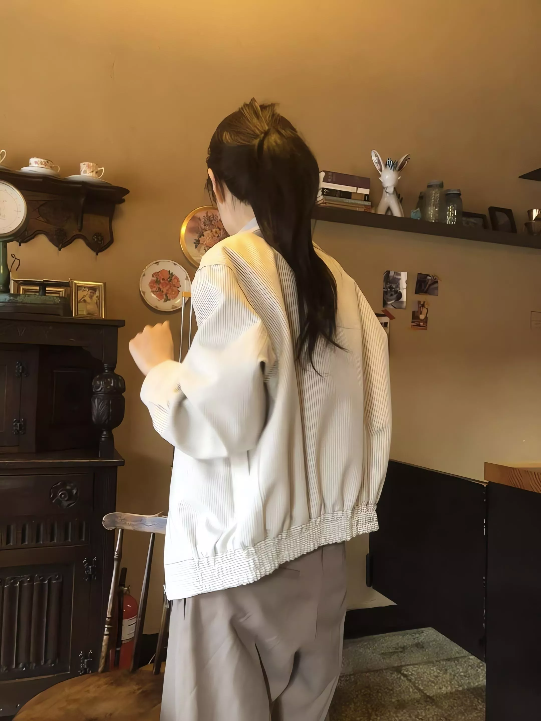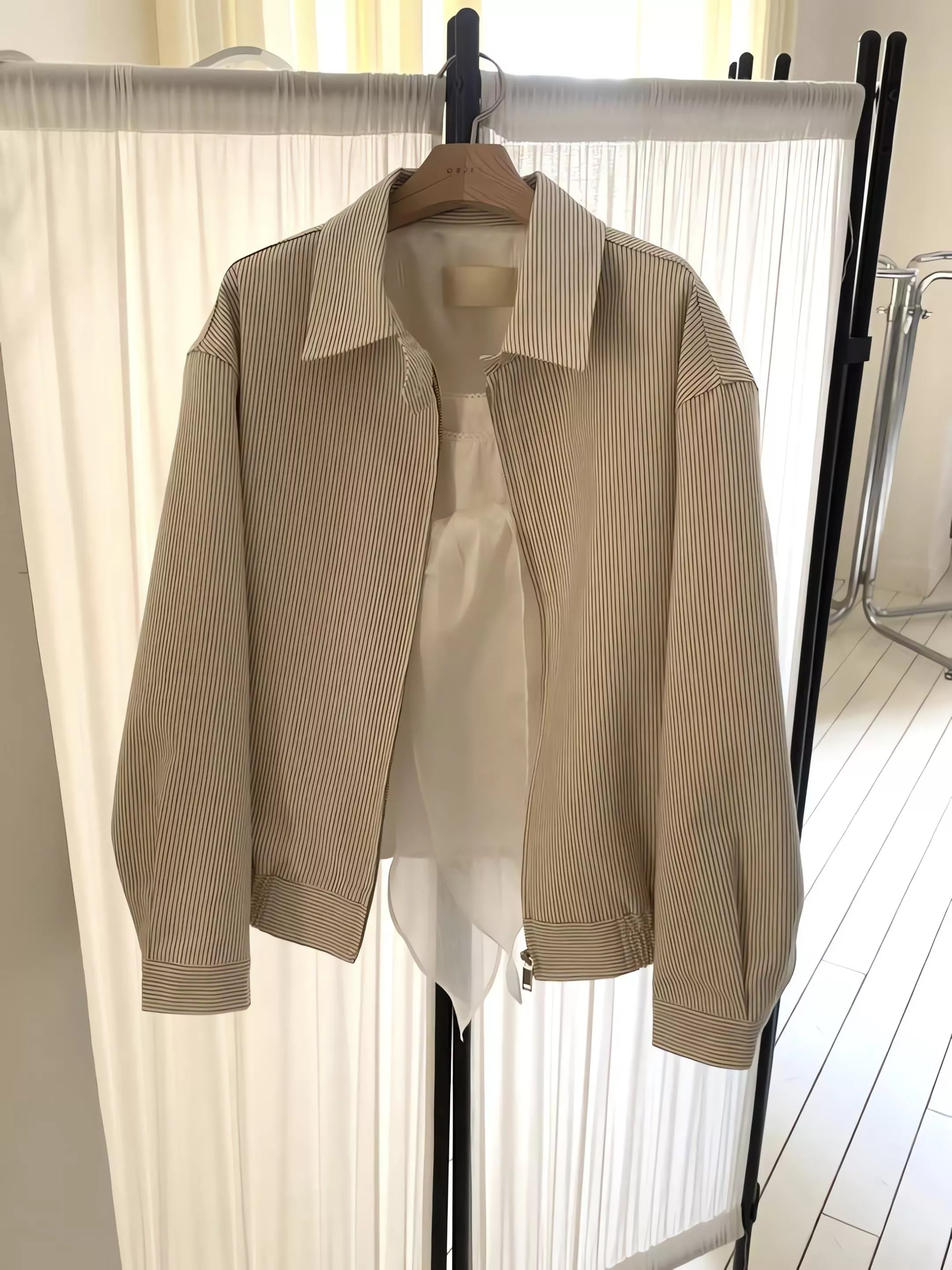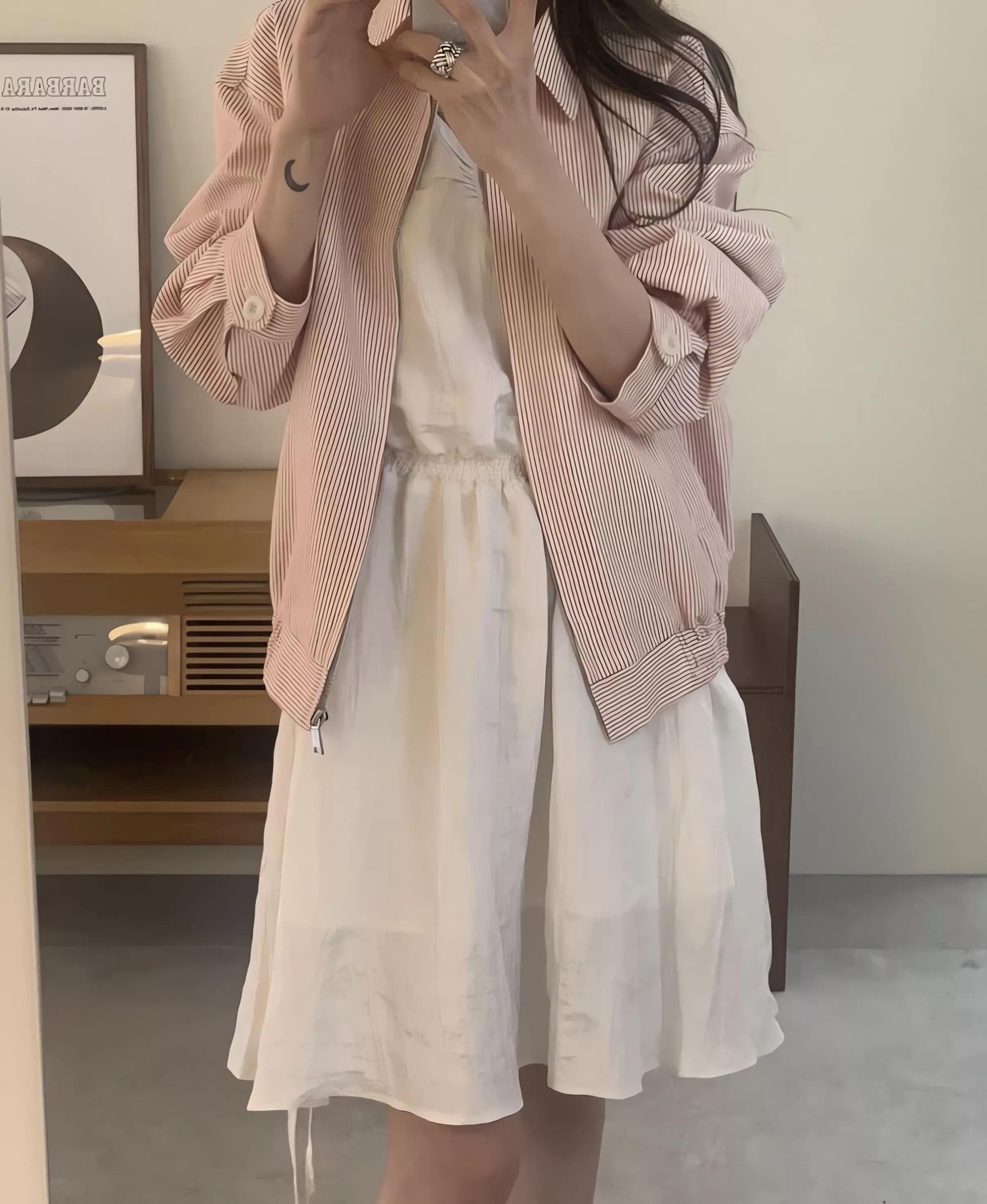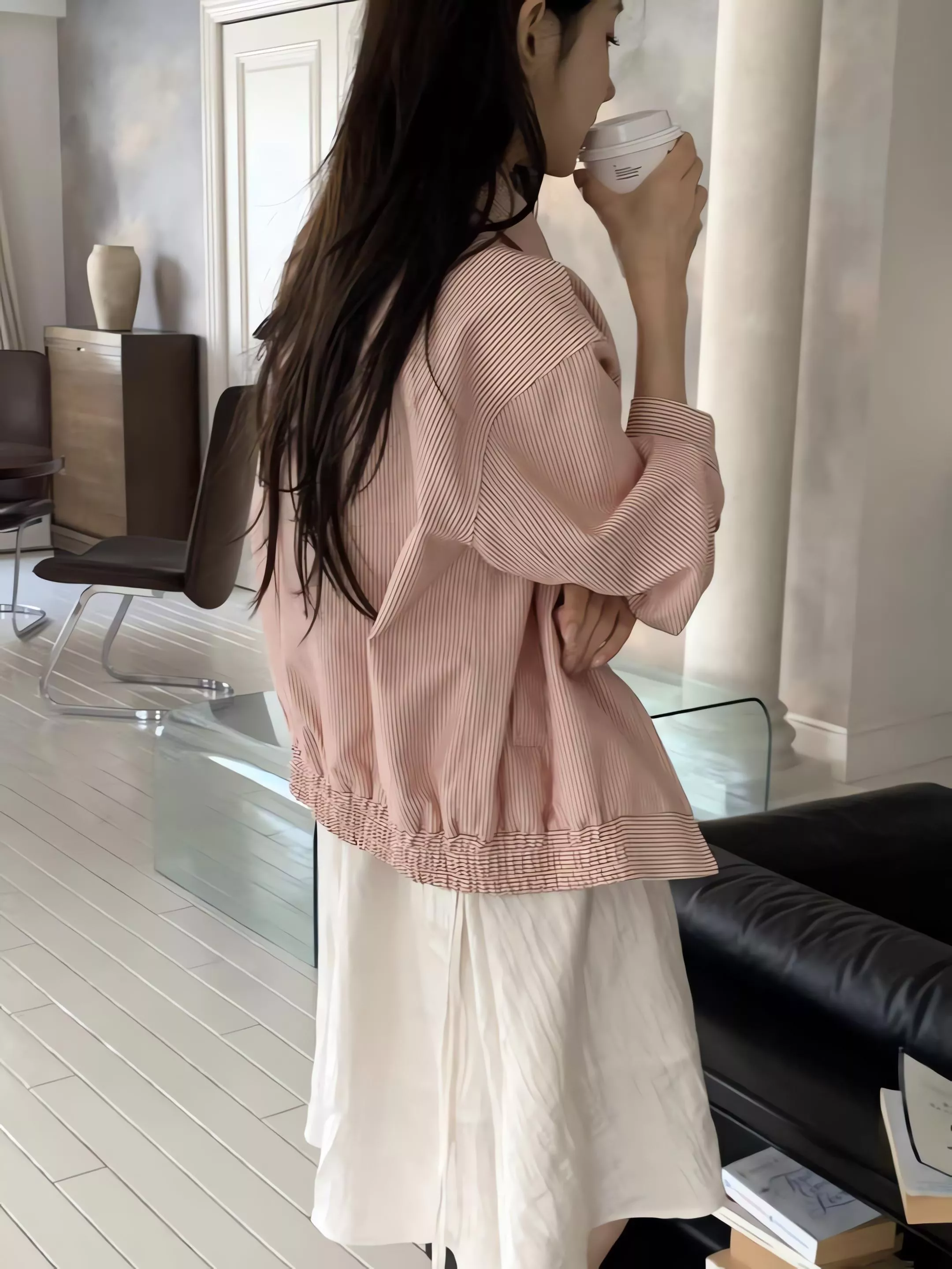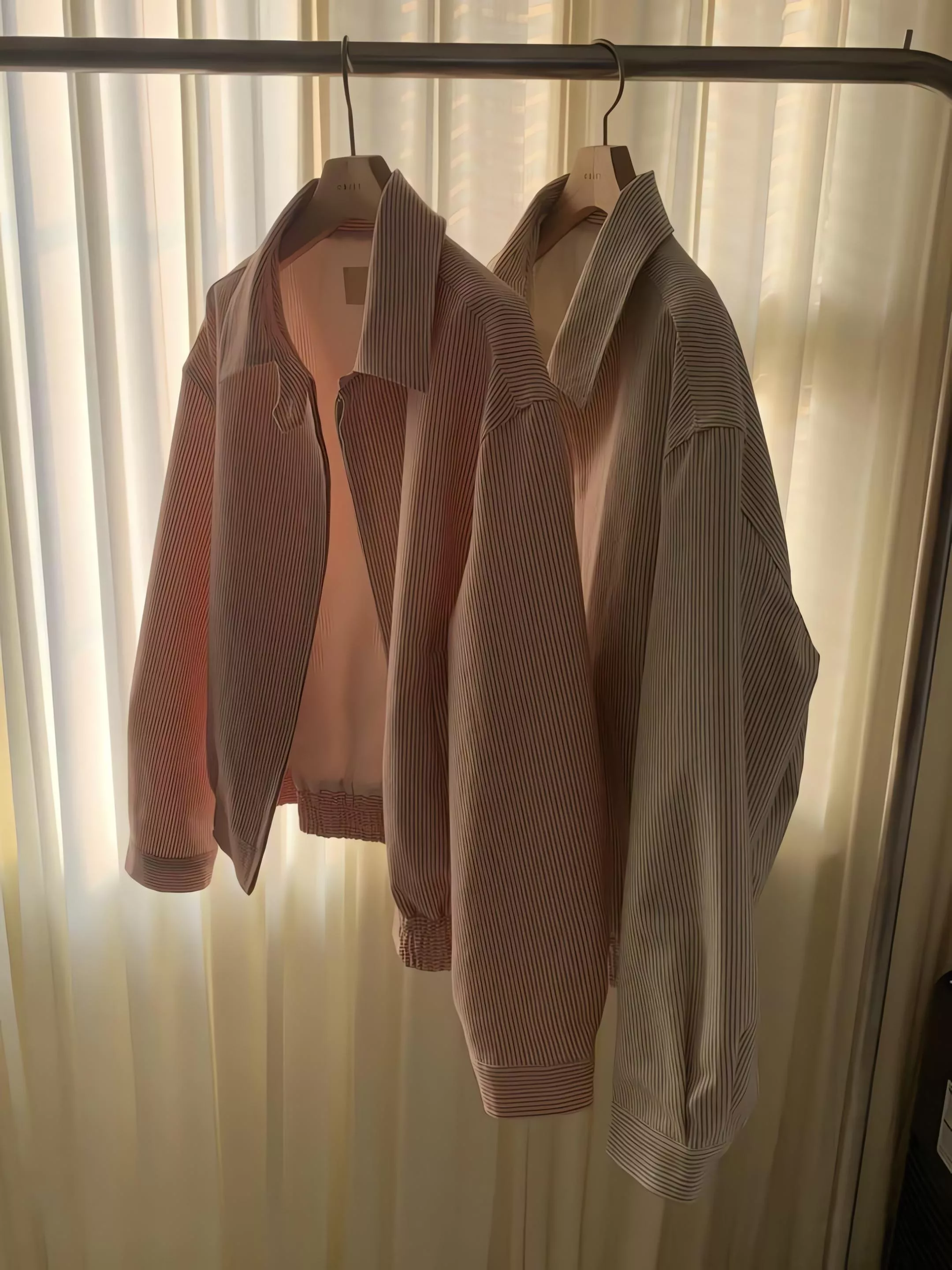 條紋本身很耐看,不太受流行影響,每一季拿出來穿都很自然。版型不是過短的設計,長度大約落在臀部附近,穿起來有安全感,也比較好駕馭。下擺做了鬆緊收束,讓整體輪廓不會散開,側面看起來會多一點俐落感。整體是偏寬鬆的版型,活動感夠,日常穿起來很輕鬆。