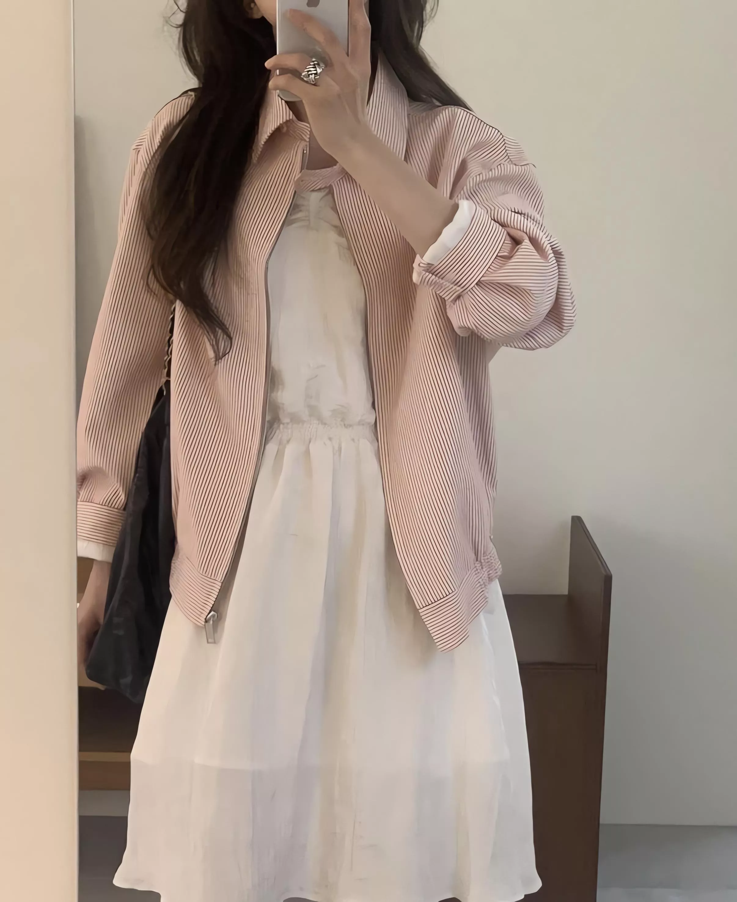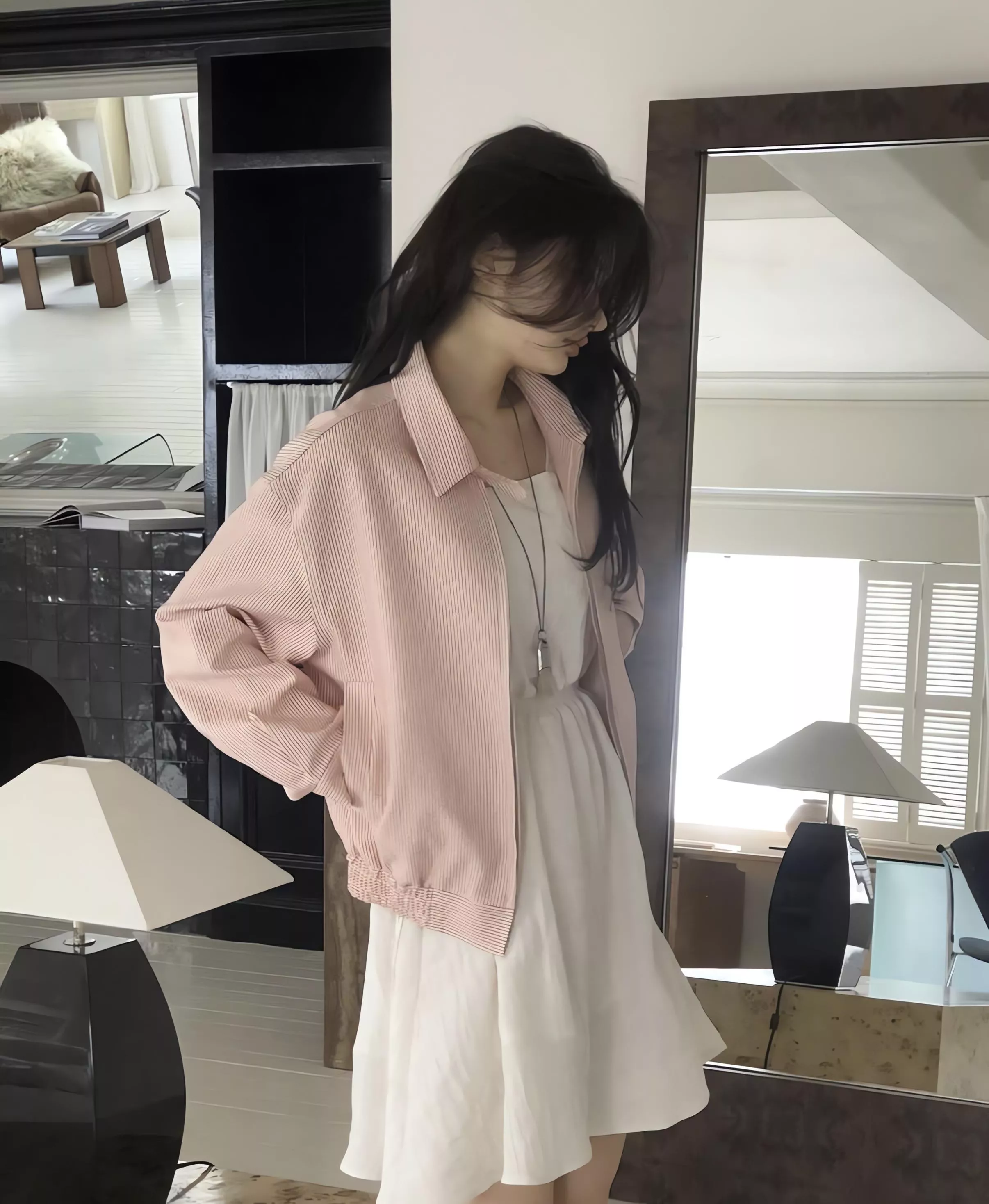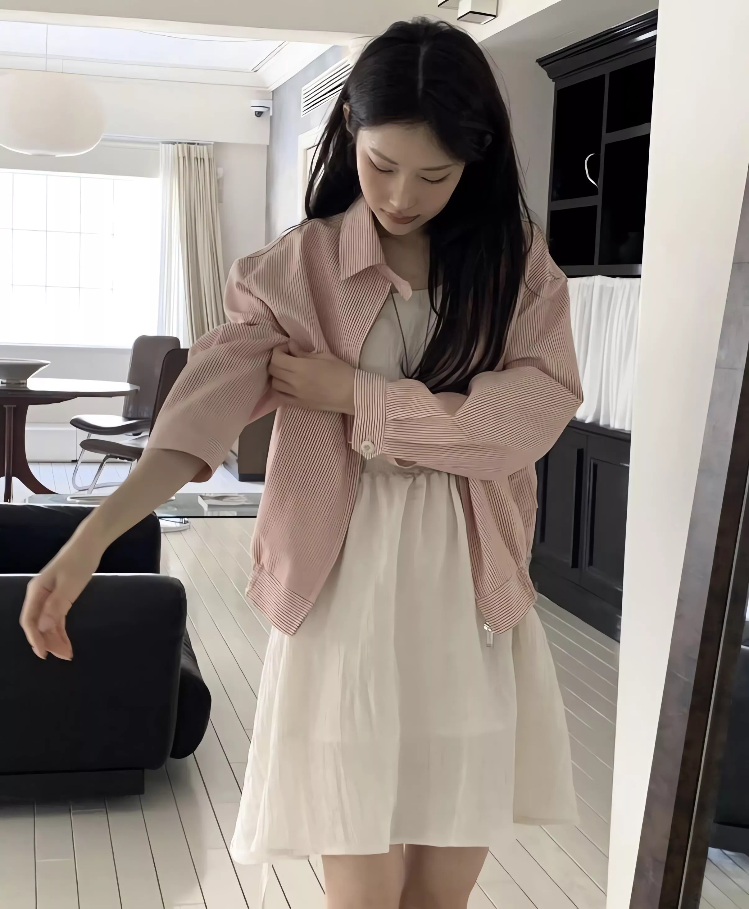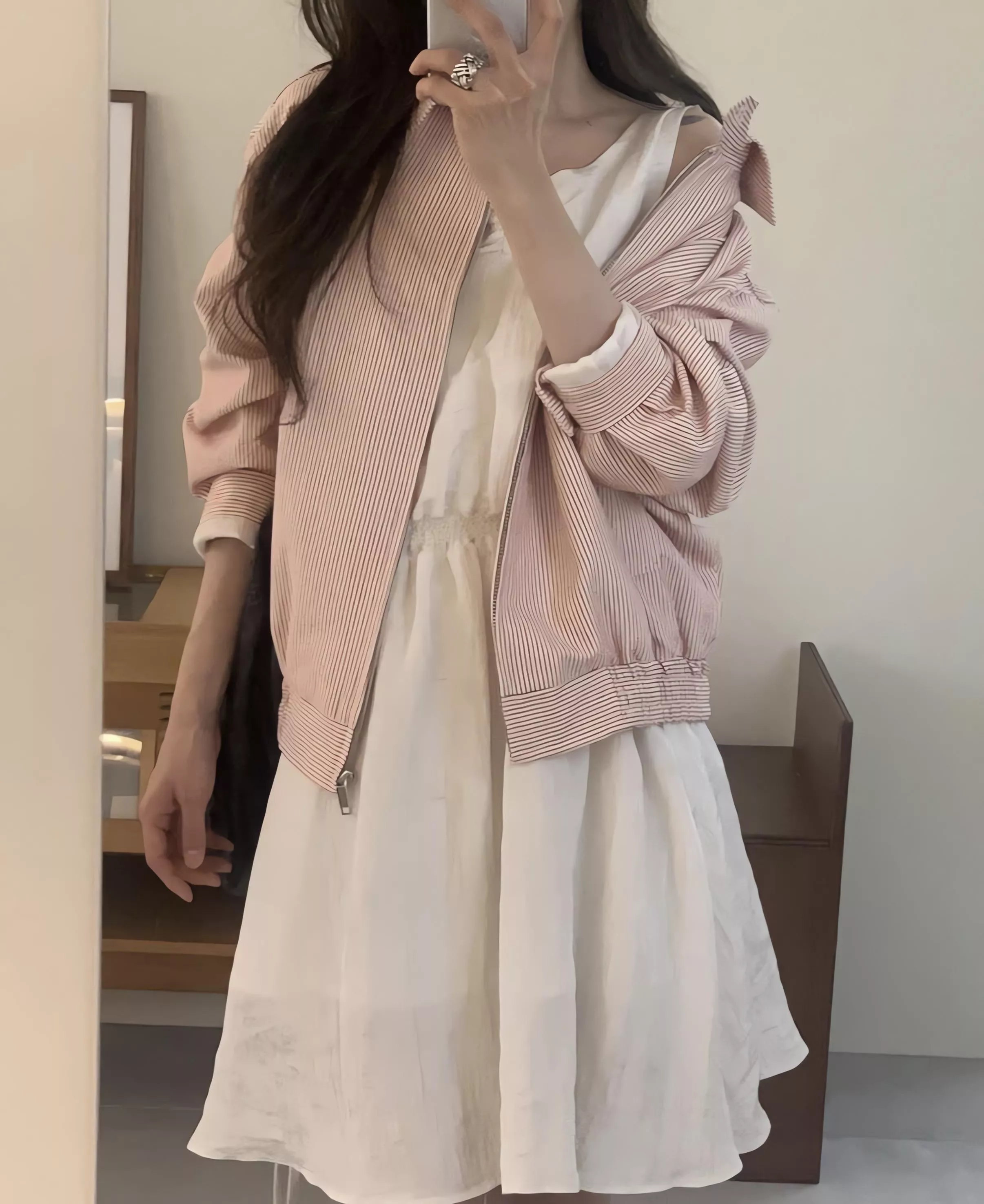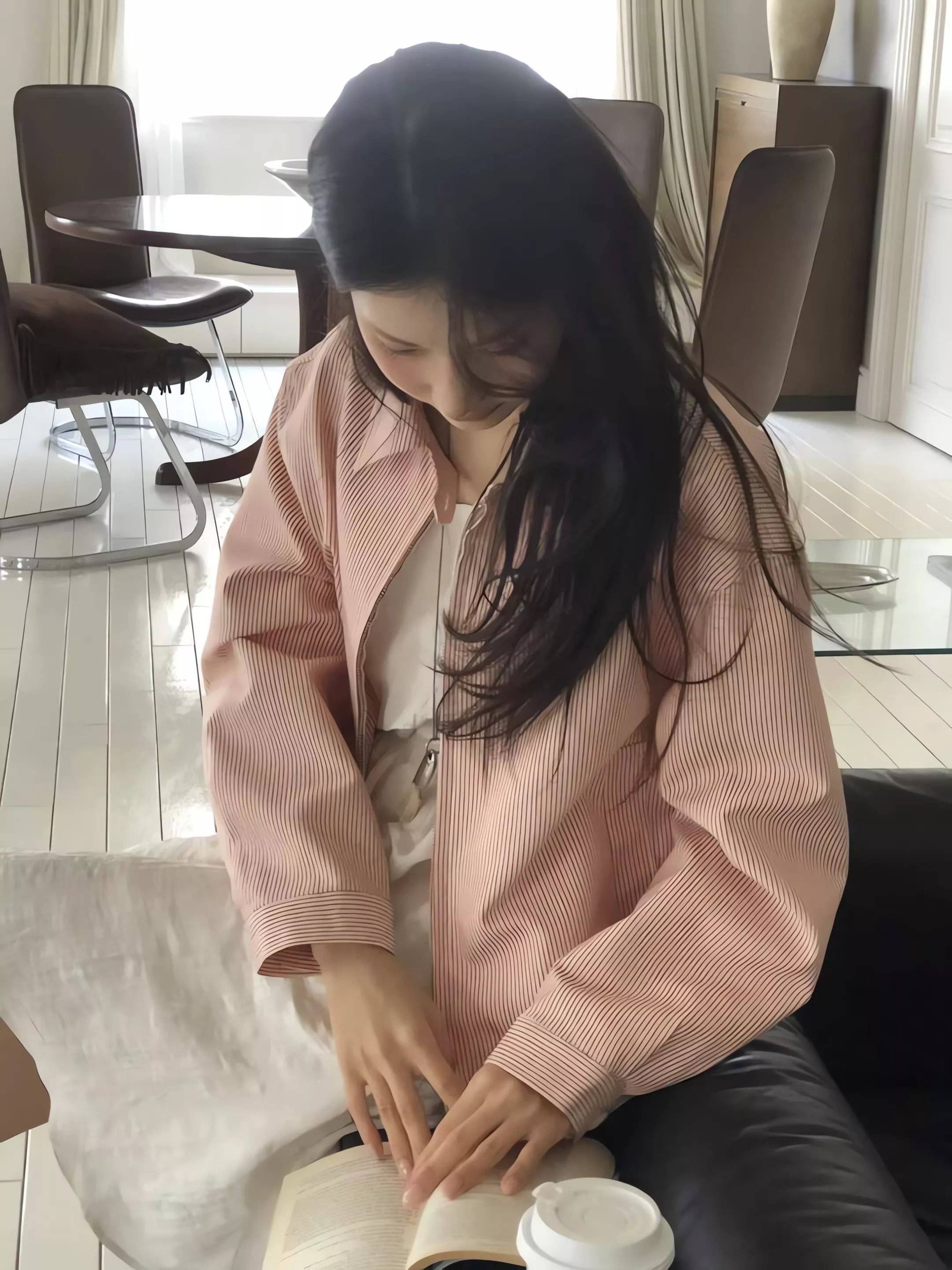 條紋本身很耐看,不太受流行影響,每一季拿出來穿都很自然。版型不是過短的設計,長度大約落在臀部附近,穿起來有安全感,也比較好駕馭。下擺做了鬆緊收束,讓整體輪廓不會散開,側面看起來會多一點俐落感。整體是偏寬鬆的版型,活動感夠,日常穿起來很輕鬆。