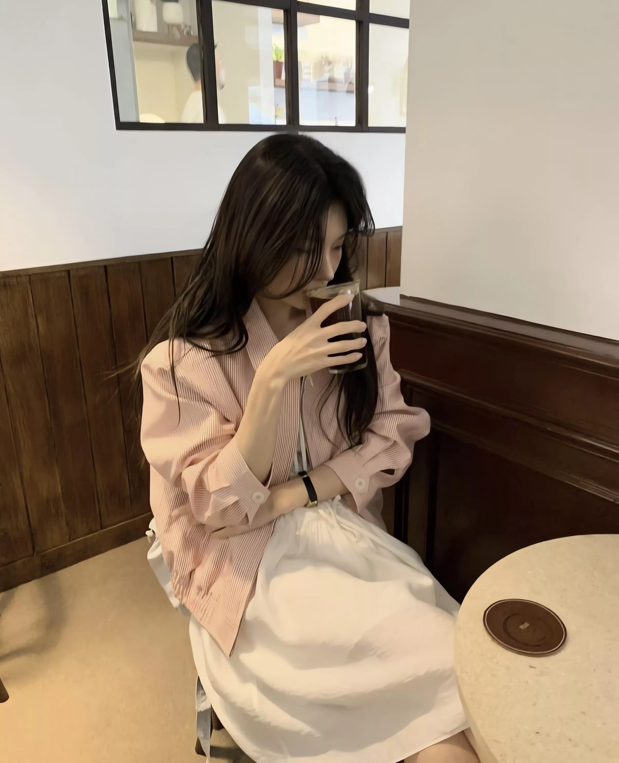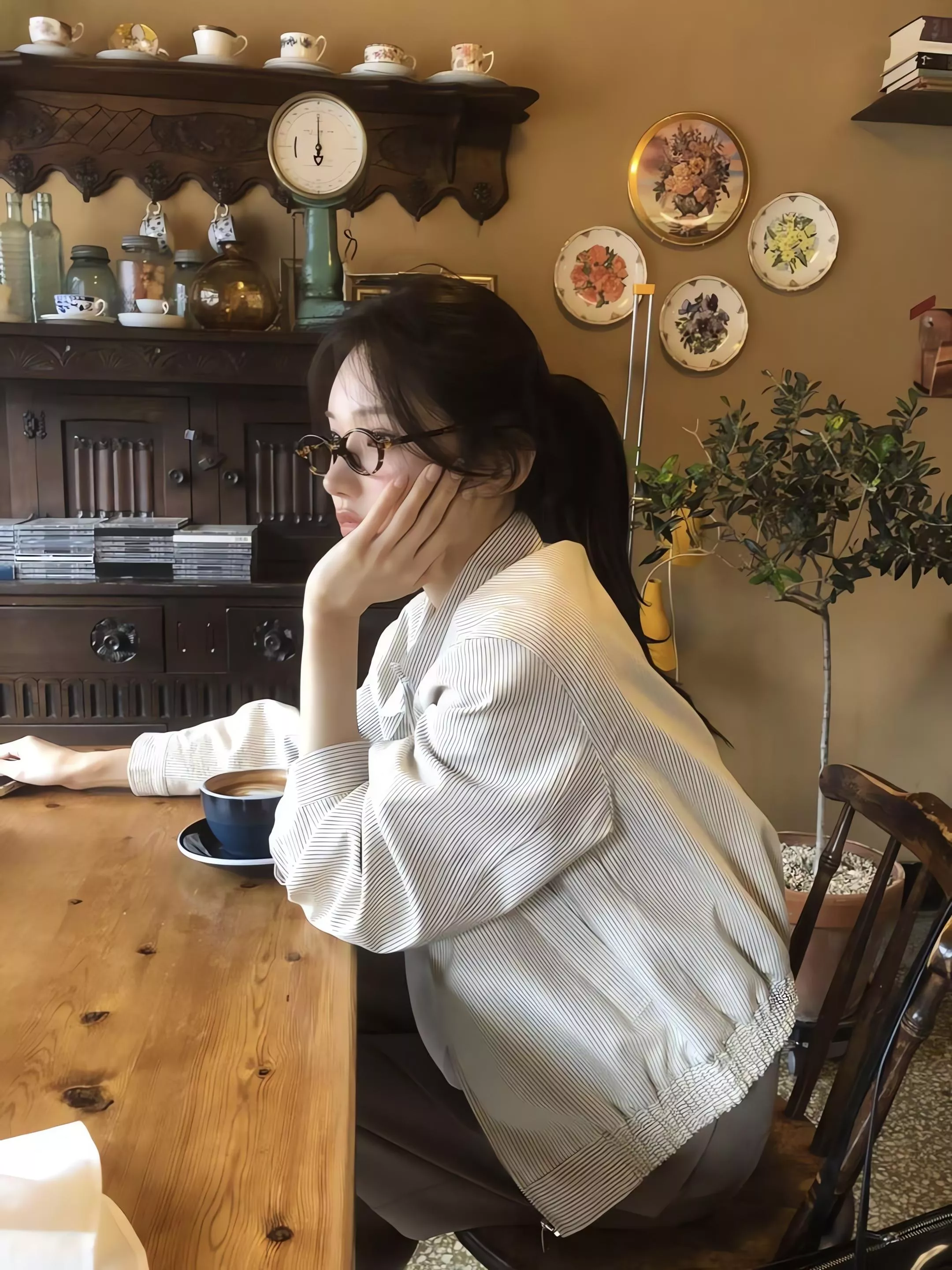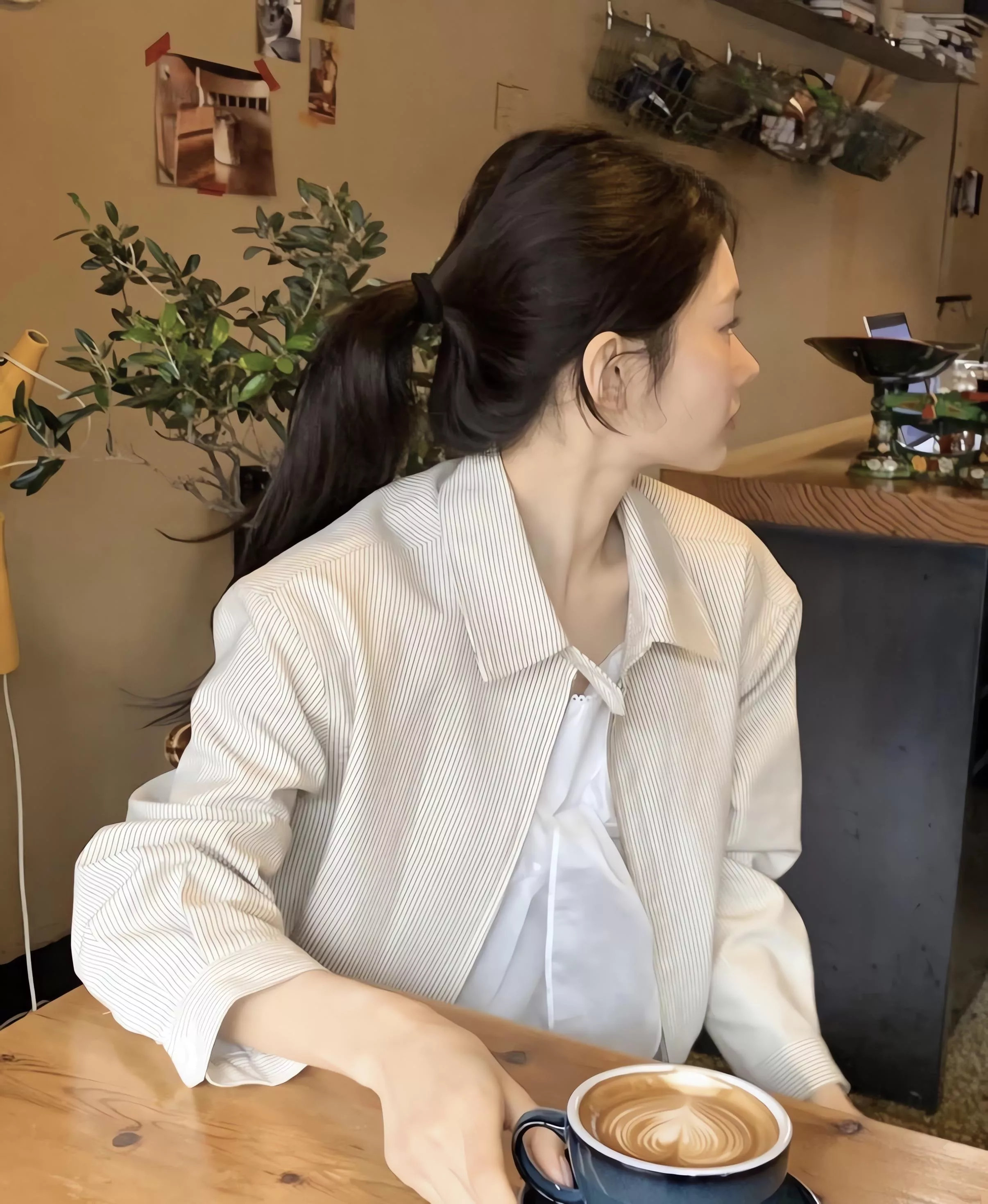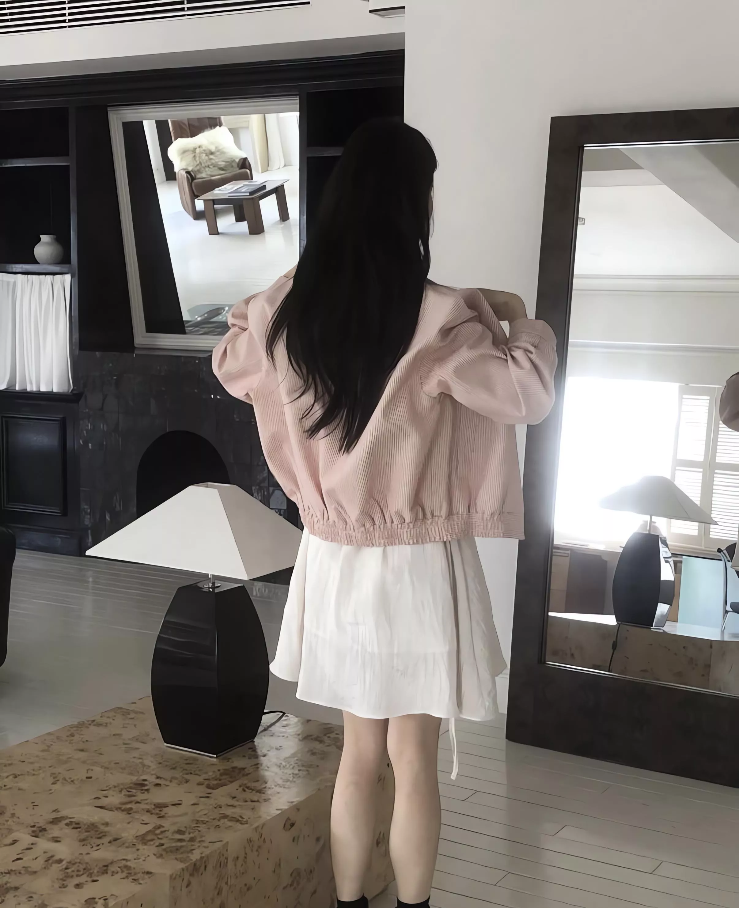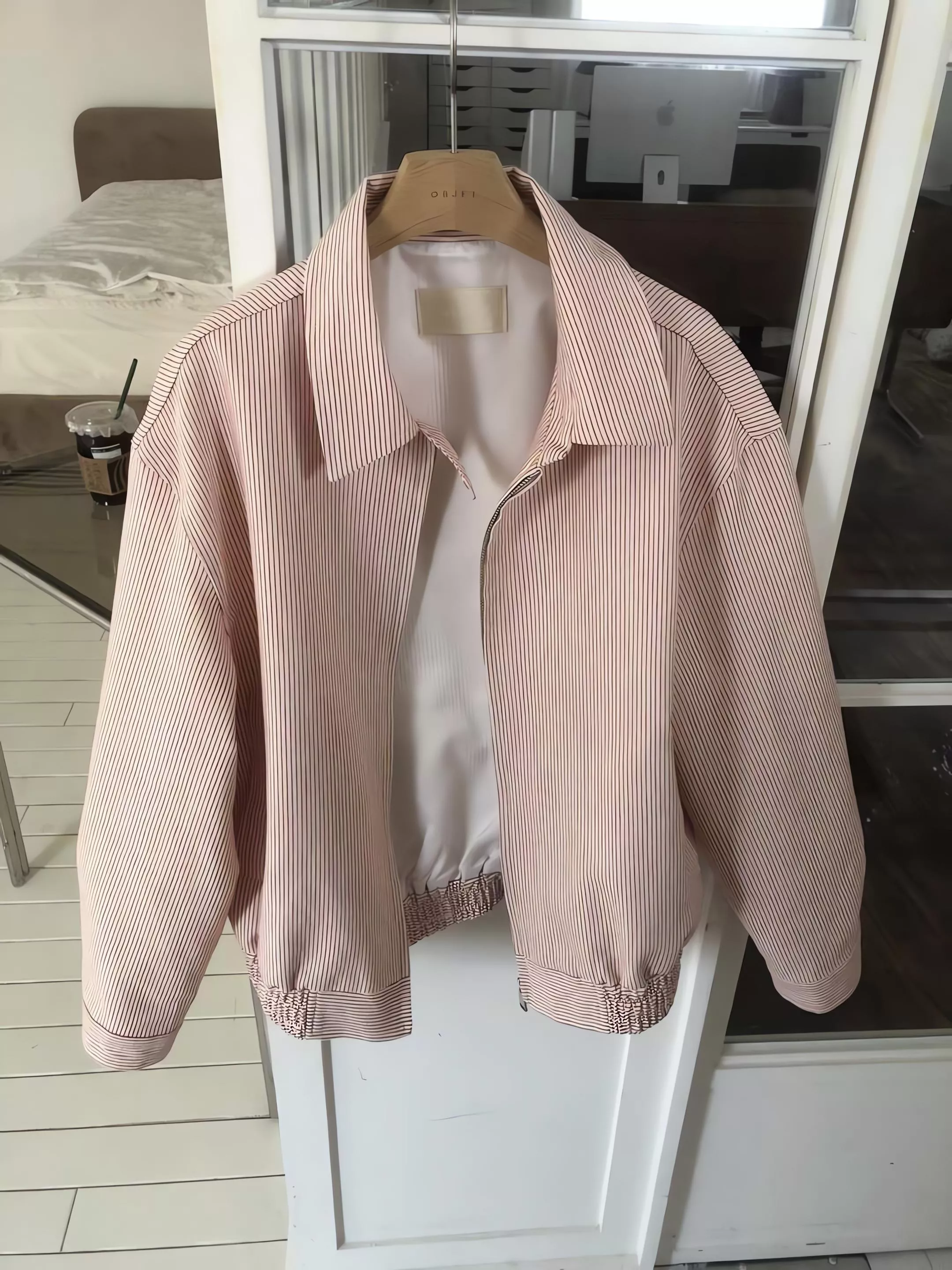 條紋本身很耐看,不太受流行影響,每一季拿出來穿都很自然。版型不是過短的設計,長度大約落在臀部附近,穿起來有安全感,也比較好駕馭。下擺做了鬆緊收束,讓整體輪廓不會散開,側面看起來會多一點俐落感。整體是偏寬鬆的版型,活動感夠,日常穿起來很輕鬆。