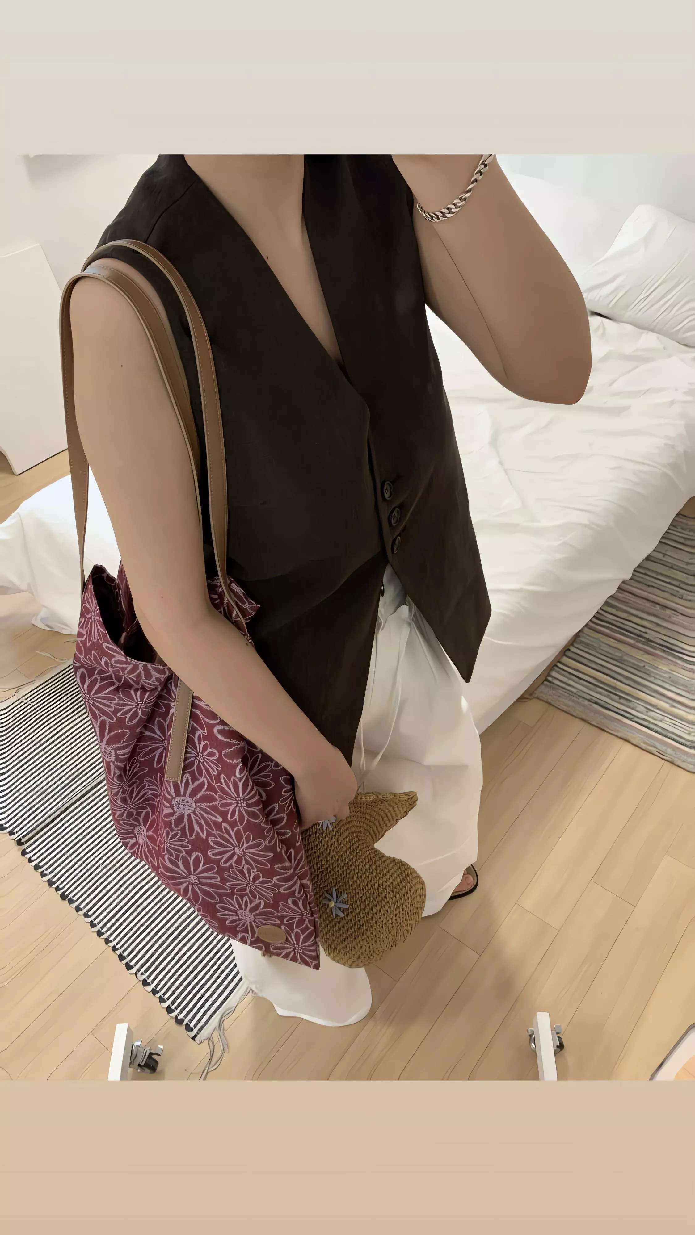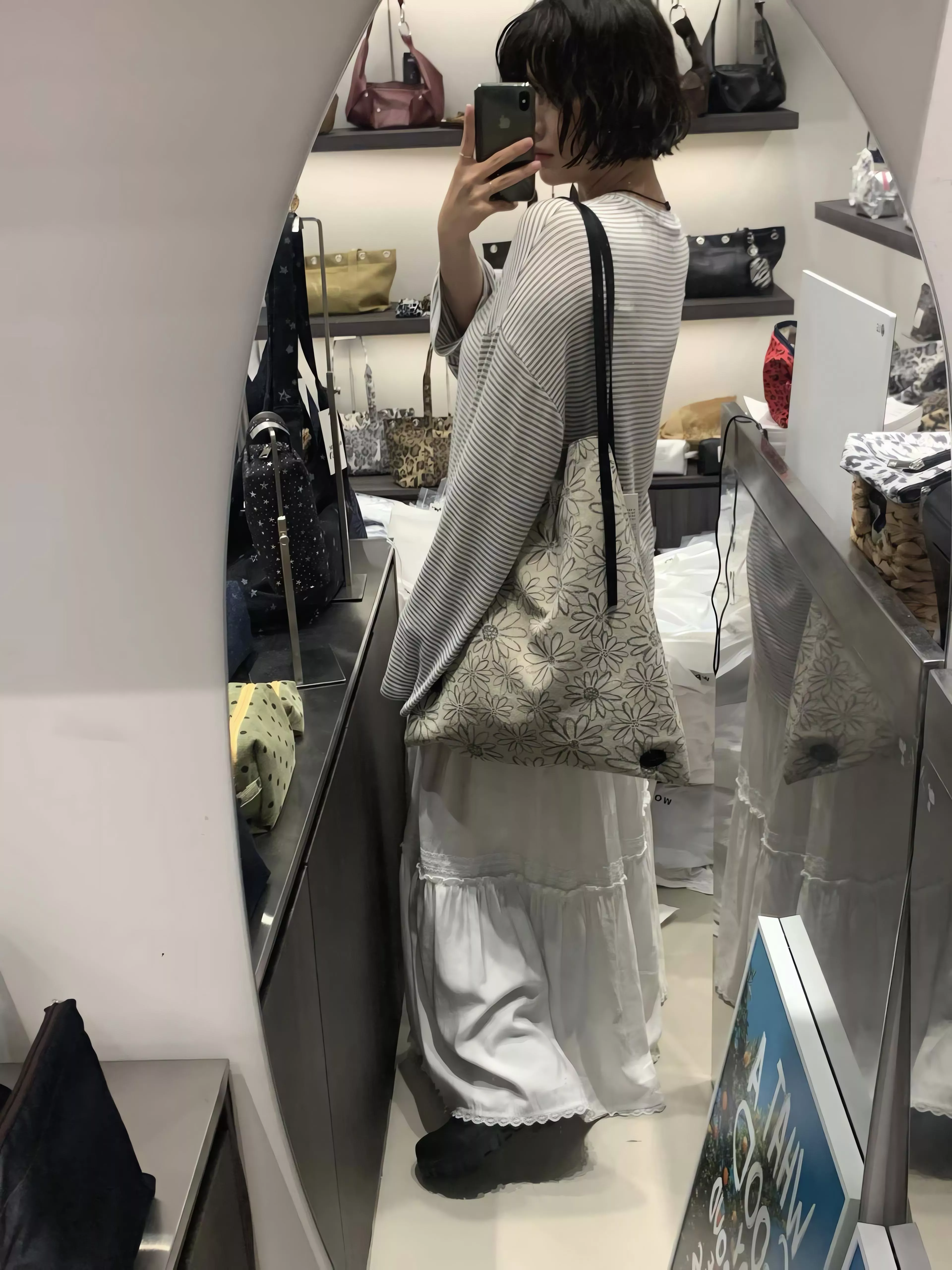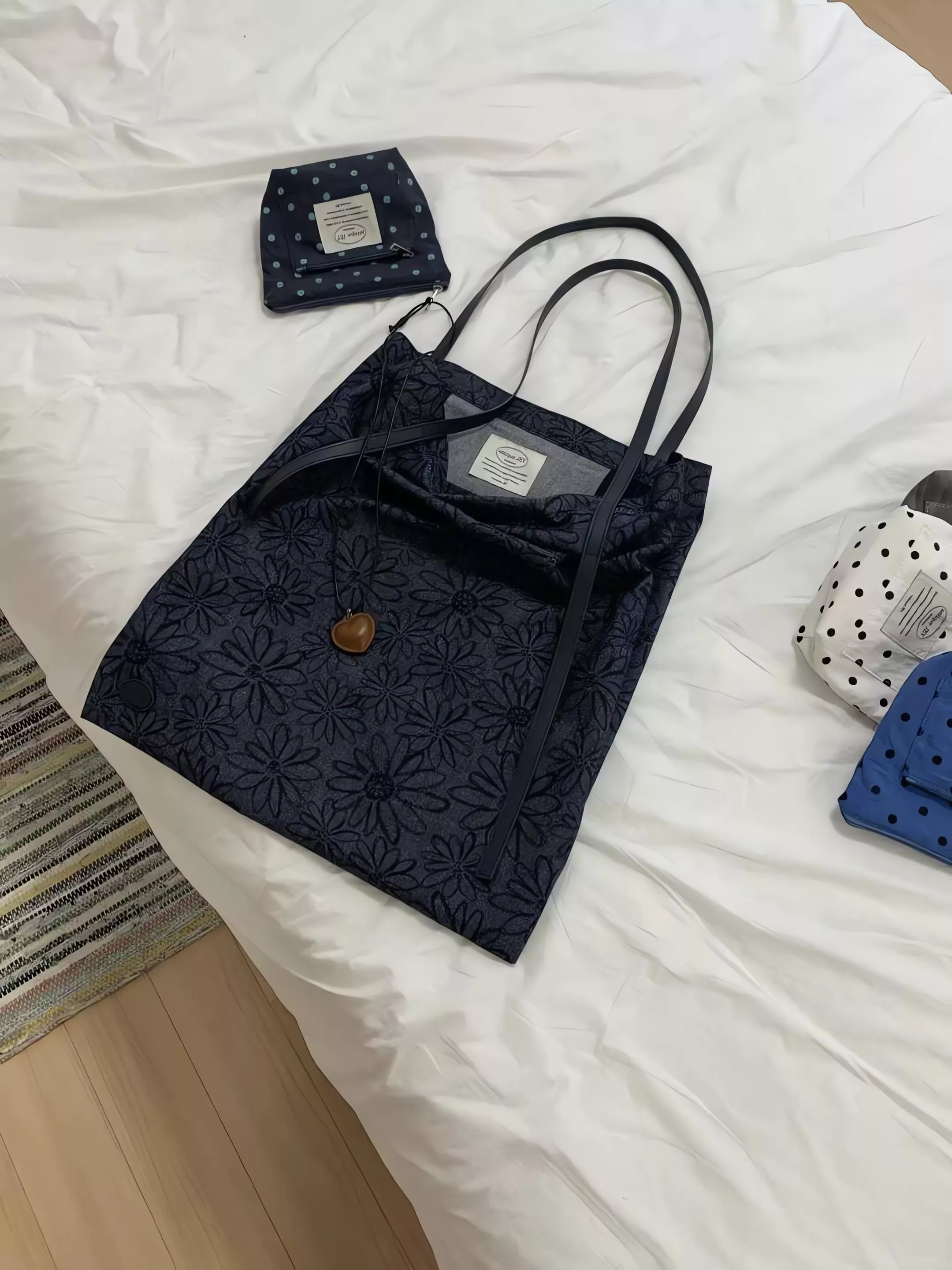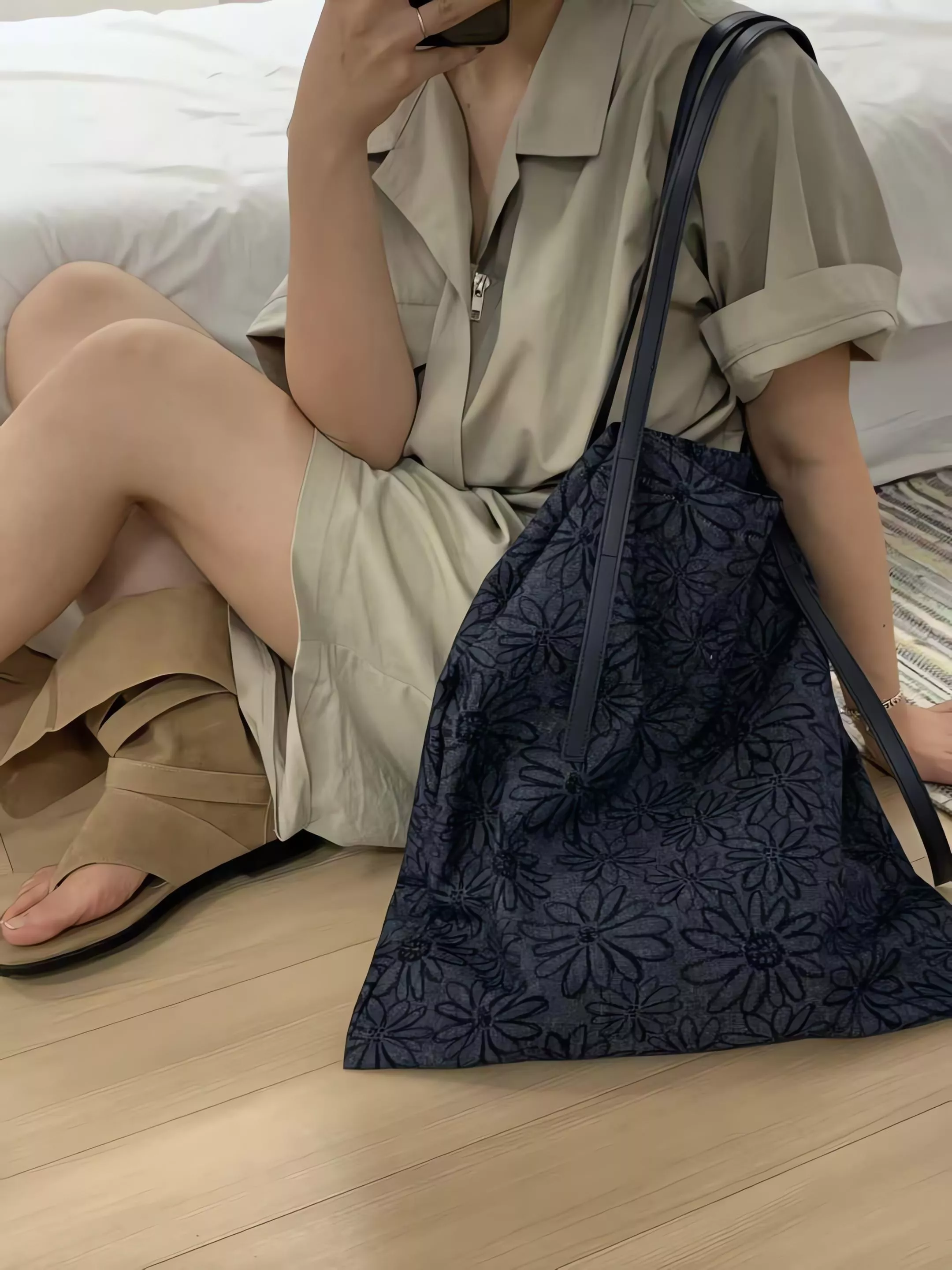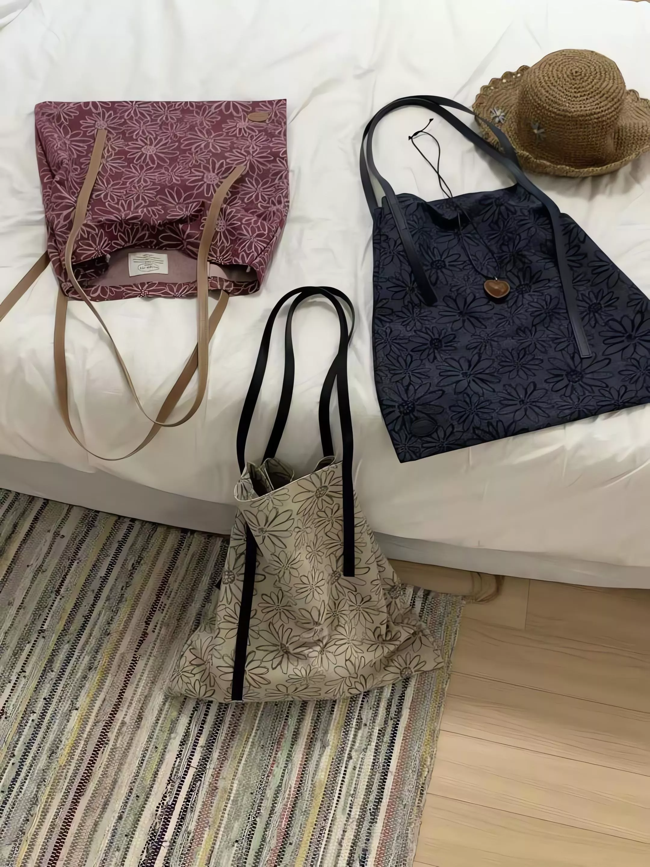 韓國製 繪本感棉布花朵不對稱背帶托特帆布包