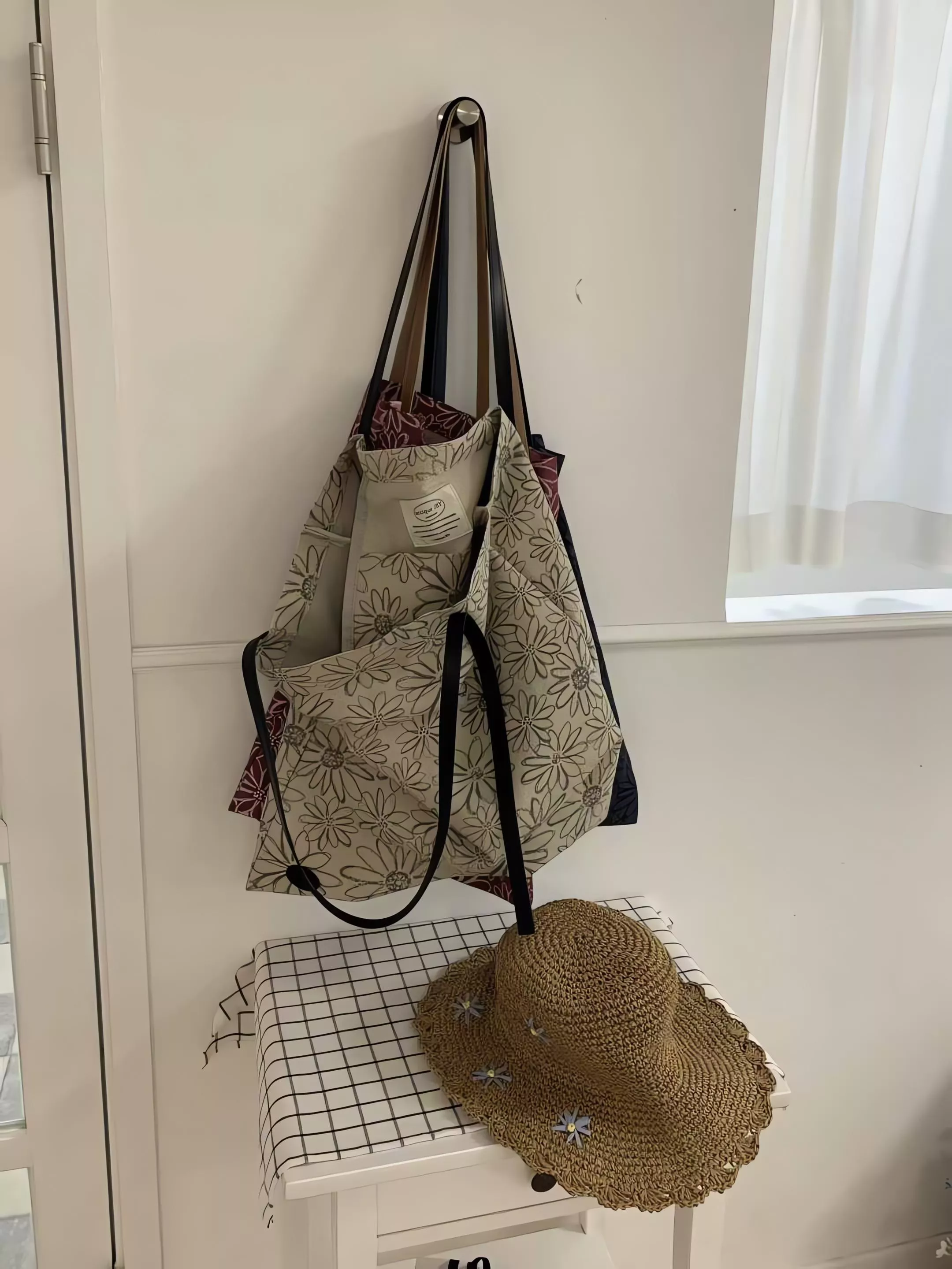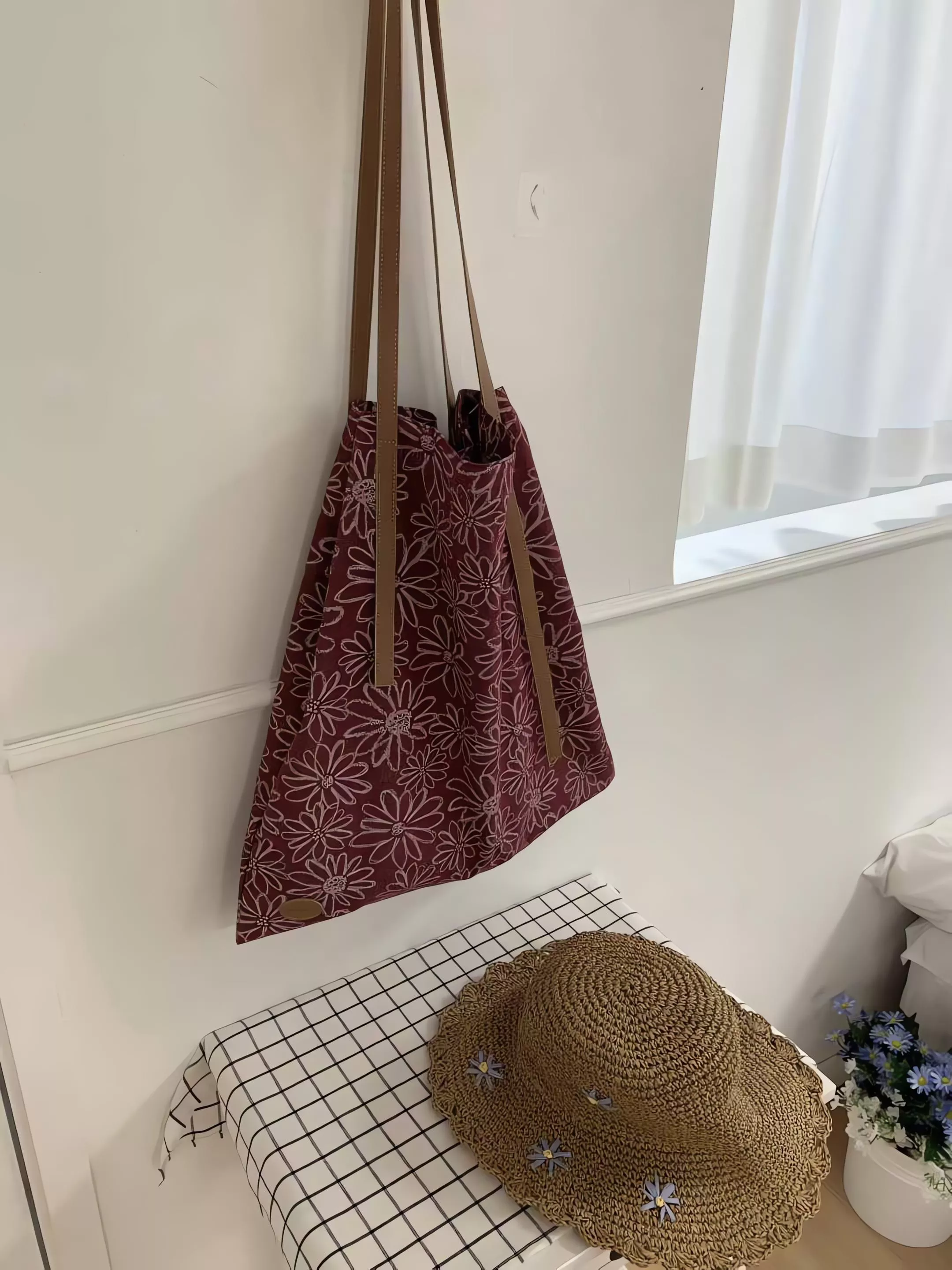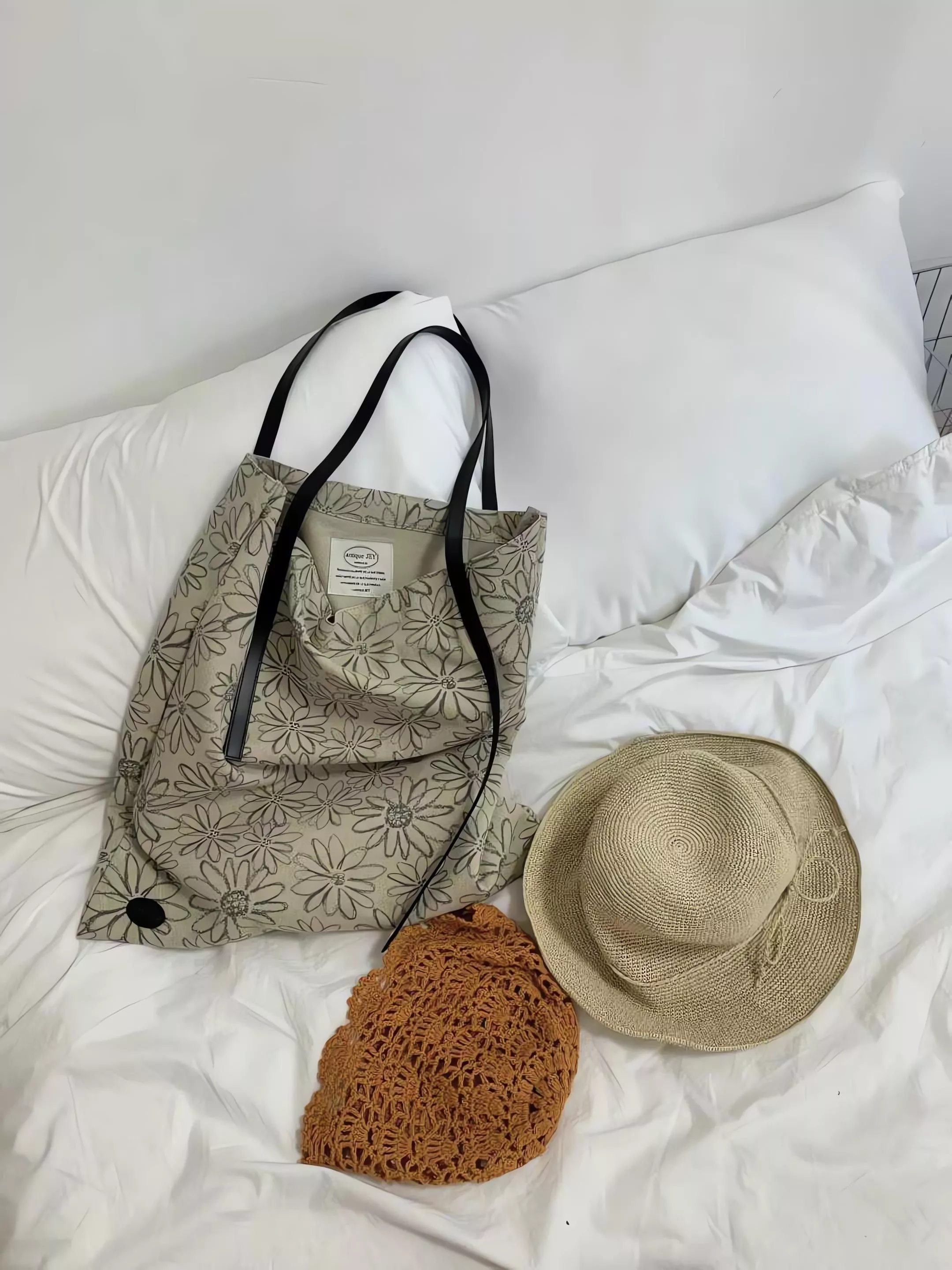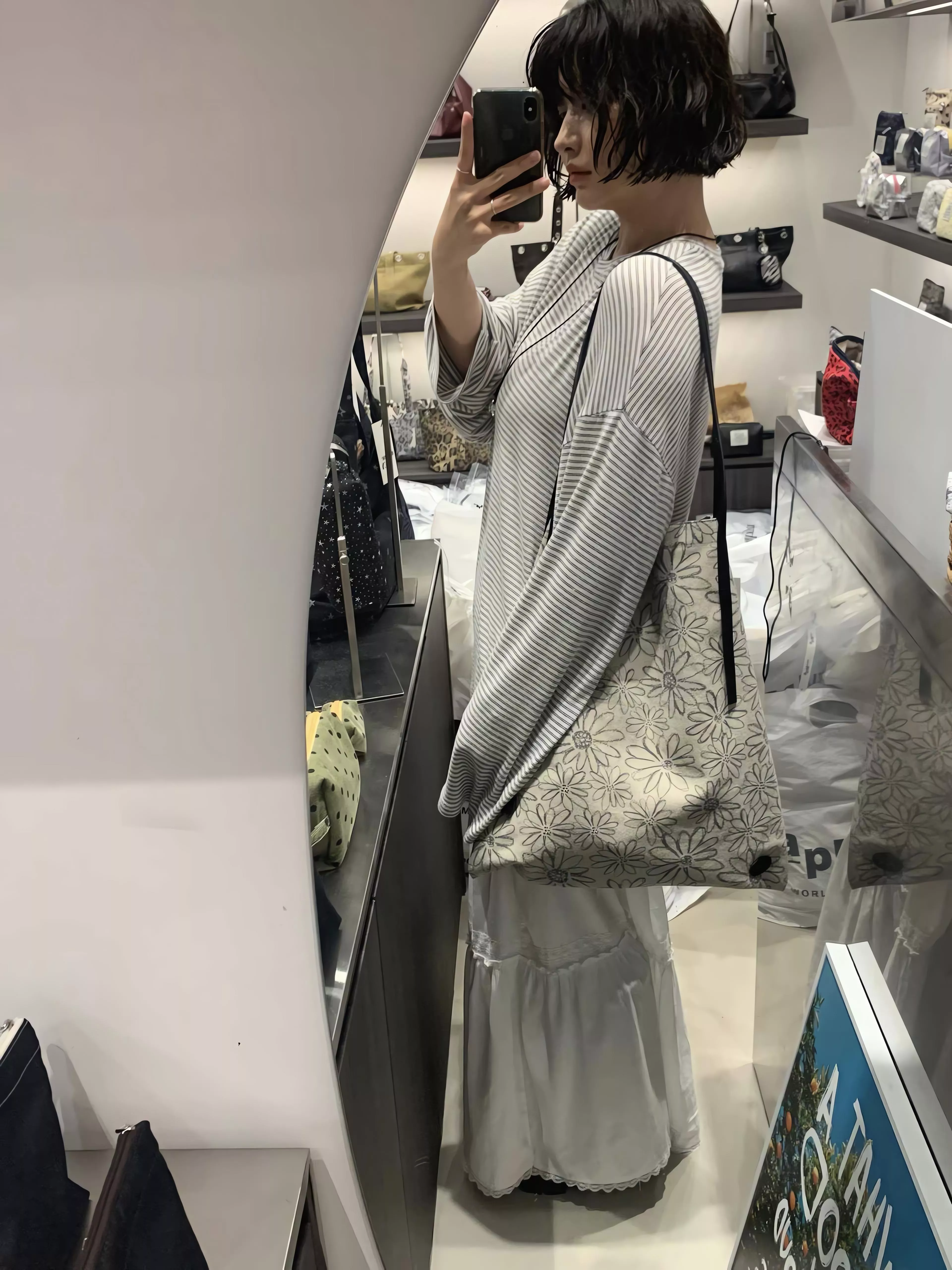 韓國製 繪本感棉布花朵不對稱背帶托特帆布包