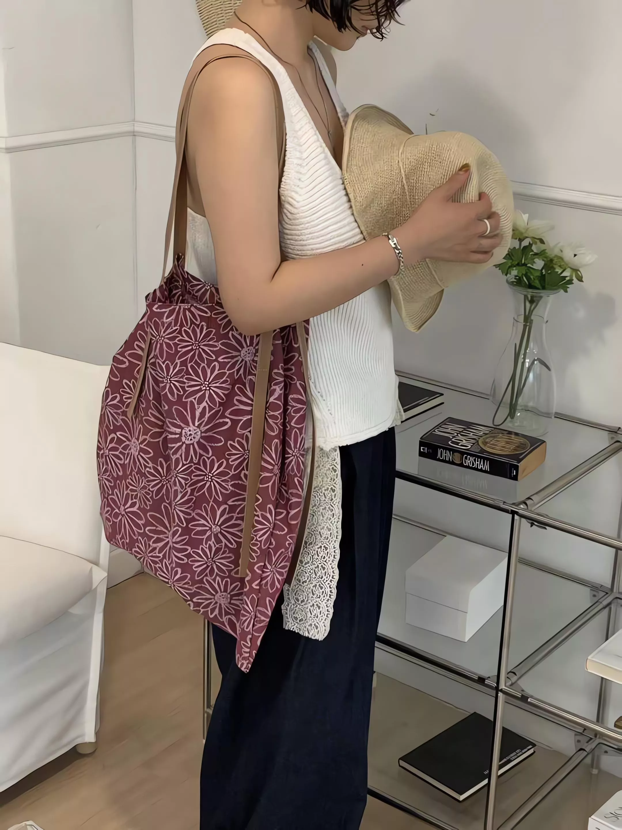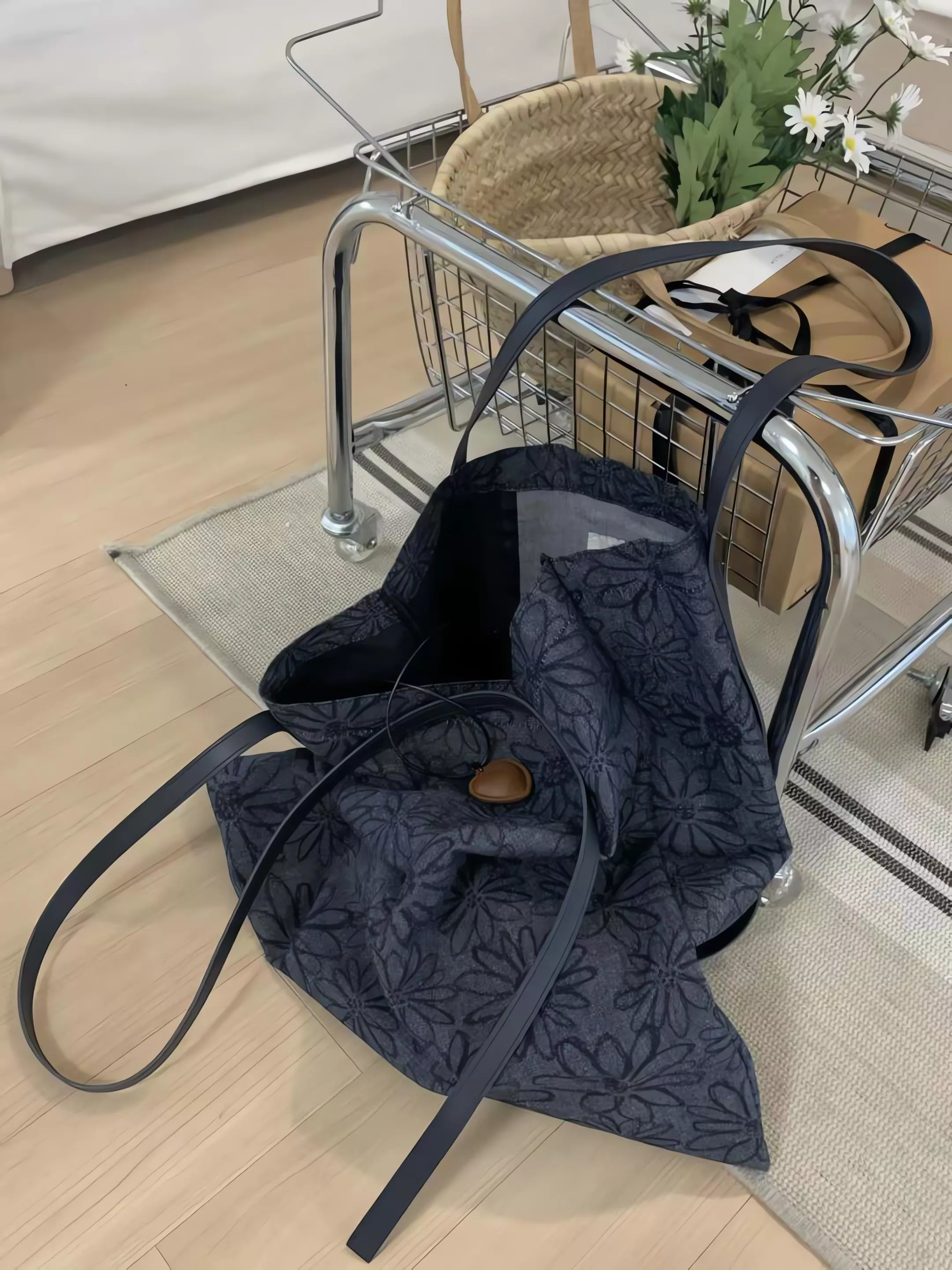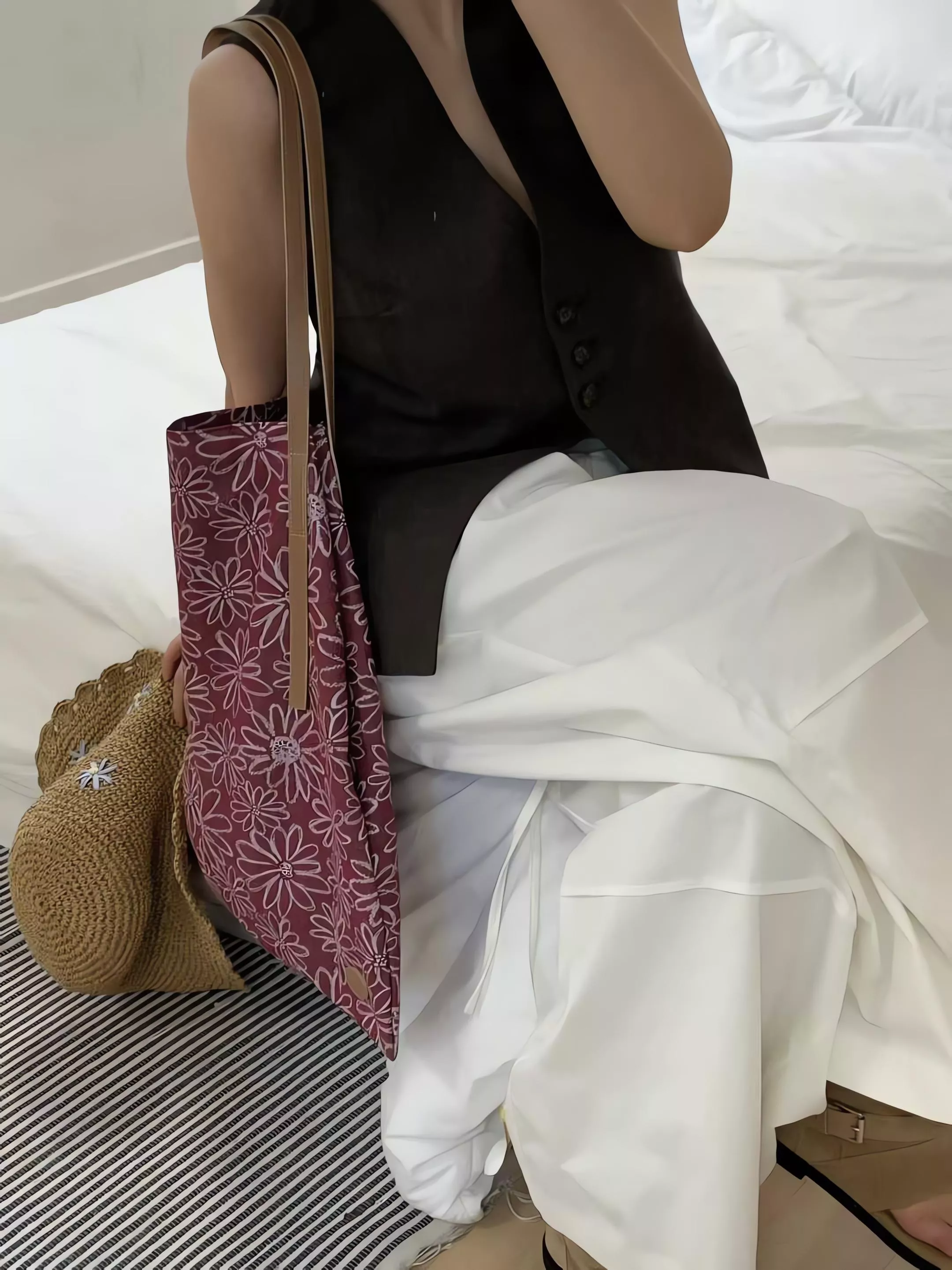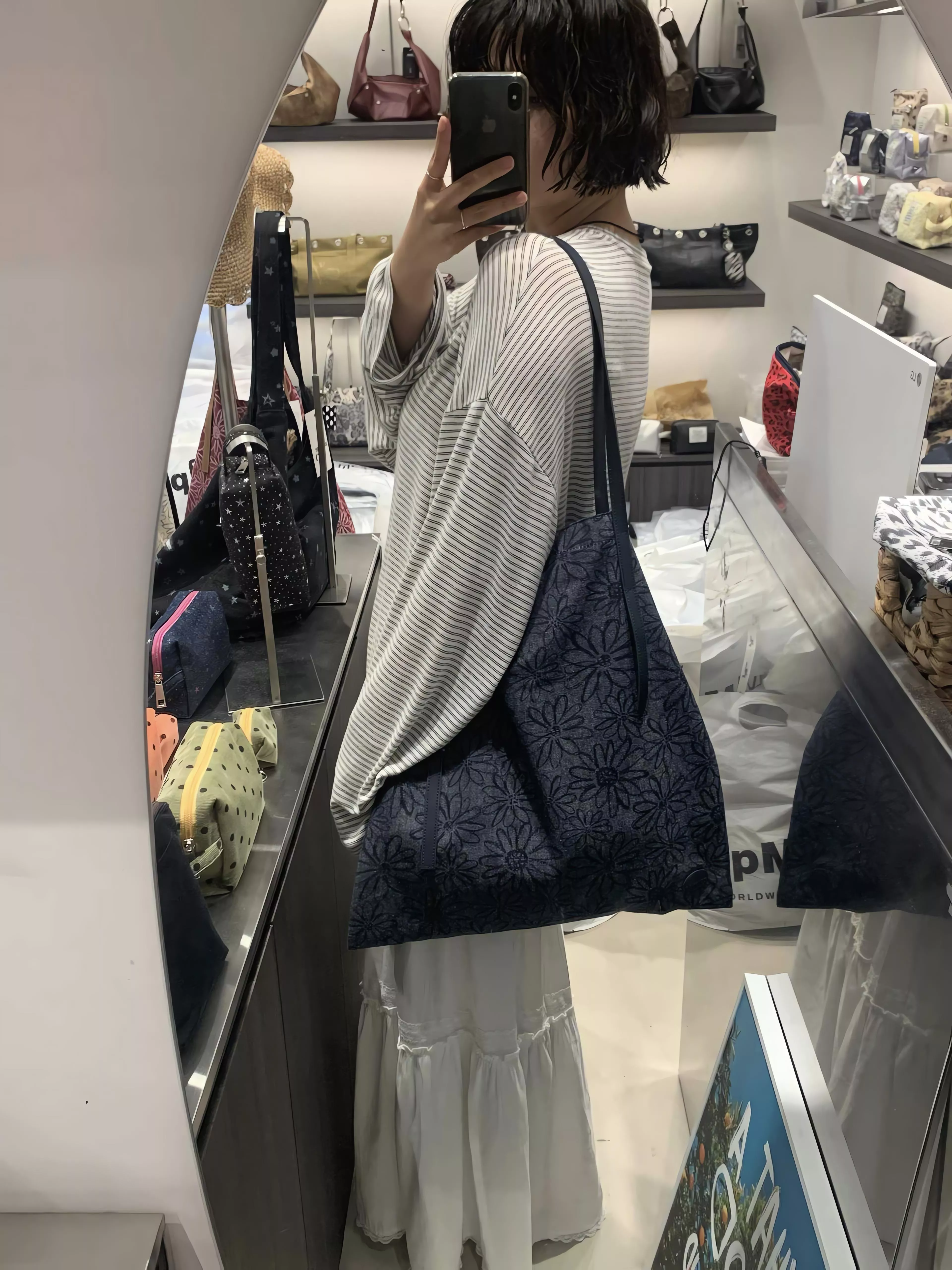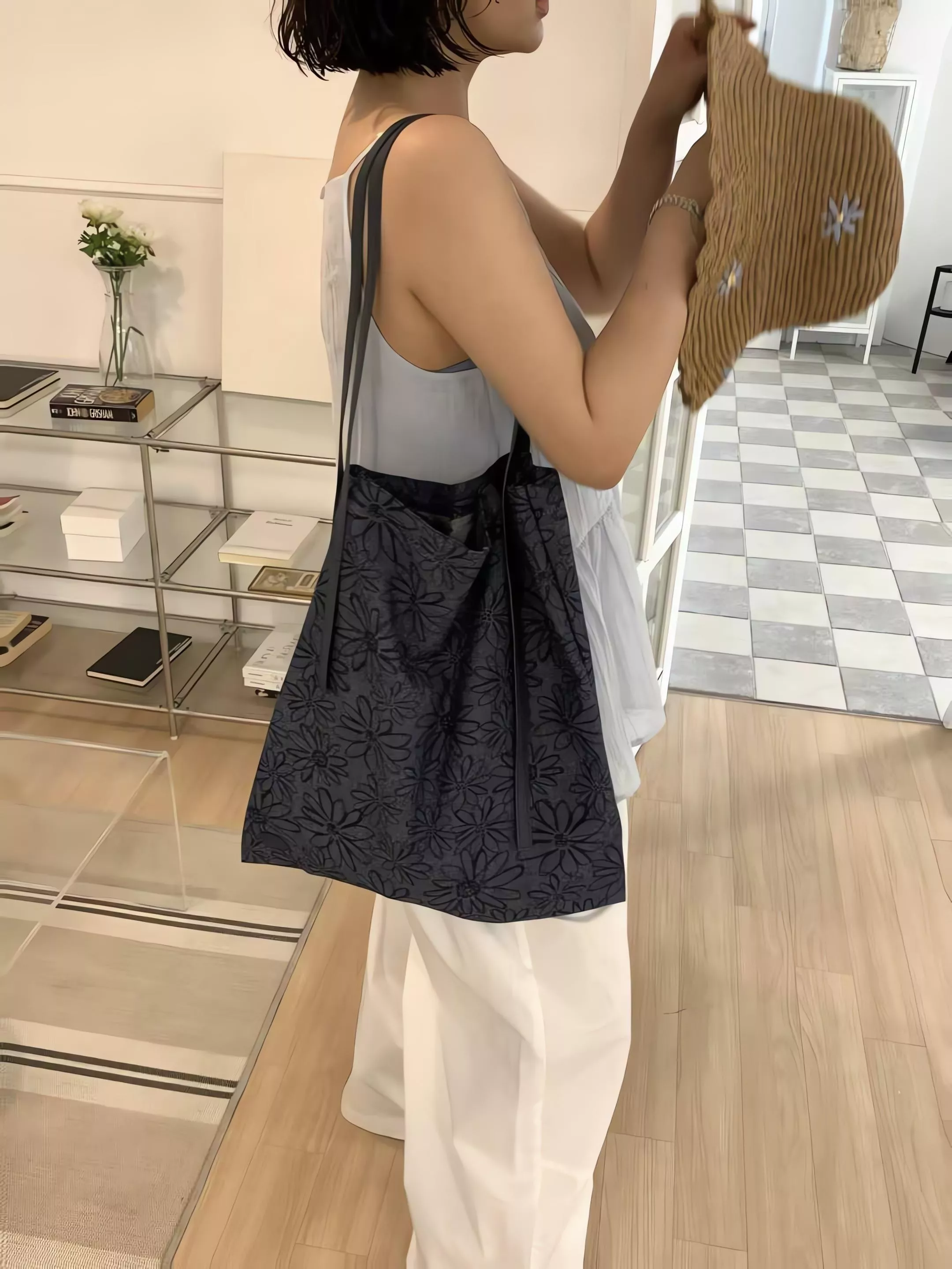 韓國製 繪本感棉布花朵不對稱背帶托特帆布包