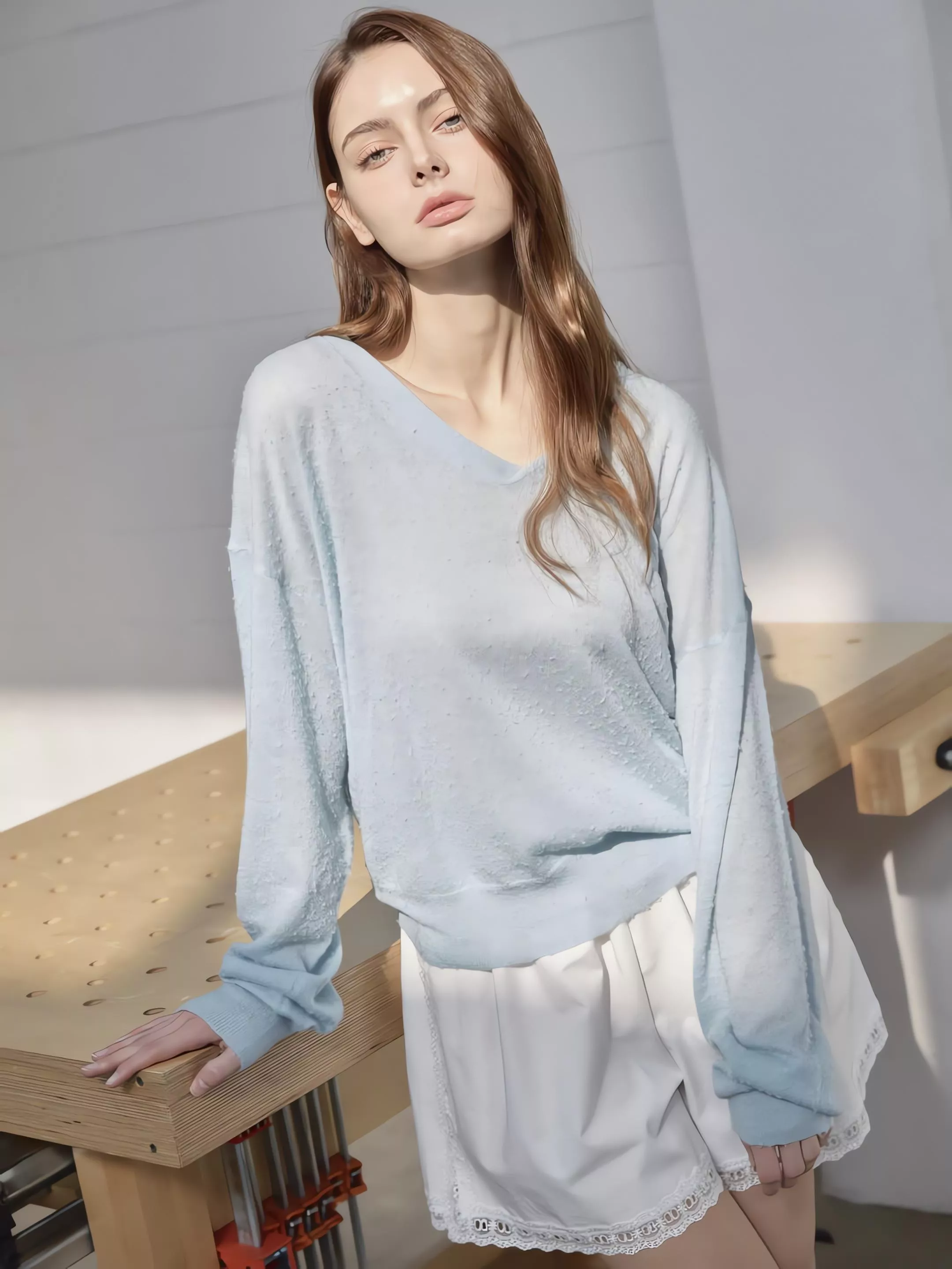 搭配這款特殊的美利奴羊毛顆粒磨毛, 整件衣服看起來軟綿綿、霧朦朦的,非常有空氣感。 穿上它,彷彿把早春的暖意穿在身上, 簡單搭條牛仔褲,就能穿出那種不費力的慵懶與治癒感。