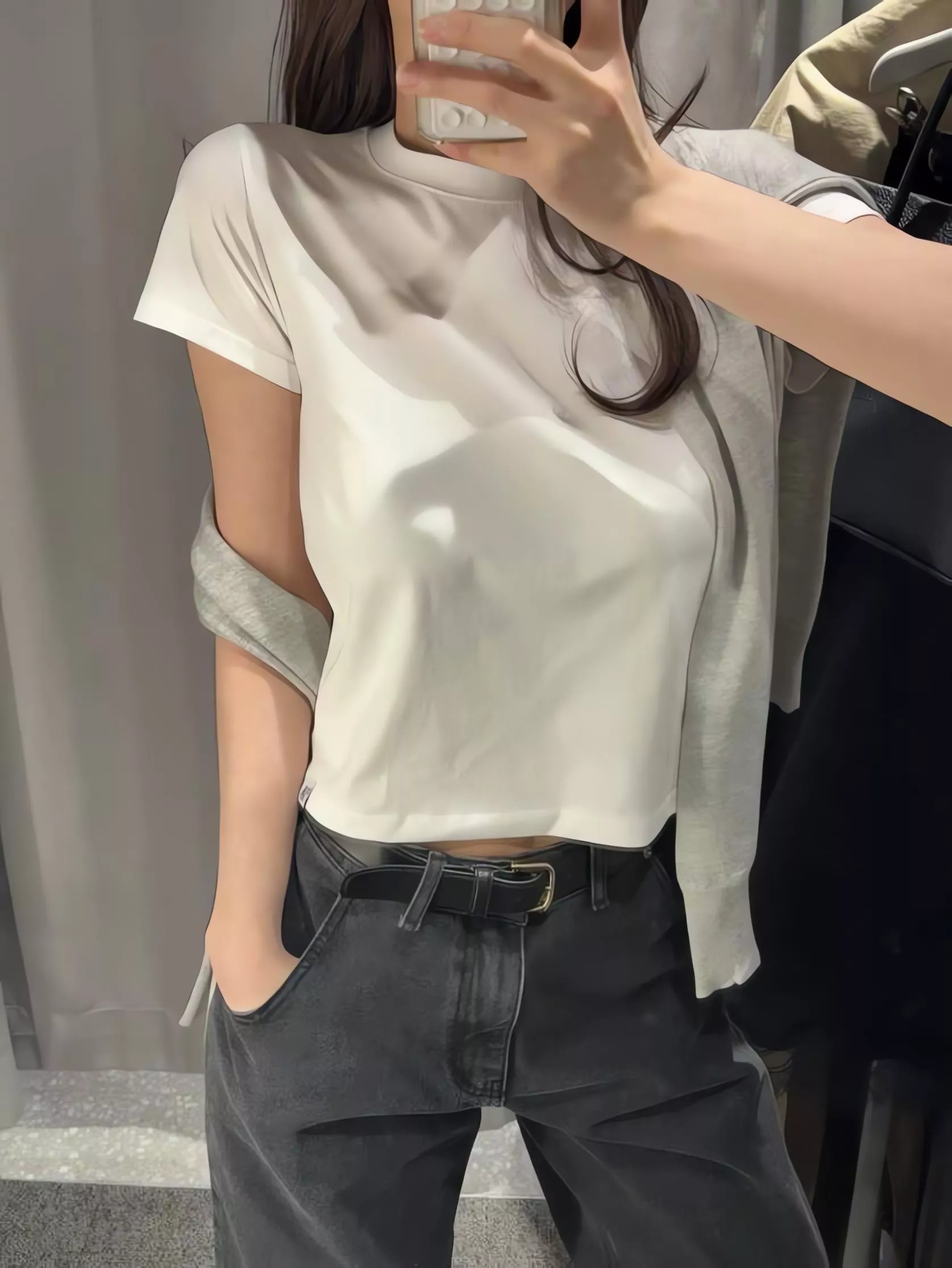 買 T-shirt 最怕長度尷尬。這款 Mixxin 短 T 在版型上做了精細的比例調整,打造出最懂女孩身形的 「微扎比例長度」:長度不尷尬、不顯腹部厚度。