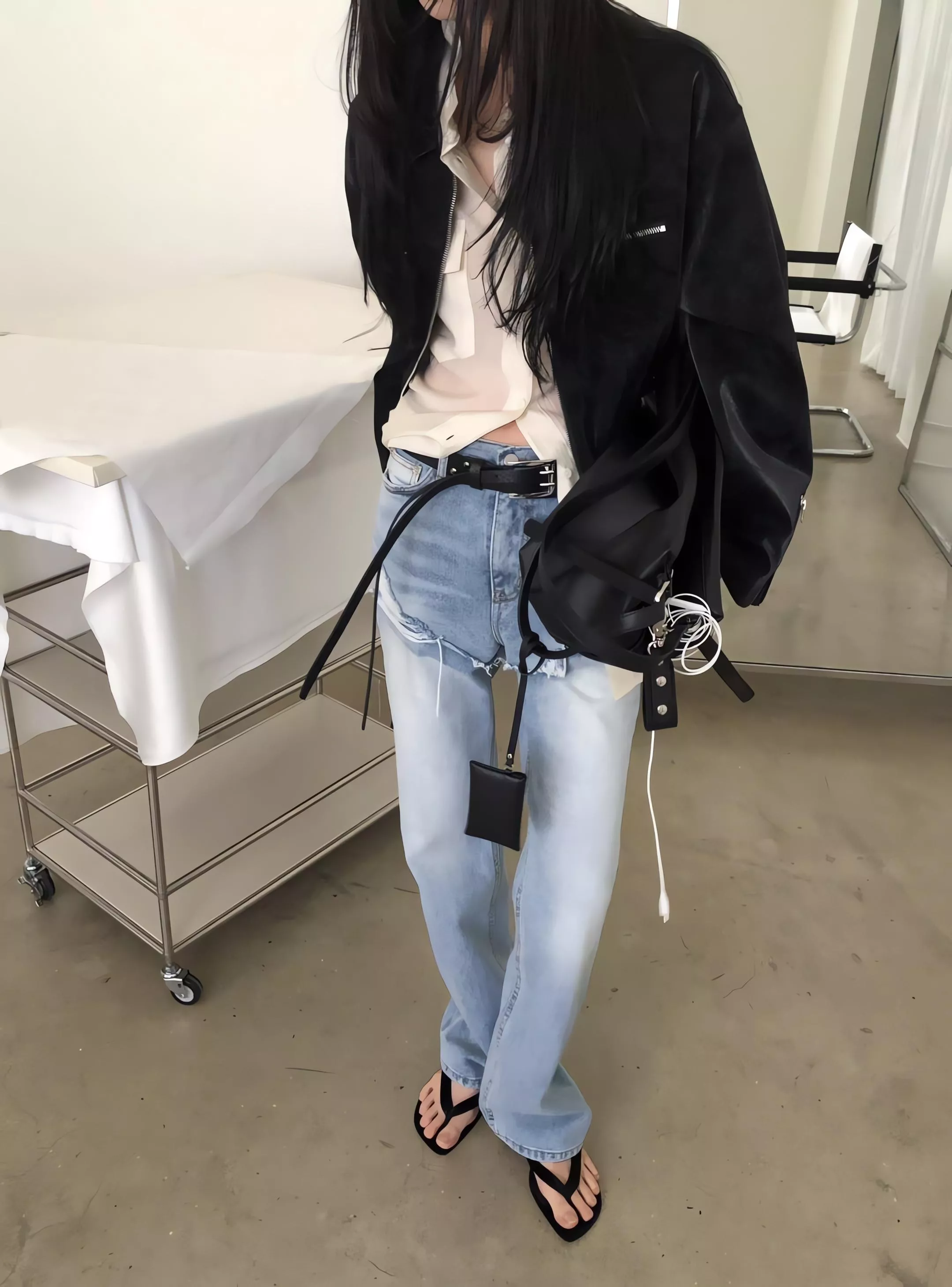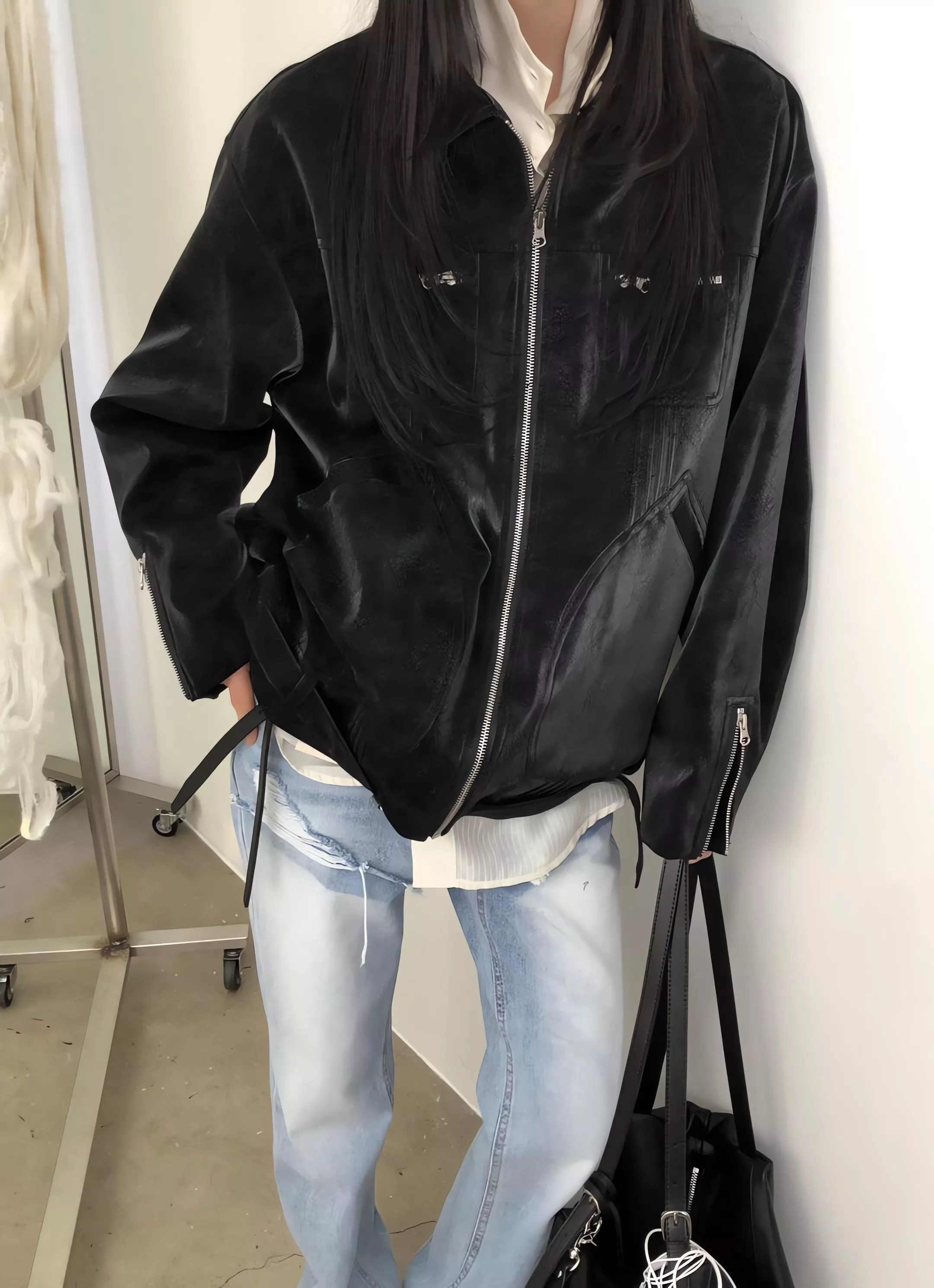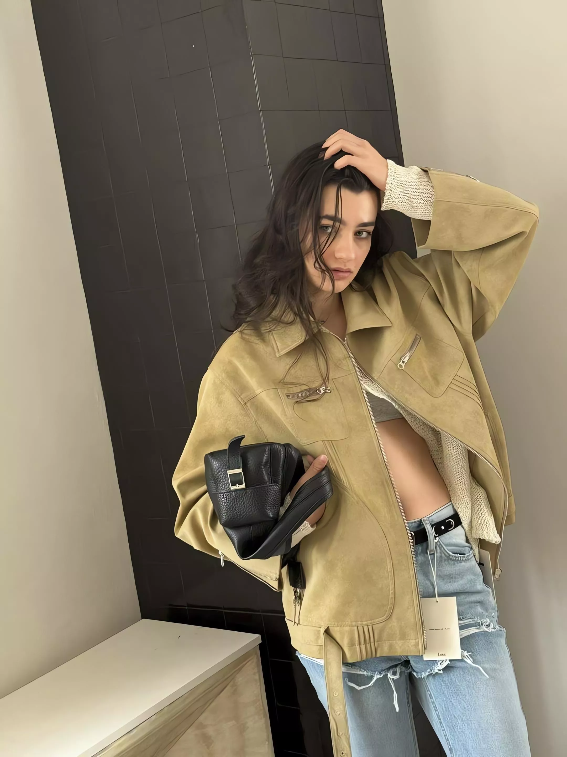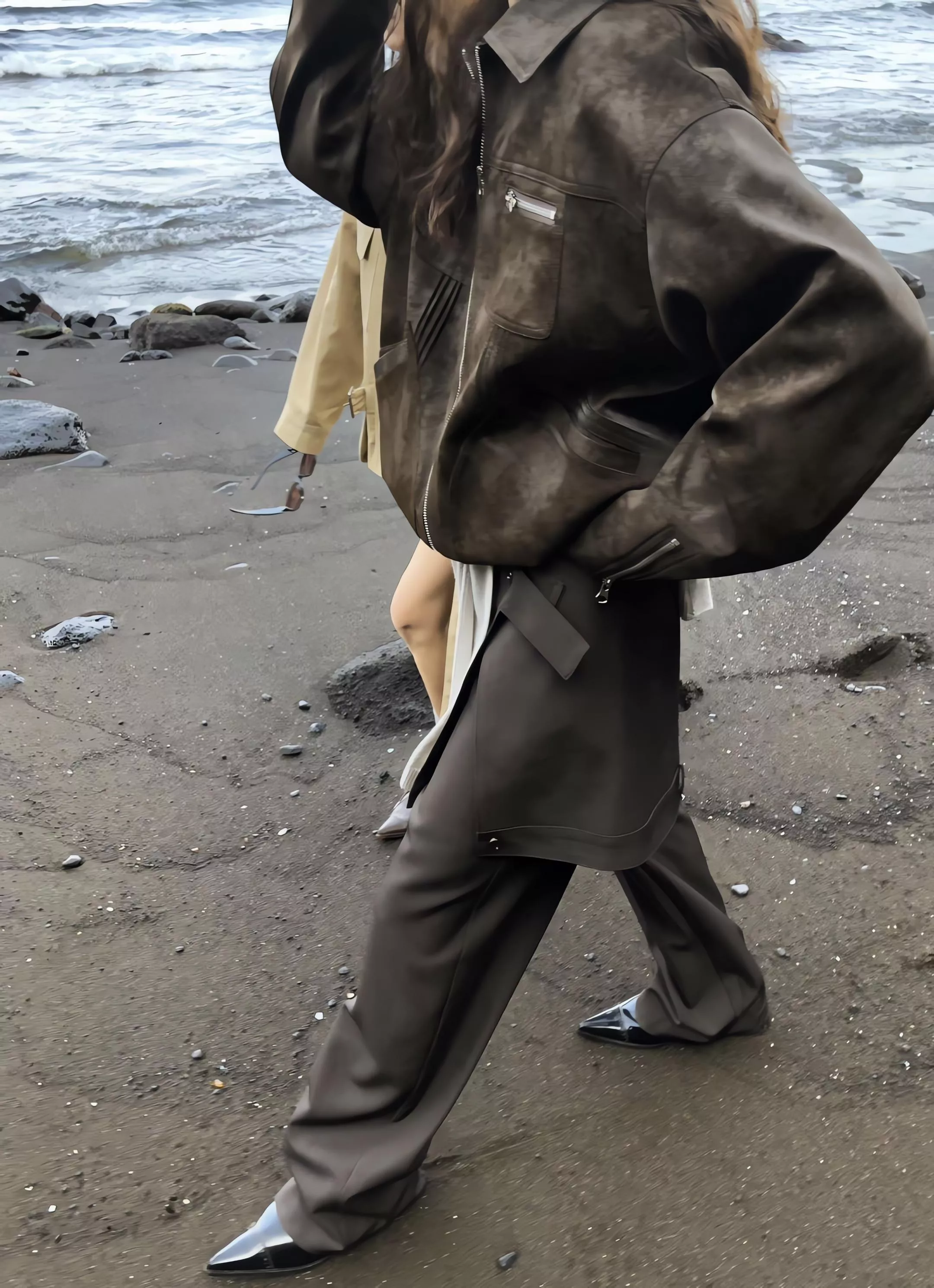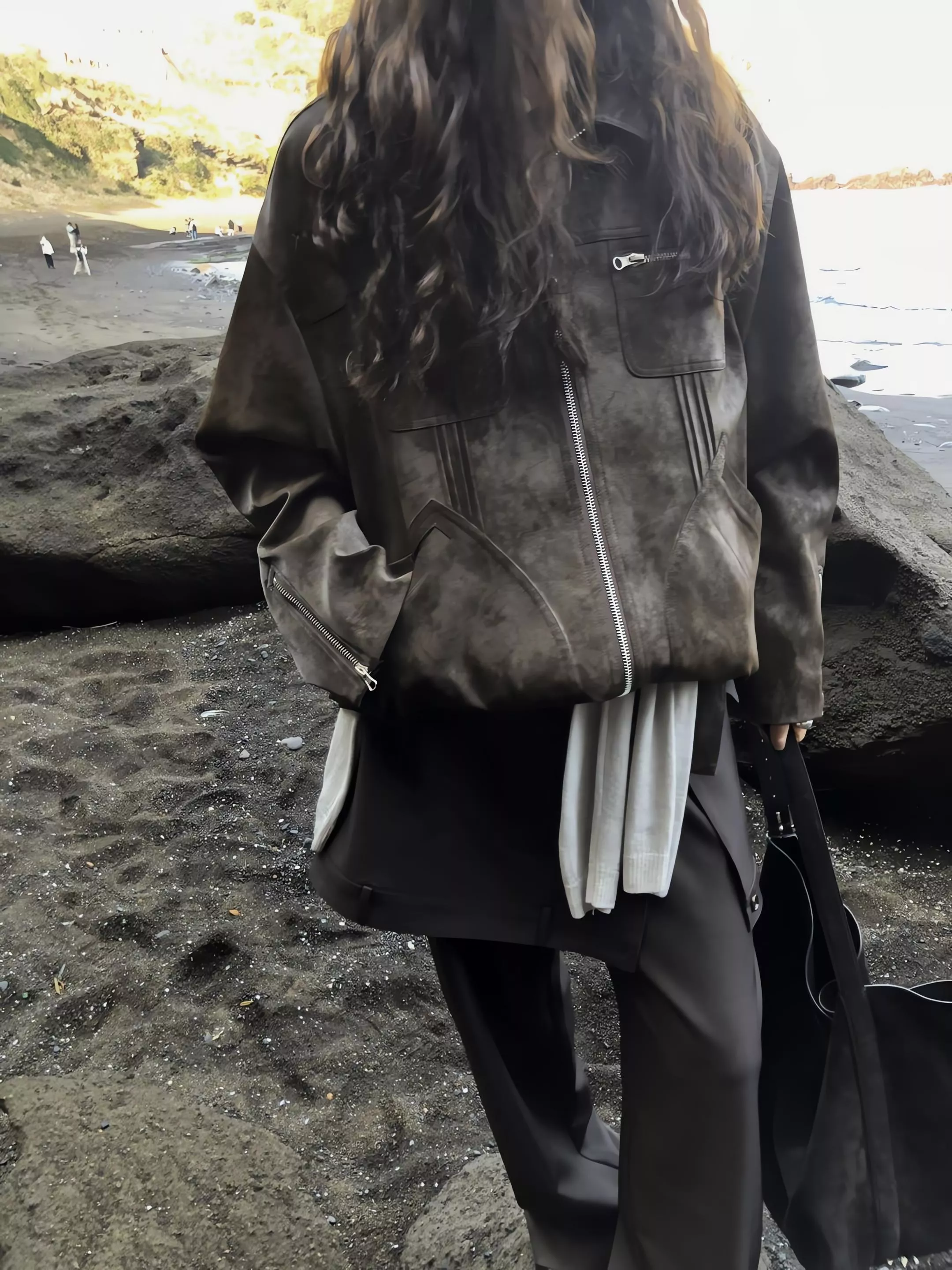 完美平衡了「剛與柔」的皮衣外套,工裝感的拉鍊元素與下擺織帶,展現中性魅力,而細膩的表面處理又保留了溫柔的觸感。