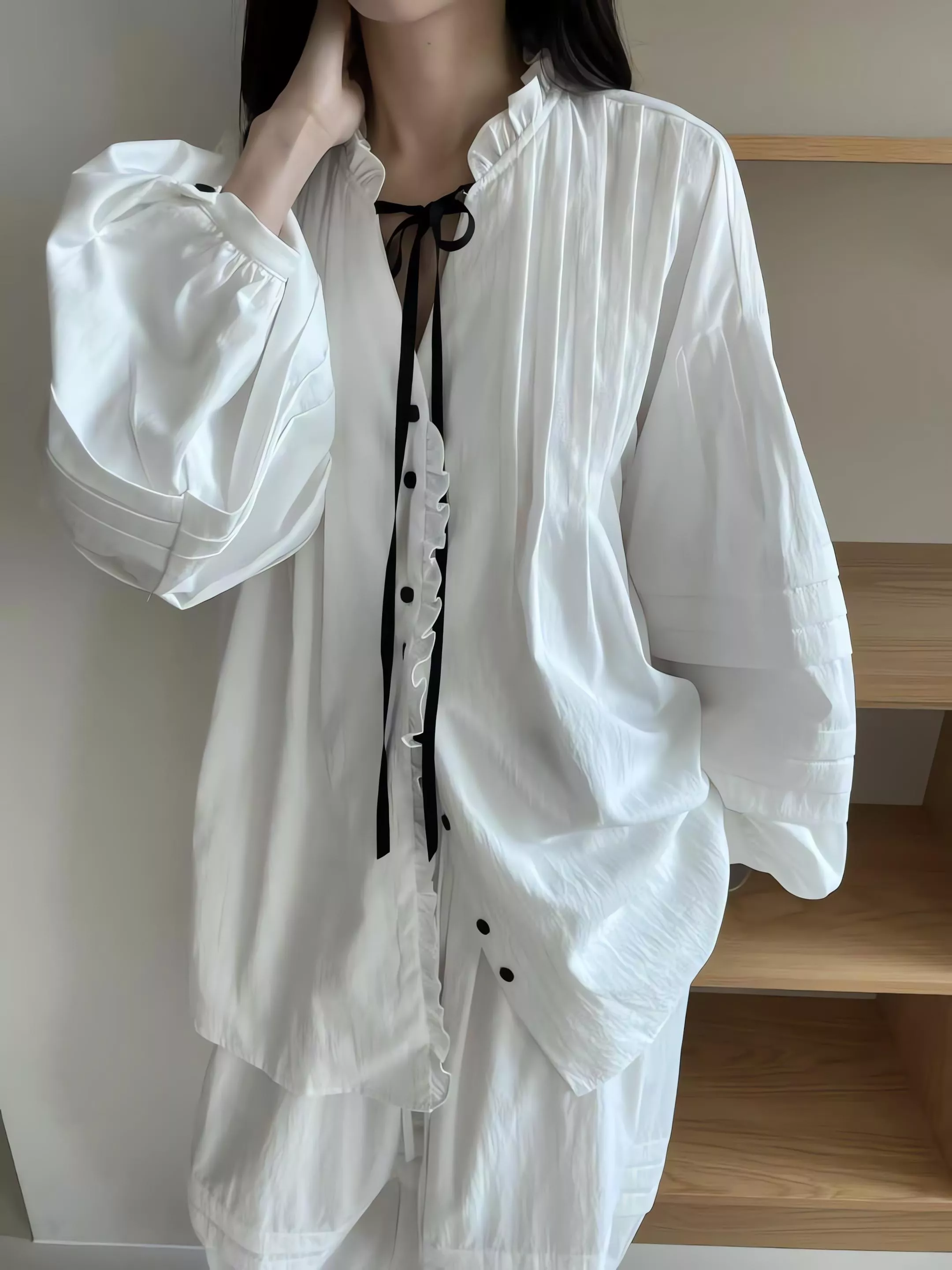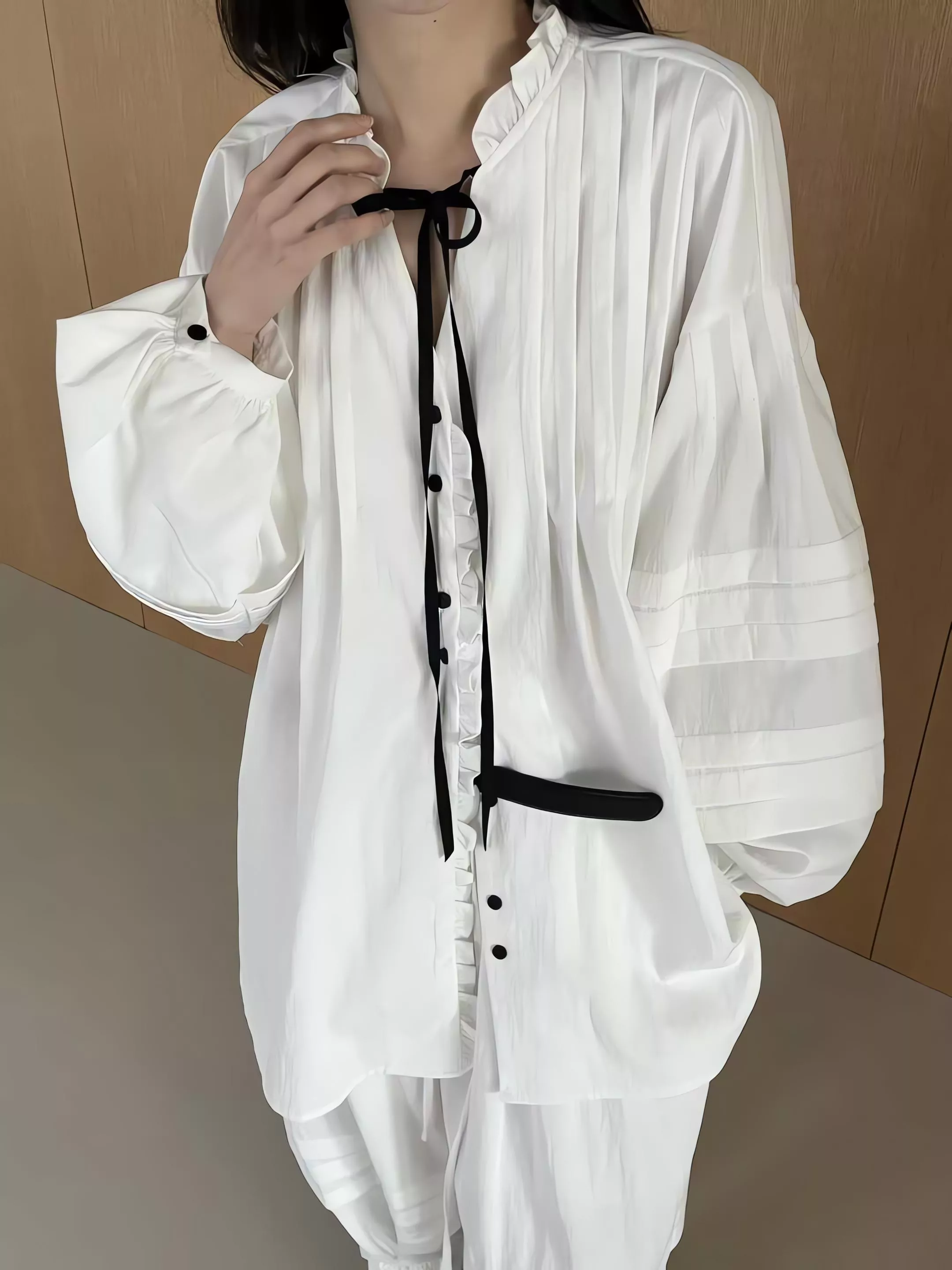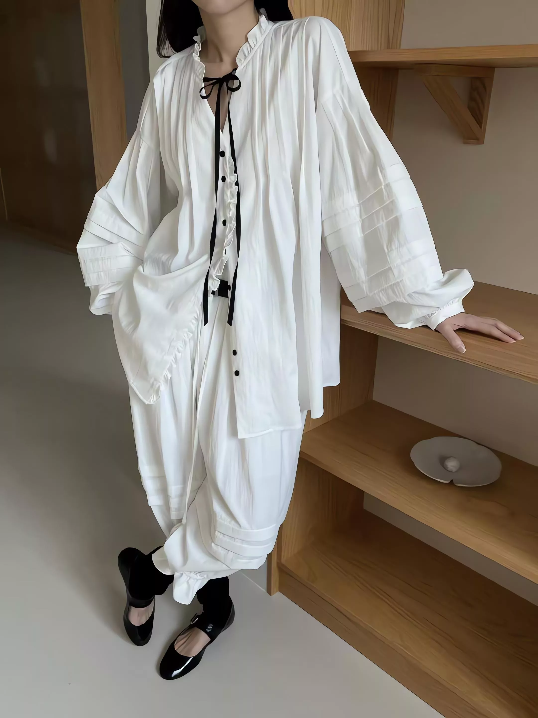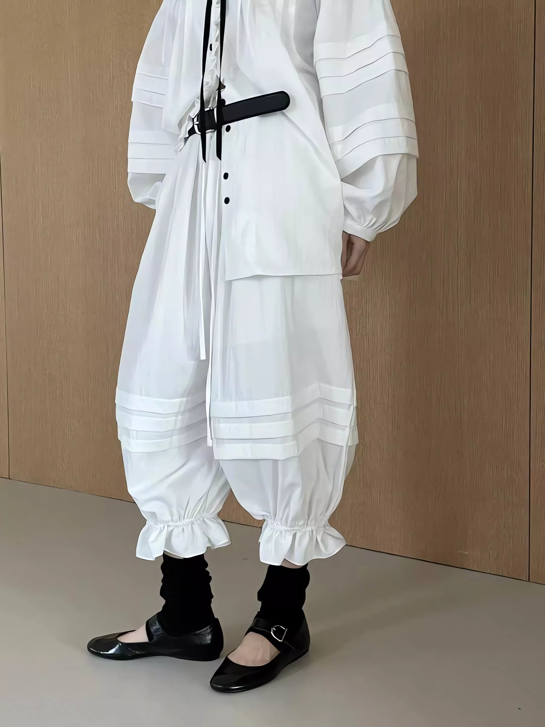 TomGirl 法式立領風琴摺綁帶襯衫 復古層次壓褶束口燈籠褲