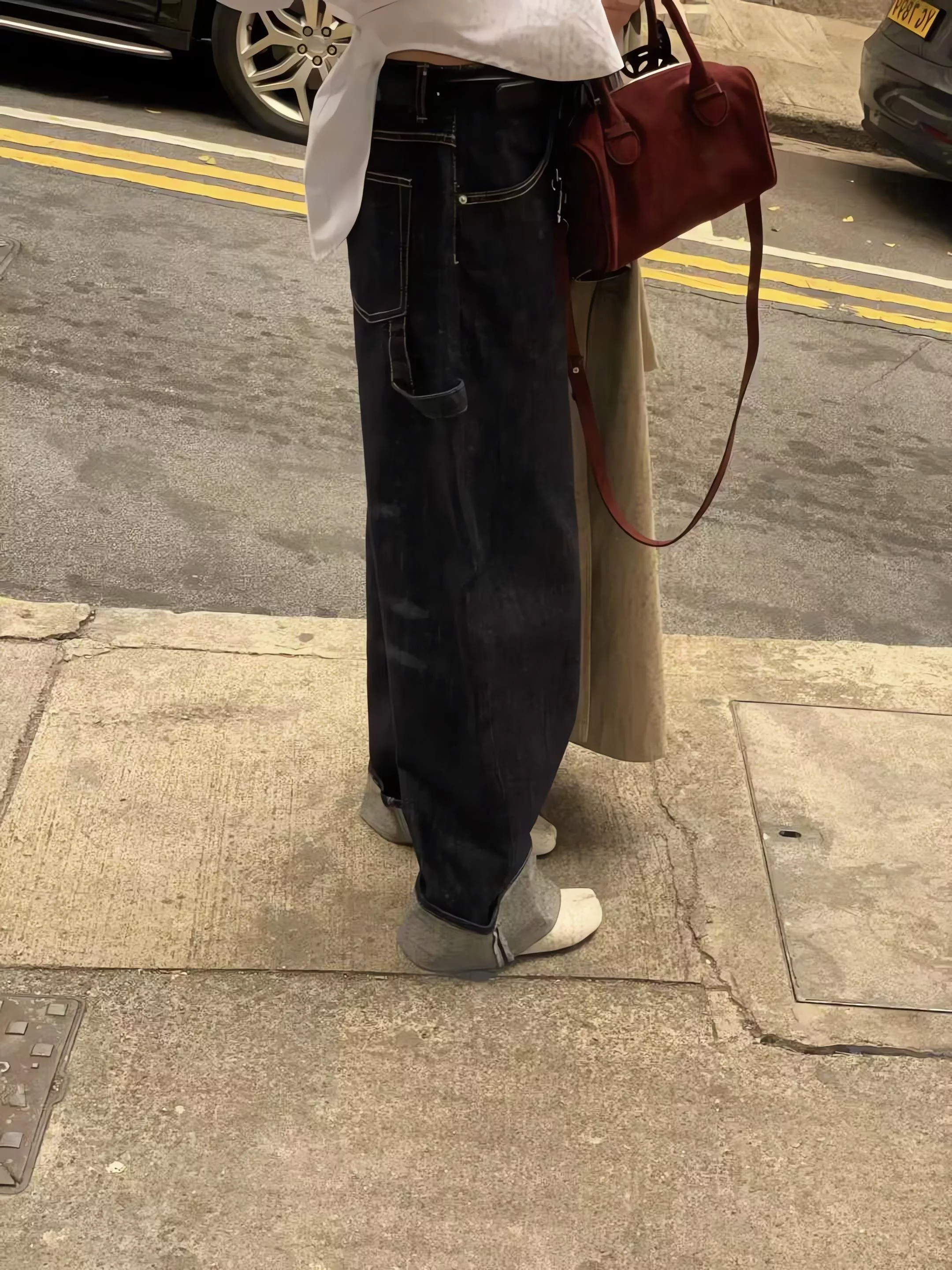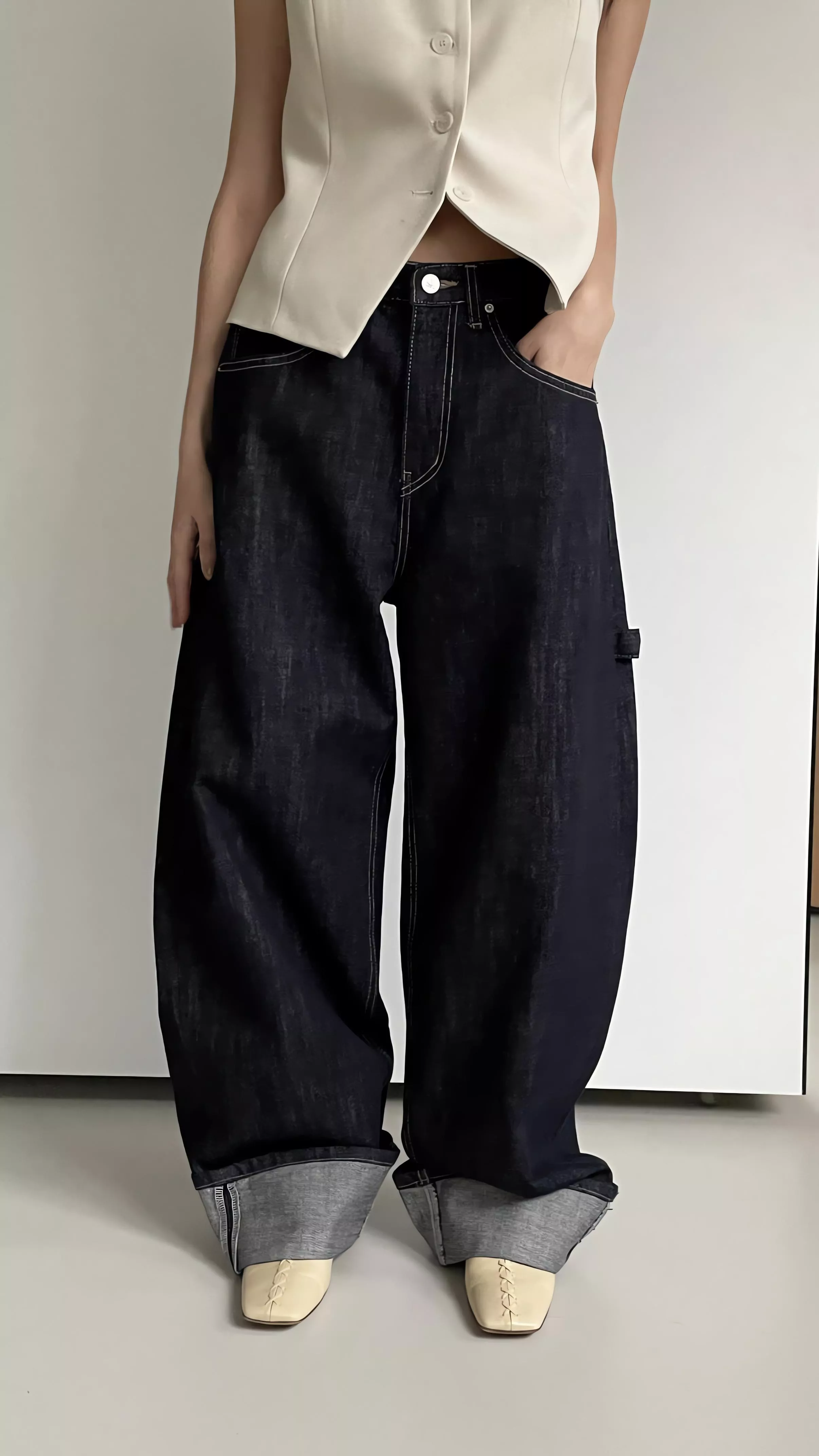Tom Girl 不掉色反折丹寧工裝牛仔寬褲