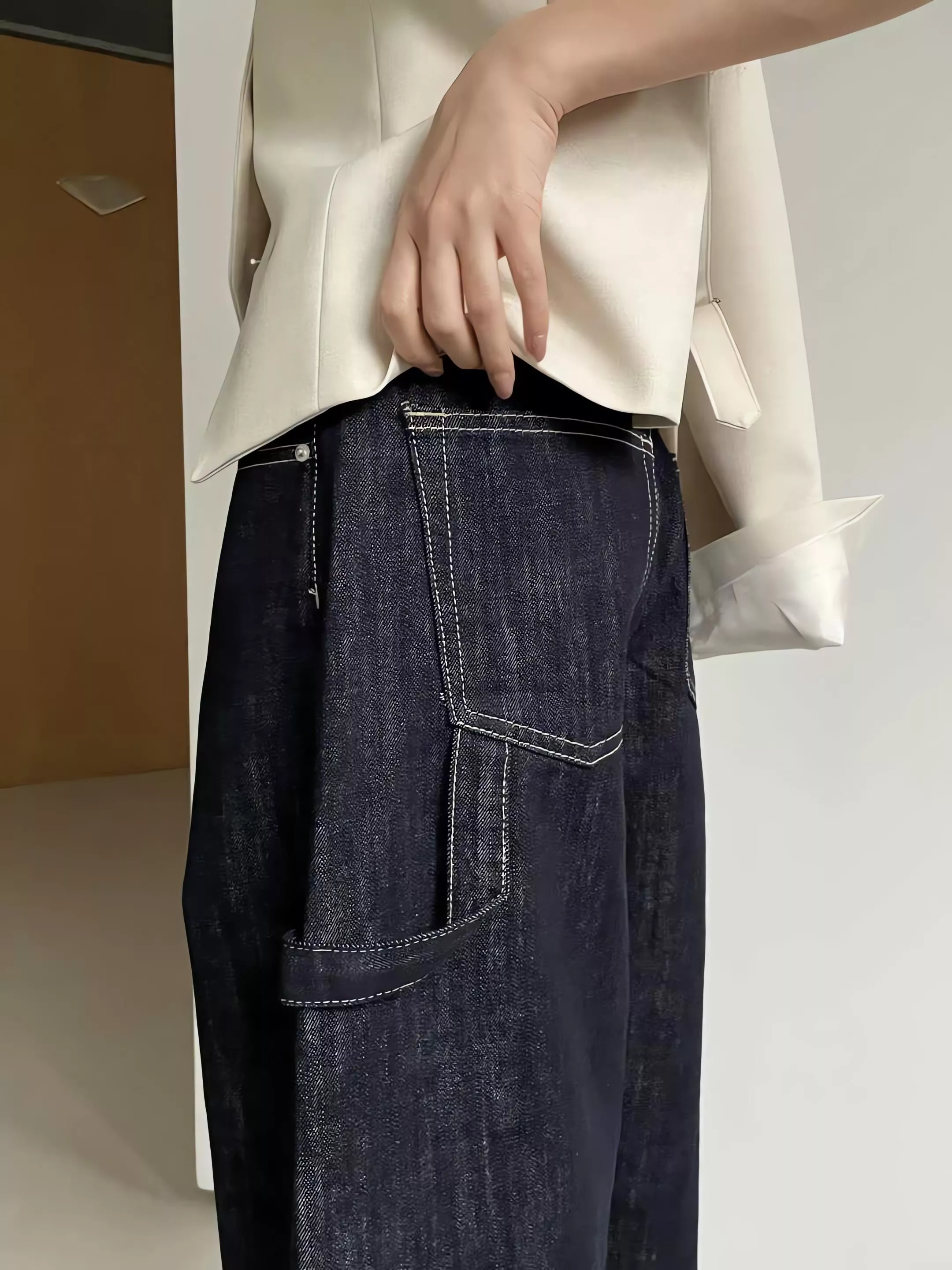 翻面清洗:洗滌時建議將褲子翻至反面,並使用中性洗劑,這能更長久地守護那道深邃的原色。