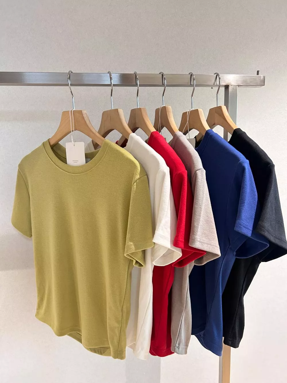這款短 T 採用了細膩的雷縈(Rayon)混紡材質,比起一般的棉質面料,手感更加柔軟Q彈。輕盈的材質能自然貼合身形,卻不會有束縛感,讓修身版型也能穿出自在的空間感。