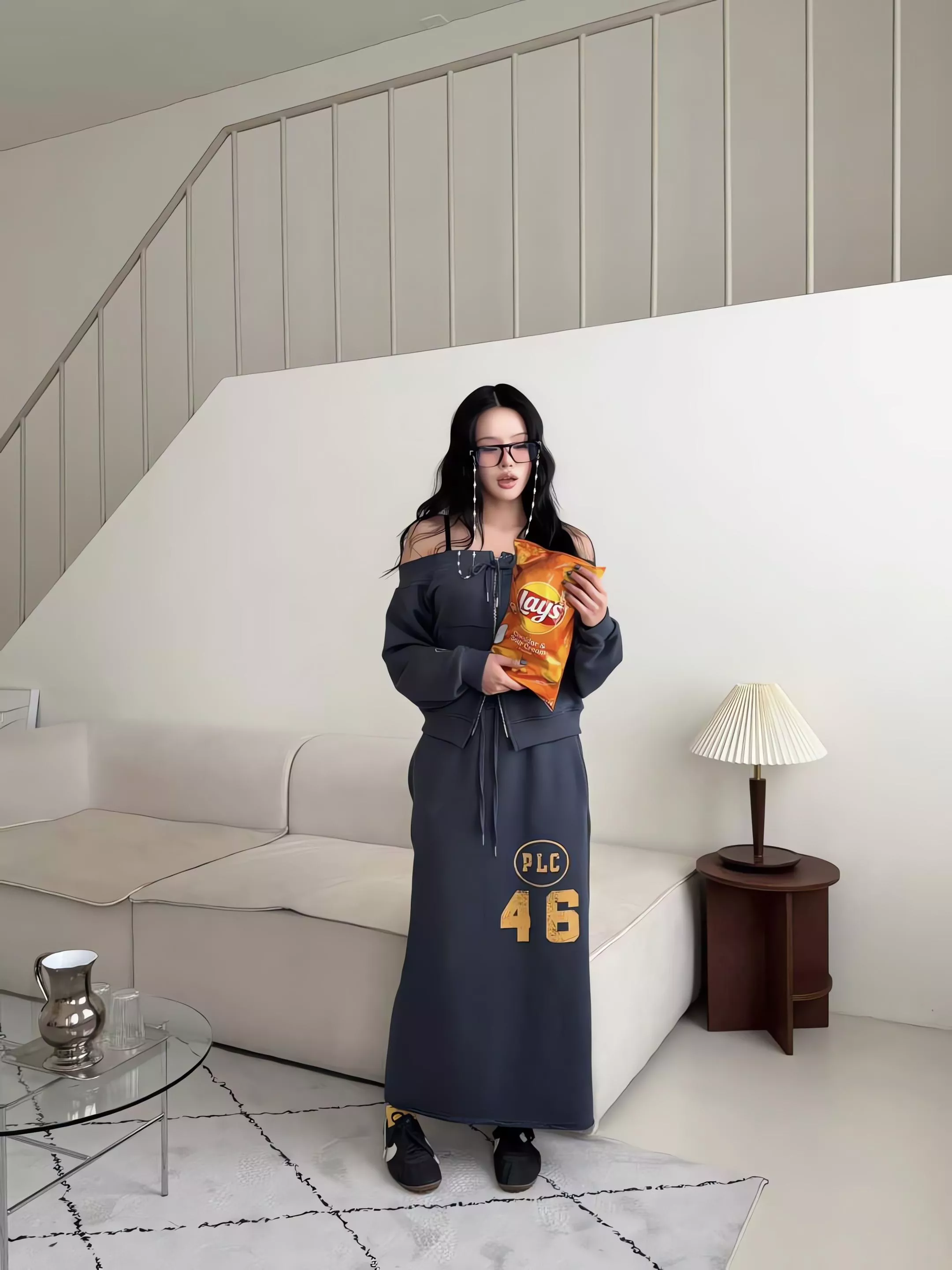 打破了衛衣給人的厚重印象。設計師把經典的美式復古元素,與帶點微辣的一字領平口剪裁結合,營造出一種率性與慵懶並存的「鬆弛感」。
