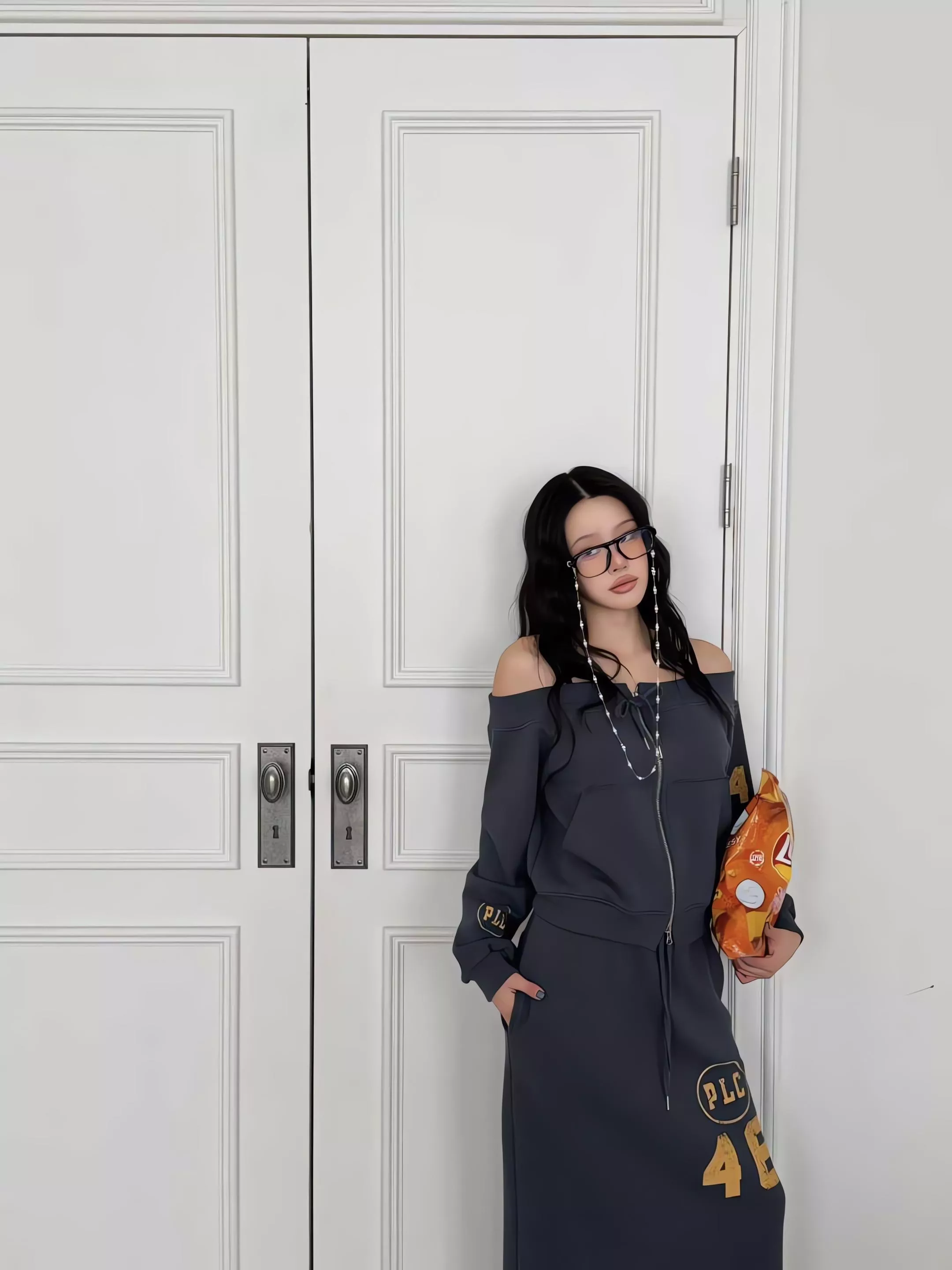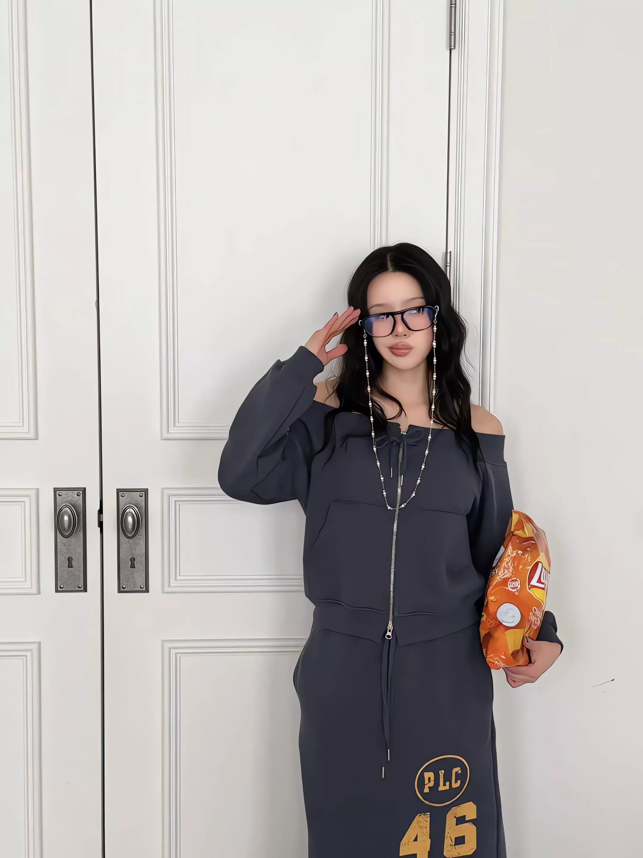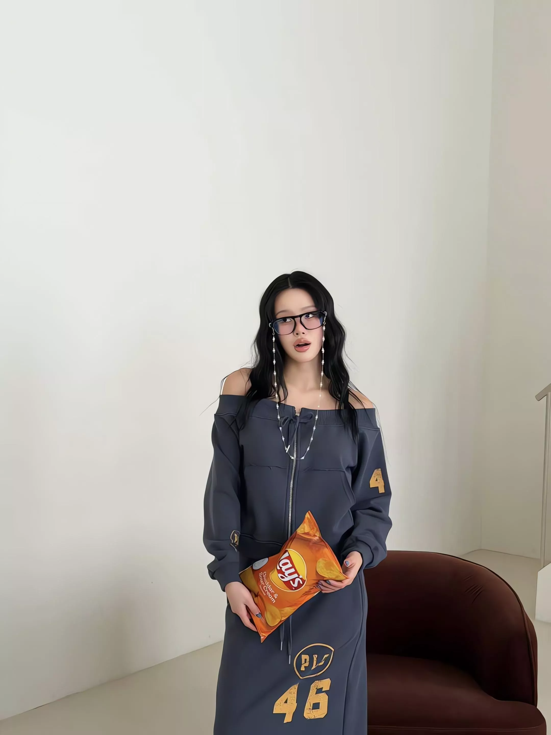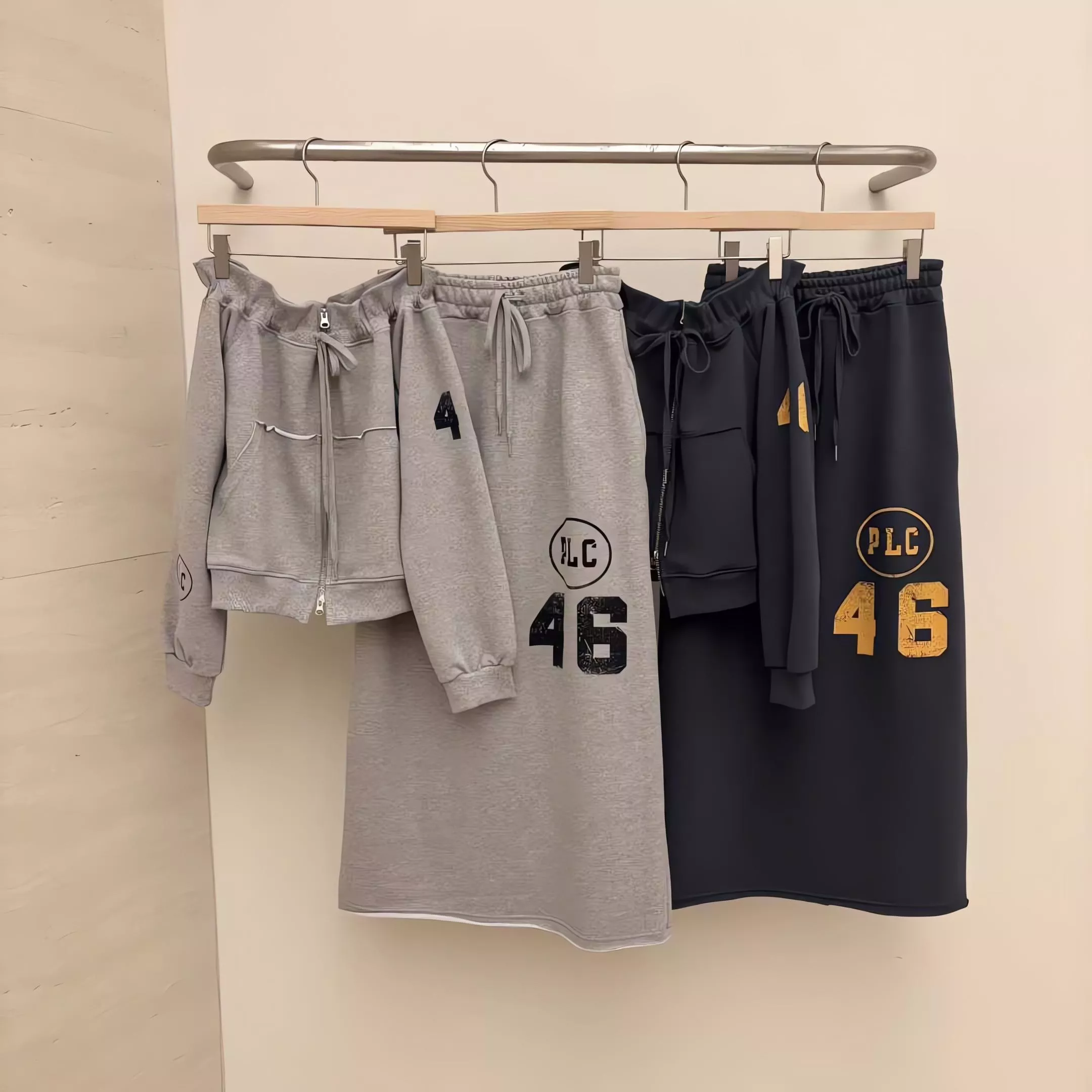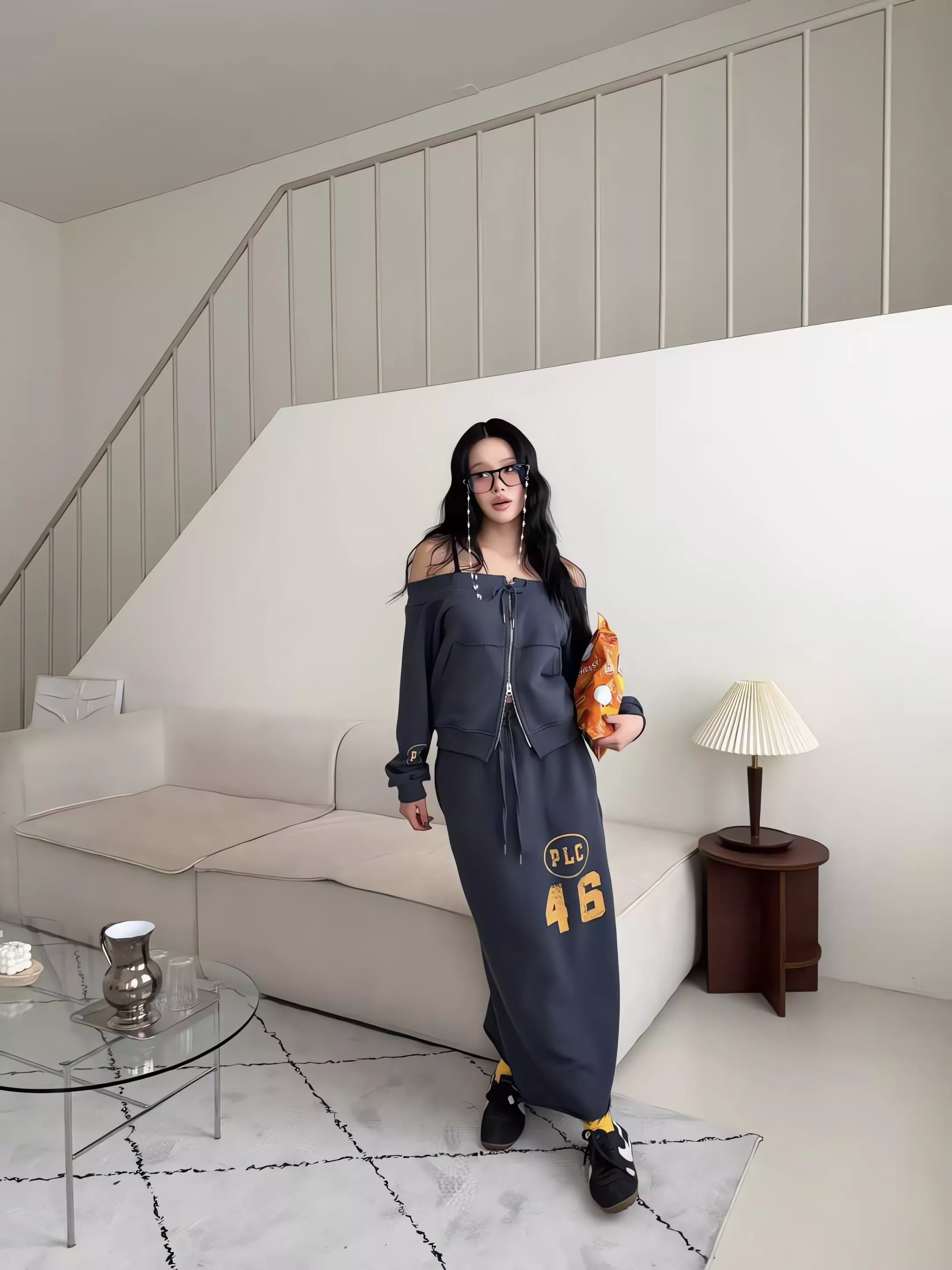 LAIVE 美式復古印花 一字領平口拉鍊衛衣 後開衩束口抽繩長裙兩件套