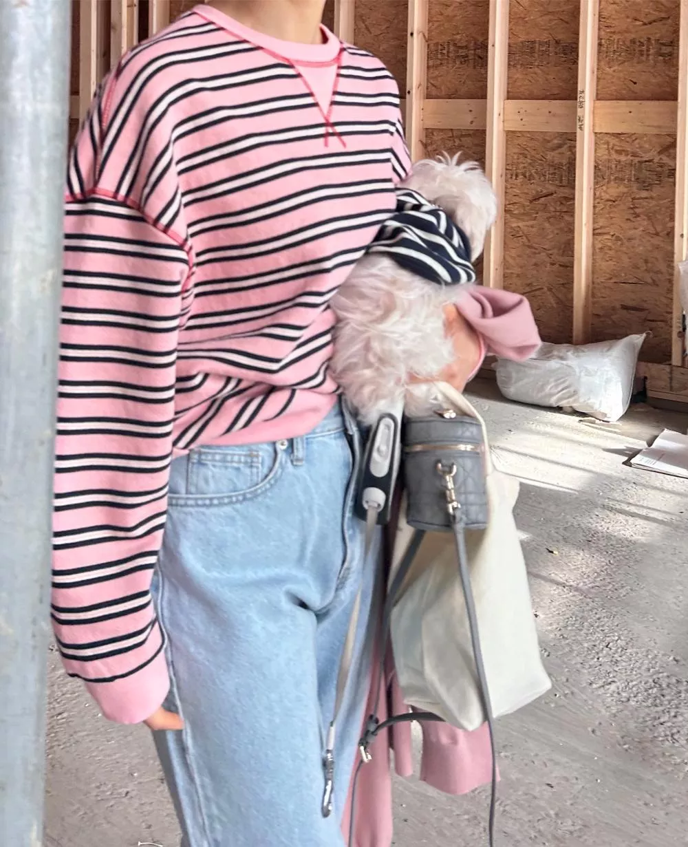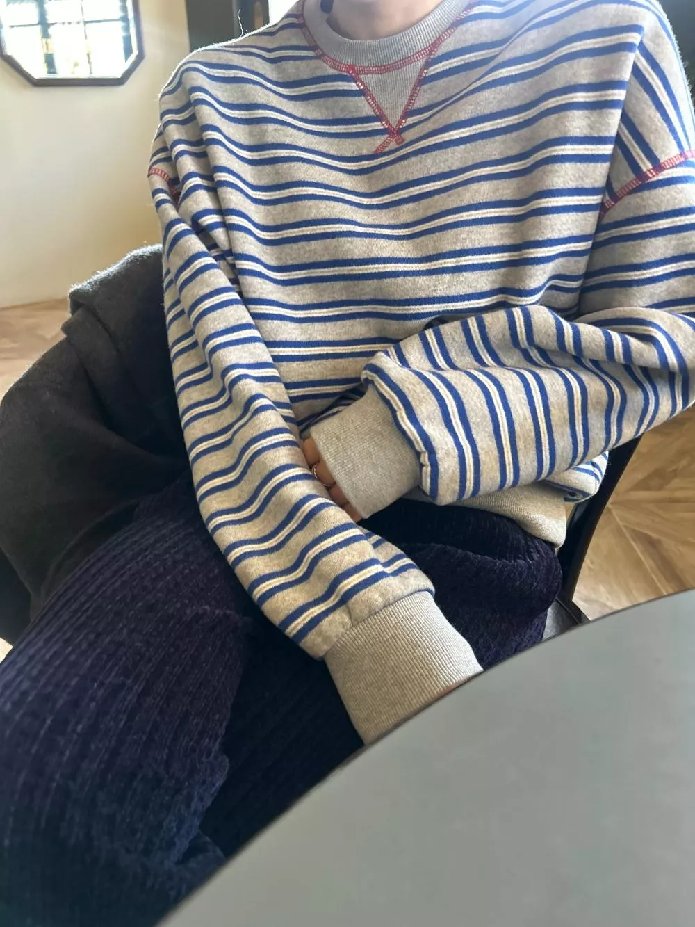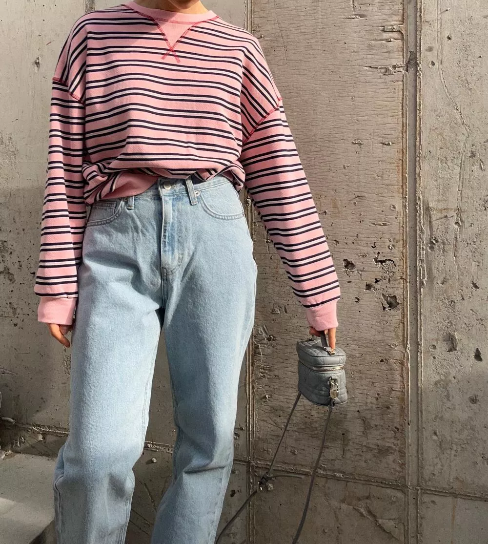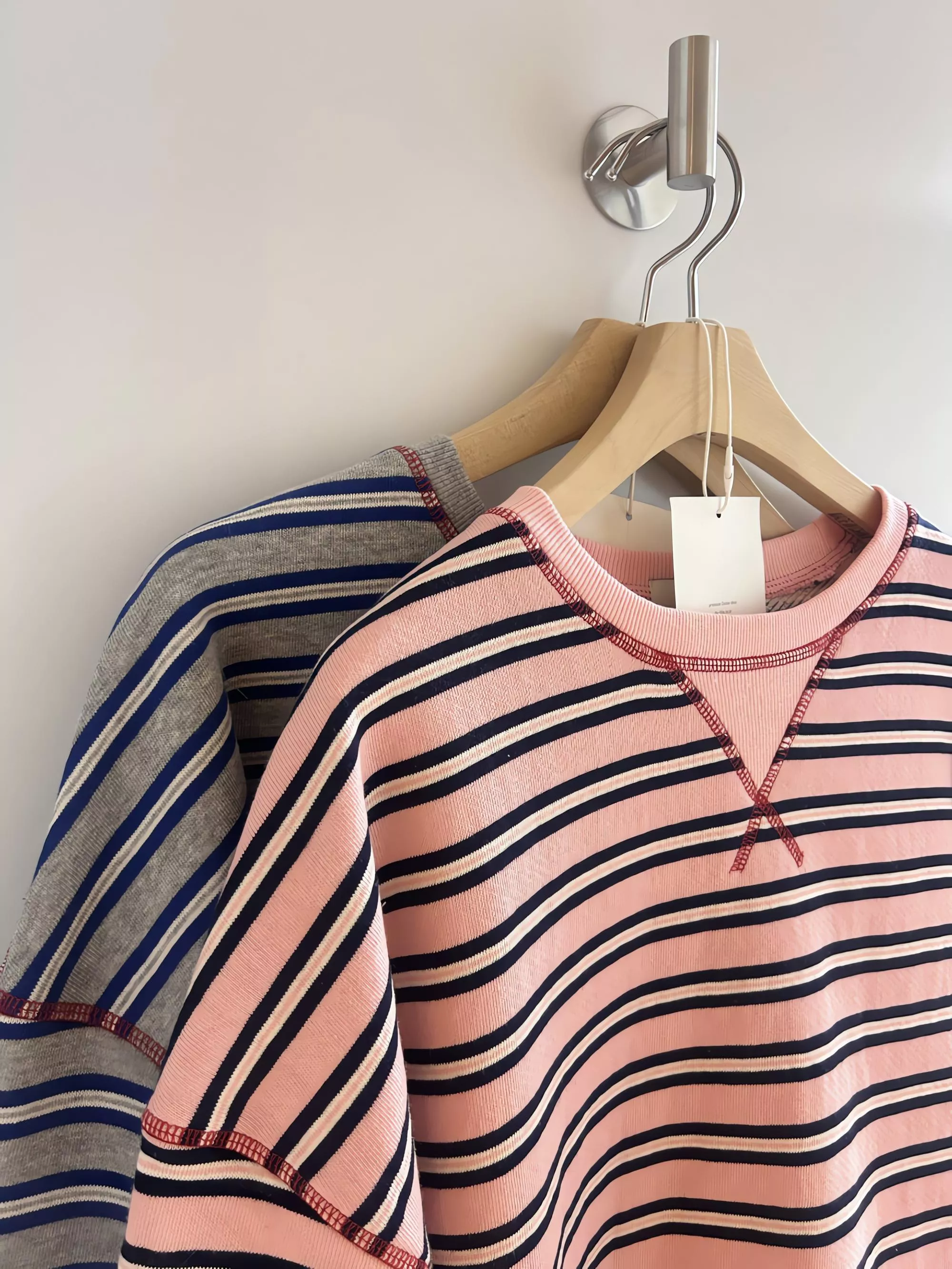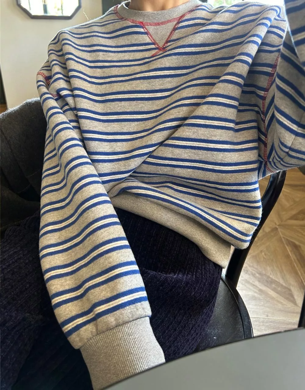 領口經典的 V-Stitch,特別選用了對比色縫線點綴,讓基本的條紋衫瞬間多了層次感,完全不單調。
