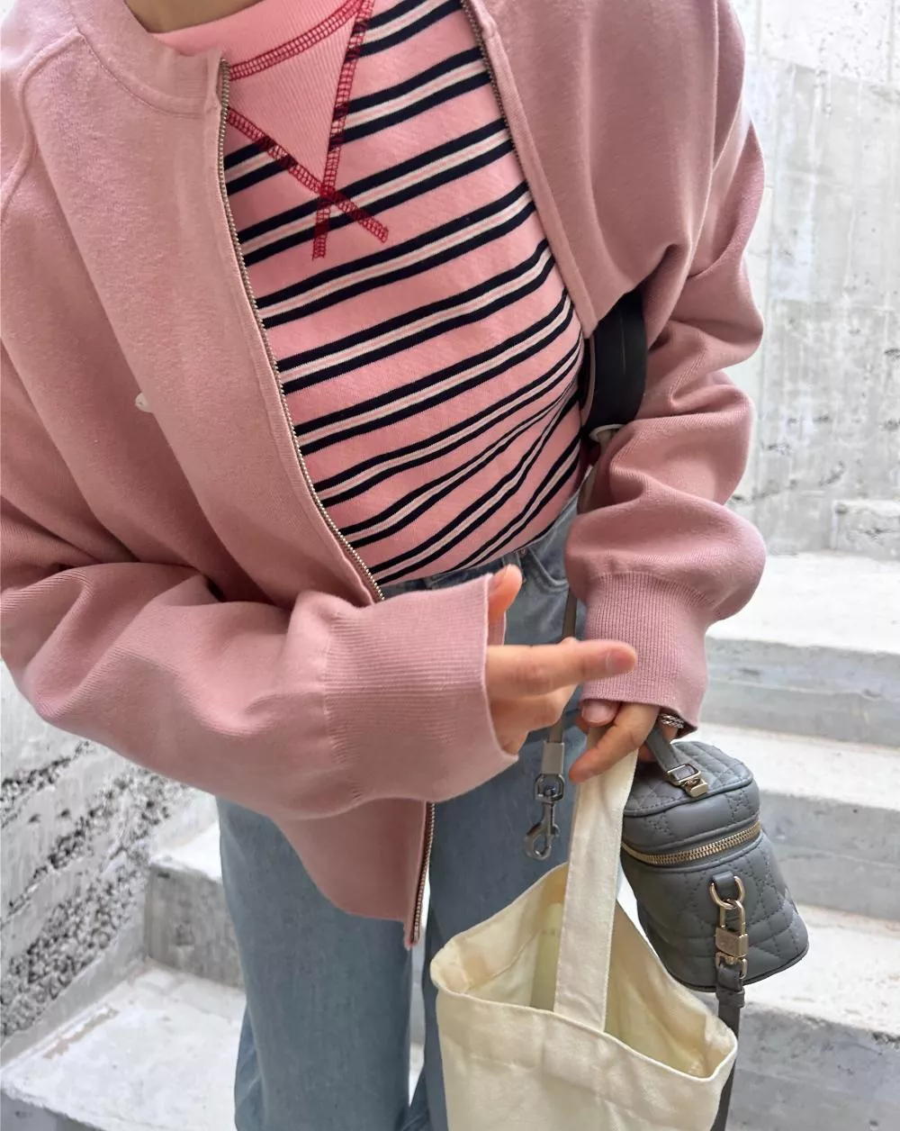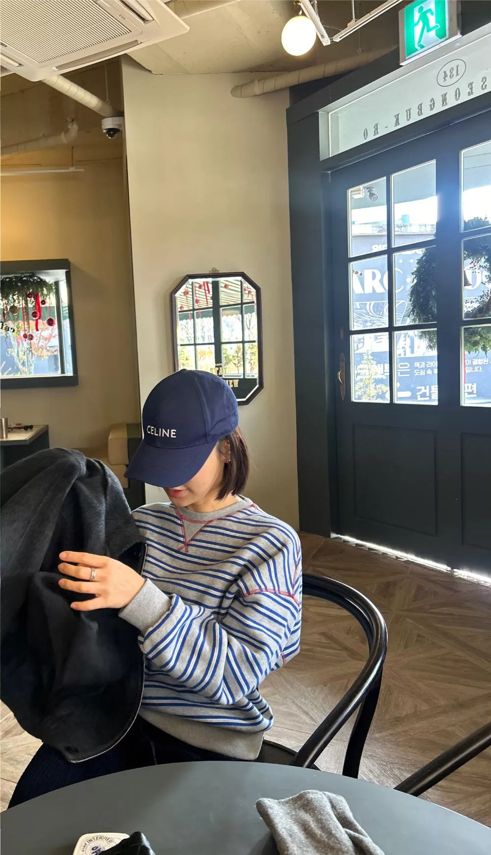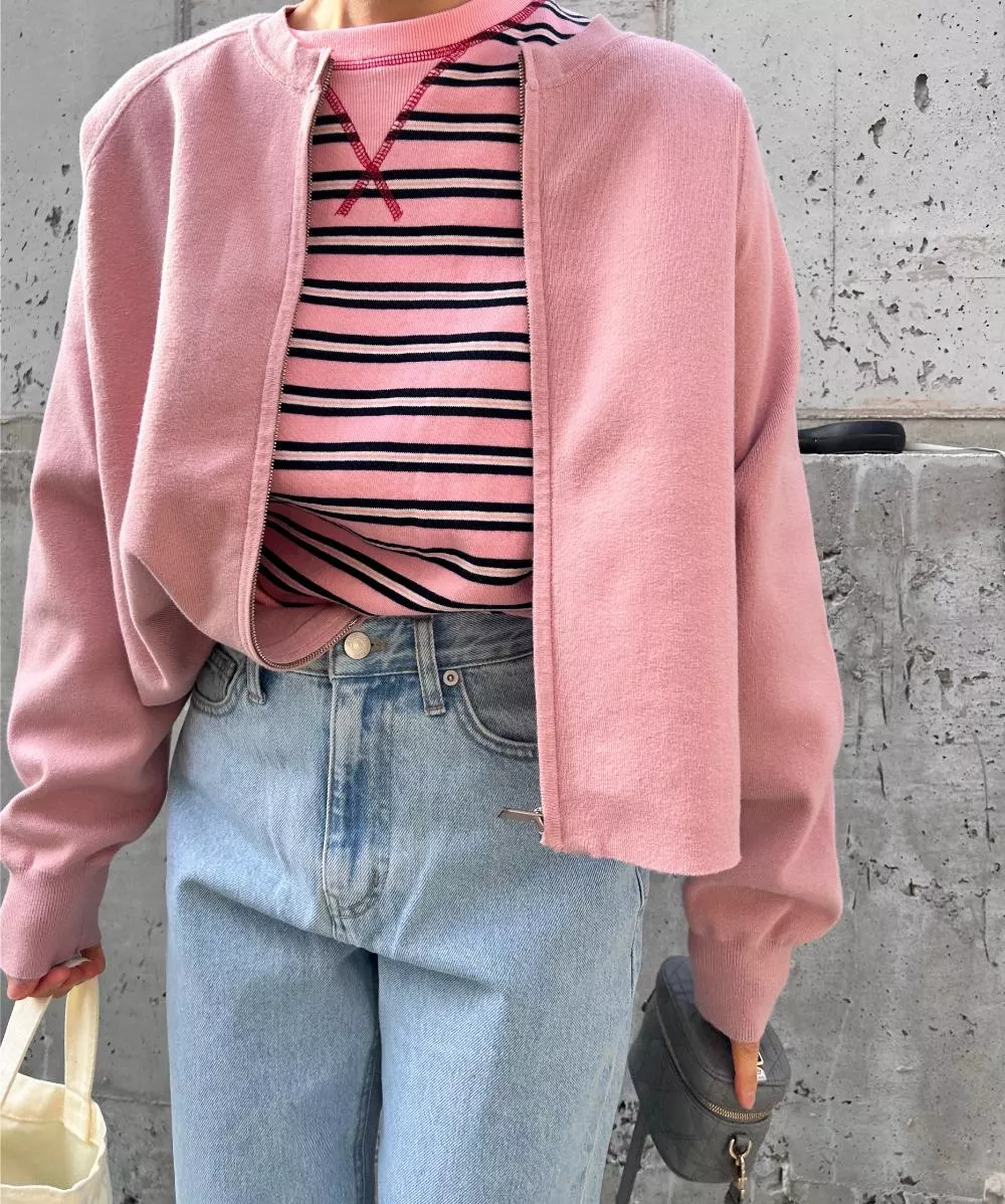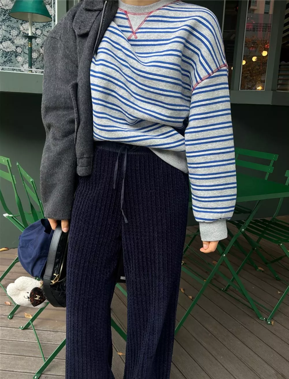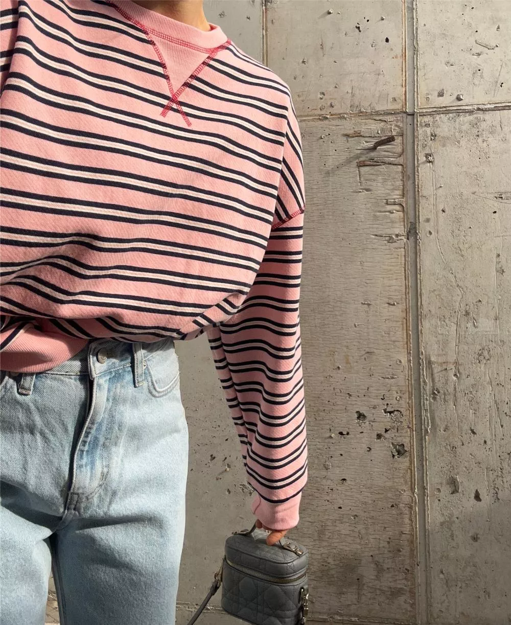 領口經典的 V-Stitch,特別選用了對比色縫線點綴,讓基本的條紋衫瞬間多了層次感,完全不單調。