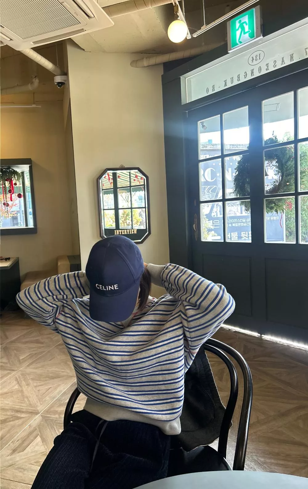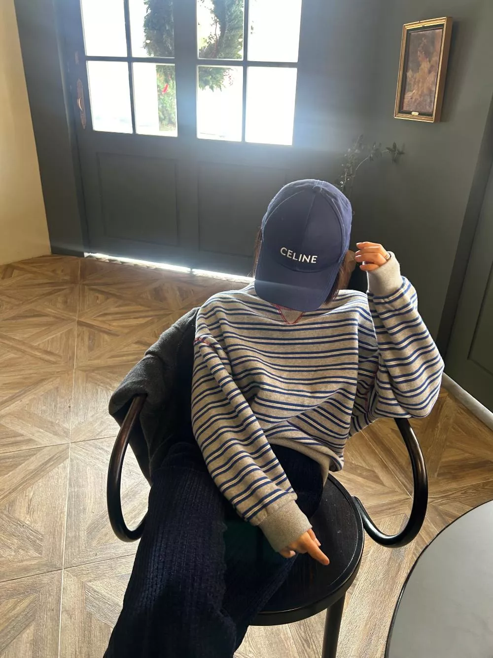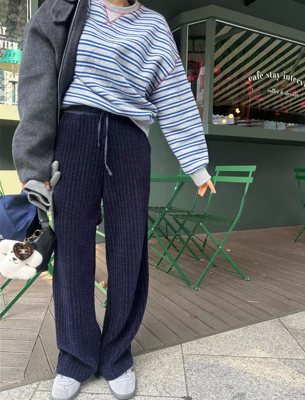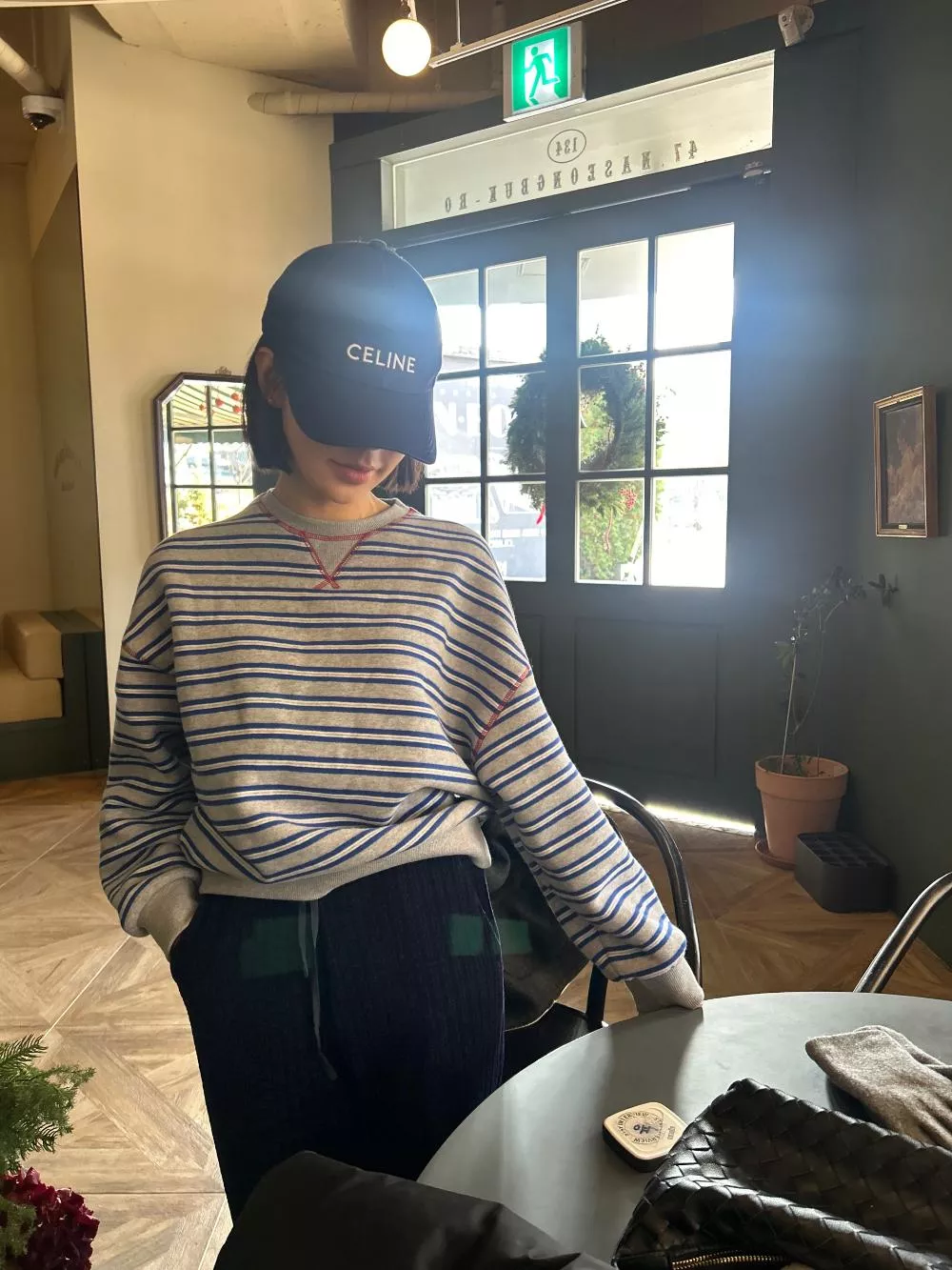 領口經典的 V-Stitch,特別選用了對比色縫線點綴,讓基本的條紋衫瞬間多了層次感,完全不單調。