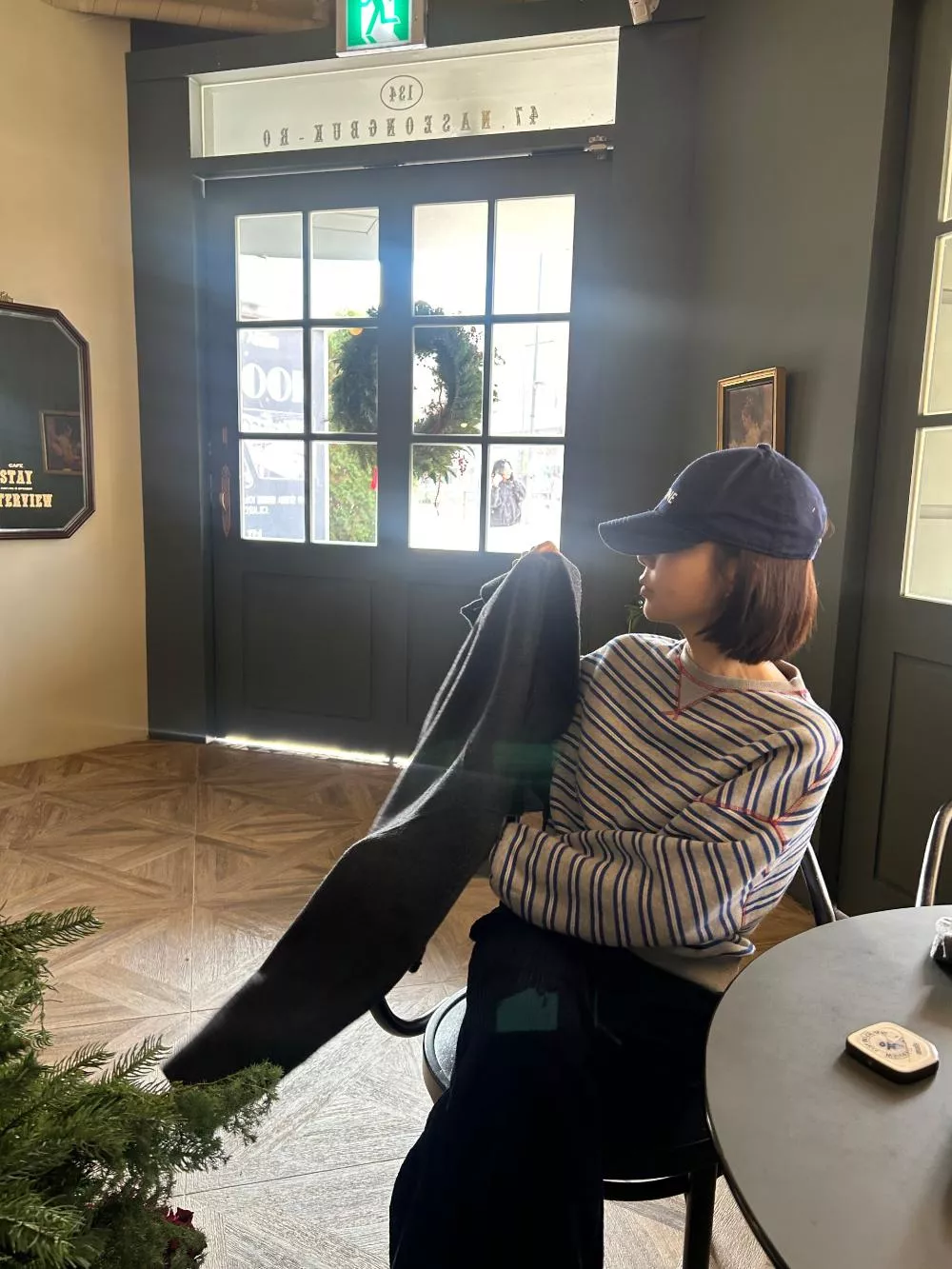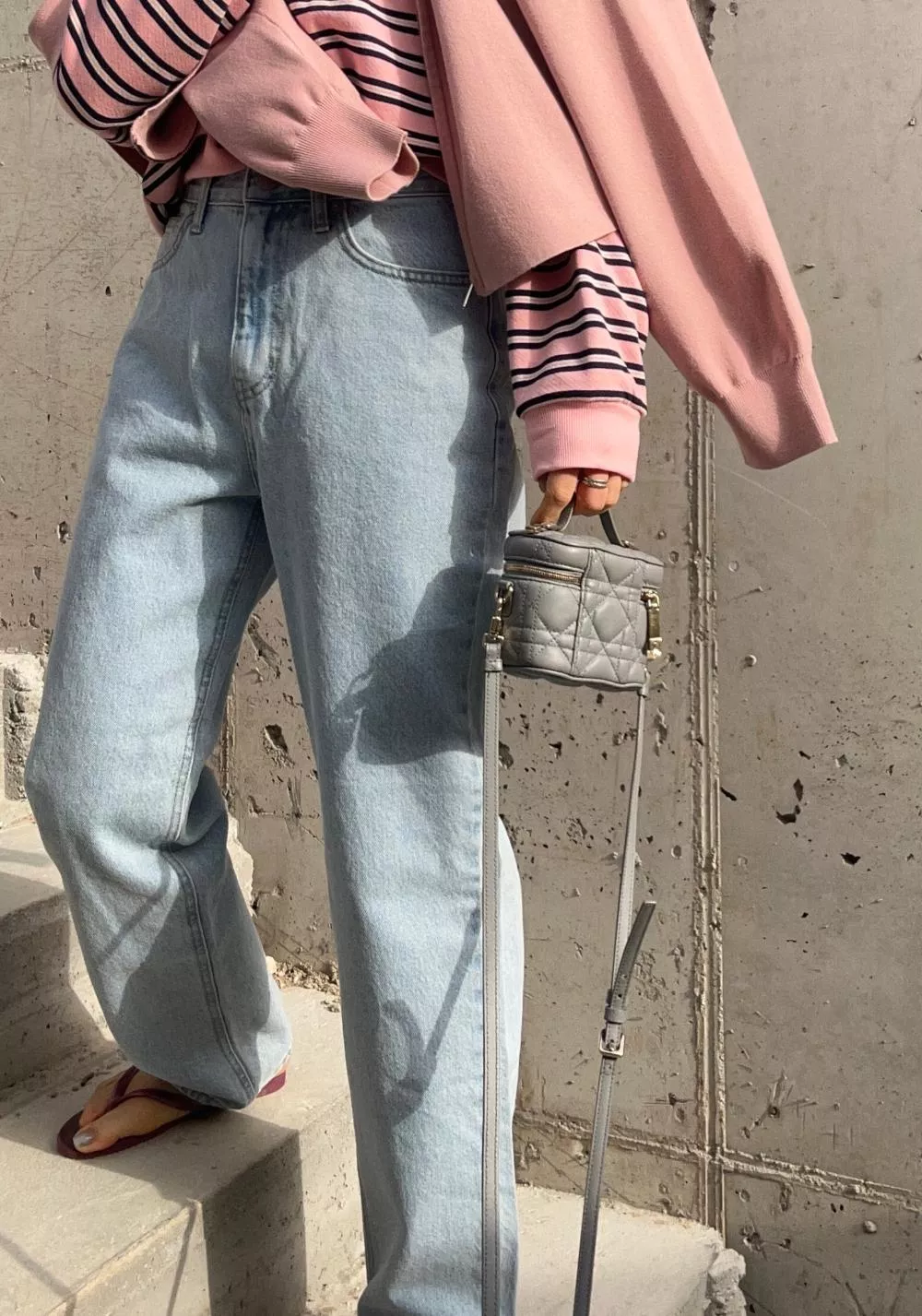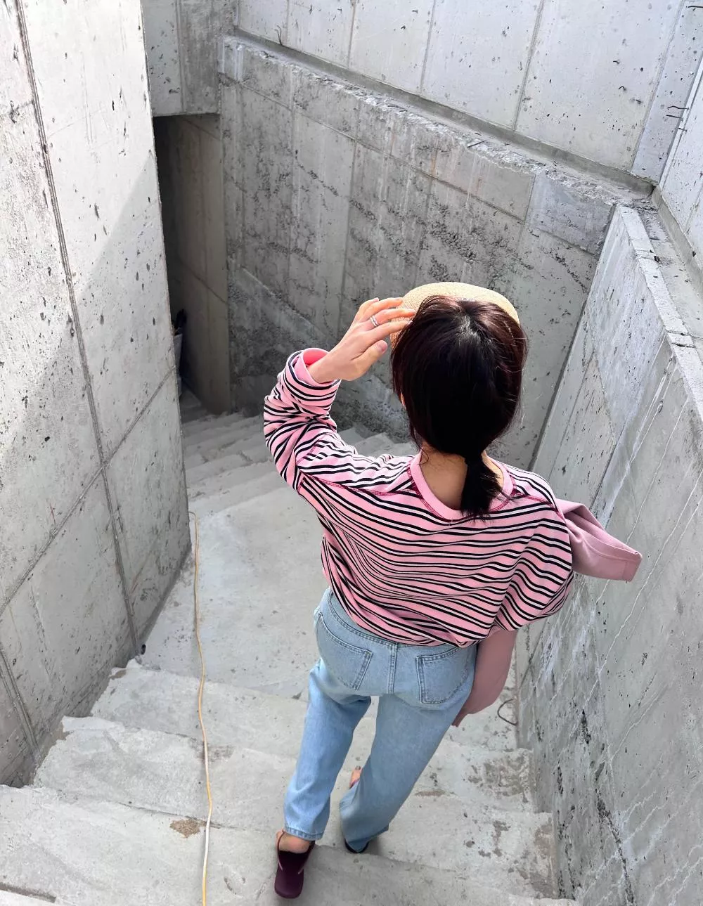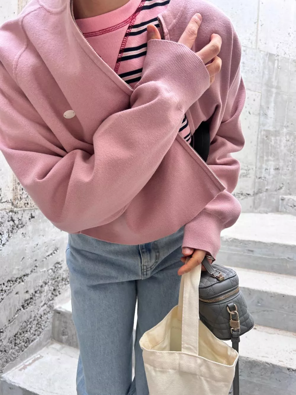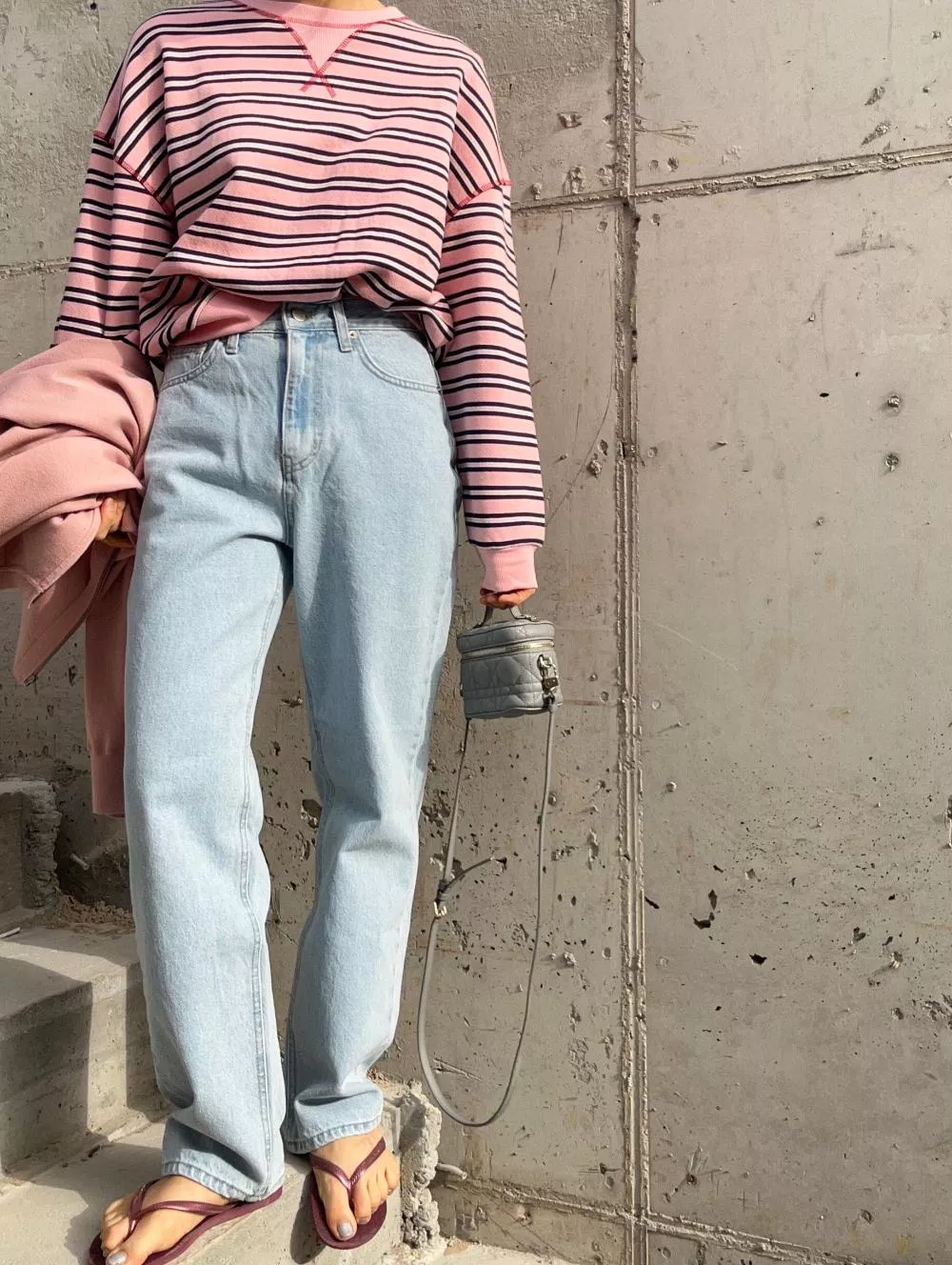 領口經典的 V-Stitch,特別選用了對比色縫線點綴,讓基本的條紋衫瞬間多了層次感,完全不單調。