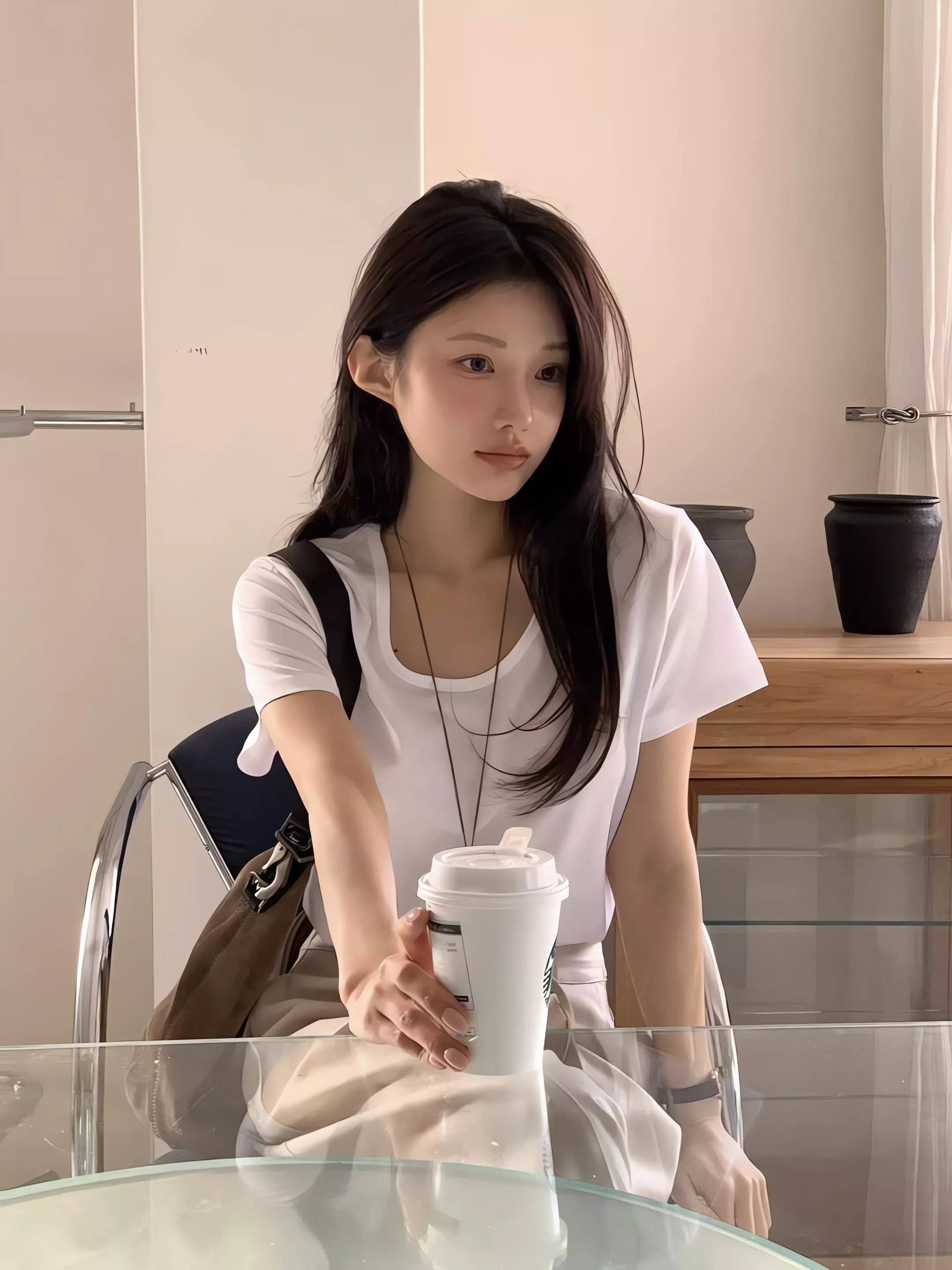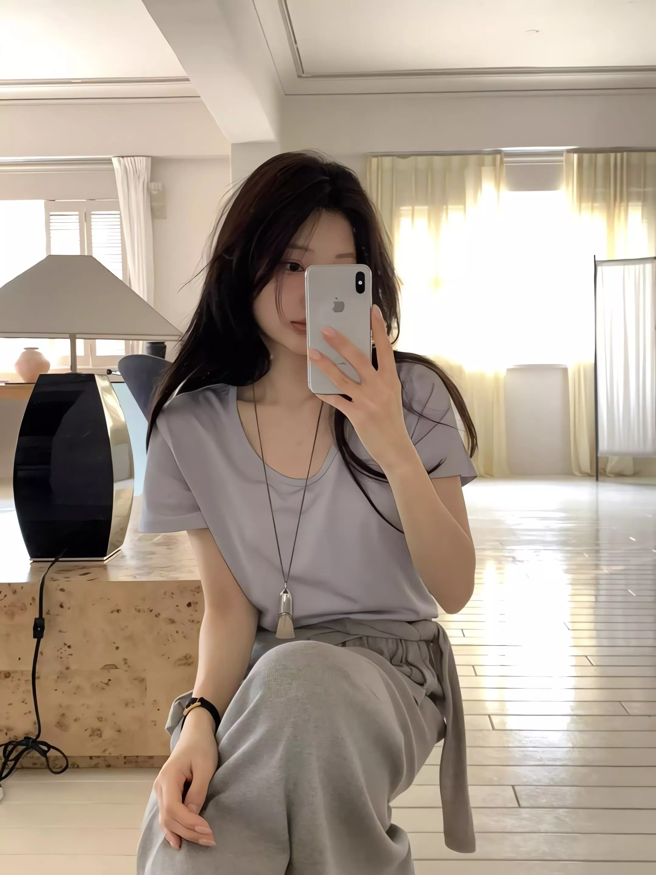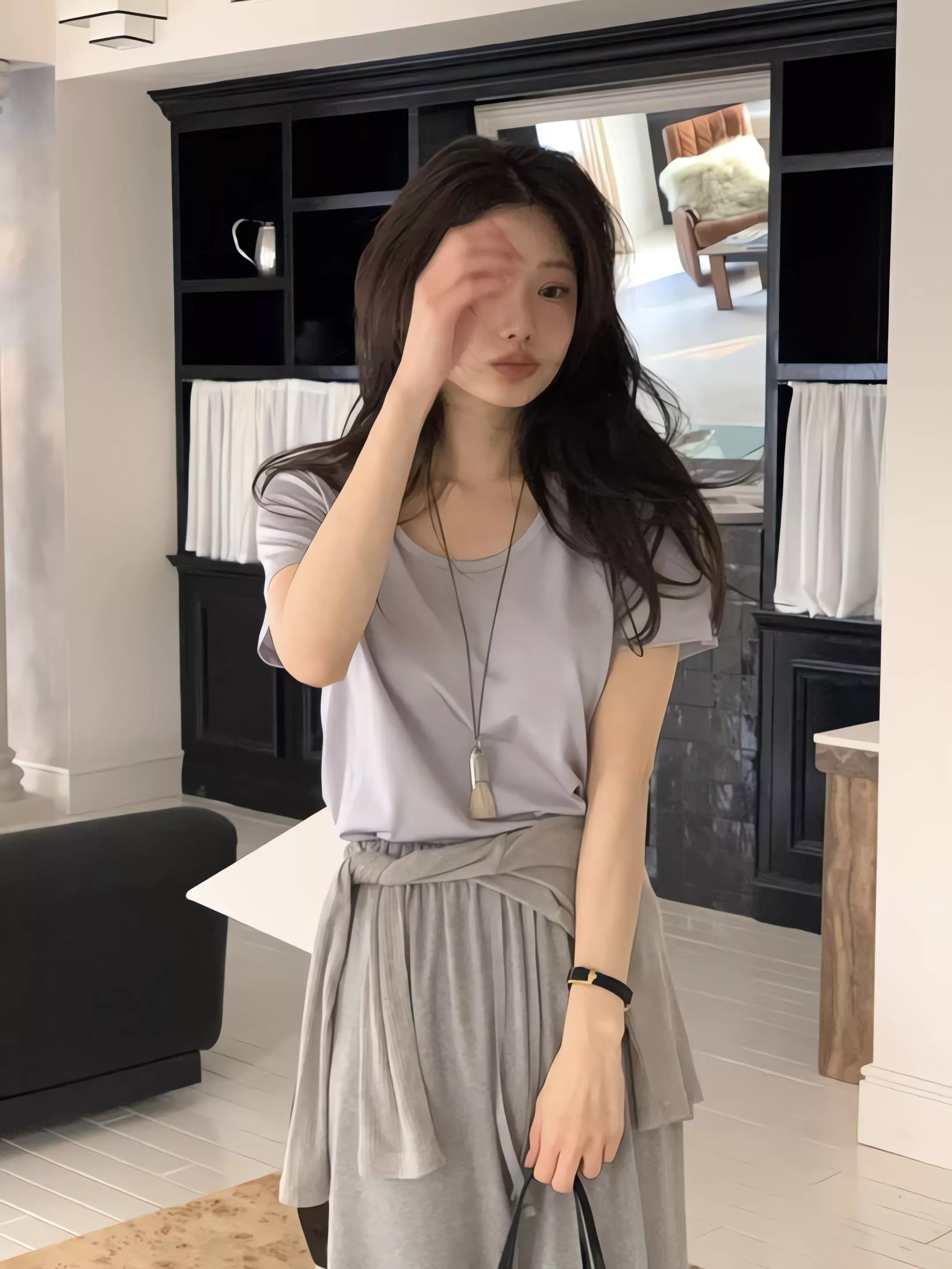 布料為棉混彈性纖維,手感柔軟,帶有明顯的彈性與滑順度,貼在肌膚上是輕薄、微涼的觸感,夏天穿也不悶。布料本身帶一點透感,單穿會有輕微的層次與空氣感,也很適合內搭或做疊穿使用,不會厚重,反而讓整體更輕。