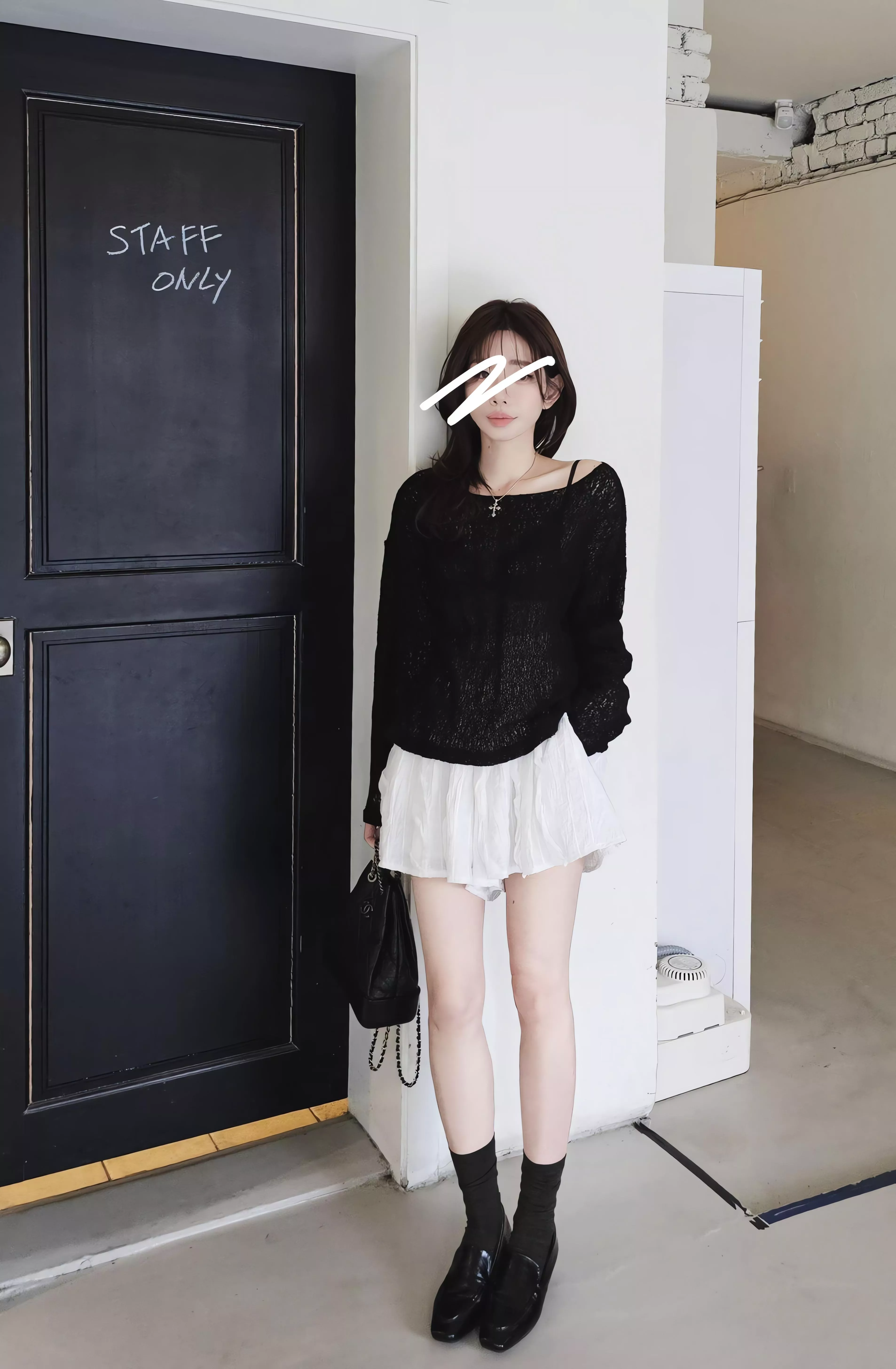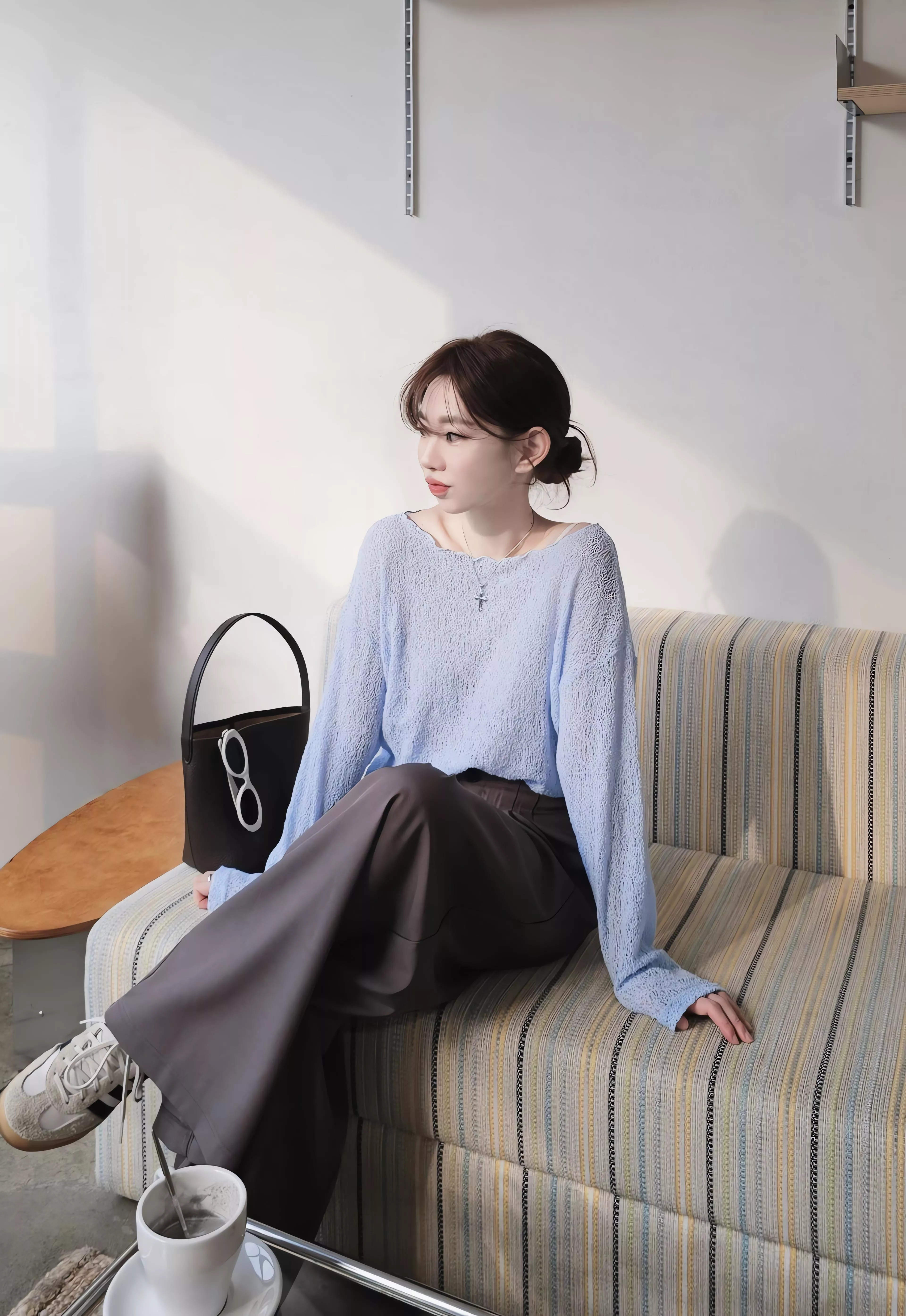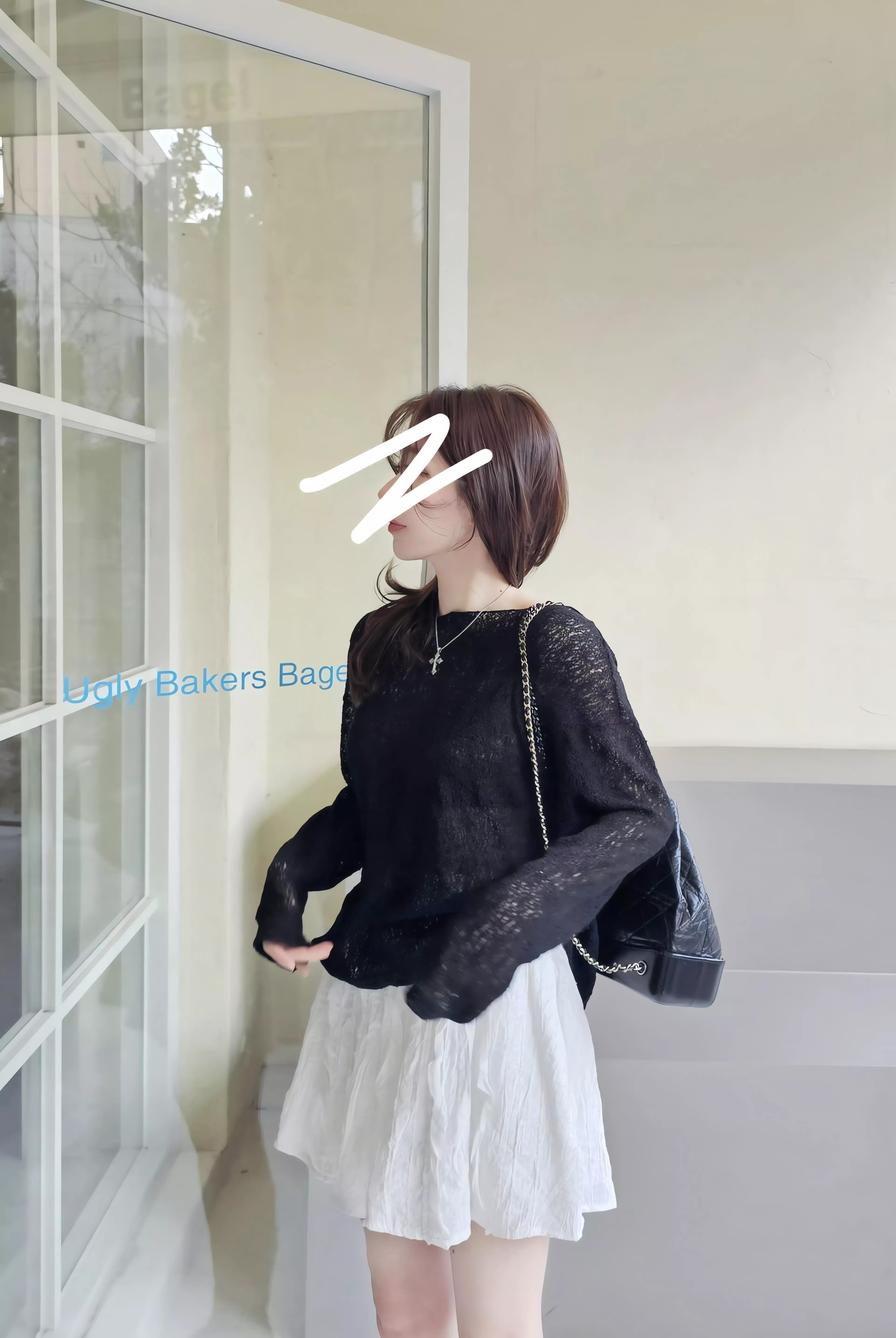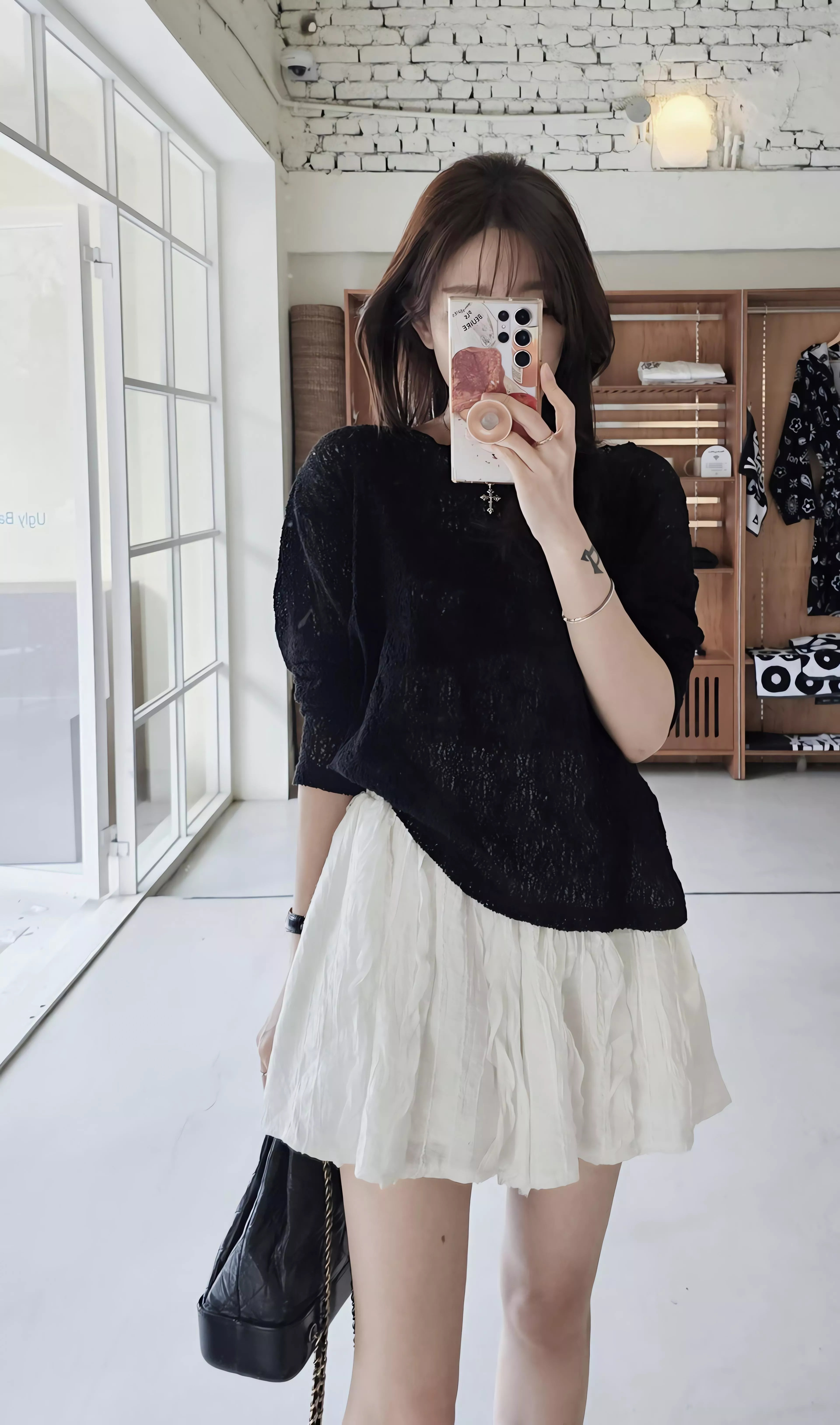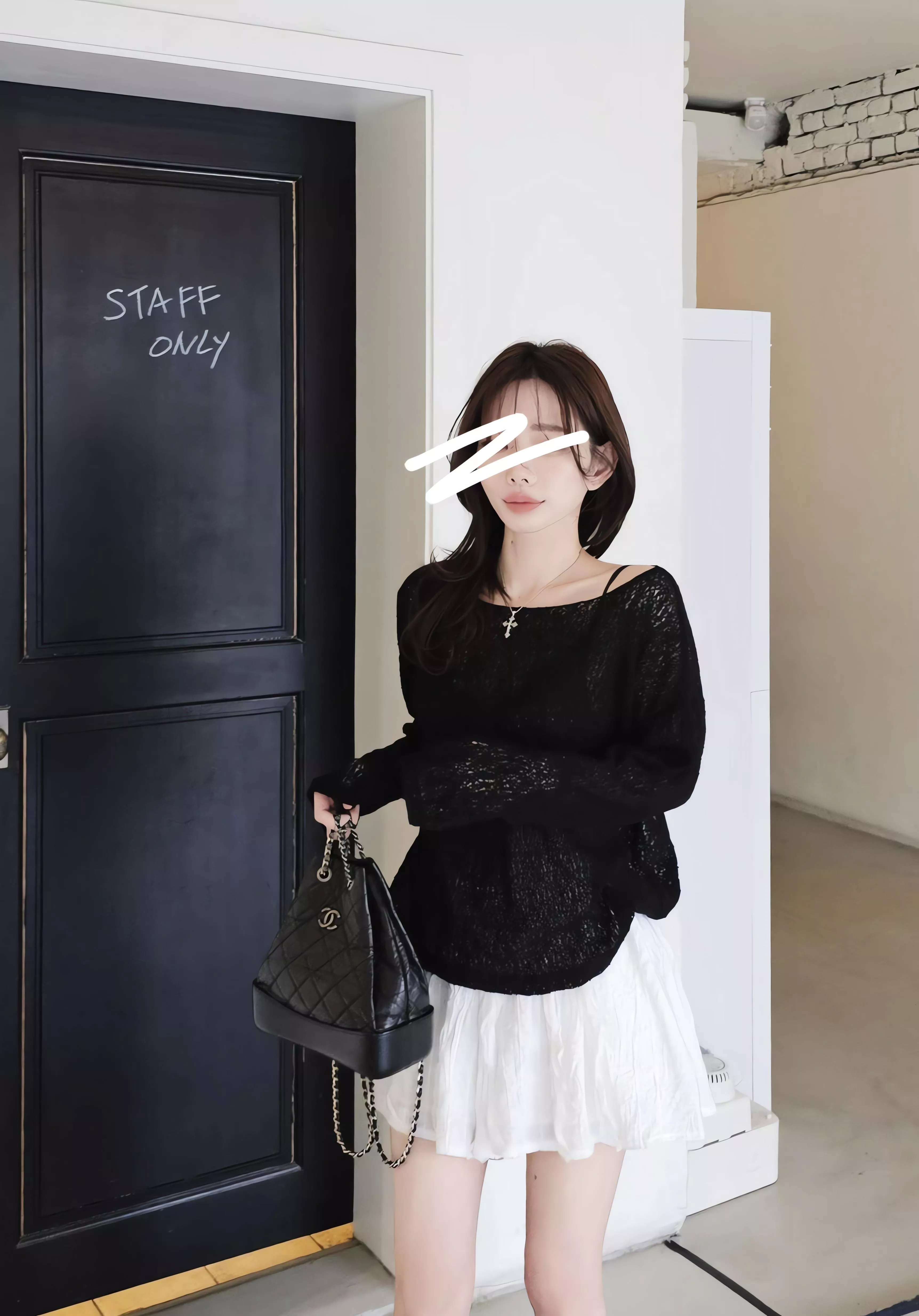 舒適鬆弛感兼具氣質的一款,單穿或是當外罩式都可以,領邊是寬鬆的木耳邊,露出美美的鎖骨線條~🥰🍦 這款織紋很特別的面料,輕盈柔軟舒適親膚,鏤空的效果不會太大,照片中歐尼都是穿一般內衣單穿👌✌️