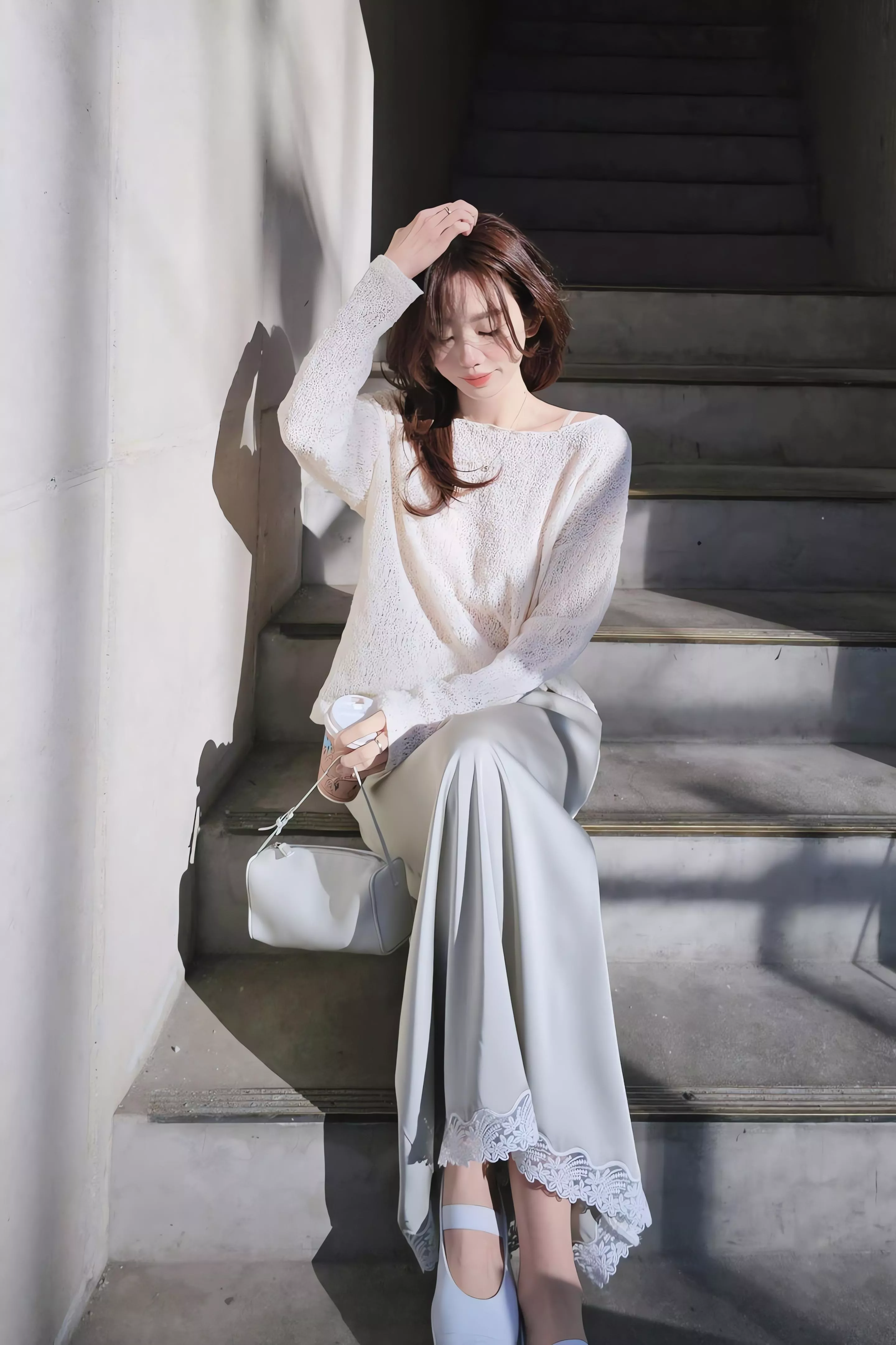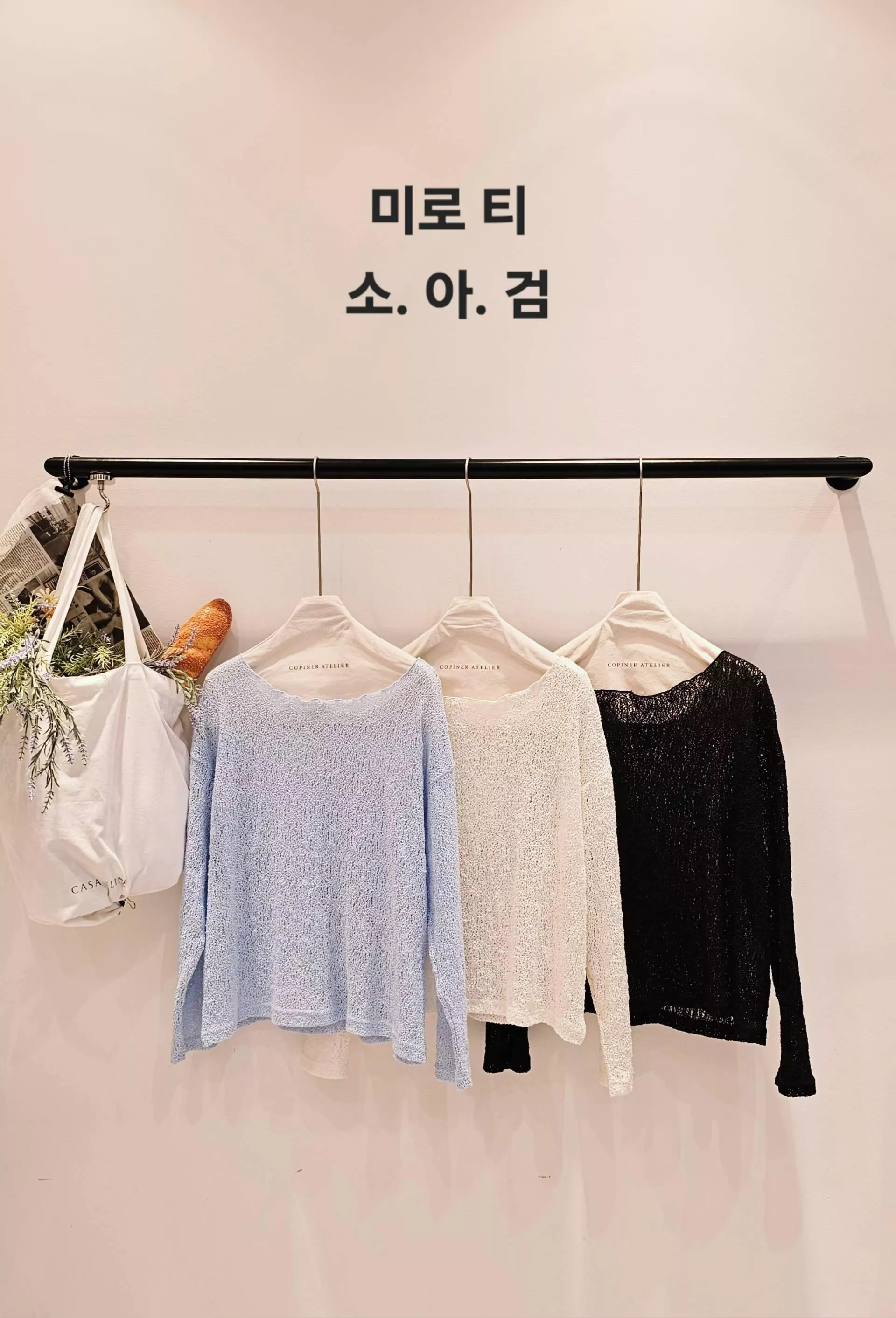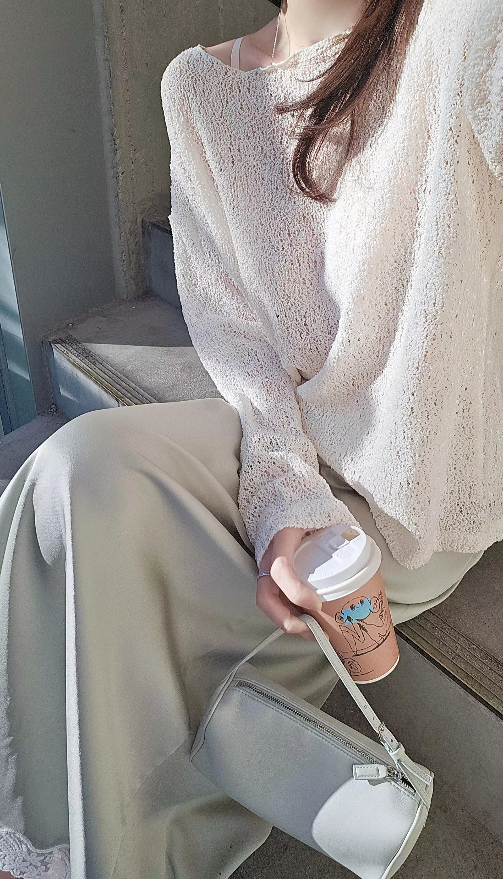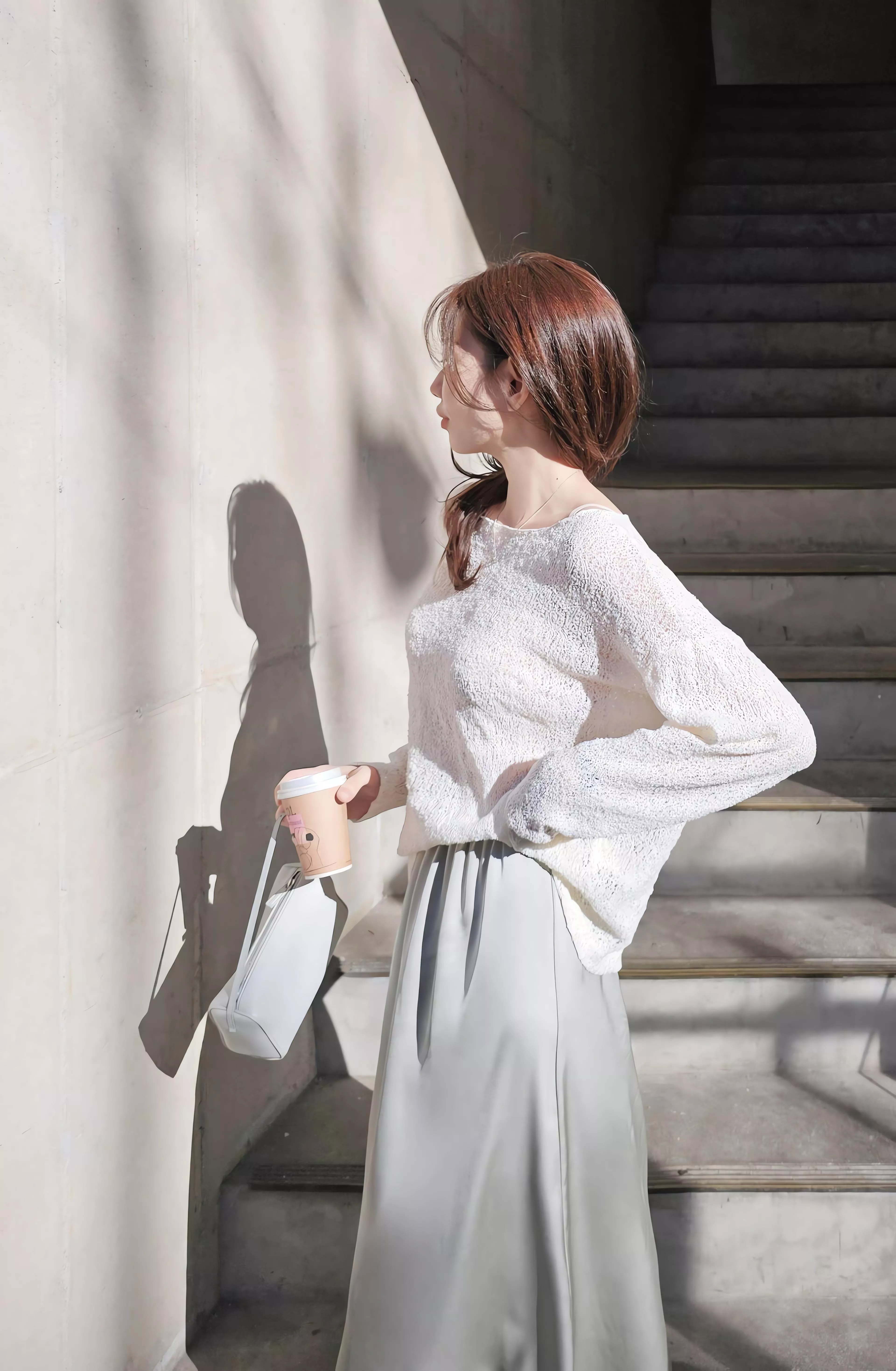 舒適鬆弛感兼具氣質的一款,單穿或是當外罩式都可以,領邊是寬鬆的木耳邊,露出美美的鎖骨線條~🥰🍦 這款織紋很特別的面料,輕盈柔軟舒適親膚,鏤空的效果不會太大,照片中歐尼都是穿一般內衣單穿👌✌️