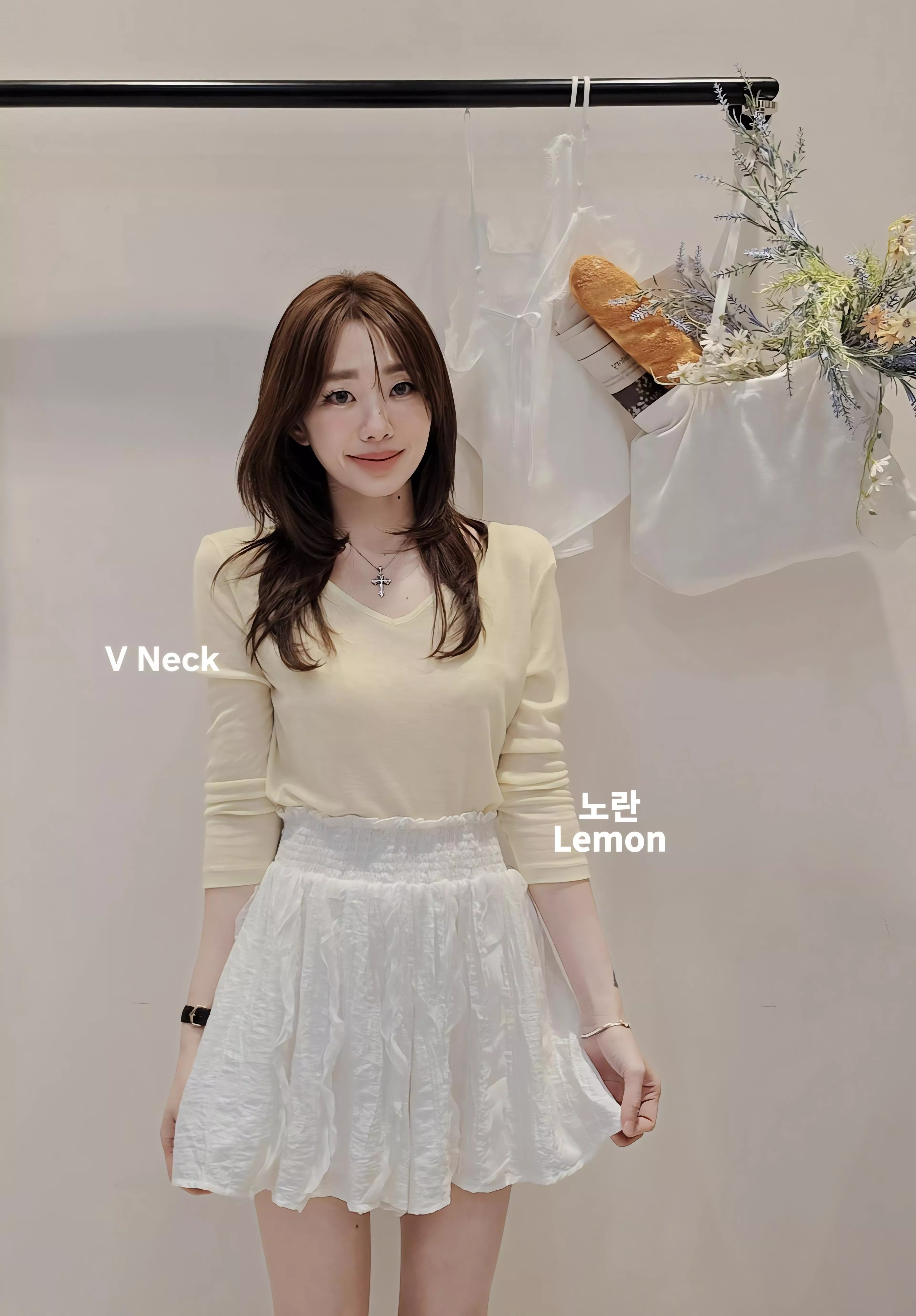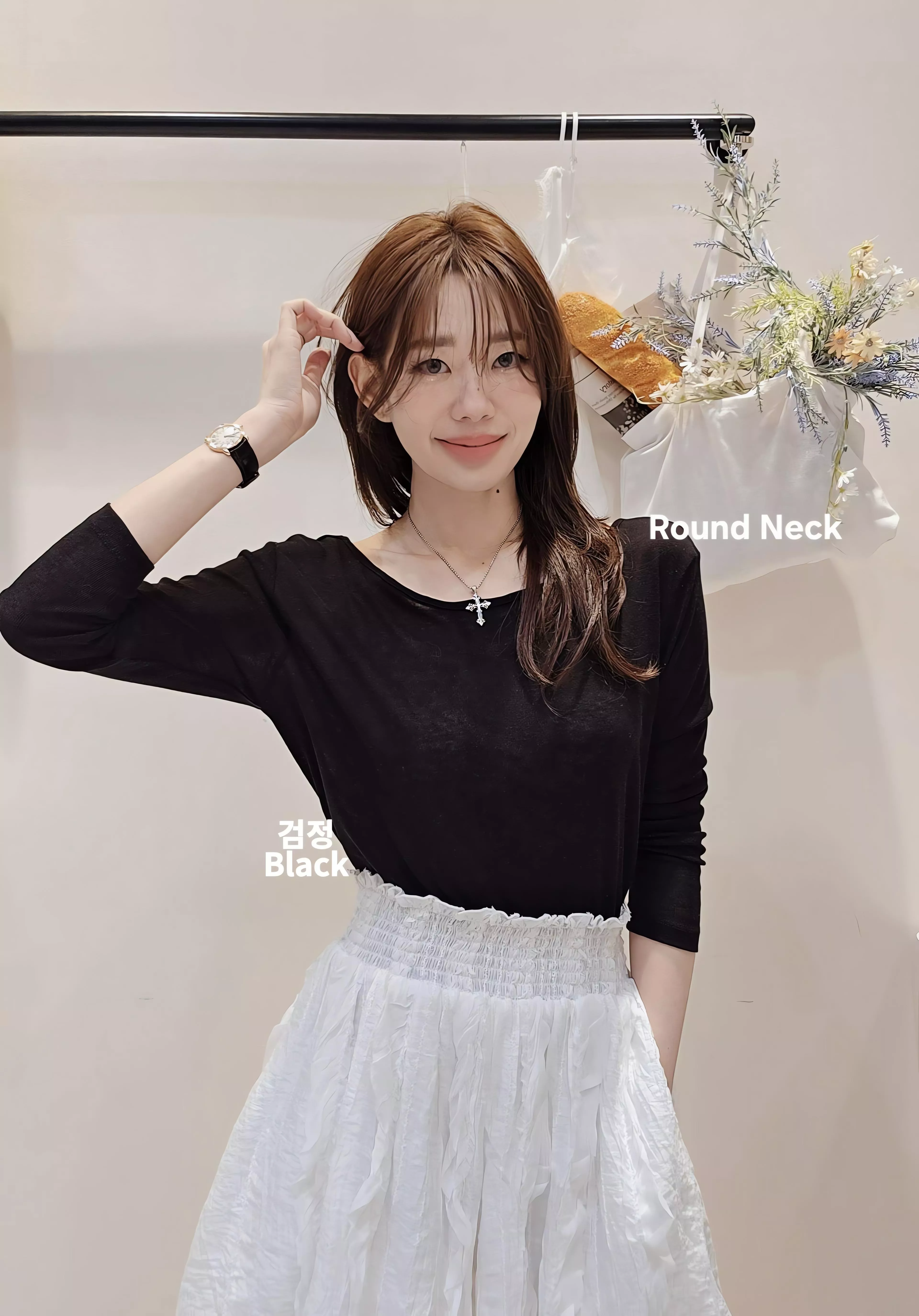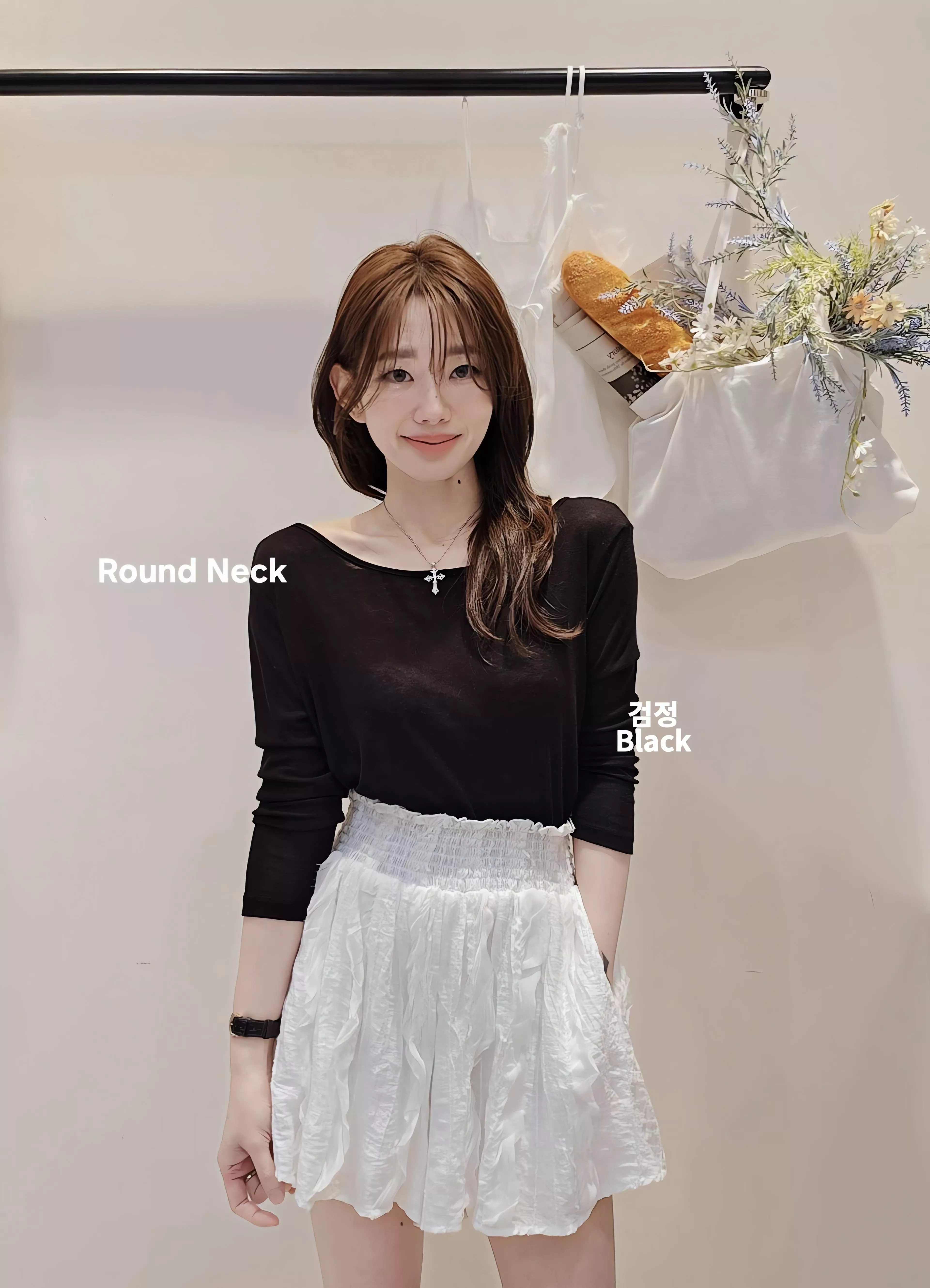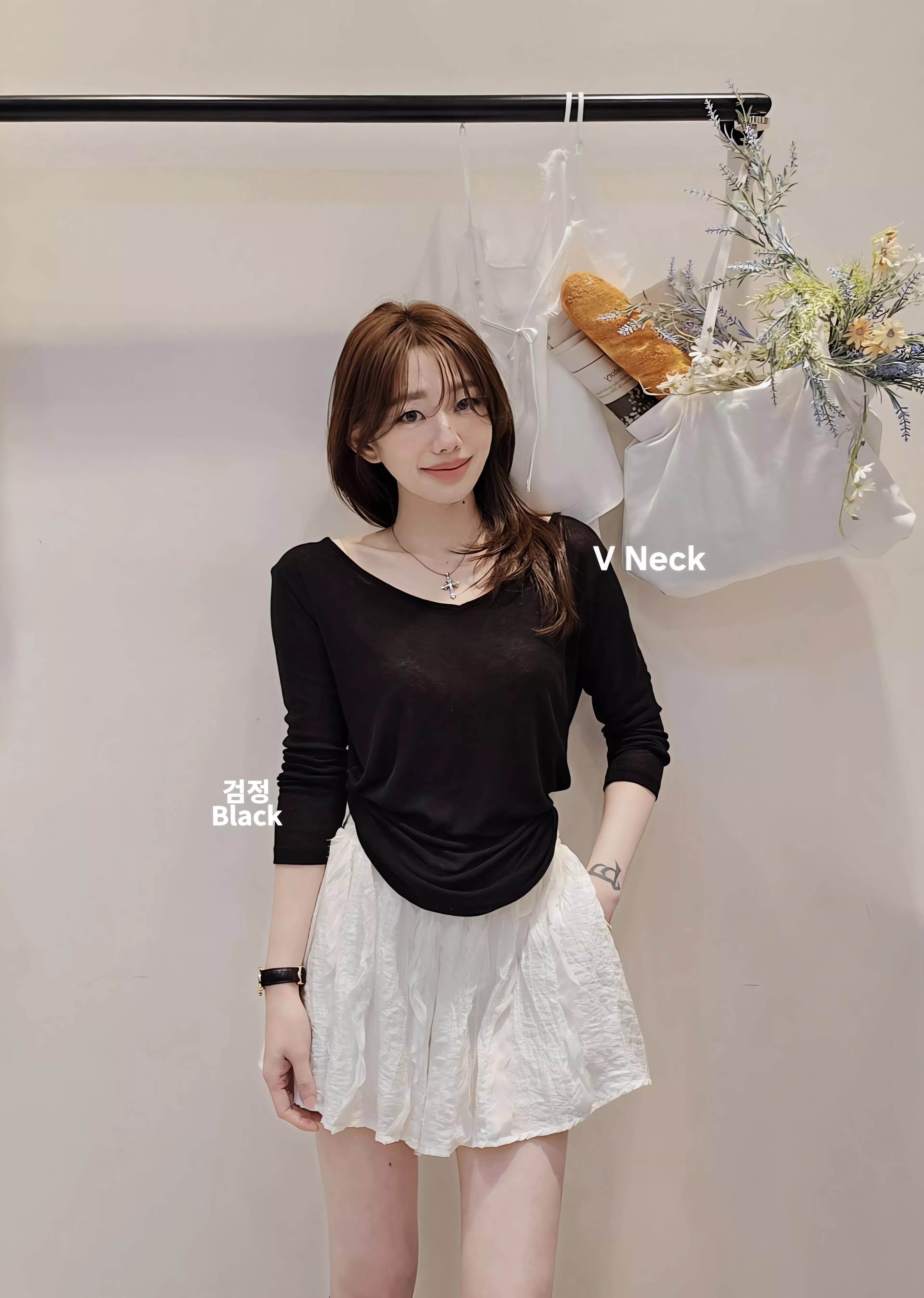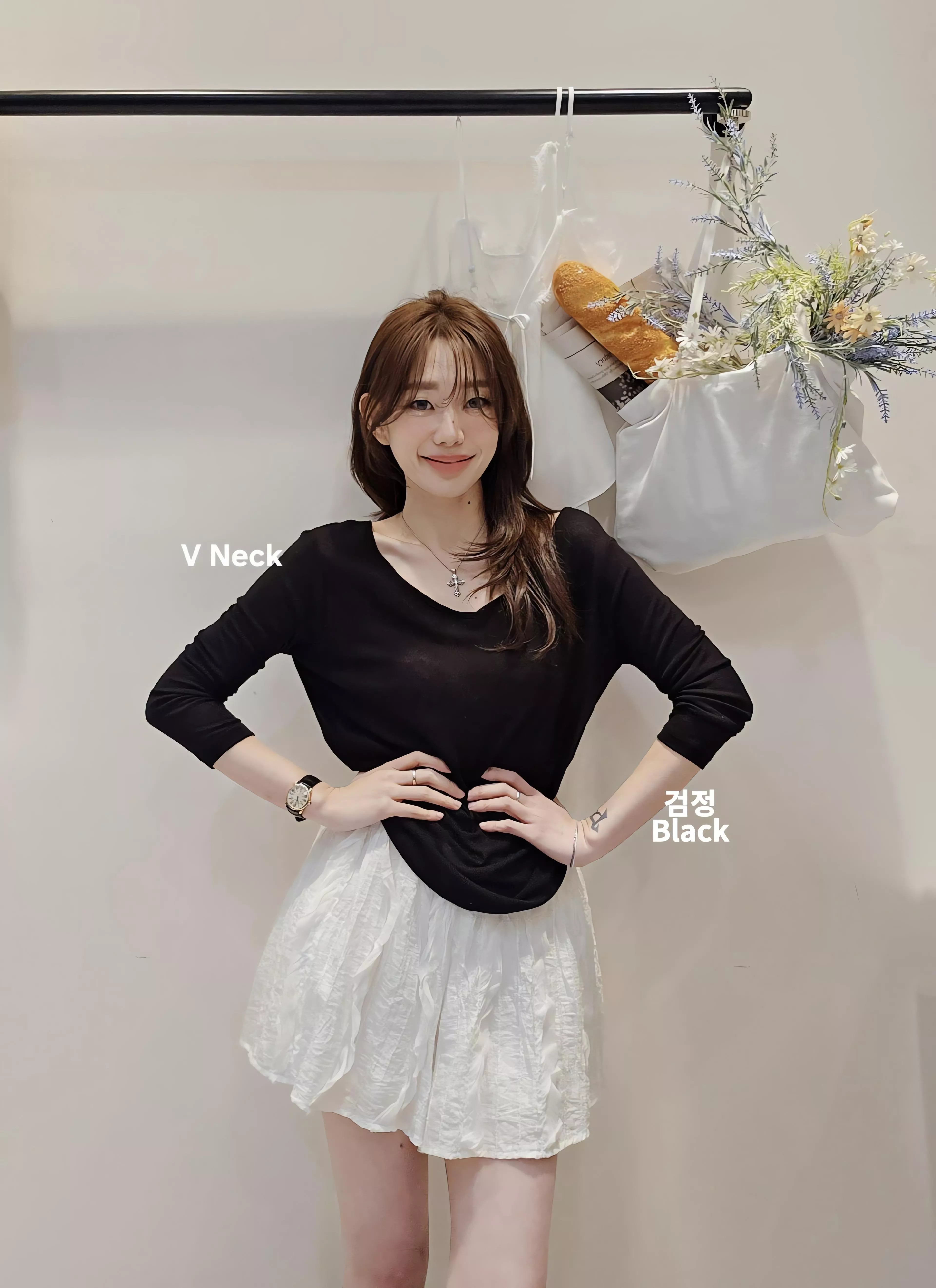 布料是天絲混紡夏季羊毛,做成很輕薄的織法,貼在身上是柔軟、帶一點透氣感的觸感,不悶、不黏,貼在身上是很清爽的觸感,穿一整天也不會有負擔。微微透肌,但整體是乾淨的輕盈感,不會過於暴露。
