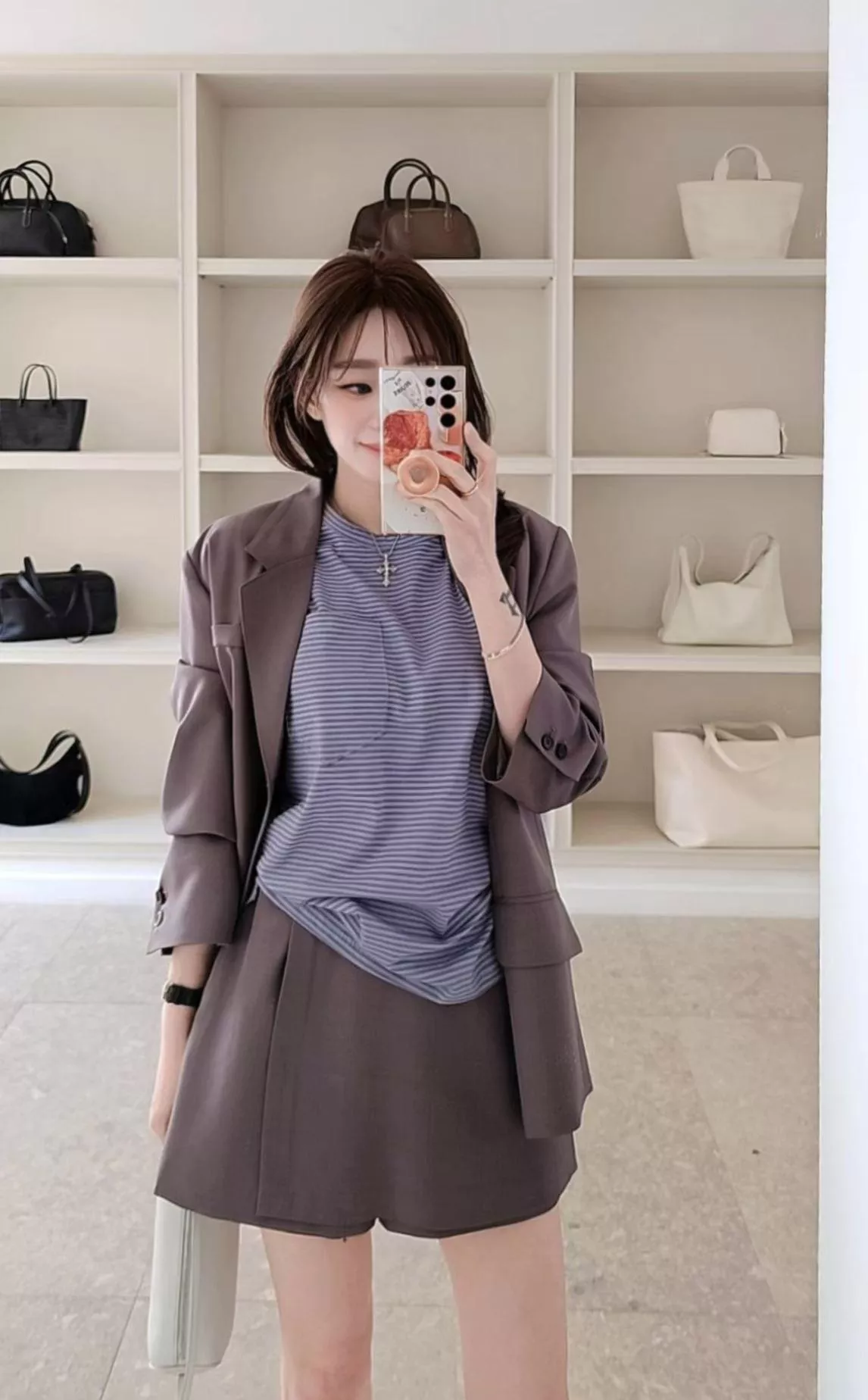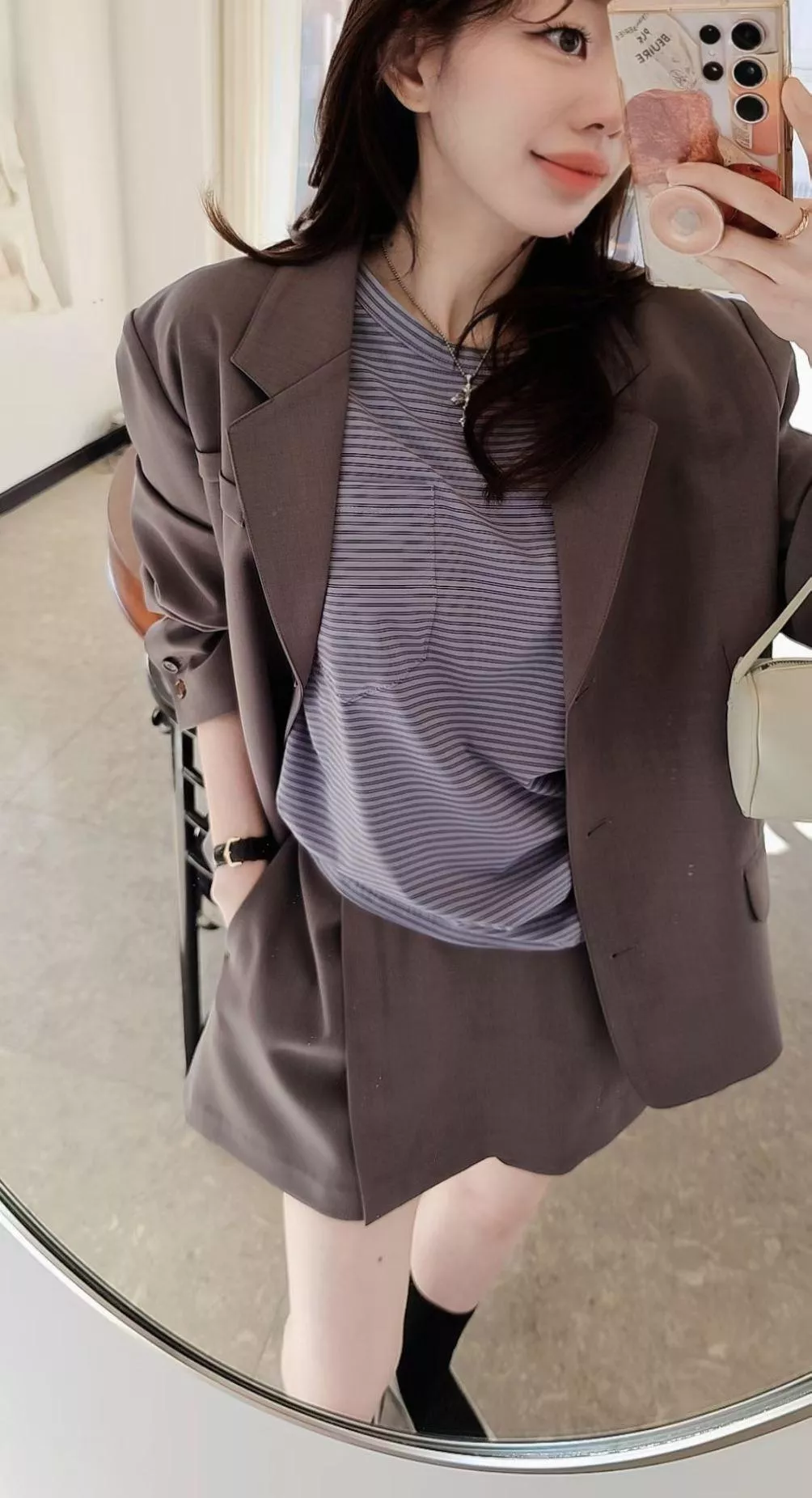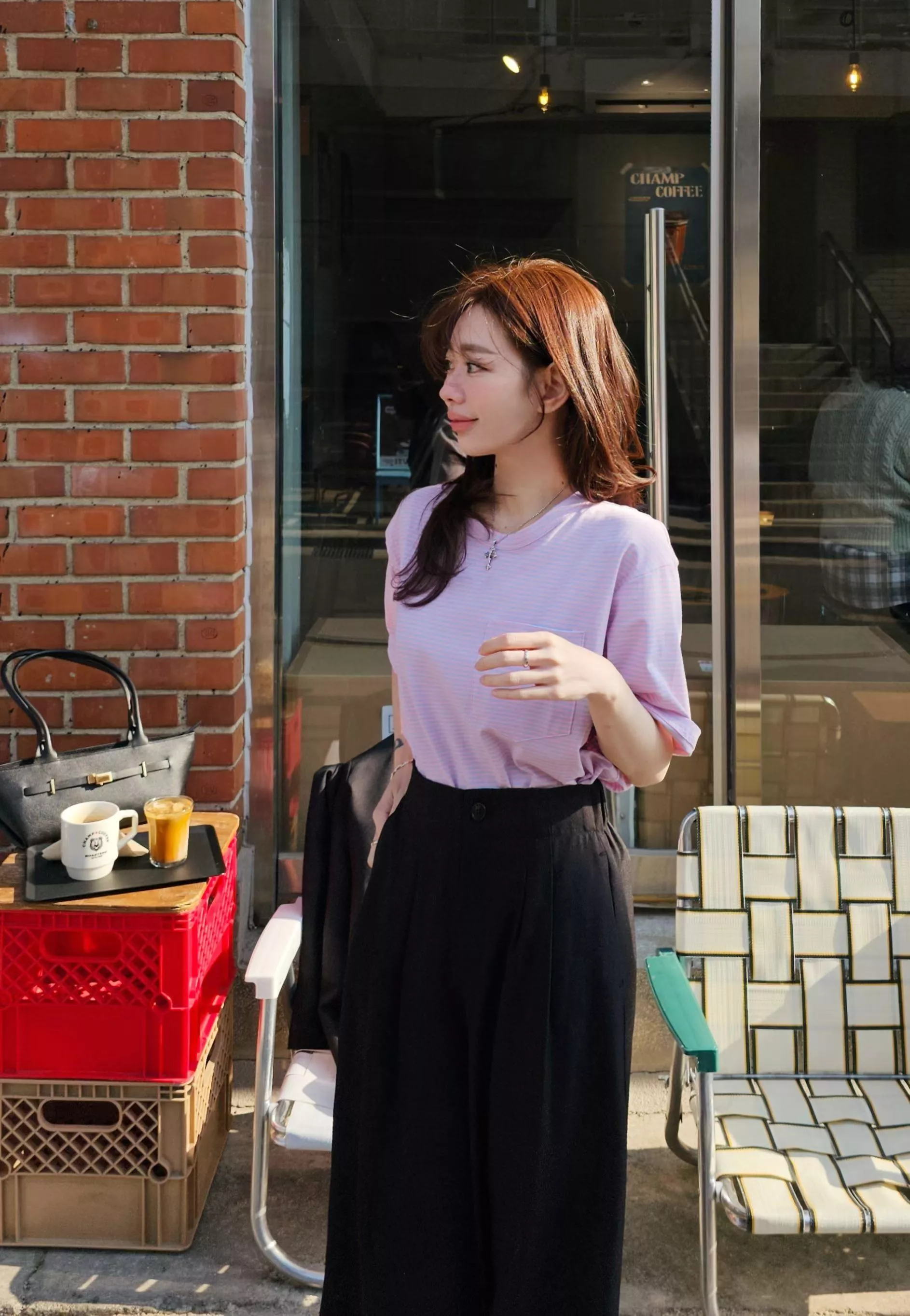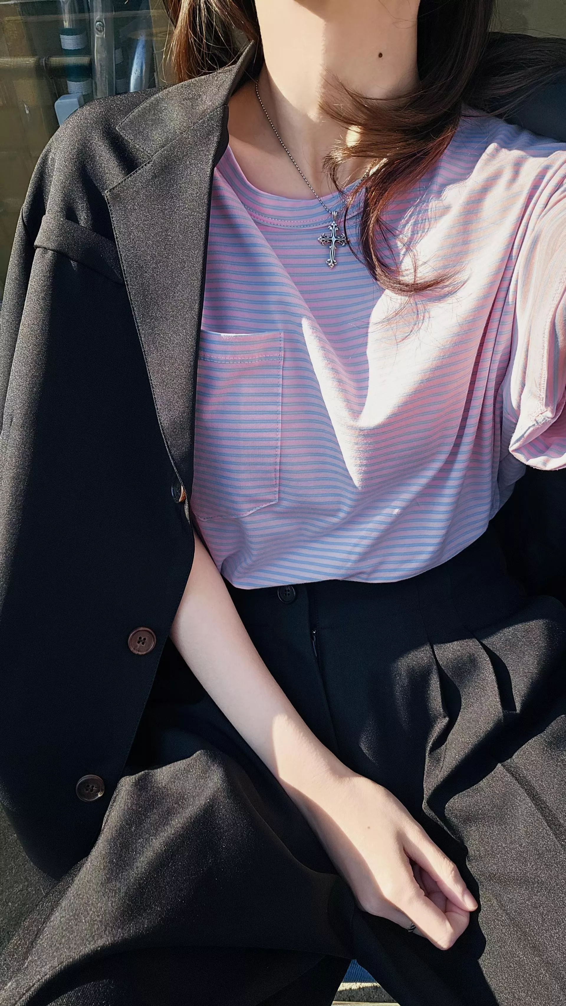 口袋的小細節讓視覺不會太像睡衣,微寬鬆的版型對身型很有包容力,塞個衣角配西裝褲就很俐落,不紮出來配單寧褲也很隨性。